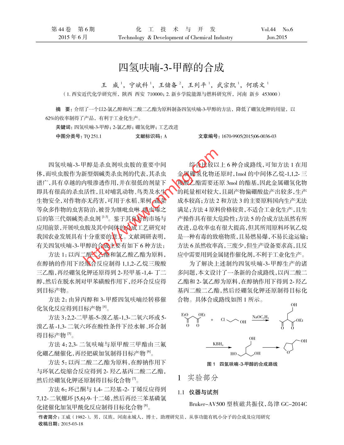第44卷第6期化工技術(shù)與開(kāi)發(fā)Vol.44 No.62015年6月Technology & Development of Chemical IndustryJun.2015四氫呋喃-3-甲醇的合成王威',寧斌科',王儲(chǔ)備”,王列平',武宗凱,何琪文'(1.西安近代化學(xué)研究所,陜西西安710000; 2.新鄉(xiāng)學(xué)院能源與燃料研究所,河南新鄉(xiāng)453000)摘要:介紹了一個(gè)以2-氯乙醇和丙二酸二乙酯為原料制備四氫呋喃-3-甲醇的方法, 降低了硼氫化鉀的用量,以62%的收率制得了產(chǎn)品,有利于工業(yè)化生產(chǎn)。關(guān)鍵詞:四氫呋喃-3-甲醇; 2-氣乙醇;硼氫化鉀;工藝改進(jìn)中圖分類號(hào): TQ 251.1文獻(xiàn)標(biāo)識(shí)碼: A文章編號(hào): 1670-9905(2015)06-0036-03四氫呋喃-3-甲醇是殺蟲(chóng)劑呋蟲(chóng)胺的重要中間綜合比較以上6種合成路線,可知方法1在用體,而呋蟲(chóng)胺作為新型煙堿類殺蟲(chóng)劑的代表,其殺蟲(chóng)金屬硼氫化物還原時(shí), 1mol的中間體乙烷-1,1,2-三譜廣,具有卓越的內(nèi)吸滲透作用,并在很低的劑量下羧酸乙酯需要還原3mol的酯基,因此金屬硼氫化物即具有很高的殺蟲(chóng)活性,且對(duì)哺乳動(dòng)物、鳥(niǎo)類及水生的耗量相對(duì)較大,且副產(chǎn)物偏硼酸鹽產(chǎn)出較多,生產(chǎn)生物安全,對(duì)作物亦無(wú)藥害,可用于水稻、果樹(shù)、蔬菜成本較高;方法2和方法3的主要原料國(guó)內(nèi)生產(chǎn)無(wú)法等眾多作物的蟲(chóng)害防治,被譽(yù)為繼吡蟲(chóng)啉噻蟲(chóng)嗪之滿足;方法4原料價(jià)格較貴,不適合工業(yè)化生產(chǎn),且生后的第三代煙堿類殺蟲(chóng)劑13。鑒于其良好的市場(chǎng)與產(chǎn)操作具有很大危險(xiǎn)性;方法5的合成方法雖然有所應(yīng)用前景,開(kāi)展呋蟲(chóng)胺及其中間體的合成工藝研究對(duì)改進(jìn),總收率也有很大提高,但其所用原料環(huán)氧乙烷我國(guó)農(nóng)業(yè)發(fā)展具有十分重要的意義。文獻(xiàn)調(diào)研表明,是一種有毒的致癌物質(zhì),且易燃易爆,不易長(zhǎng)途運(yùn)輸;有關(guān)四氫呋喃-3-甲醇的合成主要有如下6種方法:方法6雖然收率高,三廢少,但生產(chǎn)設(shè)備要求高,且反方法1: 以丙二酸二乙酯和氯乙酸乙酯為原料,應(yīng)中需要用到金屬銠作催化劑,不利于工業(yè)化生產(chǎn)。在醇鈉的作用下經(jīng)縮合反應(yīng)制得1,1,2-乙烷三羧酸為了解決上述制約四氫呋喃-3-甲醇生產(chǎn)的諸三乙酯,再經(jīng)硼氫化鉀還原得到2-羥甲基-1,4-丁二多問(wèn)題,本文設(shè)計(jì)了一條新的合成路線,以丙二酸二醇,然后在脫水劑對(duì)甲苯磺酸作用下,經(jīng)環(huán)合反應(yīng)得乙酯和2-氯乙醇為原料,在醇鈉作用下得到2-羥乙到目標(biāo)產(chǎn)物。基丙二酸二乙酯,然后經(jīng)硼氫化鉀還原制得目標(biāo)化方法2:由異丙醇和3-甲醛四氫呋喃經(jīng)轉(zhuǎn)移催合物。具體合成路線如圖1所示。)H化氫化反應(yīng)得到目標(biāo)產(chǎn)物4。方法3:2,2-二甲基-5-溴乙基-1,3-二氧六環(huán)或5-EI+ ClVoHNaOCH溴乙基-1,3-二氧六環(huán)在酸性條件下經(jīng)水解、環(huán)合制得目標(biāo)產(chǎn)物I5]。方法4:2,3-二氫呋喃與原甲酸三甲酯由三氟KBH4化硼乙醚催化,再經(jīng)鈀碳加氫制得目標(biāo)產(chǎn)物間。HO、方法5:以丙二酸二乙酯為原料,在醇鈉作用下圖1四氫呋喃-3-甲醇的合 成路線與環(huán)氧乙烷縮合反應(yīng)得到2-羥乙基丙二酸二乙酯,然后經(jīng)硼氫化鉀還原制得目標(biāo)化合物”。1實(shí)驗(yàn)部分方法6:環(huán)已酮與1,4- 二羥基-2-丁烯反應(yīng)得到1.1 儀器與試劑7,12-二氧螺環(huán)[5,6]-9-十二烯,然后再經(jīng)三苯基磷氯Bruker-AV500型核磁共振儀,島津GC-2014C化銠催化加氫甲?;磻?yīng)制得目標(biāo)化合物8。作者簡(jiǎn)介:王威( 1982-),男,漢族,河南永城人,博士,助理研究員,從事功能有機(jī)小分子的合成及應(yīng)用研究收稿日期: 2015-03-18第6期王威等:四氫呋喃-3-甲醇的合成3"氣相色譜儀, NEXUS870型傅立葉變換紅外光譜議,乙酯與氯乙酸乙酯為原料制得2-乙氧酰基-丙二R-1001-r N型旋轉(zhuǎn)蒸發(fā)儀,SHB- II循環(huán)水式多用酸二乙酯,再經(jīng)金屬硼氫化物還原后生成2-羥甲真空泵?;?1,4-丁二醇,然后經(jīng)酸性脫水得到四氫呋喃-3-所用反應(yīng)溶劑及試劑均為試劑級(jí),溫度計(jì)未校甲醇。該工藝中金屬硼氫化物使用量大,所用金屬正硼氫化物與2-乙氧?;?丙二酸二乙酯的摩爾比1.2實(shí)驗(yàn)步驟為3: 1,反應(yīng)原料成本較高,總收率為53.5%。而本1.2.1中間體2-羥乙基丙二酸二乙酯的合成文所采用的方法是以2-氯乙醇與丙二酸二乙酯為在裝有冷凝管、水銀溫度計(jì)和電動(dòng)攪拌的原料,在乙醇等有機(jī)溶劑或無(wú)溶劑條件下,控溫601000mL 的反應(yīng)瓶中,加入160g丙二酸二乙酯,攪~80C反應(yīng)6~ 10h,在乙醇鈉等堿的作用下生成2-羥拌狀態(tài)下緩慢滴加52g乙醇鈉的乙醇溶液,滴畢并乙基-丙二酸二乙酯,然后經(jīng)硼氫化鉀還原制得2-增溫至70C反應(yīng),然后緩慢滴加89g2-氯乙醇,滴.羥甲基-1,4-丁二醇,隨后在脫水劑的作用下經(jīng)脫水畢,控溫70C反應(yīng)10h, 蒸除乙醇溶劑,過(guò)濾除鹽,得反應(yīng)制得四氫呋喃-3-甲醇,總收率由文獻(xiàn)報(bào)道19)的到2-羥乙基-丙二酸二乙酯194g,收率為96% ,純度53.5%提高到62% ,制備成本大幅下降,有利于工業(yè)化生產(chǎn)。在中間體2-羥乙基-丙二酸二乙酯的合97%。IR 