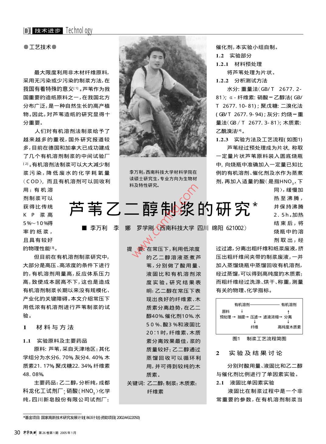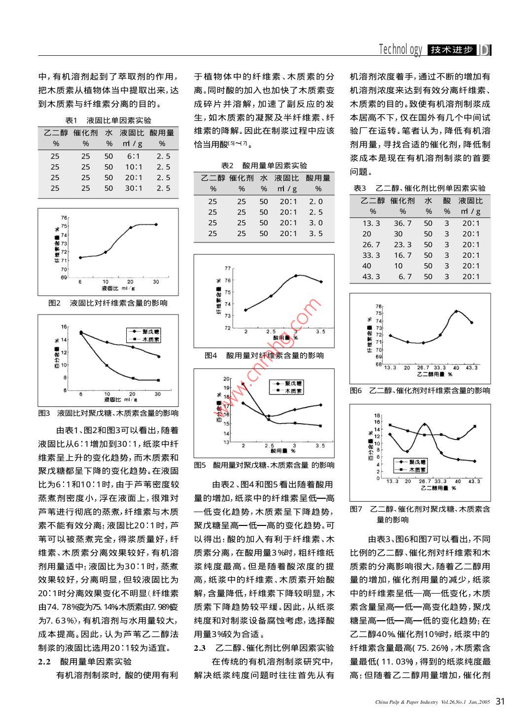 D技術(shù)進(jìn)步 Technol ogr●工藝技術(shù)●催化劑:本實驗小組自制。1.2實驗部分材料預(yù)處理最大限度利用非木材纖維原料將蘆葦處理為片狀。采用無污染或少污染的制漿方法,在1.2.2分析測試方法我國有著特殊的意義1。蘆葦作為我水分:重量法(GB/T2677.2國重要的造紙原料之一,在我國北方81);α-纖維素:硝酸一乙醇法(GB/分布廣泛,是一種自然生長的高產(chǎn)植T2677.10-81);聚戊糖:二溴化法物因此,對蘆葦造紙的研究顯得十(GB/T2677.9-94);灰分:灼燒一重分重要量法(GB/T2677.3-81);木質(zhì)素:人們對有機(jī)溶劑法制漿給予了乙酰溴法[4。越來越多的重視,國外研究報道較1.2.3實驗方法及工藝流程(如圖1)多,目前在德國和加拿大已成功建成蘆葦經(jīng)過預(yù)處理成為片狀,稱取了幾個有機(jī)溶劑制漿的中間試驗廠定量片狀蘆葦原料裝入圓底燒瓶2a有機(jī)溶劑法制漿可以大大減少制中,向燒瓶中準(zhǔn)確加入一定量已知比漿污染,降低廢水的化學(xué)耗氧量李萬利,西南科技大學(xué)材料學(xué)院在例的有機(jī)溶劑、催化劑及水作為蒸煮(COD),而且有機(jī)溶劑可以回收利讀碩土研究生,專業(yè)方向為生物材料及特性研究。劑,再加入適量的酸(是指HNO3,下用;有機(jī)溶同);緩慢加劑制漿可以熱至沸騰蘆葦乙二醇制漿的研究*梁5%10%得率的紙漿,■李萬利李娜羅學(xué)剛(西南科技大學(xué)四川綿陽621002)結(jié)束后,將燒瓶中的溶且具有較好劑取出,經(jīng)的物理性能到提要:在常壓下,利用低濃度過過濾,分離出粗纖維和紙漿廢液,擠但目前在有機(jī)溶劑制漿研究中,的乙二醇溶液蒸煮蘆壓出粗纖維間夾帶的制漿廢液,一并大部分是高壓、高濃度的條件下進(jìn)行葦,分別做了酸用量加入蒸餾燒瓶中蒸餾回收有機(jī)溶劑,的,有機(jī)溶劑用量高,反應(yīng)體系壓力液固比和有機(jī)溶劑濃經(jīng)過蒸餾可以得到高純度的木質(zhì)素高,致使成本居高不下,這也是造成度實驗。研究結(jié)果表而粗纖維經(jīng)過洗滌烘干、稱重,測量有機(jī)溶劑制漿長期以來沒有規(guī)?;?乙二醇在常壓下表有關(guān)的物理、化學(xué)指標(biāo)產(chǎn)業(yè)化的關(guān)鍵障礙。本文介紹常壓下現(xiàn)出良好的纖維素、木用低濃有機(jī)溶劑進(jìn)行蘆葦制漿的試質(zhì)素分離趨勢,在乙二有機(jī)溶劑一有機(jī)溶劑驗醇40%催化劑10%水預(yù)處理→抽提→壓濾→濾液濃縮→分離1材料與方法50%、酸3%和液固比纖維高純度木質(zhì)素20:1時,纖維素、木質(zhì)1.1實驗原料及主要藥品素分離效果最佳,漿的圖1制漿工藝流程簡圖原料:蘆葦,采自天津地區(qū);其化質(zhì)量較好;乙二醇通過2實驗及結(jié)果討論學(xué)組分為水分6.70%灰分4.40%木蒸餾回收可以循環(huán)利質(zhì)素21.17%聚戊糖22.34%纖維素用,并可得到較純的木分別對酸用量、液固比和乙二醇48.08%質(zhì)素。與催化劑比例進(jìn)行了單因素實驗。主要藥品:乙二醇,分析純,成都關(guān)鍵詞:乙二醇;制漿;木質(zhì)素2.1液固比單因素實驗科龍化工試劑廠;硝酸(HNO3)化學(xué)纖維素液固比在制漿過程中是一個非純,四川新皂股份有限公司試劑廠常重要的參數(shù),在有機(jī)溶劑制漿當(dāng)棰基金項目國家高新技術(shù)研究發(fā)展計劃86計劃資助項目20043205030宋舉叫第26卷第1期200年1月Technol ogy技木進(jìn)步1中,有機(jī)溶劑起到了萃取劑的作用,于植物體中的纖維素、木質(zhì)素的分機(jī)溶劑濃度著手,通過不斷的增加有把木質(zhì)素從植物體當(dāng)中提取出來,達(dá)離。同時酸的加入也加快了木質(zhì)素變機(jī)溶劑濃度來達(dá)到有效分離纖維素、到木質(zhì)素與纖維素分離的目的。成碎片并溶解,加速了副反應(yīng)的發(fā)木質(zhì)素的目的。致使有機(jī)溶劑制漿成表1液固比單因素實驗生,如木質(zhì)素的凝聚及半纖維素、纖本居高不下,僅在國外有幾個中間試乙二醇催化劑水液固比酸用量維素的降解因此在制漿過程中應(yīng)該驗廠在運轉(zhuǎn)筆者認(rèn)為,降低有機(jī)溶%m/恰當(dāng)用酸寫~7。劑用量,尋找合適的催化劑,降低制漿成本是現(xiàn)在有機(jī)溶劑制漿的首要25255010:12.5表2酸用量單因素實驗255020:12.5乙三醇催化劑水液固比酸用量題255030:12.5%%m/g%表3乙二醇、催化劑比例單因素實驗20:12.0乙二醇催化劑水酸液固比g13.336.750320:125255020:13.52050320:17226,723.350320:133.316.750320:143.36.750320:120液因比m8圖2液固比對纖維素含量的影響木質(zhì)案求咖求■圖4酸用量對纖維素含量的影響13.3404乙二酵用■圖6乙二醇、催化劑對纖維素含量的影響液固比圖3液固比對聚戊糖、木質(zhì)素含量的影響由表1、圖2和圖3可以看出,隨著液固比從6:1增加到30:1,紙漿中纖求■航實維素呈上升的變化趨勢,而木質(zhì)素和聚戊糖都呈下降的變化趨勢。在液固圖5酸用量對聚戊糖、木質(zhì)素含量的影響木所素比為6:1和10:1時,由于蘆葦密度較由表2、圖4和圖5看出隨著酸用蒸煮劑密度小,浮在液面上,很難對量的增加,紙漿中的纖維素呈低一高蘆葦進(jìn)行徹底的蒸煮,纖維素與木質(zhì)一低變化趨勢,木質(zhì)素呈下降趨勢7乙二醇、催化劑對聚戊糖、木質(zhì)素含素不能有效分離;液固比20:1時,蘆聚戊糖呈高一低一高的變化趨勢??闪康挠绊懭斂梢员徽糁笸耆?得漿質(zhì)量好,纖以得出:酸的加入有利于纖維素、木由表3、圖6和圖7可以看出,不同維素