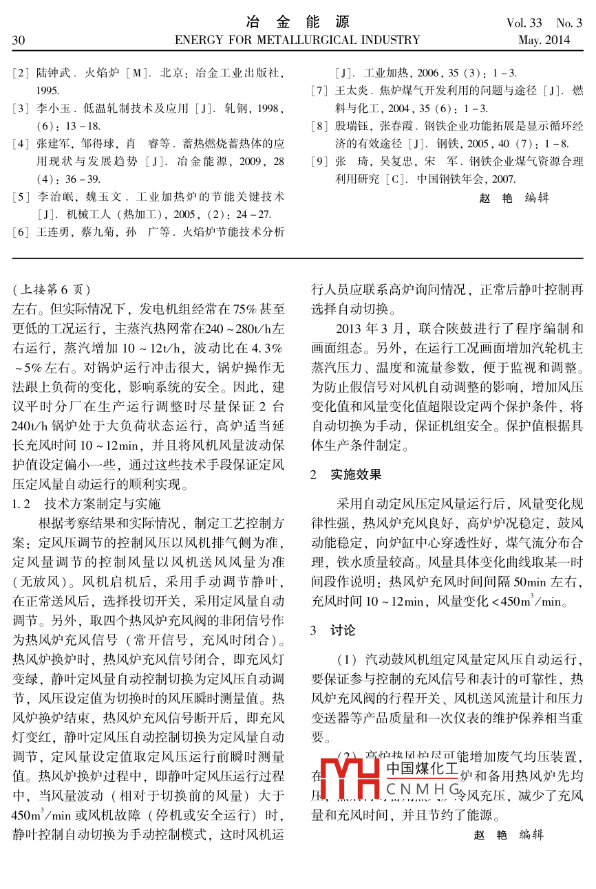 Vol 33 No. 3冶金能源May.2014ENERGY FOR METALLURGICAL INDUSTRY27軋鋼工序節(jié)能技術(shù)及節(jié)能實踐覃永國盧春寧(柳州鋼鐵中板廠摘要對軋鋼工序能耗的構(gòu)成進行分析,指出軋鋼系統(tǒng)的節(jié)能應(yīng)以加熱爐節(jié)能為重點。在分析蓄熱式燃燒、涂料、熱送熱裝、黑體強化輻射傳熱、鋼鐵企業(yè)煤氣資源合理利用、變頻調(diào)速技術(shù)的基礎(chǔ)上,結(jié)合柳鋼中板廠近年采取的節(jié)能措施和節(jié)能技術(shù)的應(yīng)用情況,指出了今后柳鋼中板廠的節(jié)能方向和對策,為其他軋鋼企業(yè)節(jié)能降耗提供參考。關(guān)鍵詞節(jié)能熱送熱裝蒸汽回收Energy -saving measures of rolling system in iron and steel enterpriseQin Yongguo Lu ChunnirLiuzhou Iron and Steel of Plate PlantAbstractThe composition of the rolling system energy consumption was analyzed, and the importanceof reheating furnace eling was pointed out. On the base of the technology such as regeneracombustion, coating, hot delivery and hot charging, reinforced blackbody radiation, the reasona-ole utilizations of byproduct gas in the iron and steel making process and frequency conversion speedcontrol, with the practice of recent energy-saving measures, application of energy -saving technologyin Liuzhou iron and steel of plate plant, energy - saving direction and counter measures of rolling system in the future were pointehis will offer reference for energy -saving in other rollKeywords energy saving hot delid hot charging steam retrieve為實現(xiàn)鋼鐵工業(yè)的可持續(xù)發(fā)展,在國家一系1軋鋼系統(tǒng)節(jié)能列節(jié)能減排政策的倡導下,中國鋼鐵工業(yè)正向著低能耗、短流程和高附加值產(chǎn)品方向發(fā)展。中國任何能量都由可用能煙和無效能嫵組成鋼鐵工業(yè)的節(jié)能減排工作取得了很大進展,但與根據(jù)能量守恒定律得知,能量的總量是不會減少國外先進水平相比還有很大差距,節(jié)能工作尚面的,只是在能源的轉(zhuǎn)換和使用過程中,能量中的臨著“穿越環(huán)境高山”壓力。軋鋼系統(tǒng)節(jié)能工可用能降低,而無效能增加,因此,節(jié)能的本質(zhì)作也得到了重視,節(jié)能措施、節(jié)能技術(shù)在軋鋼系就是減少畑損失,節(jié)能就是節(jié)姐。統(tǒng)中不斷得到應(yīng)用,軋鋼工序能耗不斷降低。近降低加熱爐煤氣消耗幾年,中板廠在節(jié)能方面開展了一些工作,取得中國煤化工是單位重量坯料在爐了一定的效果,目前的工序能耗占公司噸鋼綜合內(nèi)CNMH率的比值。因此,降低能耗的8%~10%。加熱爐燃耗的途徑就是降低熱焓増量和提髙爐子熱效率20131.1.1降低熱焓增量覃永國(1983-),工程師;54500廣西省柳州市。(1)提高坯料的入爐溫度冶金能源Vol 33 No. 3ENERGY FOR METALLURGICAL INDUSTRYMay.2014熱送熱裝是冶金行業(yè)重點推廣的節(jié)能技術(shù)②爐窯內(nèi)壁涂刷輻射率(黑度)大的涂料分三種形式:熱裝、直接熱裝、直接軋制。該技可以強化爐內(nèi)的輻射傳熱,有助于熱能的充分利術(shù)可以明顯降低加熱爐燃耗,縮短鋼坯在爐時用。高溫遠紅外節(jié)能涂料有很好的節(jié)能效果,間,對于質(zhì)量要求不高的鋼種均可熱裝。目前,般節(jié)能效果為5%~7%6熱送熱裝在國內(nèi)得到了廣泛使用。③采用多晶莫來石纖維貼面塊提高加熱爐內(nèi)(2)降低坯料的加熱溫度壁保溫能力,減少爐體的散熱損失,降低了爐子在保證加熱質(zhì)量、滿足軋制要求的前提下,燃耗。應(yīng)適當降低鋼坯加熱溫度,降低燃耗。鋼坯加熱3)提高控制水平溫度在1150~1250℃的范圍內(nèi),溫度平均每降釆用先進的燃料燃燒控制技術(shù)(如脈沖燃低10℃時,燃料節(jié)約2.1%,電耗増加0.8%,燒控制技術(shù)),采用數(shù)學模型優(yōu)化控制等等。綜合能耗平均降低1.65%。加熱溫度降低40℃,1.2電機節(jié)能技術(shù)綜合節(jié)能率可達到4.2%。軋鋼工序有軋機、輥道、風機、水泵等設(shè)另外,對于軋機剛度和電力設(shè)備滿足低溫軋備,驅(qū)動設(shè)備消耗的能源均為電耗,故電杋選擇制要求的軋鋼廠,可采用低溫軋制技術(shù)。開是關(guān)鍵。在電機設(shè)計中應(yīng)避免大馬拉小車,進行軋溫度從1000~1150℃降至850~950℃,綜合電機優(yōu)化設(shè)計。在運行過程中主要采用變頻調(diào)速節(jié)能率可達到10%~20%,氧化鐵皮厚度可減技術(shù),通過應(yīng)用電機節(jié)能技術(shù),可實現(xiàn)節(jié)電少0.15~0.2mm。20%~40%。采用動態(tài)諧波抑制及無功補償綜合1.1.2提高爐子熱效率節(jié)能技術(shù),降低電源側(cè)電流諧波含量,調(diào)節(jié)三相(1)改善燃料燃燒不平衡,提高電能質(zhì)量,降低線路損耗。燃料燃燒是通過安裝在火焰爐上的燃燒器完1.3鋼鐵企業(yè)煤氣資源合理利用成的,其性能直接影響爐子的燃料消耗量。根據(jù)隨著低熱值煤氣利用技術(shù)的開發(fā),采用蓄熱爐子的生產(chǎn)目的、工作形式、結(jié)構(gòu)形式等,比較式燃燒技術(shù),實現(xiàn)了工業(yè)爐窯燃用低熱值煤氣不同燃燒器的特征,正確設(shè)計、選擇及合理安裝(高爐煤氣)的可能,大量的焦爐煤氣被置換出使用燃燒器可以節(jié)能5%以上。來。目前,一般是把這部分焦爐煤氣送往自備發(fā)高溫空氣蓄熱燃燒技術(shù)ˉ(HAC)具有高電廠發(fā)電。但是焦爐煤氣發(fā)電成本較高,據(jù)一些效余熱回收、高溫預熱空氣及低NO、排放等優(yōu)企業(yè)利用焦爐煤氣發(