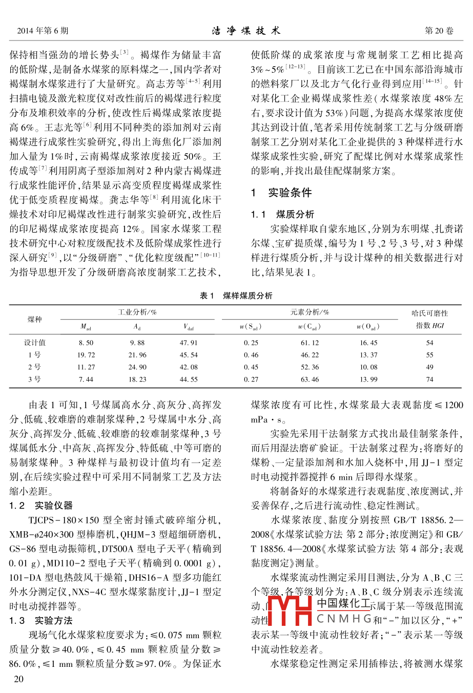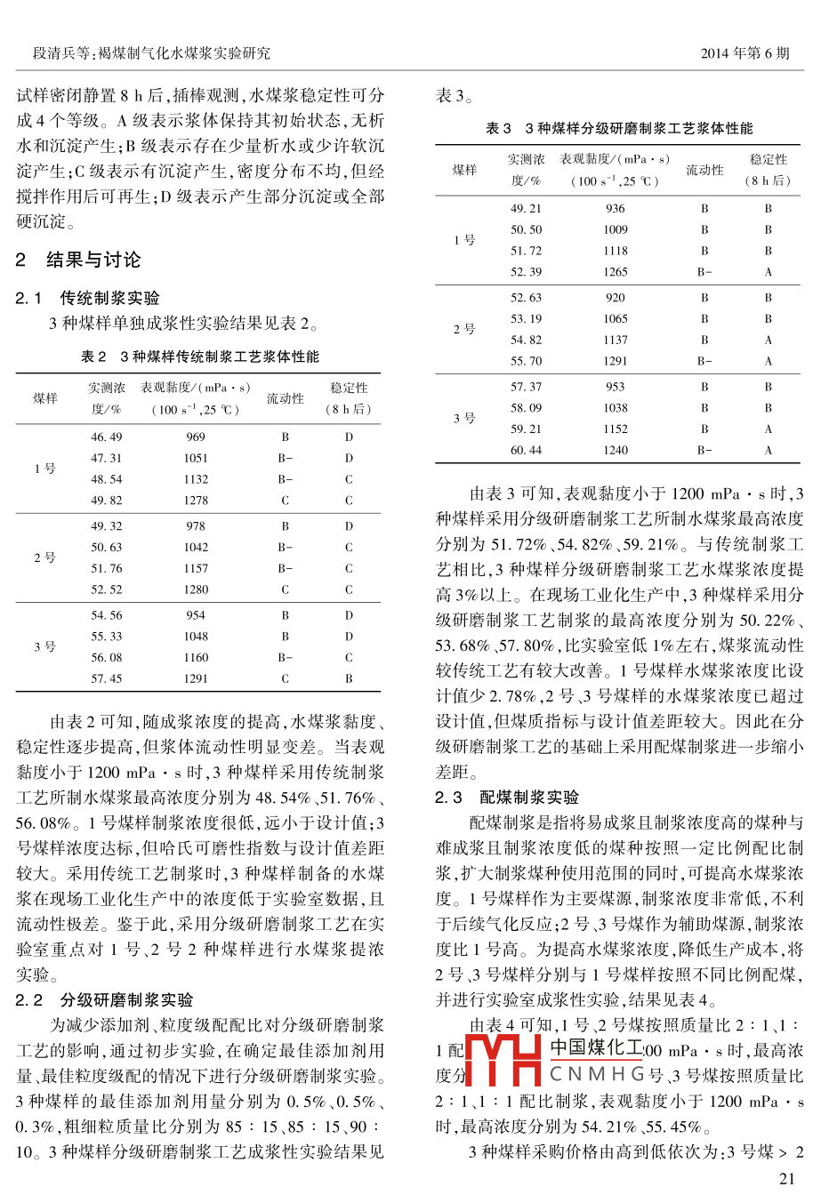 第20卷第6期潔凈煤技術Vol 20 No 62014年11月Clean Coal Technolog褐煤制氣化水煤漿實驗研究段清兵12,4,張勝局134,何國鋒·23,劉燁煒12,4,孫海勇1,3,41煤炭科學技術硏究院冇限公司節(jié)能工程技術硏究分院,北京100013;2-國家水煤漿工程技術硏究中心,北京10003煤炭資源高效開采與潔凈利用國家重點實驗窒,北京10013;4.國家能源煤炭高效利用與節(jié)能減排技術裝備重點實驗室,北京100013)摘要:為提高褐煤制氣化水煤漿的制漿濃度,采用傳統(tǒng)制漿工藝與分級研磨制漿工藝分別對某化工企業(yè)提供的3種煤樣進行水煤漿成漿性實驗,并在此基礎上進行配煤制漿實驗。結果表明:東明煤扎賚諾爾煤、寶礦提質煤傳統(tǒng)制漿工藝的最高濃度分別為48.54%、51.76%、56.08%,分級研磨制漿最高濃度分別為51.72%、54.8%、59.21%,3種煤樣分級研磨制漿工芑水煤漿濃度提髙3%以上。按照東明煤、扎賚諾爾煤質量比1:Ⅰ或東明煤、寶礦提質煤質量比2:配煤時所制水煤漿濃度分別為53.12%、54.21%,滿足水煤漿濃度設計要求。關鍵詞:褐煤;煤質分析;水煤漿;配煤;氣化中圖分類號:TD849;TQ536文獻標志碼:A文章編號:1006-6772(2014)06-0019-04Preparation of coal water slurry for gasification with ligniteDUAN Qingbing 2.3.4, ZHANG Shengju 2.3.4, HE Guofeng. 2. 3.4, LIU Yewei 2.3.4, SUN Haiyong 2,3,4g) consed, Beijing 100013, China;3. State Key Laboratory of Coal Mining and Clean Utilization( China Coal Research Institute ) Beying 100013, China4. National Energy Technology and Equipment Laboratory of Coal Utilization and Emission Control( China Coal Research Institute ), Beijing 100013, ChinaAbstract: In order to improve the concentration of coal water slurry( CWS)for gasification with lignite, the slurryability of three coal sam-les which were provided by an chemical enterprise was conducted through traditional Cws preparation process and classified grindiprocess. Then the CWS preparation with blending coal was carried out. The results showed that, prepared by traditional process, the highestpulp concentration of Dongming coal, Zhalainuoer coal, Baokuang upgrading coal were 48. 54%, 51.76%0, 56.08%0 Prepared by classifiedoncentration of above three cws were 51.72%0.54.82%0.59.21%, whichbove 3 higher than theconcentration of CWs prepared by traditional process. When the mass ratio of Dongming coal and Zhalainuoer coal was I to 1, or the massratio of Dongming coal and Baokuang upgrading coal was 2 to l, the concentration of CWs were 53. 12% and 54.21%, which met the designKey words: lignite; coal property analysis; coal water slurry; coal blending; gasification0引言發(fā)以來,經(jīng)過30余年的科技攻關和生產(chǎn)實踐,水煤漿技術已達到國際先進水平,生產(chǎn)與應用規(guī)模均居煤炭是中國的基礎能源,在未來相當長一段時世界第一-21。水煤漿在電站鍋爐、工業(yè)鍋爐、工業(yè)間內(nèi)以煤炭為主的能源結構難以改變。中國煤炭窯爐上均已成功應用,與此同時作為氣化原料的氣85%直接燃燒使用,高耗低效的燃燒方式是造成全化水煤漿也得到了長足發(fā)展,中國水煤漿技術己進國環(huán)境污染和氣候惡化的重要原因。作為潔凈煤技人工業(yè)推廣應用階段。隨著以水煤漿氣化為龍頭的術之一的水煤漿自20世紀80年代初在中國研究開煤化工產(chǎn)業(yè)的快速擴張,氣化水煤漿的應用規(guī)模將收稿日期:2014-07-15;責任編輯:白婭娜DOI:10.13226/jisn.1006-67722014中國煤化工基金項目:國家科技部科研院所技術開發(fā)研究專項資助項目(20IEG22224);中巨CNMHG基金資助項目(2012M019)作者簡介段清兵(1978-),男,山東新泰人副研究員,碩士,從事水煤漿技術研發(fā)推札上柱建設萬的⊥作。E-mil: guangbing@ sIna coIn引用格式:段清兵,張勝局,何國鋒,等褐煤制氣化水煤漿實驗研究[J]潔凈煤技術,2014,20(6):19-22DUAN Qingbing, ZHANG Shengju, HE Guofeng, et aL. Preparation of coal water slurry for gasification with lignite[J]. Clean Coal Technology2014,20(6):19-222014年第6期潔凈媒技術第20卷保持相當強勁的增長勢頭3。褐煤作為儲量豐富使低階煤的成漿濃度與常規(guī)制漿工藝相比提高的低階煤,是制備水煤漿的原料煤之一,國內(nèi)學者對3%~5%121。目前該工藝已在中國東部沿海城市褐煤制水煤漿進行了大量研究。高志芳等5利用的燃料漿廠以及北方氣化行業(yè)得到應用艸-吲。針掃描電鏡及激光粒度儀對改性前后的褐煤進行粒度對某化工企業(yè)褐煤成漿性差(水煤漿濃度48%左分布及堆積效率的分析,使改性后褐煤成漿濃度提右,要求設計值為53%)問題,為提高水煤漿濃度使高6%。王志光等6利用不同種類的添加劑對云南其達到設計值,筆者采用傳統(tǒng)制漿工藝與分級研磨褐煤進行成漿性實驗硏究,得岀上海焦化廠添加劑制漿工藝分別對某化工企業(yè)提供的3種煤樣進行水加入量為1%時,云南褐煤成漿濃度接近50%。王煤漿成漿性實驗,研究了配煤比例對水煤漿成漿性傳成等η利用陰離子型添加劑對2種內(nèi)蒙古褐煤進的影響,并找出最佳配煤制漿方案。行成漿性能評價,結果顯示高變質程度褐煤成漿性優(yōu)于低變質程度褐煤。龔志華等8利用流化床干1實驗條件燥技術對印尼褐煤改性進行制漿實驗研究,改性后1.1煤質分析的印尼褐煤成漿濃度提高12%。國家水煤漿工程實驗煤樣取自蒙東地區(qū),分別為東明煤、扎賚諾技術硏究中心對粒度級配技術及低階煤成漿性進行爾煤、寶礦提質煤,編號為1號、2號、3號,對3種煤深入研究◇,以“分級硏磨”、“優(yōu)化粒度級配”樣進行煤質分析,并與設計