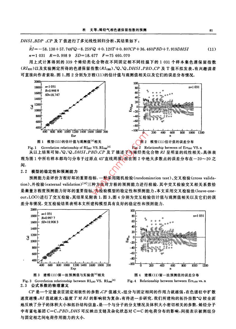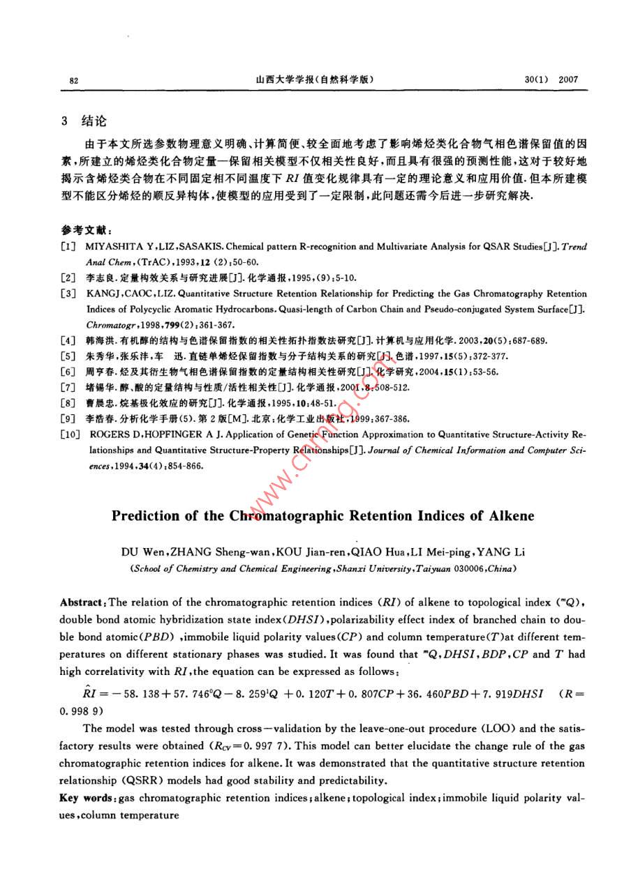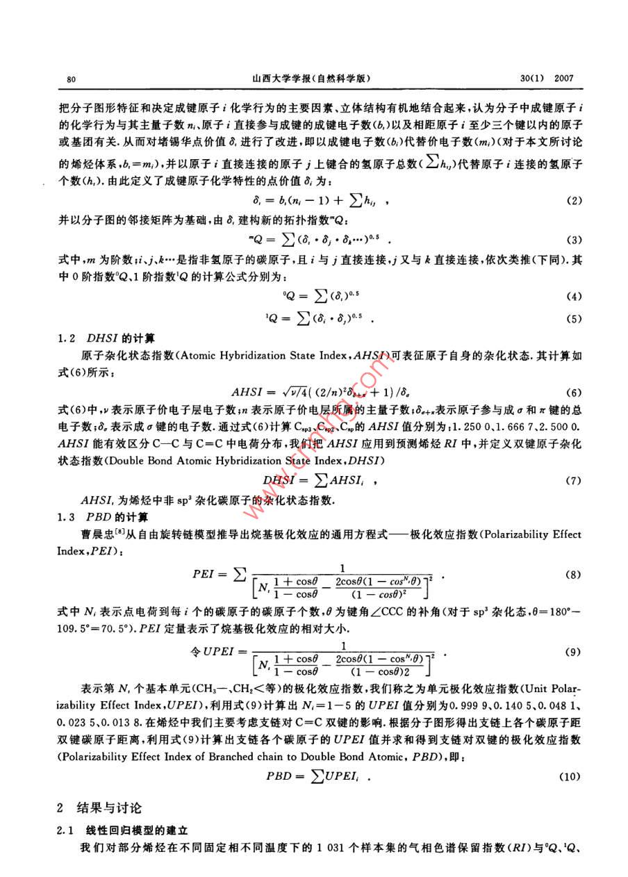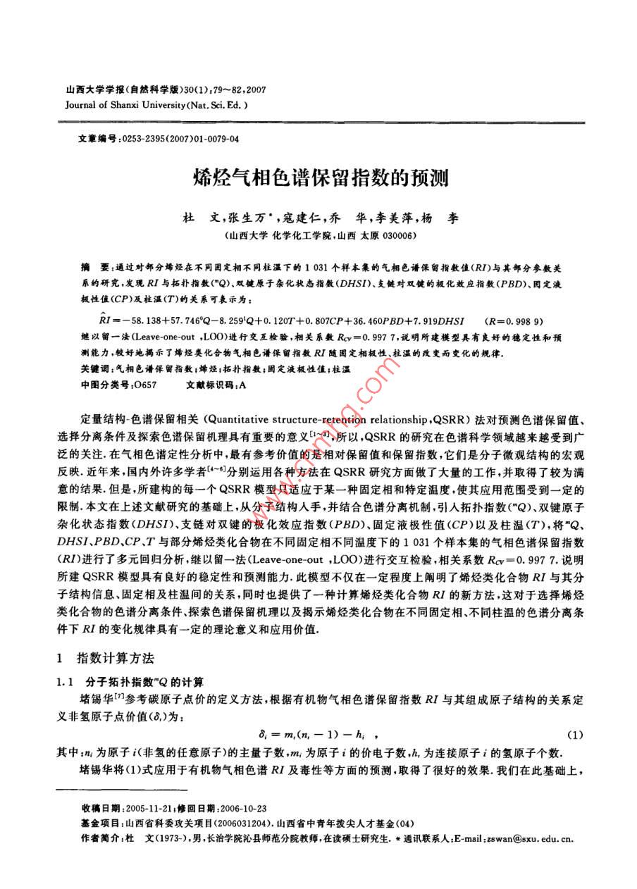 山西大學(xué)學(xué)報(bào)(自然科學(xué)版)30(1);79~ 82,2007Journal of Shanxi University(Nat. Sci. Ed. )文章編號(hào):0253-2395(2007)01 -0079-04烯烴氣相色譜保留指數(shù)的預(yù)測(cè)杜.文,張生萬* ,寇建仁,喬華,李美萍,楊李(山西大學(xué)化學(xué)化工學(xué)院,山西太原030006)摘要:通過對(duì)部分烯烴在不同固定相不同柱溫下的 1 031個(gè)祥本集的氣相色譜保留指數(shù)值(RI)與其部分參敷關(guān)系的研究,發(fā)現(xiàn)RI與拓?fù)渲笖?shù)("Q)、雙鍵原子雜化狀態(tài)指數(shù)(DHSI)、支鏈對(duì)雙鍵的極化效應(yīng)指數(shù)(PBD).固定液極性值(CP)及柱溫(T)的關(guān)系可表示為:RI= - 58.138+57.746°Q-8. 259'Q+0.120T+ 0.807CP+ 36. 460PBD+7. 919DHSI(R=0.998 9)繼以留一法(Leave- one-out ,L00)進(jìn)行交互檢驗(yàn),相關(guān)系數(shù)Rev=0. 9977,說明所建模型具有良好的穩(wěn)定性和預(yù)測(cè)能力,較好地揭示了烯烴類化合物氣相色譜保留指數(shù)RI隨固定相極性、柱溫的改變而變化的規(guī)律.關(guān)鍵詞:氣相色譜保留指數(shù);烯烴;拓?fù)渲笖?shù);固定液極性值;柱溫中圍分類號(hào):O657文獻(xiàn)標(biāo)識(shí)碼:A定量結(jié)構(gòu)-色譜保留相關(guān)(Quantitative structure- retention relationship ,QSRR)法對(duì)預(yù)測(cè)色譜保留值、選擇分離條件及探索色譜保留機(jī)理具有重要的意義[~],所以,QSRR的研究在色譜科學(xué)領(lǐng)域越來越受到廣泛的關(guān)注.在氣相色譜定性分析中,最有參考價(jià)值的是相對(duì)保留值和保留指數(shù),它們是分子微觀結(jié)構(gòu)的宏觀反映.近年來,國內(nèi)外許多學(xué)者[~0]分別運(yùn)用各種方法在QSRR研究方面做了大量的工作,并取得了較為滿意的結(jié)果.但是,所建構(gòu)的每一個(gè)QSRR模型只適應(yīng)于某-種固定相和特定溫度,使其應(yīng)用范圍受到-定的限制.本文在上述文獻(xiàn)研究的基礎(chǔ)上,從分子結(jié)構(gòu)人手,并結(jié)合色譜分離機(jī)制,引入拓?fù)渲笖?shù)("Q)、雙鍵原子雜化狀態(tài)指數(shù)(DHSI)、支鏈對(duì)雙鍵的極化效應(yīng)指數(shù)(PBD)、固定液極性值(CP)以及柱溫(T),將”Q、DHSI、PBD、CP.T與部分烯烴類化合物在不同固定相不同溫度下的1031個(gè)樣本集的氣相色譜保留指數(shù)(RI)進(jìn)行了多元回歸分析,繼以留一法(Leave -one -out ,L0O)進(jìn)行交互檢驗(yàn),相關(guān)系數(shù)Rev=0. 997 7. 說明所建QSRR模型具有良好的穩(wěn)定性和預(yù)測(cè)能力.此模型不僅在一-定程度上闡明了烯烴類化合物RI與其分子結(jié)構(gòu)信息、固定相及柱溫間的關(guān)系,同時(shí)也提供了一種計(jì)算烯烴類化合物RI的新方法,這對(duì)于選擇烯烴類化合物的色譜分離條件、探索色譜保留機(jī)理以及揭示烯烴類化合物在不同固定相、不同柱溫的色譜分離條件下RI的變化規(guī)律具有一定的理論意義和應(yīng)用價(jià)值.1指數(shù)計(jì)算方法1.1分子拓?fù)渲笖?shù)"Q的計(jì)算堵錫華川]參考碳原子點(diǎn)價(jià)的定義方法,根據(jù)有機(jī)物氣相色譜保留指數(shù)RI與其組成原子結(jié)構(gòu)的關(guān)系定義非氫原子點(diǎn)價(jià)值(8,)為:8;= m,(n,- 1)-h;,(1)其中;m;為原子i(非氫的任意原子)的主量子數(shù),m,為原子i的價(jià)電子數(shù),h,為連接原子i的氫原子個(gè)數(shù).堵錫華將(1)式應(yīng)用于有機(jī)物氣相色譜RI及毒性等方面的預(yù)測(cè),取得了很好的效果.我們?cè)诖嘶A(chǔ)上,收稿日期:2005-11-21;修回日期:2006-10-23基金項(xiàng)目:山西省科委攻關(guān)項(xiàng)目(2006031204).山西省中青年撥尖人才基金(04)作者簡介:杜文(1973-),男 ,長治學(xué)院沁縣師范分院教師,在讀碩士研究生. *邇訊聯(lián)系人:E-mail:zswan@sxu. edu. cn.80山西大學(xué)學(xué)報(bào)(自然科學(xué)版)30(1) 2007把分子圖形特征和決定成鍵原子i化學(xué)行為的主要因素、立體結(jié)構(gòu)有機(jī)地結(jié)合起來,認(rèn)為分子中成鍵原子i的化學(xué)行為與其主量子數(shù)n、原子i直接參與成鍵的成鍵電子數(shù)(6,)以及相距原子i至少三個(gè)鍵以內(nèi)的原子或基團(tuán)有關(guān).從而對(duì)堵錫華點(diǎn)價(jià)值8,進(jìn)行了改進(jìn),即以成鍵電子數(shù)(b.)代替價(jià)電子數(shù)(m;)(對(duì)于本文所討論的烯烴體系,b,=m;),并以原子i直接連接的原子j上鍵合的氫原子總數(shù)( 2h,)代替原子i連接的氫原子個(gè)數(shù)(h,).由此定義了成鍵原子化學(xué)特性的點(diǎn)價(jià)值8,為:8,= b,(n,-1)+習(xí)h,,(2)并以分子圖的鄰接矩陣為基礎(chǔ),由8,建構(gòu)新的拓?fù)渲笖?shù)"Q:"Q= 2<8, .8, .... .式中,m為階數(shù):;i.je...是指非氫原子的碳原子,且i與j直接連接,j又與k直接連接,依次類推(下同).其中0階指數(shù)°Q、1階指數(shù)'Q的計(jì)算公式分別為:°Q= 2(8.,).5(4)Q= 2<8,●8,)as .(5)1.2 DHSI 的計(jì)算原子雜化狀態(tài)指數(shù)(Atomic Hybridization State Index,AHSI)可表征原子自身的雜化狀態(tài).其計(jì)算如式(6)所示:AHSI =√0/4( (2/n)8+x + 1)/8。 .式(6)中,表示原子價(jià)電子層電子數(shù);n表示原子價(jià)電層所屬的主量子數(shù);δo+x表示原子參與成σ和π鍵的總電子數(shù);δ。表示成o鍵的電子數(shù).通過式(6)計(jì)算Cxp3、Cop2、C的AHSI值分別為:1.250 0、1. 666 7.2.500 0.AHSI能有效區(qū)分C-C與C=C中電荷分布,我們把AHSI應(yīng)用到預(yù)測(cè)烯烴RI中,并定義雙鍵原子雜化狀態(tài)
