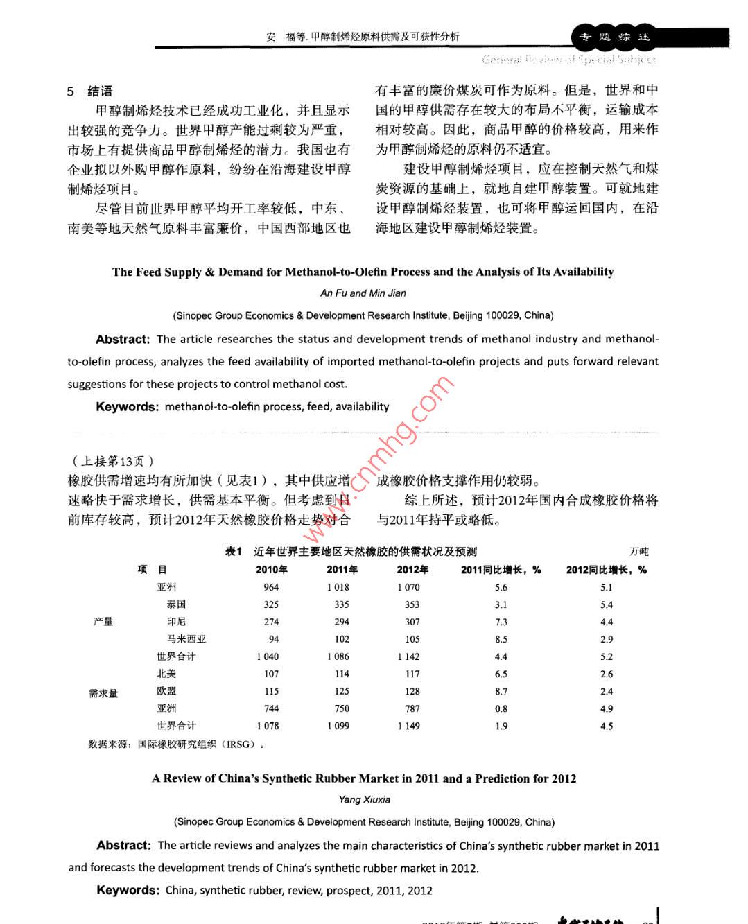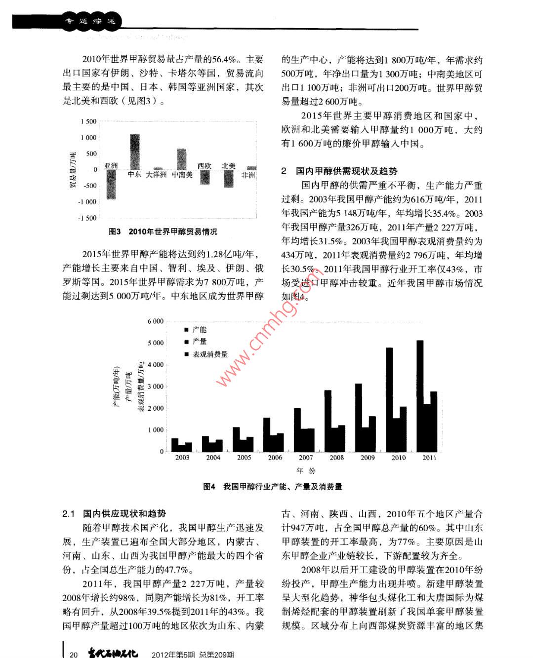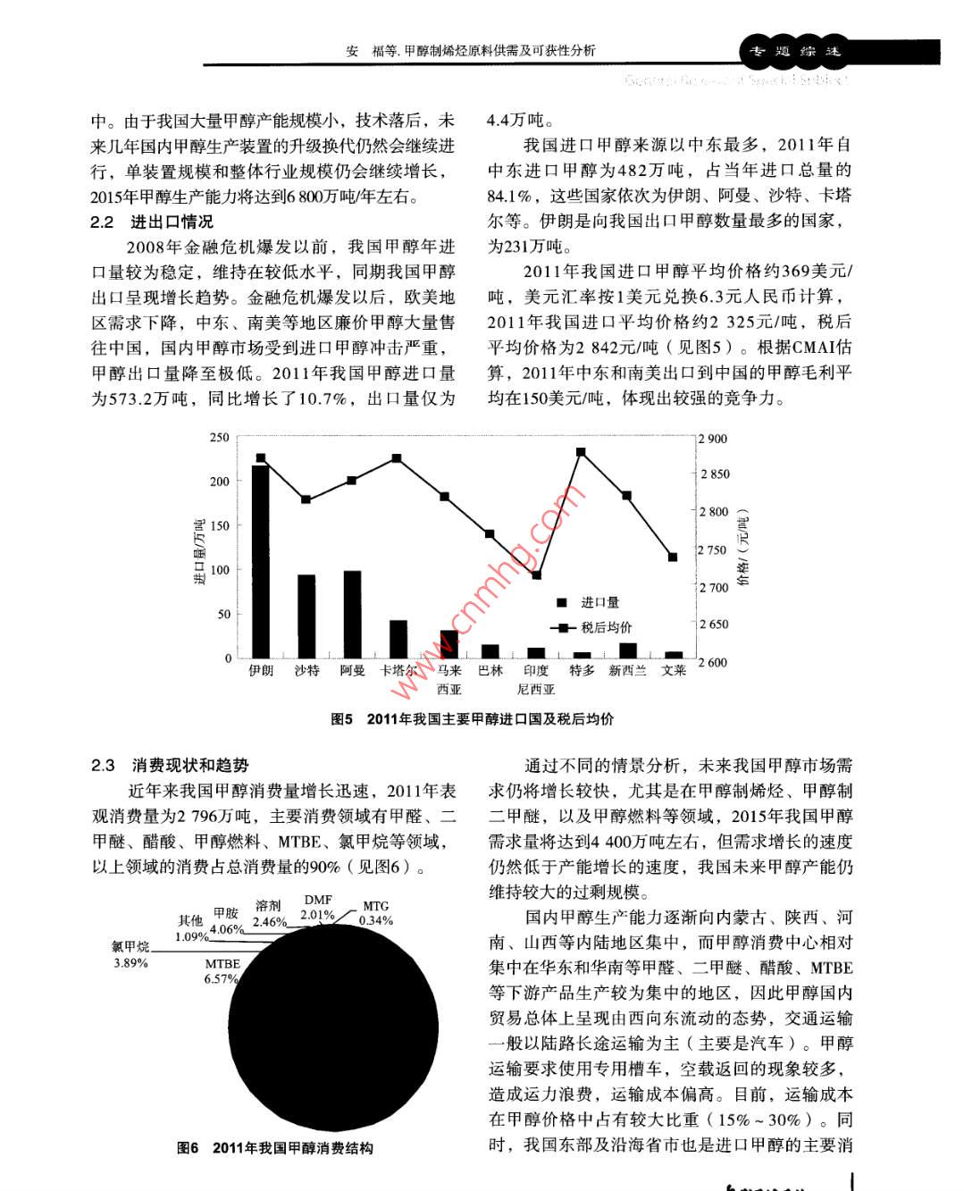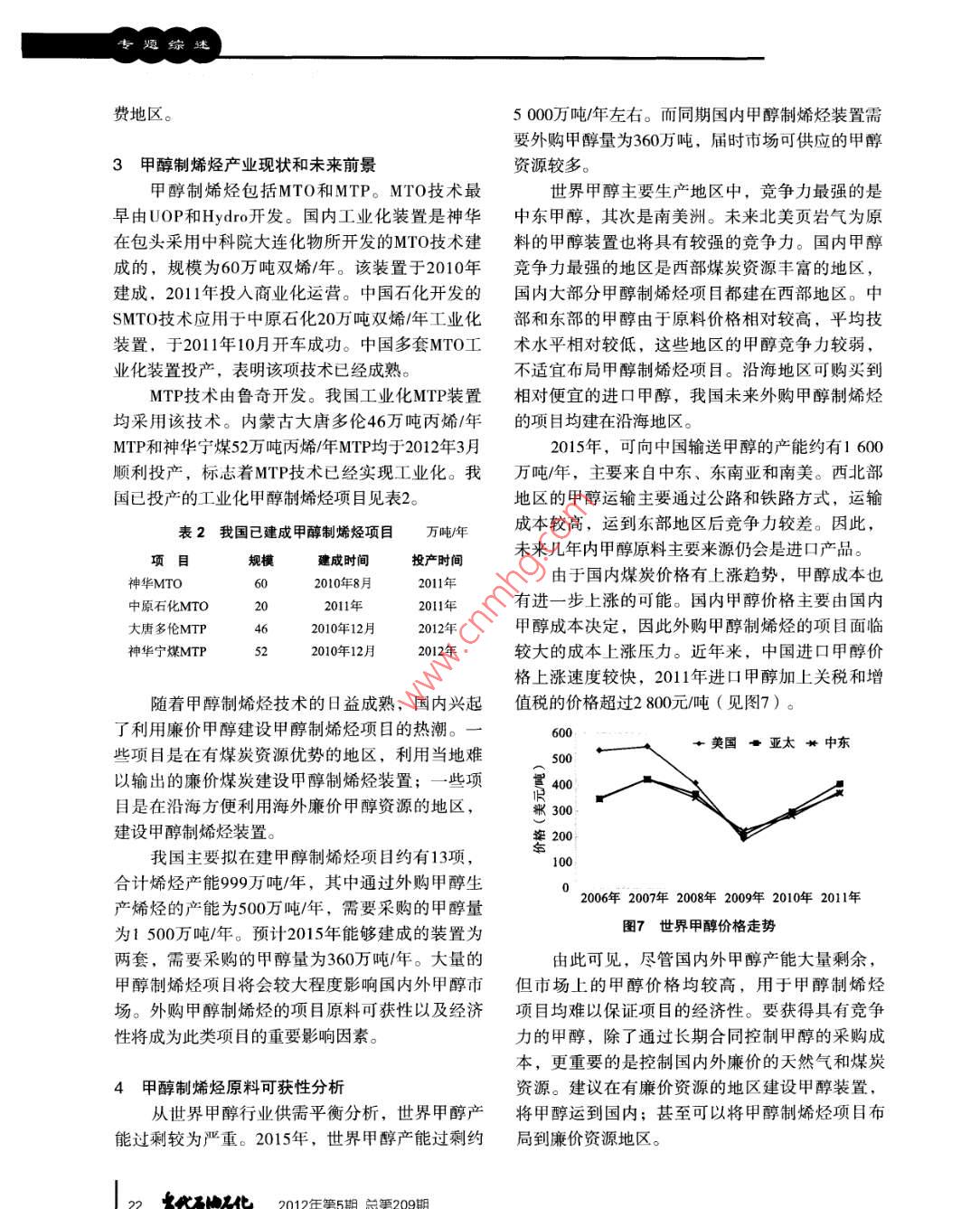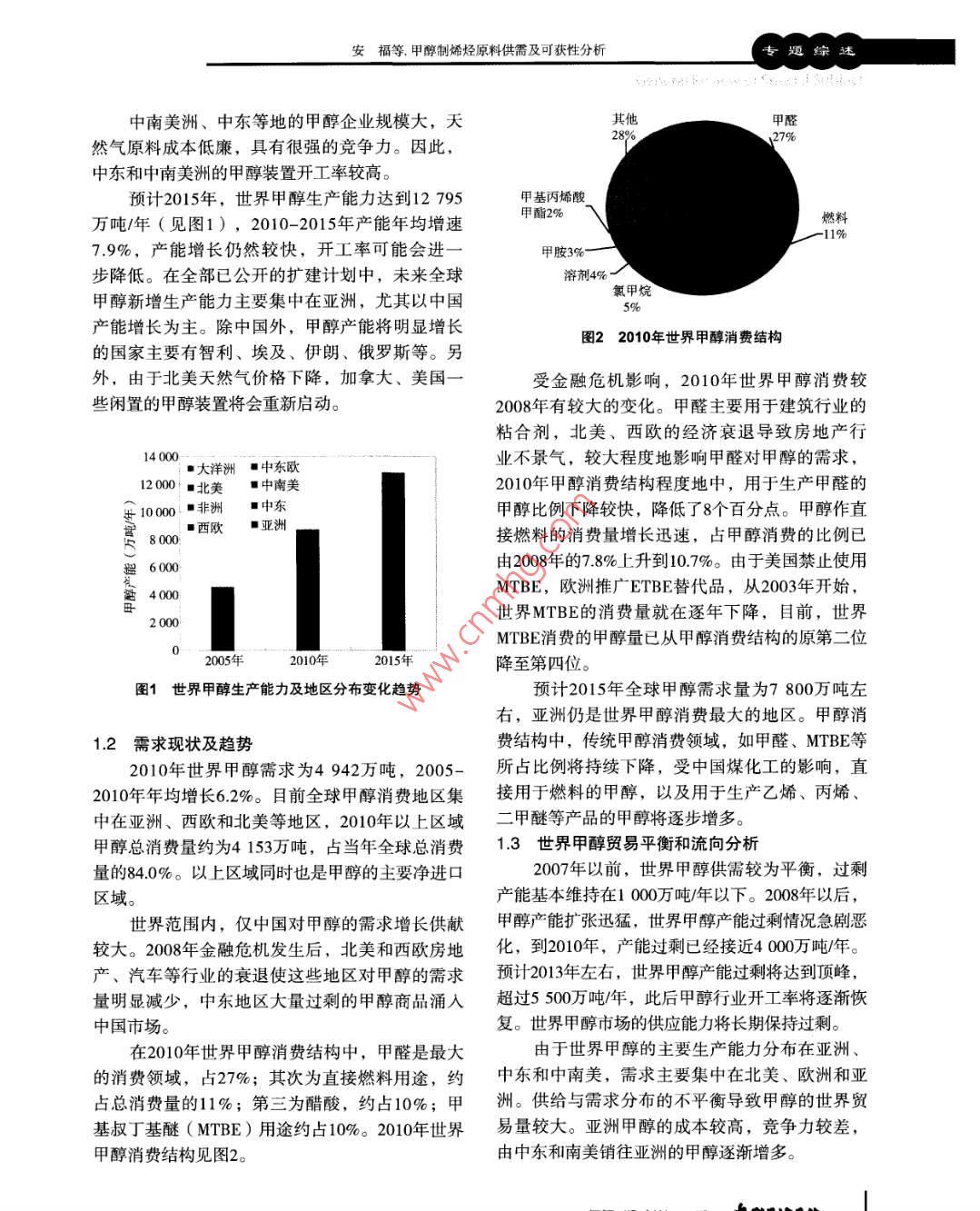專題綜述甲醇制烯烴原料供需及可獲性分析安福閔劍(中國石化集團公司經(jīng)濟技術(shù)研究院,北京100029 )摘要:研究了甲醇行業(yè)和甲醇制烯烴的現(xiàn)狀及發(fā)展趨勢,對外購甲醇制烯烴項目的原料可獲性進行了分析,提出了此類項目控制甲醇成本的相關(guān)建議。關(guān)鍵詞:甲醇制烯烴原料可獲性隨著國際原油價格的上漲,新型煤化工在產(chǎn)1世界甲醇供需現(xiàn)狀及趨勢品競爭力方面顯示出較強的競爭力。在我國煤炭2010年世界甲醇生產(chǎn)能力達到8731萬噸/年,資源豐富的內(nèi)蒙古、寧夏等地區(qū)建設(shè)的煤經(jīng)甲醇產(chǎn)量為4 942萬噸,表觀消費量為4942萬噸。世界制烯烴項目運行情況良好,在我國蒸汽裂解乙烯甲醇產(chǎn)能增長速度超過需求增長速度,產(chǎn)能出現(xiàn)裝置普遍虧損的情況下,具有較強的盈利能力。嚴(yán)重過剩的情況。2010年平均開工率為56.6%,比MTO/MTP成功工業(yè)化,擁有良好的商業(yè)前景,已2008年降低 了3.5個百分點。世界各地區(qū)甲醇供需經(jīng)成為國內(nèi)化工行業(yè)關(guān)注的焦點?,F(xiàn)狀見表1。表1 2010年世界甲醇供需狀況萬噸地區(qū)產(chǎn)能(萬噸/年)產(chǎn)量進口量出口量表觀消費量開工率,%亞洲”) 9261 8341 23920937.2中東! 5421 420461 17229492.1中南美1 0251271731579.2中東歐.4360832966.3西歐965629664361.非洲1861606486.0北美1168216471.大洋洲.9908092.合計873149422 785278556."注:不包括中東,以下同。1.1 供應(yīng)現(xiàn)狀及趨勢有所減少,但裝置更加大型化。西歐和北美的甲目前甲醇生產(chǎn)裝置主要分布在亞洲、中東醇產(chǎn)能出現(xiàn)萎縮。和中南美等煤炭和天然氣資源比較豐富的地區(qū),2010年以上地區(qū)的甲醇生產(chǎn)能力占到世界總生產(chǎn)收稿日期: 2012-04-07能力85.8%,其中亞洲占56.4%,中東占17.7%,中作者簡介:安福,工學(xué)碩士,高級工程師,1985南美洲占11.7% (見圖1)。最近幾年,亞洲甲醇生年畢業(yè)于天津大學(xué)化學(xué)工程系,現(xiàn)任中國石化集產(chǎn)能力增長最快,2010年產(chǎn)能達到4926萬噸/年,團公司經(jīng)濟技術(shù)研究院評估部主任,主要從事石主要增長來自于中國。中南美洲總產(chǎn)能比2005年油化工與煤化工項目評估、咨詢和規(guī)劃等工作。18 欠代石由工化 2012年第5期總第209期安福等,甲醇制烯烴原料供需及可獲性分析專題綜述中南美洲、中東等地的甲醇企業(yè)規(guī)模大,天其他甲醛28%27%然氣原料成本低廉,具有很強的競爭力。因此,中東和中南美洲的甲醇裝置開工率較高。預(yù)計2015年,世界甲醇生產(chǎn)能力達到12795甲基丙烯酸_萬噸/年( 見圖1),2010-2015年產(chǎn)能年均增速甲酯2%-11%7.9%,產(chǎn)能增長仍然較快,開工率可能會進一甲胺3%-步降低。在全部已公開的擴建計劃中,未來全球溶劑4%"氯甲烷甲醇新增生產(chǎn)能力主要集中在亞洲,尤其以中國5%產(chǎn)能增長為主。除中國外,甲醇產(chǎn)能將明顯增長圖22010年世界 甲醇消費結(jié)構(gòu)的國家主要有智利、埃及、伊朗、俄羅斯等。另外,由于北美天然氣價格下降,加拿大、美國一受金融危機影響,2010年世界甲醇消費較些閑置的甲醇裝置將會重新啟動。2008年有較大的變化。甲醛主要用于建筑行業(yè)的粘合劑,北美、西歐的經(jīng)濟衰退導(dǎo)致房地產(chǎn)行14 00業(yè)不景氣,較大程度地影響甲醛對甲醇的需求,■大洋洲■中東歐12000■北美■ 中南美2010年甲醇消費結(jié)構(gòu)程度地中,用于生產(chǎn)甲醛的世10000■非洲■ 中東甲醇比例下降較快,降低了8個百分點。甲醇作直8000■西歐■亞洲接燃料的消費量增長迅速,占甲醇消費的比例已5由2008年的7.8%上升到10.7%。由于美國禁止使用s 6000MTBE,歐洲推廣ETBE替代品,從2003年開始,色4000世界MTBE的消費量就在逐年下降,目前,世界2000MTBE消費的甲醇量已從甲醇消費結(jié)構(gòu)的原第二位2005年2010年2015年降至第四位。圖1世界 甲醇生產(chǎn)能力及地區(qū)分布變化趨勢預(yù)計2015年全球甲醇需求量為7800萬噸左右,亞洲仍是世界甲醇消費最大的地區(qū)。甲醇消1.2需求現(xiàn)狀及趨勢費結(jié)構(gòu)中,傳統(tǒng)甲醇消費領(lǐng)域,如甲醛、MTBE等2010年世界甲醇需求為4942萬噸,2005-所占比例將持續(xù)下降,受中國煤化工的影響,直2010年年均增長6.2%。目前全球甲醇消費地區(qū)集接用于燃料的甲醇,以及用于生產(chǎn)乙烯、丙烯、中在亞洲、西歐和北美等地區(qū),2010年以上區(qū)域二甲醚等產(chǎn)品的甲醇將逐步增多。甲醇總消費量約為4153萬噸,占當(dāng)年全球總消費1.3世界甲醇貿(mào)易平衡和流向分析量的84.0%。以上區(qū)域同時也是甲醇的主要凈進口2007年以前,世界甲醇供需較為平衡,過剩區(qū)域。產(chǎn)能基本維持在1000萬噸/年以下。2008年以后,世界范圍內(nèi),僅中國對甲醇的需求增長供獻甲醇產(chǎn)能擴張迅猛,世界甲醇產(chǎn)能過剩情況急劇惡較大。2008年金融危機發(fā)生后,北美和西歐房地化,到2010年, 產(chǎn)能過剩已經(jīng)接近4000萬噸/年。產(chǎn)、汽車等行業(yè)的衰退使這些地區(qū)對甲醇的需求預(yù)計2013年左右,世界甲醇產(chǎn)能過剩將達到頂峰,量明顯減少,中東地區(qū)大量過剩的甲醇商品涌入超過5 500萬噸/年,此后甲醇行業(yè)開工率將逐漸恢中國市場。復(fù)。世界甲醇市場的供應(yīng)能力將長期保持過剩。在20