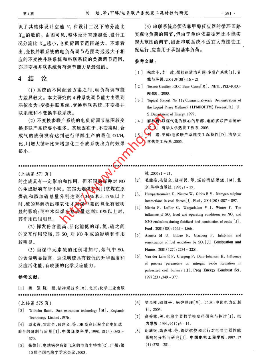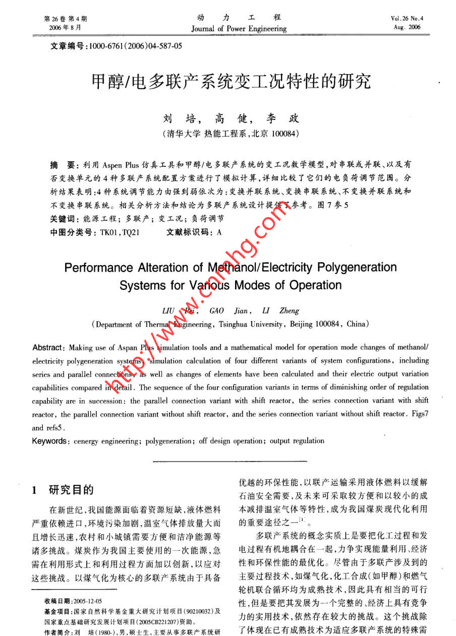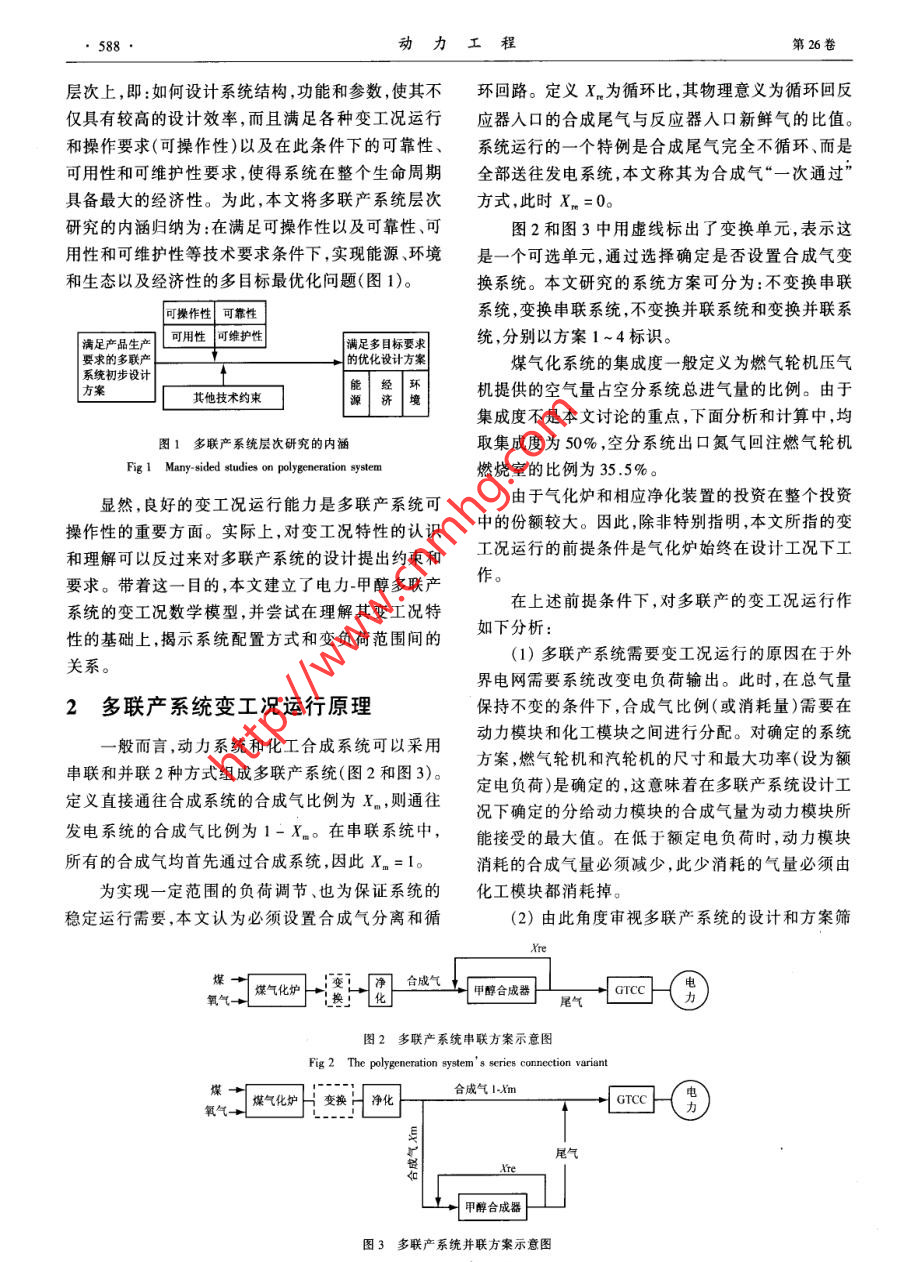 第26卷第4期Vol. 26 No.42006年8月Jourmal of Power EngineeringAug. 2006文章編號: 000-6761(2006)04 -587-05甲醇/電多聯(lián)產(chǎn)系統(tǒng)變工況特性的研究劉培,高健,李政(清華大學(xué)熱能工程系,北京100084)摘要:利用Aspen Plus仿真工具和甲醇/電多聯(lián)產(chǎn)系統(tǒng)的變工況數(shù)學(xué)模型,對串聯(lián)或并聯(lián)、以及有否變換單元的4種多聯(lián)產(chǎn)系統(tǒng)配置方案進行了模擬計算,詳細比較了它們的電負荷調(diào)節(jié)范圍。分析結(jié)果表明:4種系統(tǒng)調(diào)節(jié)能力由強到弱依次為:變換并聯(lián)系統(tǒng)、變換串聯(lián)系統(tǒng)、不變換并聯(lián)系統(tǒng)和不變換串聯(lián)系統(tǒng)。相關(guān)分析方法和結(jié)論為多聯(lián)產(chǎn)系統(tǒng)設(shè)計提供了參考。圖7參5關(guān)鍵詞:能源工程;多聯(lián)產(chǎn);變工況;負荷調(diào)節(jié)中圖分類號: TK01 ,TQ21文獻標(biāo)識碼: APerformance Alteration of Methanol/ Electricity PolygenerationSystems for Various Modes of OperationLIU Pei, GAO Jian, LI Zheng(Department of Thermal Engineering, Tsinghua University, Beiing 100084, China)Abstract: Making use of Aspan Plus simulation tools and a mathematical model for operation mode changes of methanol/electricity polygeneration systems, simulation calculation of four different variants of system configurations ,includingseries and parallel connections, as well as changes of elements have been calculated and their eletric output variationcapabilties compared in detail . The sequence of the four configuration variants in terms of diminishing order of regulationcapability are in succession: the parallel connection variant with shift reactor, the series connection variant with shiftreactor, the parallel connection variant without shift reactor, and the series connection variant without shift reactor. Figs7and refs5 .Keywords: cenergy engineering; polygeneration; off design operation; output regulation優(yōu)越的環(huán)保性能,以聯(lián)產(chǎn)運輸采用液體燃料以緩解1研究目的石油安全需要,及未來可采取較方便和以較小的成在新世紀(jì),我國能源面臨著資源短缺,液體燃料本減排溫室氣體等特性,成為我國煤炭現(xiàn)代化利用嚴(yán)重依賴進口,環(huán)境污染加劇,溫室氣體排放量大而的重要途徑之一”。且增長迅速,農(nóng)村和小城鎮(zhèn)需要方便和潔凈能源等多聯(lián)產(chǎn)系統(tǒng)的概念實質(zhì)上是要把化工過程和發(fā)諸多挑戰(zhàn)。煤炭作為我國主要使用的一次能源,急電過程有機地耦合在- - 起,力爭實現(xiàn)能量利用、經(jīng)濟需在利用形式上和利用過程方面加以創(chuàng)新,以應(yīng)對性和環(huán)保性能的最優(yōu)化。盡管由于多聯(lián)產(chǎn)涉及到的這些挑戰(zhàn)。以煤氣化為核心的多聯(lián)產(chǎn)系統(tǒng)由于具備主要過程技術(shù),如煤氣化,化工合成(如甲醇)和燃氣輪機聯(lián)合循環(huán)均為成熟技術(shù),因此具有相當(dāng)?shù)目尚惺崭迦掌?2005-12-05性,但是要把其發(fā)展為一個完整的、經(jīng)濟上具有競爭基金項目:國家自然科學(xué)基金重大研究計劃項目(90210032)及力的實用技術(shù),依然存在較大的挑戰(zhàn)。這個挑戰(zhàn)除國家重點基礎(chǔ)研究發(fā)展計劃項目(2005CB221207)資助。作者簡介:劉培(1980-),男 ,碩士生,主要從事多聯(lián)產(chǎn)系統(tǒng)研了體現(xiàn)在已有成熟技術(shù)為適應(yīng)多聯(lián)產(chǎn)系統(tǒng)的特殊需方方數(shù)據(jù)要尚需改變和改進外,更重要的則體現(xiàn)在系統(tǒng)集成588動力工程第26卷層次.上,即:如何設(shè)計系統(tǒng)結(jié)構(gòu),功能和參數(shù),使其不環(huán)回路。定義x為循環(huán)比,其物理意義為循環(huán)回反僅具有較高的設(shè)計效率,而且滿足各種變工況運行應(yīng)器入口的合成尾氣與反應(yīng)器入口新鮮氣的比值。和操作要求(可操作性)以及在此條件下的可靠性、系統(tǒng)運行的- 一個特例是合成尾氣完全不循環(huán)、而是.可用性和可維護性要求,使得系統(tǒng)在整個生命周期全部送往發(fā)電系統(tǒng),本文稱其為合成氣“一次通過”具備最大的經(jīng)濟性。為此,本文將多聯(lián)產(chǎn)系統(tǒng)層次方式,此時X。=0。研究的內(nèi)涵歸納為:在滿足可操作性以及可靠性、可圖2和圖3中用虛線標(biāo)出了變換單元,表示這用性和可維護性等技術(shù)要求條件下,實現(xiàn)能源、環(huán)境是一個可選單元,通過選擇確定是否設(shè)置合成氣變和生態(tài)以及經(jīng)濟性的多目標(biāo)最優(yōu)化問題(圖1)。換系統(tǒng)。本文研究的系統(tǒng)方案可分為:不變換串聯(lián)可操作性 可靠性系統(tǒng),變換串聯(lián)系統(tǒng),不變換并聯(lián)系統(tǒng)和變換并聯(lián)系滿足產(chǎn)品生產(chǎn)可用性可維護性滿足多目標(biāo)要求統(tǒng),分別以方案1~4標(biāo)識。要求的多聯(lián)產(chǎn)|的優(yōu)化設(shè)計方案煤氣化系統(tǒng)的集成度-般定義為燃氣輪機壓氣系統(tǒng)初步設(shè)計方能經(jīng)環(huán)機提供的空氣量占空分系統(tǒng)總進氣量的比例。由于其他技術(shù)約束集成度不是本文討論的重點,下面分析和計算中,均圖1多聯(lián)產(chǎn) 系統(tǒng)層次研究的內(nèi)涵取集成度為50% ,空分系統(tǒng)出口氮氣回注燃氣輪機Fig 1 Many- sided studies on polygeneration system燃燒室的比例為35.5%。顯然,良好的變工況運行能力是多聯(lián)產