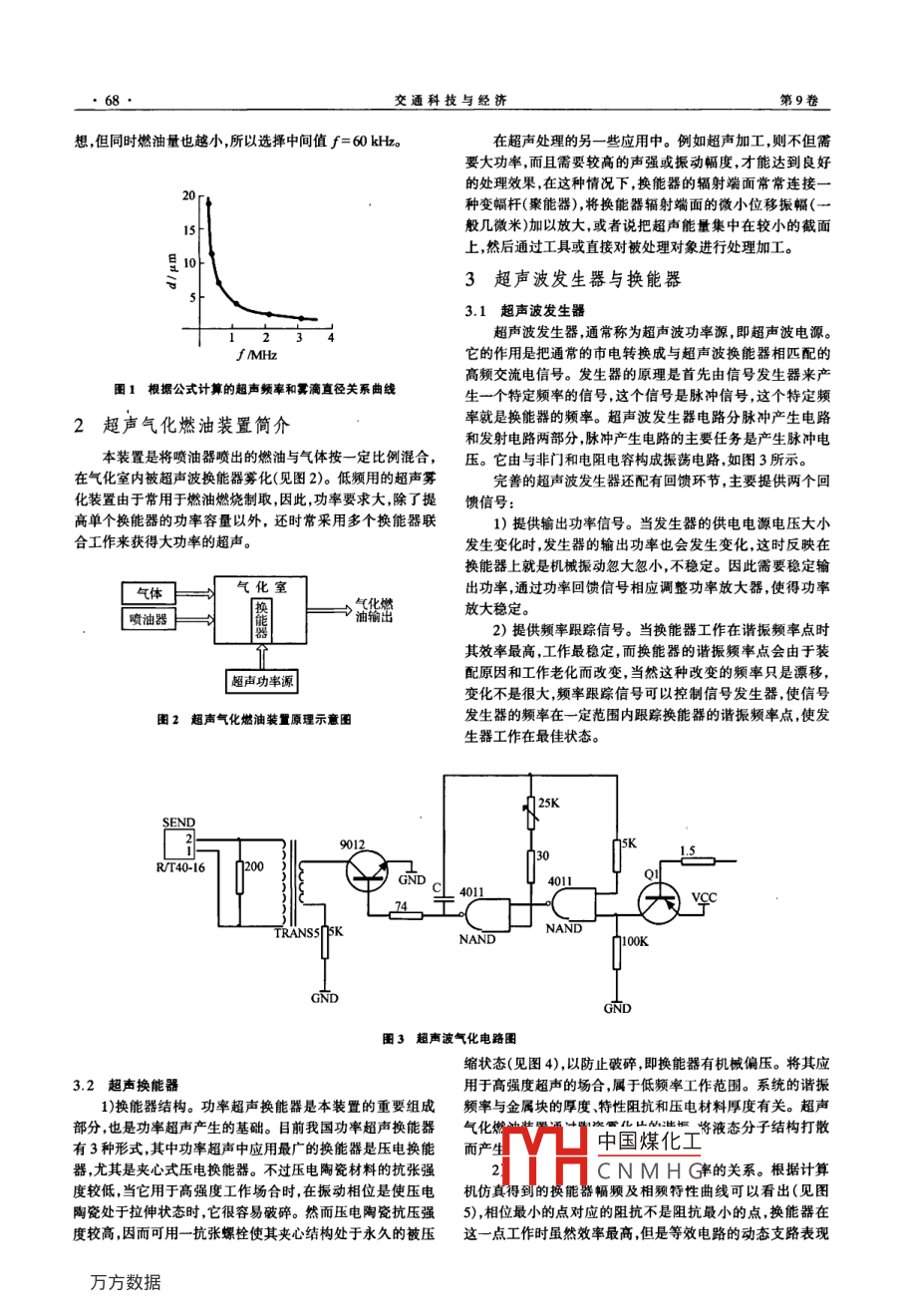 Technology Economy in Areas of Communications刪技與經(jīng)酒超聲高效氣化燃油的研究秦進(jìn)平1,喬爽2,盛程潛2(1.黑龍江工程學(xué)院教務(wù)處,黑龍江哈爾濱150050;2.黑龍江工程學(xué)院電子工程系,黑龍江哈爾濱150050)摘要:目前,人們對城市空氣質(zhì)量以及地球石油資源危機(jī)等問題日益重視。利用浸于液體中的超聲換能器產(chǎn)生震動的原理,將燃油破碎成極其微小的油滴,使其氣化,提高燃油的利用效率,大大減少環(huán)境污染程度,因此具有極廣泛的市場前景和應(yīng)用價(jià)值。針對超聲波氣化原理、超聲氣化燃油裝置、超聲換能器及超聲波發(fā)生器與換能器的匹配問題進(jìn)行了討論。關(guān)鍵詞:姬聲換能器;氣化燃油;匹配;燃油裝置中圖分類號:U464.136文獻(xiàn)標(biāo)識碼:A文章編號:1008-5696(2007)04-0067-0Research on effective supersonic gasified fuelQIN Jin-ping, QIAo Shuang, SHENG Cheng-qian(1. Educational Administration Office, Heilongjiang Institute of Technology, Harbin 150050, China: 2. Dept. of Electronic Engineer.ing, Heilongjiang Institute of Technology, Harbin 150050, China)Abstract: Nowadays, people are attaching importance to the air quality of city energy sources crisis and so onThe paper applies the principle that the ultrasonic transducer can produce vibration in liquid. The technologybreaks fuel into extremely small oil drips and causes its gasification, which enhances the fuel efficiency.Thetechnology simultaneously greatly reduces the environmental pollution. Therefore it has the extremely wide-spread market prospect and the application value. This article describes the ultrasonic wave gasification princile, the supersonic gasified fuel equipment, the ultrasonic transducer, the ultrasonic generator. The transducermatch question has carried on discussionKey words: ultrasonic transducer; gasified fuel; match; fuel device近年來,隨著人們生活水平的日益提高,越來越多的轎車進(jìn)入尋常百姓家庭,同時(shí)對汽車燃油的需求量也在同步急1超聲氣化原理增長。傳統(tǒng)的汽油汽車發(fā)動機(jī)中,汽油是經(jīng)過化油器后和空早在1927年汗·伍德及智梅斯就曾指出,當(dāng)一束強(qiáng)超聲氣混合而進(jìn)入氣缸的,化油器是安裝在發(fā)動機(jī)進(jìn)氣通路上的波自浸于液體中的換能器朝向液面發(fā)出后,液面上將出現(xiàn)一種裝置它的作用是把汽油和空氣自動地按一定比例混合層薄霧。薄霧的濃淡與超聲波的強(qiáng)度有關(guān),而霧滴的大小則及進(jìn)行霧化但由于汽油和空氣的混合比例無法準(zhǔn)確使燃油與超聲波的頻率及液體的表面張力有關(guān)。在超聲作用下,液不能充分燃燒,從而造成燃料消耗多排放超標(biāo),即不經(jīng)濟(jì),又體在氣相中分散并在液體表面形成細(xì)霧飛逸的過程稱超聲不利于環(huán)保。隨著汽車技術(shù)的發(fā)展燃油噴射裝置正在逐步霧化或氣化。其空化作用是超聲成霧的主要原因取代傳統(tǒng)化油器式供油系統(tǒng)。但是這種燃油噴射系統(tǒng)對燃料現(xiàn)巳證明霧滴直徑稍小于表面波的半波長,這使得人的利用率和空燃比的調(diào)配也存在一定的缺陷。而超聲技術(shù)是們傾向于認(rèn)為霧滴是表面波在波峰處的噴出物。超聲霧化以超聲能量使物體或物性某些狀態(tài)變化的應(yīng)用技術(shù)。它對提所釆用的頻率一般從40k至幾兆赫不等,這取決于所要高產(chǎn)品質(zhì)量、降低生產(chǎn)成本防治環(huán)境污染提高生產(chǎn)效率具求的霧滴的大小,一般霧滴的尺度為120-30gm。霧滴平均有特殊的潛在能力廣泛應(yīng)用于機(jī)械、電子、環(huán)保、化工能源等直徑的大小與超聲波頻率成函數(shù)關(guān)系,頻率高則霧細(xì),其數(shù)許多重要領(lǐng)域。超聲波技術(shù)又是以物理機(jī)械振動、電子、材學(xué)表達(dá)式為料等學(xué)科為基礎(chǔ)的高新技術(shù)之一。所以超聲氣化燃油具有很d=(rr)3/(4pf2)3(1)好的霧化效果和極高的效率利用超聲氣化可使燃油充分分式中:d為超聲波霧化霧滴的平均直徑,m;π為圓周率解成微小粒子使汽油充分燃燒既節(jié)省了燃料又可延長發(fā)動3.14機(jī)使用壽命減小有害氣體排放。液體于V中國煤化工,為霧化汽迪CNMHG×103gm2代入式收稿日期:2007-03-04(1)經(jīng)過超聲振動頻率計(jì)算多組數(shù)據(jù),畫在坐標(biāo)系內(nèi)如圖1基金項(xiàng)目:黑龍江省教育廳科研項(xiàng)目(10551260)所示。其中d=22m時(shí),f=55kHz;d=16pm時(shí),∫=85作者簡介:秦近平(1963~),男,教授,研究方向:計(jì)算機(jī)控制技術(shù)k。雖然頻率越高,霧化后的油滴直徑越小,霧化效果越理交通科技與經(jīng)濟(jì)第9卷想,但同時(shí)燃油量也越小,所以選擇中間值f=60kHb在超聲處理的另一些應(yīng)用中。例如超聲加工,則不但需要大功率,而且需要較高的聲強(qiáng)或振動幅度,才能達(dá)到良好的處理效果,在這種情況下,換能器的輻射端面常常連接一種變幅桿(聚能器),將換能器輻射端面的微小位移振幅(般幾微米)加以放大,或者說把超聲能量集中在較小的截面上,然后通過工具或直接對被處理對象進(jìn)行處理加工。3超聲波發(fā)生器與換能器3.1超聲波發(fā)生器超聲波發(fā)生器,通常稱為超聲波功率源,即超聲波電源mHZ它的作用是把通常的市電轉(zhuǎn)換成與超聲波換能器相匹配的高頻交流電信號。發(fā)生器的原理是首先由信號發(fā)生器來產(chǎn)圖1根據(jù)公式計(jì)算的超