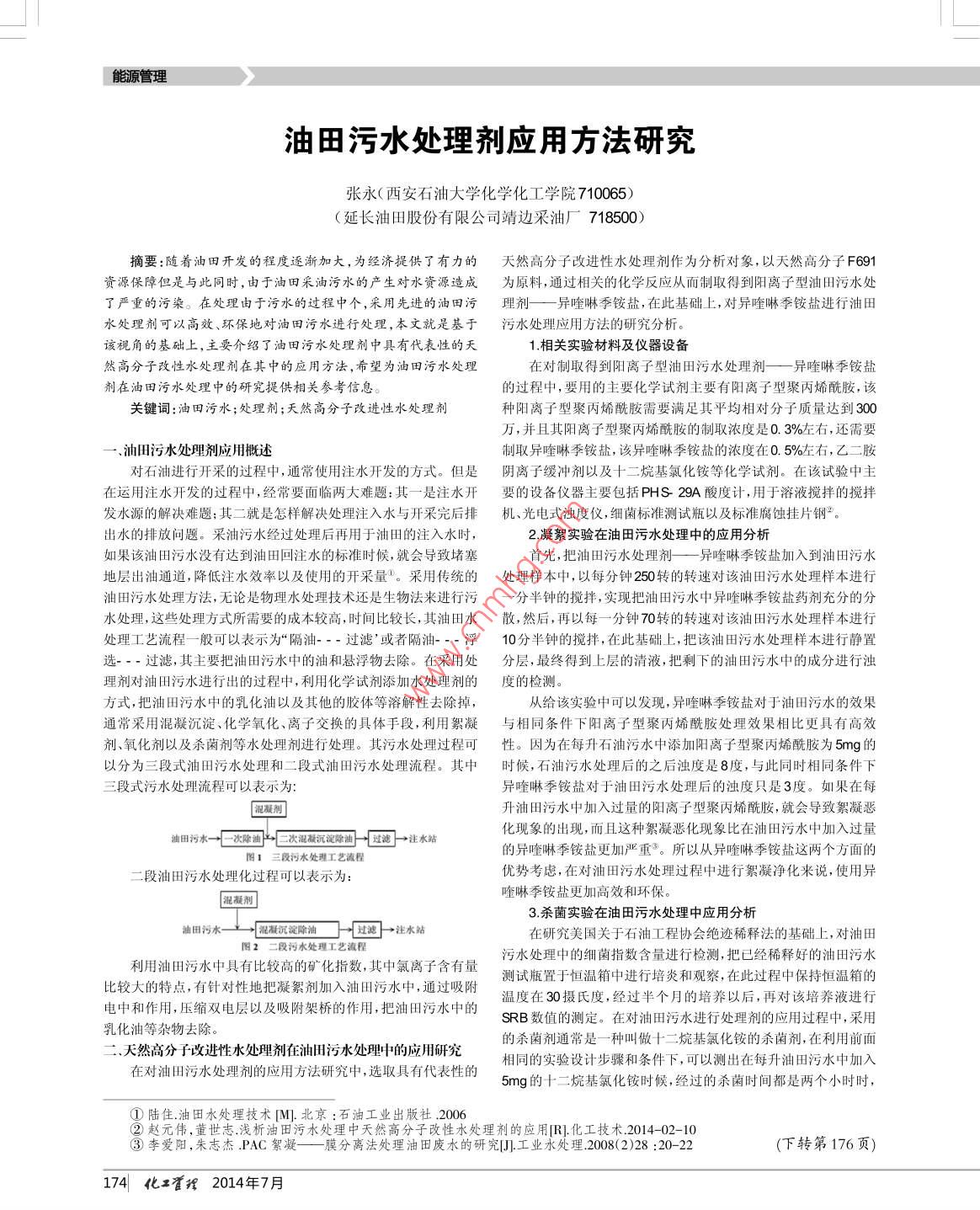 能源管理油田污水處理劑應(yīng)用方法研究張永(西安石油大學(xué)化學(xué)化工學(xué)院710065)(延長油田股份有限公司靖邊采油廠718500)摘要:隨著油田開發(fā)的程度逐漸加大,為經(jīng)濟(jì)提供了有力的天然高分子改進(jìn)性水處理劑作為分析對象,以天然高分子F691資源保障但是與此同時,由于油田采油污水的產(chǎn)生對水資源造成為原料,通過相關(guān)的化學(xué)反應(yīng)從而制取得到陽離子型油田污水處了嚴(yán)重的污染。在處理由于污水的過程中個,采用先進(jìn)的油田污理劑——異喹啉季銨鹽,在此基礎(chǔ)上,對異喹啉季銨鹽進(jìn)行油田水處理劑可以高效、環(huán)保地對油田污水進(jìn)行處理,本文就是基于污水處理應(yīng)用方法的硏究分析。該視角的基礎(chǔ)上,主要介紹了油田污水處理劑中具有代表性的天1相關(guān)實(shí)驗材料及儀器設(shè)備然高分子改性水處理劑在其中的應(yīng)用方法,希望為油田污水處理在對制取得到陽離子型油田污水處理劑——異喹啉季銨鹽劑在油田污水處理中的研究提供相關(guān)參考信息。的過程中,要用的主要化學(xué)試劑主要有陽離子型聚丙烯酰胺,該關(guān)鍵詞:油田污水;處理劑;天然高分子改進(jìn)性水處理劑種陽離子型聚丙烯酰胺需要滿足其平均相對分子質(zhì)量達(dá)到300萬,并且其陽離子型聚丙烯酰胺的制取濃度是0.3%左右,還需要油田污水處理劑應(yīng)用概述制取異喹啉季銨鹽,該異喹啉季銨鹽的濃度在0.5%左右,乙二胺對石油進(jìn)行開采的過程中,通常使用注水開發(fā)的方式。但是陰離子緩沖劑以及十二烷基氯化銨等化學(xué)試劑。在該試驗中主在運(yùn)用注水開發(fā)的過程中,經(jīng)常要面臨兩大難題:其一是注水開要的設(shè)備儀器主要包括PHS29A酸度計,用于溶液攪拌的攪拌發(fā)水源的解決難題;其二就是怎樣解決處理注入水與開采完后排機(jī)、光電式濁度儀,細(xì)菌標(biāo)準(zhǔn)測試瓶以及標(biāo)準(zhǔn)腐蝕掛片鋼出水的排放問題。采油污水經(jīng)過處理后再用于油田的注入水時2凝絮實(shí)驗在油田污水處理中的應(yīng)用分析如果該油田污水沒有達(dá)到油田回注水的標(biāo)準(zhǔn)時候,就會導(dǎo)致堵塞首先,把油田污水處理劑——異喹啉季銨鹽加入到油田污水地層出油通道,降低注水效率以及使用的開采量。采用傳統(tǒng)的處理樣本中,以每分鐘250轉(zhuǎn)的轉(zhuǎn)速對該油田污水處理樣本進(jìn)行油田污水處理方法,無論是物理水處理技術(shù)還是生物法來進(jìn)行污一分半鐘的攪拌,實(shí)現(xiàn)把油田污水中異喹啉季銨鹽藥劑充分的分水處理,這些處理方式所需要的成本較高,時間比較長,其油田水散,然后,再以每一分鐘70轉(zhuǎn)的轉(zhuǎn)速對該油田污水處理樣本進(jìn)行處理工藝流程一般可以表示為“隔油---過濾'或者隔油---浮10分半鐘的攪拌,在此基礎(chǔ)上,把該油田污水處理樣本進(jìn)行靜置選---過濾,其主要把油田污水中的油和懸浮物去除。在采用處分層,最終得到上層的清液,把剩下的油田污水中的成分進(jìn)行濁理劑對油田污水進(jìn)行出的過程中,利用化學(xué)試劑添加水處理劑的度的檢測。方式,把油田污水中的乳化油以及其他的膠體等溶解性去除掉,從給該實(shí)驗中可以發(fā)現(xiàn),異喹啉季銨鹽對于油田污水的效果通常采用混凝沉淀、化學(xué)氧化、離子交換的具體手段,利用絮凝與相同條件下陽離子型聚丙烯酰胺處理效果相比更具有高效劑、氧化劑以及殺菌劑等水處理劑進(jìn)行處理。其污水處理過程可性。因為在每升石油污水中添加陽離子型聚丙烯酰胺為5mg的以分為三段式油田污水處理和二段式油田污水處理流程。其中時候,石油污水處理后的之后濁度是8度,與此同時相同條件下三段式污水處理流程可以表示為:異喹啉季銨鹽對于油田污水處理后的濁度只是3度。如果在每混凝劑升油田污水中加入過量的陽離子型聚丙烯酰胺,就會導(dǎo)致絮凝惡油田污水一一次障迪三次混碳沉淀除油一過濾→注水站化現(xiàn)象的出現(xiàn),而且這種絮凝惡化現(xiàn)象比在油田污水中加入過量圖1三段污水處理工藝流程的異喹啉季銨鹽更加嚴(yán)重。所以從異喹啉季銨鹽這兩個方面的段油田污水處理化過程可以表示為優(yōu)勢考慮,在對油田污水處理過程中進(jìn)行絮凝凈化來說,使用異足凝劑喹啉季銨鹽更加高效和環(huán)保3殺菌實(shí)驗在油田污水處理中應(yīng)用分析油田污水混凝沉淀除油過濾}→注水站在研究美國關(guān)于石油工程協(xié)會絕跡稀釋法的基礎(chǔ)上,對油田圖2二段污水處理工藝流程利用油田污水中具有比較高的礦化指數(shù),其中氯離子含有量污水處理中的細(xì)菌指數(shù)含量進(jìn)行檢測,把已經(jīng)稀釋好的油田污水比較大的特點(diǎn),有針對性地把凝絮劑加入油田污水中,通過吸附測試瓶置于恒溫箱中進(jìn)行培炎和觀察,在此過程中保持恒溫箱的電中和作用,壓縮雙電層以及吸附架橋的作用,把油田污水中的溫度在30攝氏度,經(jīng)過半個月的培養(yǎng)以后,再對該培養(yǎng)液進(jìn)行SRB數(shù)值的測定。在對油田污水進(jìn)行處理劑的應(yīng)用過程中,采用乳化油等雜物去除。二、天然高分子改進(jìn)性水處理劑在油田污水處理中的應(yīng)用研究的殺菌劑通常是一種叫做十