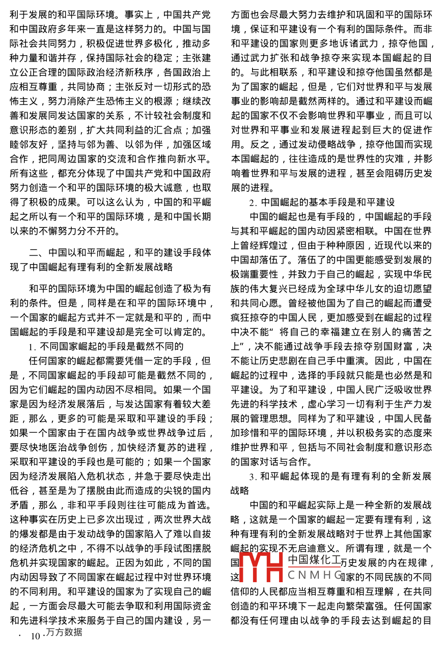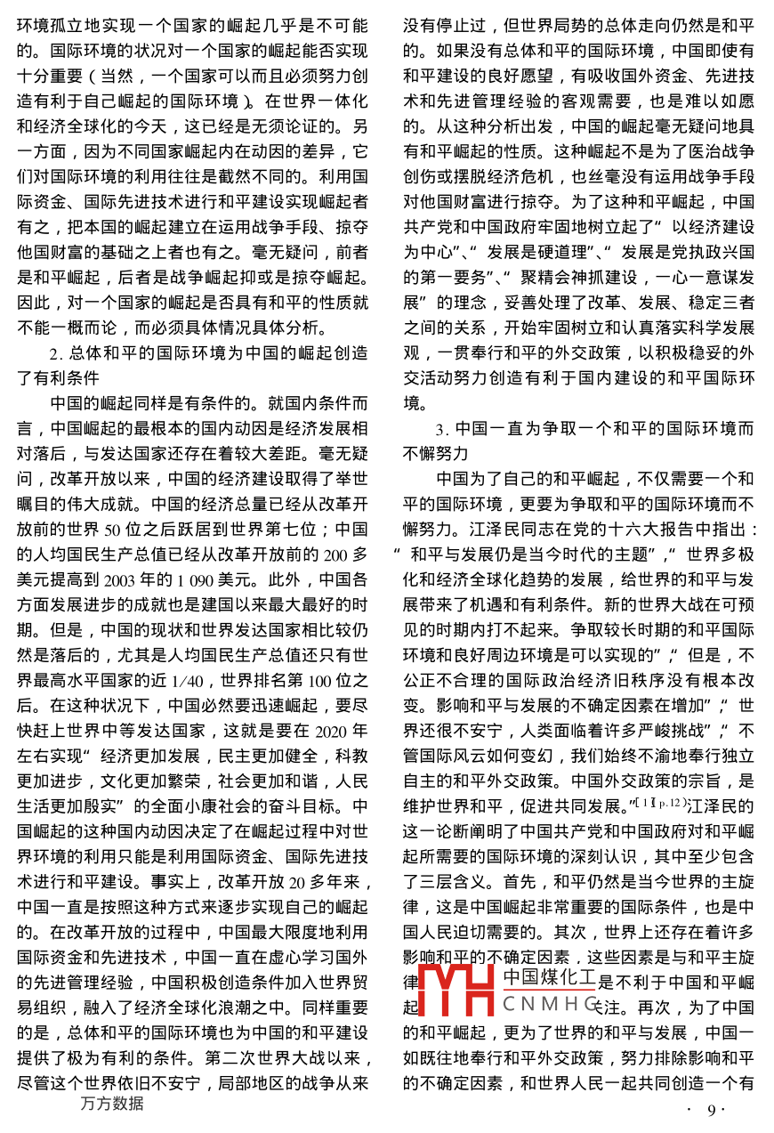 揚(yáng)州大學(xué)學(xué)報(bào)(人文社會(huì)科學(xué)版)Ju.2004第8卷第4期Journal of Yangzhou University( Humanities& Social SciencesVol 8 No 4論中國的和平崛起吳健揚(yáng)州大學(xué)校機(jī)關(guān),江蘇揚(yáng)州22500摘要∶中國在21世紀(jì)的崛起已經(jīng)成為國際社會(huì)廣泛關(guān)注的最大熱點(diǎn)之一。中國為什么能夠崛起?中國是因和平而崛起,總體和平的國際環(huán)境提供了中國崛起極其有利的外部條件,中國也一直為爭取一個(gè)和平建設(shè)的國際環(huán)境而不懈努力。中國是怎樣崛起的?中國是以和平而崛起,中國在和平崛起的過程中貫奉行維護(hù)世界和平、促進(jìn)共同發(fā)展的和平建設(shè)原則,體現(xiàn)了中國崛起有理有利的全新發(fā)展戰(zhàn)略。中國的崛起將給世界帶來什么?中國是為和平而崛起,和平發(fā)展譜寫了促進(jìn)世界發(fā)展事業(yè)的嶄新篇章,中國的和平崛起必然激活世界經(jīng)濟(jì)“一盤棋”,成為維護(hù)世界和平的一支重要而又堅(jiān)實(shí)的力量關(guān)鍵詞:中國;和平崛起;和平與發(fā)展中圖分類號(hào):A849文獻(xiàn)標(biāo)識(shí)碼:A文章編號(hào):1007-70302004)4-0008-05中國在21世紀(jì)的崛起已經(jīng)是不爭的事實(shí)從詞義上理解,崛起具有興起、振興、快速這已經(jīng)成為國際社會(huì)廣泛關(guān)注的最大熱點(diǎn)之一。發(fā)展、發(fā)展成就顯著等基本含義,它是相對(duì)于某中國為什么能夠崛起?中國是怎樣崛起的?中國國過去基礎(chǔ)相對(duì)薄弱、發(fā)展相對(duì)滯后的狀態(tài)而言的崛起將給世界帶來什么?各種觀點(diǎn)一時(shí)蜂擁而的。歷史已經(jīng)充分證明,任何一個(gè)國家的崛起都起,不少論斷卻大相徑庭??陀^的事實(shí)是,中國是有條件的,這種條件主要包括國內(nèi)條件和國際是和平崛起,中國的和平崛起將更加有利于世界條件兩個(gè)方面。就國內(nèi)條件來說,一個(gè)國家的崛的和平與發(fā)展事業(yè)起首先必須具有其內(nèi)在動(dòng)因。經(jīng)濟(jì)發(fā)展落后,與中國因和平而崛起,和平的國際環(huán)境提發(fā)達(dá)國家有著較大差距,可以成為崛起的內(nèi)在動(dòng)供了中國崛起極其有利的外部條件因;國內(nèi)戰(zhàn)爭或世界戰(zhàn)爭結(jié)束之后,盡快醫(yī)治戰(zhàn)爭創(chuàng)傷,加快經(jīng)濟(jì)復(fù)蘇進(jìn)程,可以成為崛起的內(nèi)20世紀(jì)90年代以來,中國進(jìn)入了一個(gè)快速在動(dòng)因;經(jīng)濟(jì)發(fā)展陷入危機(jī)狀態(tài),盡快走出低發(fā)展的時(shí)期,這與全球經(jīng)濟(jì)發(fā)展的相對(duì)低迷形成谷,也可以成為崛起的內(nèi)在動(dòng)因。一個(gè)國家崛起了強(qiáng)烈反差。正因?yàn)槿绱?中國的崛起成為備受的國內(nèi)條件其次還必須具有與其相適應(yīng)的政策環(huán)關(guān)注的國際熱點(diǎn)之一。當(dāng)我們對(duì)中國和平崛起進(jìn)境,這種政策環(huán)境是崛起的內(nèi)在動(dòng)因現(xiàn)實(shí)性的決行客觀考察時(shí),一個(gè)不容忽視的前提是,中國的定條件,它包括對(duì)內(nèi)政策和對(duì)外政策都要緊緊圍崛起是與國際環(huán)境的總體和平聯(lián)系在一起的。中繞崛起這一基本任務(wù),要通過這一政策體制調(diào)動(dòng)國是因和平而崛起,中國同樣也在為自己的崛起起各種因素服務(wù)于崛起的實(shí)現(xiàn)。國際條件同樣是努力創(chuàng)造一個(gè)和平的國際環(huán)境1.一個(gè)國家的崛起是有條件的TYH中國煤化工一個(gè)國家總是在一定CNMHG己的,離開了國際大收稿日期:2004-05-28作者簡介:吳健(1956-),男,江蘇揚(yáng)州人,揚(yáng)州大學(xué)黨委宣傳部部長,黨校常努副校長,副教授,主要從事晢學(xué),國際形勢,思想政治教育等研究。環(huán)境孤立地實(shí)現(xiàn)一個(gè)國家的崛起幾乎是不可能沒有停止過,但世界局勢的總體走向仍然是和平的。國際環(huán)境的狀況對(duì)一個(gè)國家的崛起能否實(shí)現(xiàn)的。如果沒有總體和平的國際環(huán)境,中國即使有十分重要(當(dāng)然,一個(gè)國家可以而且必須努力創(chuàng)和平建設(shè)的良好愿望,有吸收國外資金、先進(jìn)技造有利于自己崛起的國際環(huán)境)在世界一體化術(shù)和先進(jìn)管理經(jīng)驗(yàn)的客觀需要,也是難以如愿和經(jīng)濟(jì)全球化的今天,這已經(jīng)是無須論證的。另的。從這種分析出發(fā),中國的崛起毫無疑問地具方面,因?yàn)椴煌瑖裔绕饍?nèi)在動(dòng)因的差異,它有和平崛起的性質(zhì)。這種崛起不是為了醫(yī)治戰(zhàn)爭們對(duì)國際環(huán)境的利用往往是截然不同的。利用國創(chuàng)傷或擺脫經(jīng)濟(jì)危機(jī),也絲毫沒有運(yùn)用戰(zhàn)爭手段際資金、國際先進(jìn)技術(shù)進(jìn)行和平建設(shè)實(shí)現(xiàn)崛起者對(duì)他國財(cái)富進(jìn)行掠奪。為了這種和平崛起,中國有之,把本國的崛起建立在運(yùn)用戰(zhàn)爭手段、掠奪共產(chǎn)黨和中國政府牢固地樹立起了“以經(jīng)濟(jì)建設(shè)他國財(cái)富的基礎(chǔ)之上者也有之。毫無疑問,前者為中心”、“發(fā)展是硬道理”、“發(fā)展是黨執(zhí)政興國是和平崛起,后者是戰(zhàn)爭崛起抑或是掠奪崛起。的第一要?jiǎng)?wù)”、”聚精會(huì)神抓建設(shè),一心一意謀發(fā)因此,對(duì)一個(gè