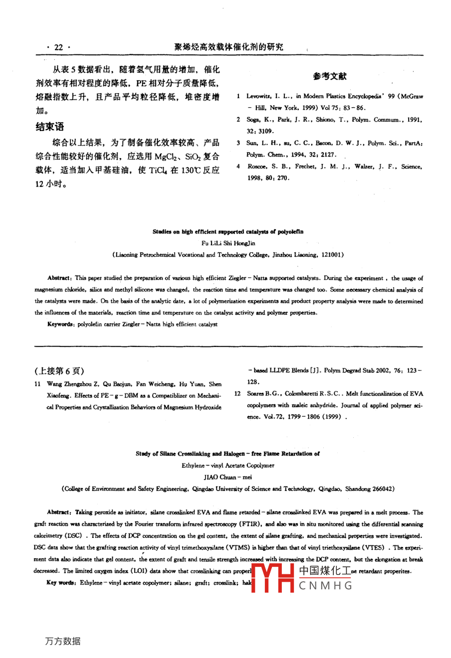 化學(xué)工程與裝備2007年第6期19●聚烯烴高效載體催化劑的研究付麗麗,石紅錦(遼寧石化職業(yè)技術(shù)學(xué)院,錦州121001)拘要:本文以MgCh、SiO, 為裁體,研制了多種配方的Ziegler- Natta欽耒高效載體催化劑。在實驗過程中改變MgC2、SiO2、 甲基硅油等加入量,改變反應(yīng)時間、反應(yīng)溫度,并對催化劑組成進(jìn)行了化學(xué)分析。在分析數(shù)據(jù)的基礎(chǔ)上進(jìn)行乙烯及丙蜂的聚合實驗,對產(chǎn)品進(jìn)行性能分析,確定原料加入量、反應(yīng)時間、反應(yīng)溫度等對催化劑效率、產(chǎn)品性能的影響。關(guān)鍵詞:聚蜂烴;載體; Ziegler- Natta高效催化劑聚烯烴是一種年消耗量達(dá)幾十億美元的工業(yè)產(chǎn)L)。品,全世界年產(chǎn)量多于1600億磅川。聚烯烴的性3.催化劑制備能與使用的催化劑性能有密切關(guān)系,自70年代聚儀器用N2排空,加入適量Mg (OEt)2 (或乙烯高效催化劑開發(fā)成功以來,棗烯烴催化劑的研SiO2).稀釋劑,攪拌。加熱到- -定溫度(80 ~究有了長足的進(jìn)步,形成了鉻系高效催化劑,130C),恒溫,以一定的速度滴加四氯化鈦,用己Ziegler- Natta系高效催化劑及茂金屬系高效催化烷洗滌(20~30C、5次)。加入適量稀釋劑,攪劑三大體系。而其中的Ziegler-Natta系高效催化拌,以一定的速度滴加三乙基鋁,反應(yīng)一段時間劑以其優(yōu)良的性能在高效催化劑領(lǐng)域中占有很重要后,導(dǎo)入已經(jīng)用N2排空的蒸餾瓶中,密封保存。的地位,其制備的方法也由早期的研磨法、懸浮浸4.催化劑漿液的化學(xué)分析漬法,發(fā)展到目前的化學(xué)反應(yīng)法,- -般采用SiO2、用2N H2SO4溶解固體催化劑顆粒,再對其各Al203、MgCh 等無機(jī)載體[2],并且也有少量使用組成元素(Ti、 Cl) 進(jìn)行分析測定。4.1 總Ti量的測定聚合物作為載體的研究[3.4]。把裝有50ml鐵明礬溶液的錐形瓶放在瓊斯柱實驗部分的基座上,確保柱的管端浸在溶液下面。用移液管1.試劑及原料吸取10ml水解液注入柱內(nèi),打開旋塞,使溶液以Mg (OEt)2、SiO2、 TiCL、甲基硅油、稀釋細(xì)線的形式流入錐形瓶。用50ml蒸餾水漂洗柱,劑Cz (精制后)、H2SO% (2N)、 HPO4、 NaOH、每次加10ml。從柱上取下錐形瓶,用量簡加入K2Cr2O, ( 0.01N)、K2Cr2O4 ( 5%)、AgNO310ml純磷酸和5滴氧化還原指示劑,溶液保持無(0.05 mol/L)、氧化還原指示劑、100g/L 鐵明礬色。 用K2Cr2O (0.01N)滴定,直到溶液變?yōu)樽先芤?每升加5ml 0.5NHCl酸化),三乙基鋁,高色或深綠色為止。純氮?dú)狻錃?聚合級乙烯、丙稀、已烷。總Ti (毫摩爾/升) = (VtXNx10S) / (Vc2.儀器中國煤化工加料管,蒸餾瓶,三口瓶,注射器,移液管,THCN MH G毫升數(shù);容量瓶,堿式滴定管,瓊斯柱,磁力攪拌器Vh:水解液樣品取桿鼂開數(shù);(79HW-1型),聚合反應(yīng)釜(00F2/10 型,2Vt:滴定消耗的K2Cr2O毫升數(shù);●20●聚烯烴高效載體催化劑的研究N:滴定用K2Cr2O的當(dāng)量濃度。Vh:水解液樣品取樣毫升數(shù);4.2 Cl 含量的測定Mcl: cl的原子量。采用莫爾法,準(zhǔn)確移取10ml水解液于250ml5.聚合反應(yīng)錐形瓶中,加入10ml 蒸餾水, 0.4ml 5% KzCrO,溫度: 80C, 壓力: 1.0MPa, 時間: 1h, AI/溶液,加入NaOH調(diào)PH值在6.5~10.5,用Ag-Ti=150,H2 壓力: 5Kg。NO3標(biāo)準(zhǔn)溶液滴定,至白色沉淀中呈現(xiàn)磚紅色即結(jié)果與討論為終點(diǎn)。1. TiCl4 反應(yīng)時間對催化劑和聚合產(chǎn)品性能的影響cl (mmol/L) =VtXNx10”S/Vcx Vh本實驗首先使用MgCl為載體,TiCl, 反應(yīng)溫N:滴定用AgNO3當(dāng)量濃度;度為130個,研究TiCL反應(yīng)時間對催化劑和聚合Vt:滴定消耗的AgNO3毫升數(shù);產(chǎn)品性能的影響。Ve:懸浮催化劑樣品取樣毫升數(shù);表1 TiC4 反應(yīng)時間對催化劑和聚合產(chǎn)品性能的影響催化劑號CAT-1CAT-2CAT-3CAT-4CAT-5反應(yīng)時間(h)101il213催化劑效率x 10~4 (gPE/gTi)2.2322. 35110.8214.4512.74PE平均粒徑(um)111.57153.61187.36203.40263.52堆密度(g/cm2)0.2490.2350.2210.2180.204熔融指敷(g/10min)13.7011.737.414.863.96催化劑效事x 10~4 (gPP/gTi)0.6290.7433.8563.2922.198從表1可以看出,隨著TiCL4 反應(yīng)時間的增子質(zhì)量的提高。加,乙烯、丙烯聚合時的催化劑效率都有所增加,2.甲基硅油用量對催化劑和聚合產(chǎn)品性能的影響乙烯的最佳反應(yīng)時間為12小時,丙烯的最佳反應(yīng)本實驗使用MgCl2為載體,TiCL4 反應(yīng)溫度為時間為11小時。對于PE來說,隨著TiCl反應(yīng)時130C,反應(yīng)時間為12小時,研究甲基硅油用量對間的增加,產(chǎn)品平均粒徑增加,堆密度降低,且熔催化劑和聚合產(chǎn)品性能的影響融指數(shù)降低,說明反應(yīng)時間增加有利于PE相對分表2甲基碓油用量 對催化劑和聚合產(chǎn)品性能的影響CAT-6CAT-7CAT-8甲基硅油/Mg (OC2H3)2 (摩爾比)2催化劑效率x 10- (gPE/gTi)15.3217.1613.42230.40253.61312.47495.40堆密度(g/cm') ”0.2090.2010. 198.中國煤化工熔融指數(shù)(g/10min)2.03CNMHG催化劑效率x 10-* (gPP/gTi)3.292 .4.1193.427化學(xué)工程與裝備2007年第6期21 ●從表2數(shù)據(jù)來看,適當(dāng)加入甲基硅油有利于提3. TiCl4 反應(yīng)溫度對催化劑和PE性能的影響高乙烯和丙烯聚合時的催化劑效率。PE 的平均粒本實驗使用MgCl2; 為載體,反應(yīng)時間為12小徑增加,堆密度降低,并且PE產(chǎn)品熔融指數(shù)降時,選用不同的反應(yīng)溫度,研究TiCl4反應(yīng)溫度對低,可以推斷出加入甲基硅油使產(chǎn)品的相對分子質(zhì)催化劑和PE性能的影響量提高。表3 TiC, 