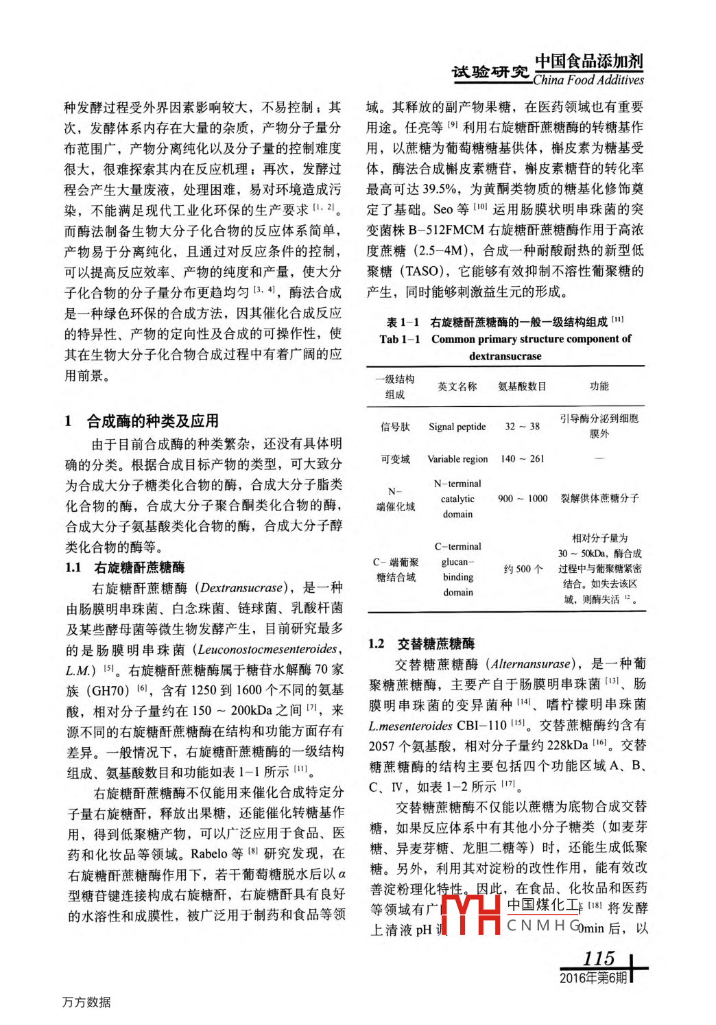 中國食品添加劑試驗研究China Food Additives-酶法合成中合成酶的應(yīng)用研究陳華磊1.2,侯殿志12,于玥1.2,相萍萍1.2,朱延光1.2,藍尉冰1.2.3,謝政1.2,姚曉麥12,陳山1.2.*(1.廣西大學(xué)糖業(yè)工程技術(shù)研究中心,南寧530004;2.糖業(yè)及綜合利用教育部工程研究中心,南寧530004; 3. 欽州學(xué)院,欽州535011)摘要:酶法合成因其高效無污染、專- 性強、雜質(zhì)含量低、可連續(xù)化生產(chǎn)及產(chǎn)品分子量易控制等優(yōu)點,逐漸成為現(xiàn)在制備生物大分子化合物研究的熱點。尤其是合成酶的應(yīng)用,為生物大分子化合物的酶法合成提供了一種更加有效便捷的方式。但是,目前酶法合成的相關(guān)研究尚處于探索階段,合成酶的研究報道也較少。探索獲得高活性、高穩(wěn)定性的合成酶,是酶工程技術(shù)制備生物大分子的關(guān)鍵。該文就合成酶的種類及應(yīng)用、作用機制、以及催化性能提升等方面的國內(nèi)外研究現(xiàn)狀進行了綜述,對其應(yīng)用前景及未來的研究方向進行了探討。關(guān)鍵詞:酶法合成;合成酶;作用機制;催化性能中圖分類號: Q559文獻標識碼: A文章編號: 1006- 2513 (2016) 06- 0114-11Research on synthase application in enzymatic synthesisCHEN Hua1ei.”, HOU Dian-zhi!, YU Yue'.2, XIANG Ping ping' 7, ZHU Yan-guang'2,LAN Wei-bing' 2.3, XIE Zheng': 2, YAO Xiao-mai1.2, CHEN Shan!: 2.●(1. Engineering Center for Sugarcane and Cane sugar, Guangxi University, Nanning 530004;2. Engineering Center for Sugar and Comprehensive Utilzation, Ministry of Education, Nanning 500004;3. Qinzhou University, Qinzhou 535011)Abstract: Enzymatic synthesis has become a hot research topic in the synthesis of high molecular weight compoundsdue to the advantages of eficiency of the synthesis, pollution- free, high specificity, low impurity content,continuous producing and easily control of molecular weight.This study provides a more eficient and convenient wayfor the synthesis of biological macromolecules by enzymatic synthesis. The research of enzymatic synthesis is still inthe exploratory stage and the reportsare few. To explore high activity and high stability of the synapses is the key in theenzyme engineeringof preparation of biological macromolecules. In this paper, the types and aplicaion of enzymes,the mechanism of action, and the improvement of the catalytic performance, as well as other aspects of domestic andforeign research status are reviewed, and its application prospects and future research directions are discussed.Key words: enzymatic synthesis; synthase; mechanism; catalytic properties傳統(tǒng)生物法合成大分子化合物一-般 利用菌體應(yīng)體系比較復(fù)雜,存在諸多問題。首先,發(fā)酵工發(fā)酵法,但是菌體發(fā)酵法制備大分子化合物的反程菌種的篩選比較困難,菌種篩選周期較長,菌收稿日期: 2016-03-11*通訊作者中國煤化工基金項目:國家自然科學(xué)基金項目(21264003) ; 2013 年廣西自然科學(xué)基金項目(2013作者簡介:陳華磊(1989 -), 男,碩士,研究方向:糖廠副產(chǎn)物綜合利用與糖類藥物開MYHCNMH GL 114“2016年第6期中國食品添加劑:試驗研究China Food Additives-活性。右旋糖酐蔗糖酶與蔗糖共價鍵聯(lián)結(jié)在一其中,以蔗糖為底物,在無其他受體情況起,并將蔗糖分解放出果糖,形成D- -glucosy1-下, 首先催化蔗糖分解生成與酶連接的D-葡萄Enzyme [45。在酶催化的情況下,反應(yīng)可向四個糖基和果糖,然后將D-葡萄糖基轉(zhuǎn)移到右旋方向進行1461: (1)聚合產(chǎn)生右旋糖酐; (2)在糖酐殘基的C3/C6位置或水分子上,合成右旋H2O的參與下,分解生成葡萄糖; (3)在外界受糖酐糖鏈或水解蔗糖,催化合成機制如圖2-1體的參與下生成低聚糖; (4) 逆向反應(yīng)。所示(471。o的rx③②①rx ⑤Lxexo①x°D③-②-0的圖2-1右旋糖酐蔗糖酶催化合 成右旋糖酐的機制[47]1Fig.2 1 Mechanism for dextran biosynthesis by dextransucrase.(X,和Xz代表酶活性位點的親和團: O代表葡萄糖; <代表果糖; 0- -<代表蔗糖;0-0表示兩個由a- 1. 6糖苷鍵鏈接的葡萄糖基團.)右旋糖酐酶蔗糖酶除能合成右旋糖酐外,當(dāng)被移至-條右旋糖酐鏈中得到以右旋糖酐鏈作為有可識別外源受體(如麥芽糖)存在時,右旋糖分支部分的右旋糖酐(511 ; (3) D-葡萄糖基部分酐蔗糖酶可以將D-葡萄糖基轉(zhuǎn)移到外源受體上被轉(zhuǎn)移至水中,蔗糖水解1521; (4) 右旋糖酐鏈合成各種糖基化產(chǎn)物,如功能性低聚糖等(48。受移至水中,或者與受體(D-葡萄糖、D-果糖、體反應(yīng)主要有以下四個方面: (1) D-葡萄糖基蔗糖、麥芽糖)結(jié)合,從活性位點處釋放右旋糖部分被移至受體單糖或低聚糖中149. s0|; (2) D-酐,聚合反應(yīng)終止(50, 52。葡萄糖基部分被移至右旋糖酐鏈中形成葡萄糖基2.2交替糖蔗糖酶的作用機制支鏈,或是D-葡萄糖基部分和右旋糖酐鏈一起2n times●f圖2- -2交 替糖蔗糖酶合成交替糖的作用機制(5]1Fig.2- 2 Reaction mechanism of alternan synthesis catalyzed hvalternaneurrace.中國煤化工(●-d;蔗糖,●:葡萄糖,<:果糖TYHCNMH G118I 2016年第6期.試驗研究中國食品添加劑.China FoodAdditives交替糖蔗糖酶的作用機制與右旋糖酐蔗糖酶淀粉蔗糖酶的催化反應(yīng)過程是將供體質(zhì)子注的作用機制較為相似153。交替蔗糖酶先斷開蔗糖人到糖苷鍵中,對部分葡萄糖的異頭碳進行親核的糖苷鍵,將葡萄糖殘基轉(zhuǎn)移給受體分子,生成攻擊形,成共價連接的底物-酶中間產(chǎn)物,中間產(chǎn)低聚糖或多糖,釋放果糖(54。酶活中心可以與葡.物可以和水分子發(fā)