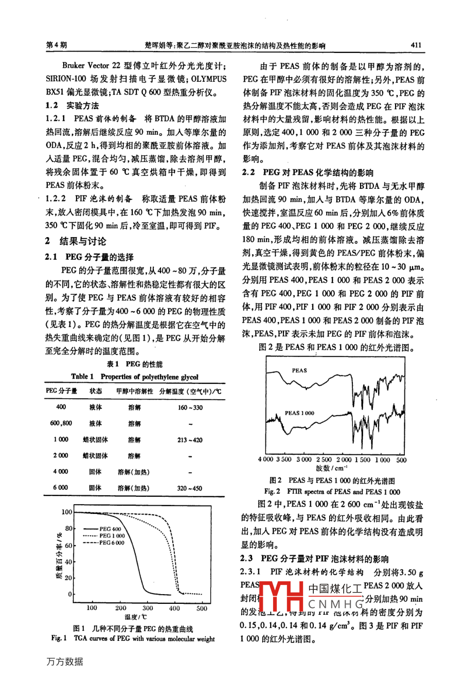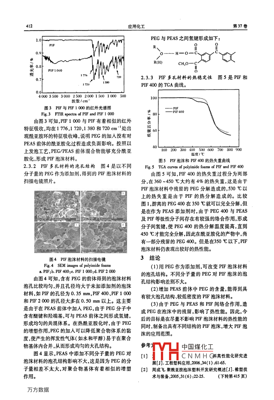 第37卷第4期應(yīng)用化工VoL.37 No.42008 年4月Applied Chemical InduetryApr. 2008聚乙二醇對(duì)聚酰亞胺泡沫的結(jié)構(gòu)及熱性能的影響楚暉娟',朱寶庫”,徐又-2(1.河南工業(yè)大學(xué)化學(xué)化工學(xué)院,河南鄭州4000; 2.浙江大學(xué)高分子科學(xué)研究所,浙江杭州310027)摘要:采用聚(酯-銨)鹽(PEAS) 前體粉末發(fā)泡法制備聚酰亞胺泡沫,分別考察了分子量為400,1 000和2 000的聚乙二醇(PEG)對(duì)PEAS前體及聚酰亞胺泡沫的影響。結(jié)果表明,PEG的加入使聚酰亞胺泡沫的平均孔徑由0. 35 mm增加到0. 50 mm以上,不同分子量的PEC沒有導(dǎo)致聚酰亞胺泡沫的平均孔徑產(chǎn)生顯著的差別。紅外光譜表明,PEG的加入對(duì)聚酰亞胺泡沫及其前體的化學(xué)結(jié)構(gòu)沒有明顯改變。由PEG/PEAS前體制備的聚酰亞胺泡沫在350 C仍保持較好的熱穩(wěn)定性。關(guān)鍵詞:聚酰亞胺;泡沫;聚乙二酢;結(jié)構(gòu);熱性能中圖分類號(hào):TQ 328.9文獻(xiàn)標(biāo)識(shí)碼:A文章編號(hào):1671 -3206(2008)04 -0410-03Study on influence of polyethylene glycol on the structureand thermal property of polyimide foamsCHU Hui-juan' ,ZHU Bao -ku2 ,XU You-yi2(1. School of Chemisty and Chemical Enginering, Henan University of Technology ,Zhengzhou 450001 ,China;2. Intite of Polymer Science ,Zhejiang Universily , Hangzhou 310027 ,China)Abstract: Polyimide foams were prepared by foaming polyester-amine salt precursor powders. The infu-ences of polyethylene glycol with the molecule of 400,1 000 and 2 000 ,on the polyester-amine ( PEAS)and polyimide foams were studied respectively , those obtained polyimide foams with the addition of PEChad an increased average cell size of more than 0. 50 mm compared to the forner' s 0. 35 mm. However,PEG with various molecule weight did not lead to obvious diferences on the average cell sizes of polyim-ide foams. FT-IR spectra showed that with the addition of PEG , there were no obvious changes in thechemical structures of polyimide and its precursor. The polyimide foams prepared from PEG/PEAS pre-cursors kept good thermal stability up to 350 C.Key words:polyimide ; foam; polyethylene glycol ; structure ; thermal property聚酰亞胺泡沫長(zhǎng)期可耐250 ~300 C的高溫,是可以考慮采用在PEAS前體中加人添加劑的辦法來聚合物泡沫材料中熱穩(wěn)定性最好的品種之一-。它還制備具有不同結(jié)構(gòu)的PIF 泡沫。另外,由于聚乙二具有化學(xué)性能穩(wěn)定、力學(xué)性能優(yōu)良等特性,是一類新醇( PEG)的熱分解產(chǎn)生氣體,增加氣體揮發(fā)量有可型的高性能泡沫塑料,在航空航天、化工、建筑等領(lǐng)能會(huì)進(jìn)- -步降低PIF泡沫的密度。城具有廣闊的應(yīng)用前景13)。與聚酰胺酸前體相比,本文以3,3' ,4,4'-二苯甲酮四酸二酐( BTDA)采用聚(酯銨)鹽( PEAS)前體發(fā)泡法制備聚酰亞胺和4,4'-二氨基二苯醚(0DA)為原料單體,采用泡沫,可以產(chǎn)生較大的氣體揮發(fā)量,從而得到密度相PEAS前體粉末發(fā)泡法制備PIF泡沫,選用PEG作對(duì)較低(密度小于0. 3 g/cm')的聚酰亞胺(PIF)泡為前體添加劑,分別考察了PEG的分子量和含量對(duì)沫。然而,為了滿足不同用途,需要制備具有不同結(jié)PIF泡沫的結(jié)構(gòu)和熱性能的影響。構(gòu)的PIF 泡沫。在聚合物泡沫的發(fā)泡成型過程中,1實(shí)驗(yàn)部分聚合物熔體的黏度對(duì)泡孔結(jié)構(gòu)有很大影響(*。為1.1 試劑與儀器.了調(diào)整發(fā)泡液黏度,通??稍诰酆衔飿渲屑尤胩碇袊?guó)煤化工PEG均為分析加劑,起到改善泡沫塑料的性能等作用[561。因此,純;4,:TYHCNMHG二學(xué)純。收稿日期2008-01-21作者簡(jiǎn)介:楚暉娟(1970- ) ,女,河南鄭州人,河南工業(yè)大學(xué)講師,主要從事有機(jī)高分子材料的研究。電話: 13523062935 ,E - mail:chuhj@ haut. edu. cn第4期楚暉娟等:聚乙二醇對(duì)聚酰亞胺泡沫的結(jié)構(gòu)及熱性能的影響411BrukerVector22型傅立葉紅外分光光度計(jì);由于PEAS前體的制備是以甲醇為溶劑的,SIRION-100場(chǎng)發(fā)射掃描電子顯微鏡;0LYMPUSPEG在甲醇中必須有很好的溶解性;另外, PEAS前BX51偏光顯微鏡;TA SDT Q 600型熱重分析儀。體制備PIF泡沫材料的固化溫度為350 C ,PEG的1.2 實(shí)驗(yàn)方法熱分解溫度不能太高,否則會(huì)造成PEG在PIF泡沫1.2.1 PEAS 前體的制備將BTDA的甲醇溶液加材料中的大量殘留,影響材料的熱性能。根據(jù)以上熱回流,溶解后繼續(xù)反應(yīng)90 min。加入等摩爾量的原則,選定400,1 000和2 000三種分子量的PEGODA,反應(yīng)2 h,得到均相的聚酰亞胺前體溶液。加作為添加劑,考察它對(duì)PEAS前體及其泡沫材料的人適量PEG,混合均勻,減壓蒸餾,除去溶劑甲醇,影響。將殘余固體置于60 C真空烘箱中干燥,即得到2.2 PEG 對(duì)PEAS化學(xué)結(jié)構(gòu)的影響PEAS前體粉末。制備PIF泡沫材料時(shí),先將BTDA與無水甲醇1.2.2 PIF 泡沫的制備稱取適 量PEAS前體粉加熱回流90min,加人與BTDA等摩爾量的ODA,末,放人密閉模具中,在160 C下加熱發(fā)泡90 min,快速攪拌,室溫反應(yīng)60 min后,分別加入6%前體質(zhì)350 C下固化90 min后,冷至室溫,即可得到PIF。量的PEC 400、PEG 1 000和PEG 2000,繼續(xù)反應(yīng)2結(jié)果與討論180 min,形成均相的前體溶液。減壓蒸餾除去溶2.1 PEG 分子量的選擇劑,真空千燥,得到黃色的PEAS/PEG前體粉末,偏PEC的分子量范圍很寬,從400 ~80萬,分子量光顯微鏡測(cè)試表明,前體粉末的粒徑在10 ~ 30 μm。的不同,它的狀態(tài)、溶解性和熱穩(wěn)定性都有很大的區(qū)分