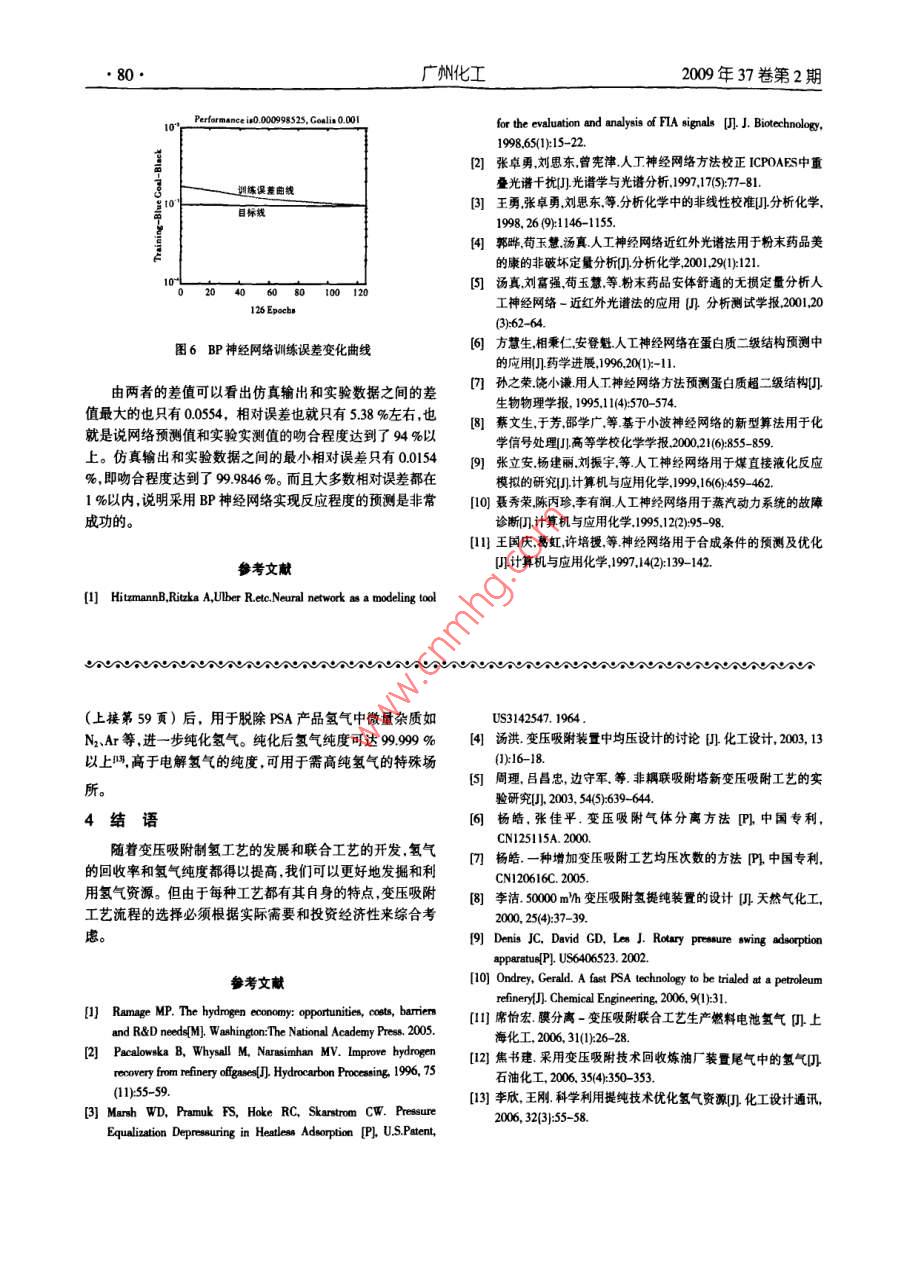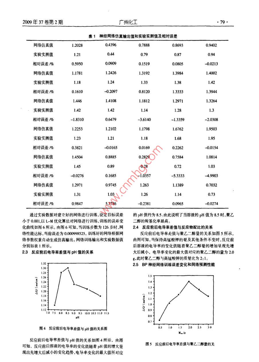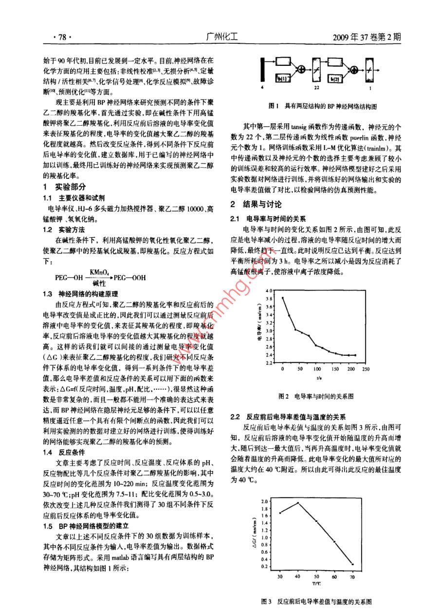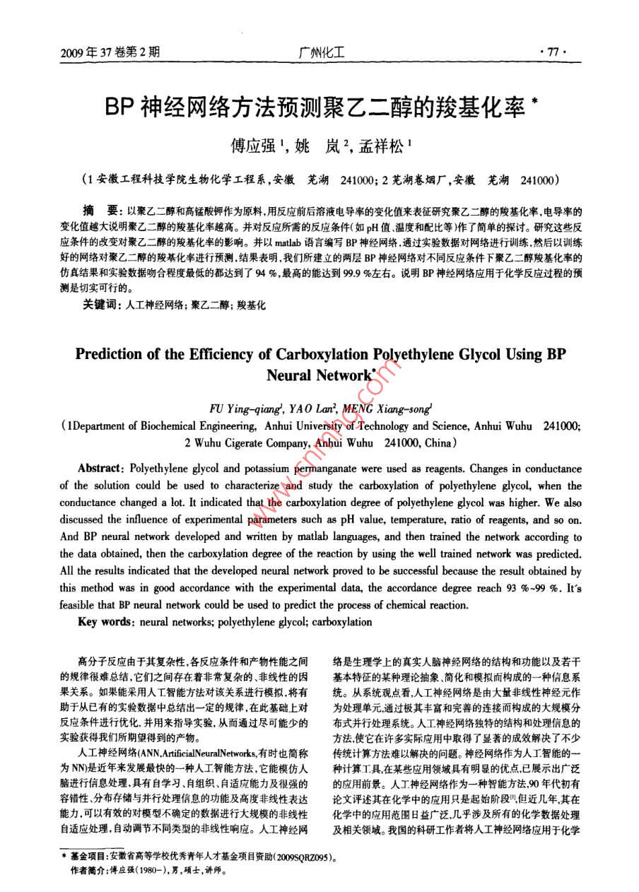 2009年37卷第2期廣州化工77BP神經(jīng)網(wǎng)絡(luò)方法預(yù)測(cè)聚乙二醇的羧基化率傅應(yīng)強(qiáng)1,姚嵐2,孟祥松(1安徽工程科技學(xué)院生物化學(xué)工程系,安徽蕪湖2410002蕪湖卷煙廠,安徽蕪湖241000)摘要:以聚乙二醇和高錳酸鉀作為原料用反應(yīng)前后溶液電導(dǎo)率的變化值來(lái)表征研究聚乙二醇的羧基化率,電導(dǎo)率的變化值越大說(shuō)明聚乙二醇的羧基化率越高。并對(duì)反應(yīng)所需的反應(yīng)條件(如p值、溫度和配比等)作了簡(jiǎn)單的探討。研究這些反應(yīng)條件的改變對(duì)聚乙二醇的羧基化率的影響。并以 matlab語(yǔ)言編寫B(tài)P神經(jīng)網(wǎng)絡(luò)通過(guò)實(shí)驗(yàn)數(shù)據(jù)對(duì)網(wǎng)絡(luò)進(jìn)行訓(xùn)練然后以訓(xùn)練好的網(wǎng)絡(luò)對(duì)聚乙二醇的羧基化率進(jìn)行預(yù)測(cè)結(jié)果表明,我們所建立的兩層BP神經(jīng)網(wǎng)絡(luò)對(duì)不同反應(yīng)條件下聚乙二醇羧基化率的仿真結(jié)果和實(shí)驗(yàn)數(shù)據(jù)吻合程度最低的都達(dá)到了4%最高的能達(dá)到999%左右。說(shuō)明BP神經(jīng)網(wǎng)絡(luò)應(yīng)用于化學(xué)反應(yīng)過(guò)程的預(yù)測(cè)是切實(shí)可行的。關(guān)鍵詞:人工神經(jīng)網(wǎng)絡(luò);聚乙二醇;羧基化Prediction of the Efficiency of Carboxylation Polyethylene Glycol Using BPural NetworkFU Ying-qiang, YAO Lan, MENG Xiang-song(1Department of Biochemical Engineering, Anhui University of Technology and Science, Anhui Wuhu 241000;2 Wuhu Cigerate Company, Anhui Wuhu 241000, China)Abstract: Polyethylene glycol and potassium permanganate were used as reagents. Changes in conductanceof the solution could be used to characterize and study the carboxylation of polyethylene glycol, when theconductance changed a lot. It indicated that the carboxylation degree of polyethylene glycol was higher. We alsodiscussed the influence of experimental parameters such as PH value, temperature, ratio of reagents, and so onAnd BP neural network developed and written by matlab languages, and then trained the network according tothe data obtained, then the carboxylation degree of the reaction by using the well trained network was predictedAll the results indicated that the developed neural network proved to be successful because the result obtained bythis method was in good accordance with the experimental data, the accordance degree reach 93 %-99 %.It'sfeasible that BP neural network could be used to predict the process of chemical reaction.Key words: neural networks; polyethylene glycol; carboxylation高分子反應(yīng)由于其復(fù)雜性各反應(yīng)條件和產(chǎn)物性能之間絡(luò)是生理學(xué)上的真實(shí)人腦神經(jīng)網(wǎng)絡(luò)的結(jié)構(gòu)和功能以及若干的規(guī)律很難總結(jié),它們之間存在著非常復(fù)雜的、非線性的因基本特征的某種理論抽象、簡(jiǎn)化和模擬而構(gòu)成的一種信息系果關(guān)系。如果能采用人工智能方法對(duì)該關(guān)系進(jìn)行模擬,將有統(tǒng)。從系統(tǒng)觀點(diǎn)看人工神經(jīng)網(wǎng)絡(luò)是由大量非線性神經(jīng)元作助于從已有的實(shí)驗(yàn)數(shù)據(jù)中總結(jié)出一定的規(guī)律在此基礎(chǔ)上對(duì)處理單元通過(guò)極其豐富和完善的連接而構(gòu)成的大規(guī)模分反應(yīng)條件進(jìn)行優(yōu)化并用來(lái)指導(dǎo)實(shí)驗(yàn)從而通過(guò)盡可能少的布式并行處理系統(tǒng)。人工神經(jīng)網(wǎng)絡(luò)獨(dú)特的結(jié)構(gòu)和處理信息的實(shí)驗(yàn)獲得我們所期望得到的產(chǎn)物。方法使它在許多實(shí)際應(yīng)用中取得了顯著的成效解決了不少人工神經(jīng)網(wǎng)絡(luò)( ANN, ArtificialNeuralNetworks有時(shí)也簡(jiǎn)稱傳統(tǒng)計(jì)算方法難以解決的問(wèn)題。神經(jīng)網(wǎng)絡(luò)作為人工智能的一為NN是近年來(lái)發(fā)展最快的一種人工智能方法它能模仿人種計(jì)算工具在某些應(yīng)用領(lǐng)域具有明顯的優(yōu)點(diǎn)已展示出廣泛進(jìn)行信息處理具有自學(xué)習(xí)自組織、自適應(yīng)能力及很強(qiáng)的的應(yīng)用前景。人工神經(jīng)網(wǎng)絡(luò)作為一種智能方法0年代初有容錯(cuò)性、分布存儲(chǔ)與并行處理信息的功能及高度非線性表達(dá)論文評(píng)述其在化學(xué)中的應(yīng)用只是起始階段但近幾年其在能力可以有效的對(duì)模型不確定的數(shù)據(jù)進(jìn)行大規(guī)模的非線性化學(xué)中的應(yīng)用范圍日益廣泛幾乎涉及所有的化學(xué)數(shù)據(jù)處理自適應(yīng)處理自動(dòng)調(diào)節(jié)不同類型的非線性響應(yīng)。人工神經(jīng)網(wǎng)及相關(guān)領(lǐng)域。我國(guó)的科研工作者將人工神經(jīng)網(wǎng)絡(luò)應(yīng)用于化學(xué)基金項(xiàng)目:安徽省高等學(xué)校優(yōu)秀青年人才基金項(xiàng)目資助(20090095)。作者簡(jiǎn)介:博應(yīng)強(qiáng)(1980-),男,碩士,講師廣州化工2009年37卷第2期始于90年代初目前已發(fā)展到一定水平。目前神經(jīng)網(wǎng)絡(luò)在在化學(xué)方面的應(yīng)用主要包括:非線性校準(zhǔn),無(wú)損分析M”、定量結(jié)構(gòu)/活性相關(guān)、化學(xué)信號(hào)處理、化學(xué)反應(yīng)模擬門、故障診畫u斷、預(yù)測(cè)優(yōu)化等方面現(xiàn)主要是利用BP神經(jīng)網(wǎng)絡(luò)來(lái)研究預(yù)測(cè)不同的條件下聚圖1具有兩層結(jié)構(gòu)的