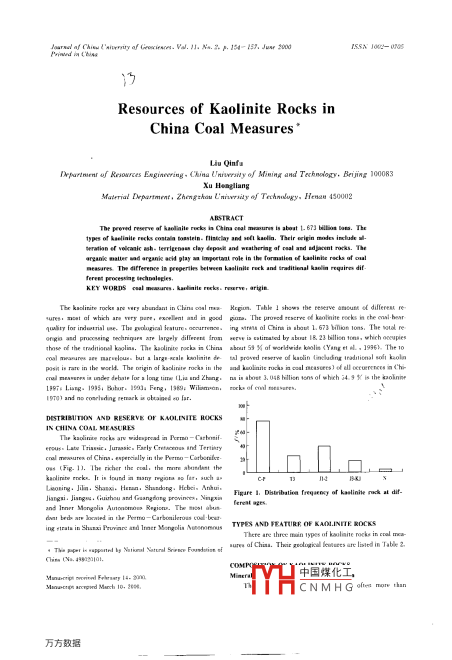 Journal of Chinu I'niversity of Geosciences. Vol. 11. No. 2, P. 154-157. June 2000ISSA J002-0705China Coal measures*“Resources of Kaolinite rocks ilDepartment of Resources Engineering, China University of Mining and Technology, Beijing 100083Xu HongliangMaterial Department, Zhengzhou Universily of Technology, Henan 450002ABSTRACTThe proved reserve of kaolinite rocks in China coal measures is about 1.673 billion tons. Theypes of kaolinite rocks contain tonstein, flintclay and soft kaolin. Their origin modes include alteration of volcanic ash, terrigenous clay deposit and weathering of coal and adjacent rocks. Theorganic matter and organic acid play an important role in the formation of kaolinite rocks of coaasures.the difference in properties between kaolinite rock and traditional kaolin requires difKEYIt processingoal measures, kaolinite rocks, reserve originThe kaolinite rocks are very abundant in China coal mea- Region. Table I shows the reserve amount of differentuality for industrial use. The geological feature, occurrence, ing strata of China is about 1. 673 billion tons. The total re-origin and processing techniques are largely different from serve is estimated by about 18 23 billion tons, which occupieshose of the traditional kaolins. The kaolinite rocks in China about 59 of worldwide kaolin(Yang et al., 1996). The tocoal measures are marvelous. but a large scale kaolinite de. tal proved reserve of kaolin (including traditional soft kaolinsit is rare in the world. The origin of kaolinite rocks in the and kaolinite rocks in coal mcasures )of all occurrences in Chicoal measures is under debate for a long time (Liu and Zhang, na is about 3. 048 billion tons of which 34.9 is the kaolinite1997: Liang. 1995: Bohor, 1993: Feng, 1989: Wiliamson, rocks of coal measures.1970)and no concluding remark is obtained so far.DISTRIBUTION AND RESERVE OF KAOLINITE ROCKS80IN CHINA COAL MEASURESerous. Late Triassic. Jurassic. Early Cretaceous and Tertiary 4al measures of China, espercially in the Permo- Carbonifer20s(Fig. 1). The richer the coal, the more abundant theIsLiaoning. Jilin. Shanxi, Henan. Shandong. Hcbei. AnhuiFigure l. Distribution frequency of kaolinite rock at dif-and Inner Mongolia Autonomous Regions, The most abun-ferent agesdant beds are located in the Permo-Carboniferous coal-bear-ing strata in Shanxi Province and Inner Mongolia Autonomous TYPES AND FEATURE OF KAOLINITE ROCKSr This paper is supported by National Natural Science Foundation of sures of China. Their geological features are listed inTable 2.Manuseript received Fehruary 14. 2000.Mineral中國煤化工Manuscript accepted March 10, 2000.CNMHG often more thanResource of Kaolinite Rocks in China Coal Measures155and up to 90 %-95 n in many good quality kaolinite SiO: and Al2O), which have the great influence on its usefulrocks of coal mcasures. The accessory minerals include 1/S ness. The molar ratios of SiO2/Al2 O, in kaolinite rocks aremixed-layer mineral. NH.-lllite. boemite, diaspore, chlorite, very close to the ideal value of kaolinite composition (the idealquarIz, feldspar. zircon, tourmaline. rutile. The Hinkley In ratios of Si(/AL2 O, for kaolinite are 2)(Table 3). The condex (HI) of kaolinite varies in different kinds and origins of tent of harmful impure clements, such as Fe Oa and TiO, arekaolinite, with the highest for the soft kaolin clay which is be- very low in the rocks, indicating that the kaolinite rocks intween 1. 33 and 1. 65 and the lowest for the terrigenous kaoli coal measures have very pure quality and great industrial usee which is between 0.45 and 1. 13. The Hinkley Index oftallinc and cryptocrystalline kaolinite in tonstein is be- DIFFERENCE OF KAOLINITE ROCKS IN COAL MEA-78 and 1.12SURES FROM TRADITIONAL KAOLINThe kaolinite rocks and traditional kaolin are very differTABLE I RESERVE AMOUNT OF KAOLINITEent in some propcrties(Table 4), which causes the differentROCKS IN SOME REGIONS10 processing techniques in industrial usc.perspectIve prognostIcregionrEsErveORIGIN OF KAOLINITE ROCKS IN COAL MEASURESInner Mongolia 82 389.6132663Origin ModeLiaoningf693.68528.134422Based on the mineralogical, petrologic and geochemical231,69.8evidence and the occurrence of the various types of kaoliniteHel3245rocks, three origin models are suggested as follows.31036.19701064.14Origin of bed-B kaolinite rock (flint clay )in Huainan co1146.2l5000qinghanl1132,9713022.941577.8This bed of kaolinite rock of 2-6 m in thickness,widespread and stable, is located in the lower part of139.8Henan20380Xiashihezi Formation of Upper Permian which was depositedShandongin a lower delta plain environment(Liu and Zhang. 1997; LiuAnhui051.8et al., 1994). Bed-B kaolinite rock can be divided into four15728425types: cryptocrystalline, silty. ferriferous, pelletoid and26oolitic. Among them, the oolites and pellets, which are com-Guizhi1.536plex aggregates of microcrystalline kaolinite and organic maSuchuanters, are very distinctive in microstructure, whose kaolinite20001220content is as high as 95 %-10D % Studies of sedimentoloHainan2000gy, geochemistry and paleontology show that the kaolinit167263.195528891 391.9 was mainly derived from the weathered materals in sourcerocks which were transported and deposited in a lacustrine enveral texture compositions were identified in the kali- vironment of the delta plain ( Liu and Zhang, 1997).Thenite rocks using polarized light microscope: intraclast, piso- widespread red kaolinite-bearing mudrocks above or belowlite,oolite, pellet, vermicular crystals, pseudomorphic crys- this kaolinite rock bed indicate that rubefication was developedpisolite and oolite are mostly found in"flint clay type",arranged in radiation around the grains were crystallized a atal after feldspar and biotite, matrix and organic matter. The in parent rocks in the source area. Some crystals of kaolinwhereas coarse vermicular and pseudomorph crystals are in alumino silicon gel. The organo-clay complcxcs and thenstein type.organo