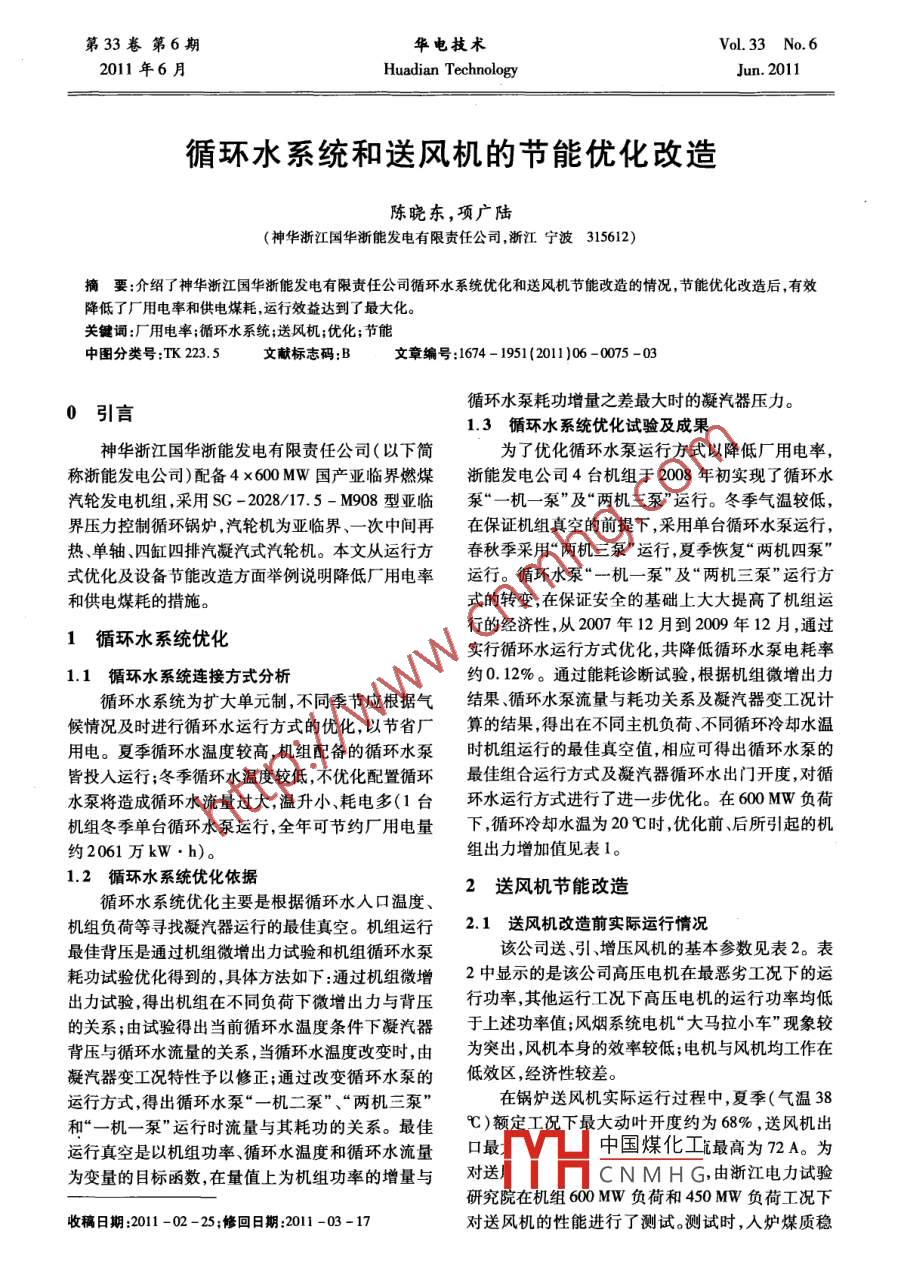 .第33卷第6期華電技術(shù)VoL.33 No. 62011年6月Huadian TechnologyJun. 2011循環(huán)水系統(tǒng)和送風(fēng)機(jī)的節(jié)能優(yōu)化改造陳曉東,項(xiàng)廣陸(神華浙江國(guó)華浙能發(fā)電有限責(zé)任公司,浙江寧波315612)摘要:介紹了 神華浙江國(guó)華浙能發(fā)電有限責(zé)任公司循環(huán)水系統(tǒng)優(yōu)化和送風(fēng)機(jī)節(jié)能改造的情況,節(jié)能優(yōu)化改造后,有效降低了廠用電率和供電煤耗,運(yùn)行效益達(dá)到了最大化。關(guān)鍵詞:廠用電率;循環(huán)水系統(tǒng);送風(fēng)機(jī);優(yōu)化;節(jié)能中圖分類號(hào):TK 223.5文獻(xiàn)標(biāo)志碼:B文章編號(hào):1674 - 1951 (2011 )06 -0075 -03循環(huán)水泵耗功增量之差最大時(shí)的凝汽器壓力。0引言.3 循環(huán)水系統(tǒng)優(yōu)化試驗(yàn)及成果神華浙江國(guó)華浙能發(fā)電有限責(zé)任公司(以下簡(jiǎn)為了優(yōu)化循環(huán)水泵運(yùn)行方式以降低廠用電率,稱浙能發(fā)電公司)配備4 x600 MW國(guó)產(chǎn)亞臨界燃煤浙能發(fā)電公司4臺(tái)機(jī)組于2008年初實(shí)現(xiàn)了循環(huán)水汽輪發(fā)電機(jī)組,采用SG - 2028/17. 5 - M908型亞臨泵“一機(jī)- -泵”及“兩機(jī)三泵”運(yùn)行。冬季氣溫較低,界壓力控制循環(huán)鍋爐,汽輪機(jī)為亞臨界、- - 次中間再在保證機(jī)組真空的前提下,采用單臺(tái)循環(huán)水泵運(yùn)行,熱、單軸、四缸四排汽凝汽式汽輪機(jī)。本文從運(yùn)行方春秋季采用“兩機(jī)三泵"運(yùn)行,夏季恢復(fù)“兩機(jī)四泵"式優(yōu)化及設(shè)備節(jié)能改造方面舉例說(shuō)明降低廠用電率運(yùn)行。循環(huán)水泵“一機(jī)-泵"及“兩機(jī)三泵”運(yùn)行方和供電煤耗的措施。式的轉(zhuǎn)變,在保證安全的基礎(chǔ).上大大提高了機(jī)組運(yùn)行的經(jīng)濟(jì)性,從2007年12月到2009年12月,通過(guò)1循環(huán)水系統(tǒng)優(yōu)化實(shí)行循環(huán)水運(yùn)行方式優(yōu)化,共降低循環(huán)水泵電耗率1.1 循環(huán)水系統(tǒng)連接方式分析約0.12%。通過(guò)能耗診斷試驗(yàn),根據(jù)機(jī)組微增出力循環(huán)水系統(tǒng)為擴(kuò)大單元制,不同季節(jié)應(yīng)根據(jù)氣結(jié)果、循環(huán)水泵流量與耗功關(guān)系及凝汽器變工況計(jì)候情況及時(shí)進(jìn)行循環(huán)水運(yùn)行方式的優(yōu)化,以節(jié)省廠算的結(jié)果,得出在不同主機(jī)負(fù)荷、不同循環(huán)冷卻水溫用電。夏季循環(huán)水溫度較高,機(jī)組配備的循環(huán)水泵時(shí)機(jī)組運(yùn)行的最佳真空值,相應(yīng)可得出循環(huán)水泵的皆投入運(yùn)行;冬季循環(huán)水溫度較低,不優(yōu)化配置循環(huán)最佳組合運(yùn)行方式及凝汽器循環(huán)水出門開(kāi)度,對(duì)循水泵將造成循環(huán)水流量過(guò)大,溫升小.耗電多(1臺(tái)環(huán)水運(yùn)行方式進(jìn)行了進(jìn)一步優(yōu)化。在600 MW負(fù)荷機(jī)組冬季單臺(tái)循環(huán)水泵運(yùn)行,全年可節(jié)約廠用電量下,循環(huán)冷卻水溫為20 C時(shí),優(yōu)化前、后所引起的機(jī)約2061萬(wàn)kW●h)。組出力增加值見(jiàn)表1。1.2 循環(huán)水系統(tǒng)優(yōu)化依據(jù)2送風(fēng)機(jī)節(jié)能改造循環(huán)水系統(tǒng)優(yōu)化主要是根據(jù)循環(huán)水人口溫度、機(jī)組負(fù)荷等尋找凝汽器運(yùn)行的最佳真空。機(jī)組運(yùn)行2.1送風(fēng)機(jī)改造前實(shí)際運(yùn)行情況最佳背壓是通過(guò)機(jī)組微增出力試驗(yàn)和機(jī)組循環(huán)水泵該公司送、引、增壓風(fēng)機(jī)的基本參數(shù)見(jiàn)表2。表耗功試驗(yàn)優(yōu)化得到的,具體方法如下:通過(guò)機(jī)組微增2中顯示的是該公司高壓電機(jī)在最惡劣工況下的運(yùn)出力試驗(yàn),得出機(jī)組在不同負(fù)荷下微增出力與背壓行功率,其他運(yùn)行工況下高壓電機(jī)的運(yùn)行功率均低的關(guān)系;由試驗(yàn)得出當(dāng)前循環(huán)水溫度條件下凝汽器于上述功率值;風(fēng)煙系統(tǒng)電機(jī)“大馬拉小車”現(xiàn)象較背壓與循環(huán)水流量的關(guān)系,當(dāng)循環(huán)水溫度改變時(shí),由為突出,風(fēng)機(jī)本身的效率較低;電機(jī)與風(fēng)機(jī)均工作在凝汽器變工況特性予以修正;通過(guò)改變循環(huán)水泵的低效區(qū),經(jīng)濟(jì)性較差。運(yùn)行方式,得出循環(huán)水泵“-機(jī)二泵”、“兩機(jī)三泵”在鍋爐送風(fēng)機(jī)實(shí)際運(yùn)行過(guò)程中,夏季(氣溫38和“一機(jī)一泵"運(yùn)行時(shí)流量與其耗功的關(guān)系。最佳C)額定工況下最大動(dòng)葉開(kāi)度約為68% ,送風(fēng)機(jī)出運(yùn)行真空是以機(jī)組功率、循環(huán)水溫度和循環(huán)水流量口最中國(guó)煤化工[最高為72A。為為變量的目標(biāo)函數(shù),在量值上為機(jī)組功率的增量與對(duì)送YHCNMHG,由浙江電力試驗(yàn)研究院在機(jī)組600 MW負(fù)荷和450 MW負(fù)荷工況下收稿日期:2011 -02 -25;修回日期:2011-03-17對(duì)送風(fēng)機(jī)的性能進(jìn)行了測(cè)試。測(cè)試時(shí),人爐煤質(zhì)穩(wěn)●76●華電技術(shù).第33卷表1優(yōu)化前、后機(jī)組出 力增加值優(yōu)化前優(yōu)化后循環(huán)水泵運(yùn)行方式節(jié)能效果(出力變化)/kW循環(huán)水出門開(kāi)度/%背壓/kPa兩機(jī)四