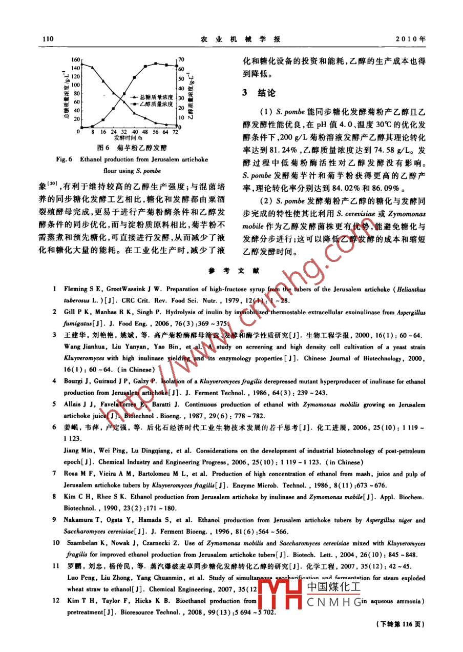 2010年1月農(nóng)業(yè)機(jī)械學(xué)報(bào)第41卷第1期DoI:10.3969/j.isn.1000-1298.2010.01.021粟酒裂殖酵母發(fā)酵菊芋生產(chǎn)燃料乙醇試驗(yàn)汪倫董英(1.江蘇大學(xué)食品與生物工程學(xué)院,鎮(zhèn)江212013;2.河南科技大學(xué)食品與生物工程學(xué)院,洛陽471003)【摘要】以菊粉為原料,研究了粟酒裂殖酵母的乙醇發(fā)酵性能并考察了溫度、初始pH值和菊粉質(zhì)量濃度對(duì)乙醇發(fā)酵的影響,進(jìn)而研究了粟酒裂殖酵母發(fā)酵菊芋汁和菊芋粉生產(chǎn)乙醇的情況。結(jié)果表明:粟酒裂殖酵母能發(fā)酵菊粉高產(chǎn)乙醇;該菌株最適發(fā)酵溫度為30℃,最適初始pH值為4.0,在此條件下,菊粉質(zhì)量濃度200g/L時(shí),乙醇質(zhì)量濃度達(dá)到74.58g/L,理論轉(zhuǎn)化率為81.24%;直接發(fā)酵菊芋汁和菊芋粉獲得更高的乙醇產(chǎn)率,理論轉(zhuǎn)化率分別達(dá)到84.02%和86.09%關(guān)鍵詞:菊芋粟酒裂殖酵母同步糖化發(fā)酵乙醇發(fā)酵中圖分類號(hào):S216.2文獻(xiàn)標(biāo)識(shí)碼:A文章編號(hào):1000-1298(2010)01010605Ethanol Production from Jerusalem ArtichokeUsing Schizosaccharomyces pombeWang Lunji Dong Ying(1. School of Food and Biological Engineering, Jiangsu University, Zhenjiang 212013,China2. School of Food and Bioengineering, Henan University of Science and Technology, Luoyang 471003, ChinAbstractThe ethanol fermentation capability of Schizosaccharomyces pombe from inulin was investigated.Theeffects of temperature, inulin concentration, and initial pH value on the ethanol fermentation werestudied. The ethanol production from Jerusalem artichoke juice and flour were further studied.Experimental results showed that S. pombe demonstrated good ethanol fermentation performance.Theoptimum initial pH value was 4.0, and the optimum temperature was 30C. Under the optimalconditions, the maximum ethanol concentration of 74 58 g/L, equivalent to 81. 24% of the theoreticalyield, was reached from 200 g/L inulin concentration after 72 h of incubation. Higher theoreticalconversion rates of 84. 02% and 86. 09% were obtained when Jerusalem artichoke juice and flour weredirectly used in fermentation, respectively.Key words Jerusalem artichoke, Schizosaccharomyces pombe, Simultaneous saccharification andfermentation, Ethanol production引言有一個(gè)葡萄糖基2),常用來生產(chǎn)高果糖漿,也可以用來生產(chǎn)乙醇-”。菊芋適應(yīng)性強(qiáng),耐貧瘠、耐菊芋( Jerusalem artichoke),俗名洋姜,原產(chǎn)北寒、耐旱,特別適合在沙漠、灘涂、鹽堿荒地等非農(nóng)業(yè)美,目前在中國廣泛種植。菊芋塊莖富含菊粉,占其耕地種植,且產(chǎn)量高,價(jià)格低廉。作為一種果糖基能干質(zhì)量的68%-83%。菊粉是果糖經(jīng)β-2,1-糖源植物,菊芋與小麥、玉米等糧食類淀粉質(zhì)原料相苷鍵聚合而成的一種果聚糖,呈直鏈結(jié)構(gòu),末端常含比,具有不占耕地、無需液化等優(yōu)勢,是我國非糧燃中國煤化工收稿日期:2009-04-28修問日期:2009-09-27鎮(zhèn)江市農(nóng)業(yè)攻關(guān)項(xiàng)目(NY2006043)CNMHG作者簡介:汪倫記,博士生,河南科技大學(xué)講師主要從事微生物與發(fā)酵工程研究 E-mail:w, lunji@sohu,com通訊作者:董英教投博士生導(dǎo)師,主要從事食品功能因子和食品生物技術(shù)研究,E-mail;yong@uj,cdu.cn第1期汪倫記等:粟酒裂殖酵母發(fā)酵菊芋生產(chǎn)燃料乙醇試驗(yàn)料乙醇生產(chǎn)及其產(chǎn)業(yè)規(guī)?;l(fā)展可選擇的原料之養(yǎng),定時(shí)稱量,記錄CO2失重,估計(jì)發(fā)酵狀況。發(fā)酵結(jié)束后,全部倒入全玻璃蒸餾器進(jìn)行乙醇蒸餾,測定以菊芋為原料生產(chǎn)乙醇很早就受到國內(nèi)外的關(guān)乙醇含量,對(duì)比S. pombe和S. cerevisiae的乙醇發(fā)酵注。20世紀(jì)50年代以來,國內(nèi)外學(xué)者先后報(bào)道了性能。各種以菊粉為原料生產(chǎn)乙醇的工藝技術(shù),包括12.3溫度對(duì)乙醇發(fā)酵的影響首先酸解或酶解菊粉生成單糖,再利用釀酒酵母發(fā)配制200g/L菊粉發(fā)酵液,接入S. pombe,接種酵生成乙醇的分步糖化發(fā)酵工藝(SHF)和利用產(chǎn)菊量5%,分別在2528、30、33和37℃培養(yǎng)72h,進(jìn)行粉酶的微生物與釀酒酵母進(jìn)行混合培養(yǎng)的同步糖化乙醇發(fā)酵,考察溫度對(duì)乙醇發(fā)酵的影響,確定最佳發(fā)發(fā)酵工藝(SSF)。酵溫度。本文使用粟酒裂殖酵母(S. pombe)進(jìn)行單菌同1.2.4初始pH值對(duì)乙醇發(fā)酵的影響步糖化發(fā)酵菊芋生產(chǎn)燃料乙醇的試驗(yàn)。配制200g/L菊粉溶液,初始pH值分別為3.5、1材料和方法4.0、4.5、5.0、5.5,接種量5%,30℃培養(yǎng)72h,考察pH值對(duì)乙醇發(fā)酵的影響,確定最佳pH值1.1材料1.2.5菊粉質(zhì)量濃度對(duì)乙醇發(fā)酵的影響1.11菌種選擇150200、250和300g/L4種菊粉質(zhì)量濃粟酒裂殖酵母購自中國工業(yè)微生物菌種保藏管度進(jìn)行試驗(yàn),接種量5%,30℃培養(yǎng)72h,研究乙醇理中心;釀酒酵母( Saccharomyces cerevisiae,耐高溫得率,確定最佳原料質(zhì)量濃度。和耐高糖)購自湖北安琪酵母公司;釀酒酵母(S.1.26菊芋汁發(fā)酵cerevisiae)和馬克斯克魯維酵母(K. marrons)為實(shí)鮮菊芋加適量水,粉碎打漿,紗布過濾去除殘驗(yàn)室保存。渣,菊芋汁80℃加熱15min滅酶,以防褐變,蒸發(fā)濃1.12菊芋粉和菊粉縮至總糖質(zhì)量濃度為200g/L,接種發(fā)酵,接種量菊芋購自安徽省滁州市,鮮菊芋經(jīng)洗凈、切片、5%,溫度30℃,轉(zhuǎn)速200r/min。晾曬、干燥、粉碎后置
