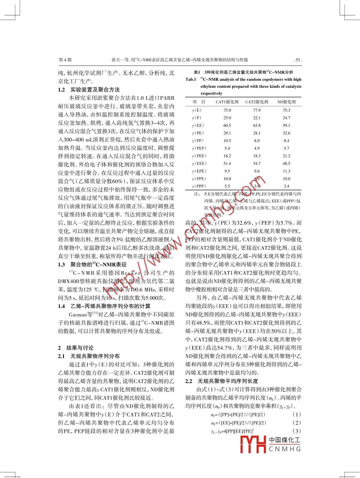 結構與性能合成樹脂及塑料,2013. 30(4):52CHINA SYNTHETIC RESIN AND PLASTICS用"C- -NMR表征高乙烯含量乙烯- -丙烯無規(guī)共聚物的結構與性能張?zhí)煲?夏先知,丁春敏(中國石油化工股份有限公司北京化工研究院.北京市10013)摘要:采用淤漿聚合法,使用3種聚丙烯催化劑制備了高乙烯含量乙烯-丙烯無規(guī)共聚物,并采用核磁共振碳譜對共聚物結構和性能進行了表征。結果表明:在相同聚合條件下,使用二醇酯化合物作為內(nèi)給電子體的ND催化劑同已商業(yè)化的兩種ieglrNatta催化劑CATI和ICAT2聚合得到的乙烯丙烯無規(guī)共聚物中的乙烯摩爾分數(shù)接近,為75%-78%;使用ND催化劑聚合得到的乙烯-丙烯無規(guī)共聚物鏈段中乙烯-丙烯單元序列分布更均勻;使用ND催化劑聚合得到的乙烯-丙烯無規(guī)共聚物中橡膠相相對含量高于采用CAT1和CAT2催化劑。關鍵詞:聚丙烯 淤漿聚合 ND催化劑 無規(guī)共聚物 核磁共振碳譜中圖分類號: TQ325.1"4 文獻標識碼: B文章編號: 1002-1396(2013)04- 0052-04目前,聚丙烯(PP)催化劑基本上都是以鄰苯1實驗部分二甲酸酯為內(nèi)給電子體的高效催化劑"。隨著PP 1.1 原料產(chǎn)品在生產(chǎn)和生活中的應用日益廣泛,其中含有ND催化劑,中國石油化工股份有限公司催化的“塑化劑”(即鄰苯二甲酯類化合物)引起人劑分公 司生產(chǎn)。兩種Ziegler-Natta型催化劑CAT1們越來越多的重視。作為鄰苯二甲酯類化合物的和CAT2, 均為已商業(yè)化產(chǎn)品。丙烯,聚合級,大連升級替代物,二醇酯化合物作內(nèi)給電子體合成的石 化公司生產(chǎn)。乙烯,聚合級,北京東方化工廠PP催化劑具有聚合活性高,定向能力高,聚合物生產(chǎn)。 乙烯和丙烯經(jīng)脫氧、脫硫、脫水等凈化后,相對分子質(zhì)量分布寬等特點(2-8,并已在Hypol工水的質(zhì)量分數(shù)小于2x 10*,氧的質(zhì)量分數(shù)小于藝、Innovene工藝、環(huán)管工藝等連續(xù)法PP生產(chǎn)裝2x 10“后使用。H2, 純度≥9.999%,經(jīng)脫氧、脫置上進行了廣泛的工業(yè)應用1-10。由于不含有“塑水凈化,北京龍輝京城氣體有限公司生產(chǎn)。N2,純化劑”,它可安全地應用于食品包裝和醫(yī)用器皿度≥9.999%,經(jīng)脫氧、脫水后使用,水的質(zhì)量分等領域。數(shù)小于5x 10-~,液化空氣(北京)公司生產(chǎn)。正癸PP抗沖共聚物的生產(chǎn)-一般是先進行丙烯均烷,分析純,經(jīng)脫氧、脫水后使用,天津科密歐化聚合,然后在聚合系統(tǒng)中引人乙烯丙烯混合原料學試劑有限公司生產(chǎn)。甲基環(huán)己基二甲氧基硅烷進行共聚合??箾_共聚物的一個重要指標就是共(C-donor),化學純,脫水、脫氧后使用,配制成聚物中乙烯含量,因此,在共聚合階段通過增加乙0.1 mmol/mL的己烷溶液,湖北華邦化學有限公司烯的進料比例是提高抗沖共聚物的乙烯含量的措生產(chǎn)。三乙基鋁(TEAL),化學純,配成0.5 mmol/mL的己烷溶液,德國Aldrich公司生產(chǎn)。鹽酸,分析使用二醇酯化合物作為內(nèi)給電子體的ND催化劑,應用于乙烯-丙烯無規(guī)共聚合方面是否具有收稿日期: 2013-01-30。不同于常規(guī)Ziegler-Natta催化劑的特點,作為-一個修回日期: 2013-04-29。特例,本工作將就高乙烯含量乙烯-丙烯無規(guī)共聚作者簡介:張?zhí)?一, 1966年生,高級工物通過核磁共振碳譜核磁('*C-NMR )進行研究,程師,1988年畢業(yè)于天津大學化學工并同兩種常規(guī)商業(yè)催化劑進行對比,希望能為ND程專業(yè),現(xiàn)從事聚烯烴催化劑研發(fā)及聚合工藝研究工作。聯(lián)系電話: (010)催化劑在工業(yè)應用時,尤其是在生產(chǎn)抗沖共聚物59202612; E-mail: zhangtiany bjhy@時起到一定的指導作用。sinopec.com.中國煤化工MHCNMH G .第4期張?zhí)煲坏?用'C-NMR表征高乙烯含量乙烯-丙烯無規(guī)共聚物的結構與性能純,杭州化學試劑廠生產(chǎn)。無水乙醇,分析純,北表1 3種催化劑高 乙烯含量無規(guī)共聚物"C- -NMR分析京化工廠生產(chǎn)。Tab.1 "C-NMR analysis of the random copolymers with highethylene content prepared with three kinds of catalysts1.2 實驗裝置及聚合方法respectively本研究采用淤漿聚合方法在1.0 L進口PARR項目CAT1催化劑 CAT2催化劑 ND催化劑耐壓玻璃反應釜中進行。玻璃釜帶夾套,夾套內(nèi)y(E)75.75通人導熱油,由恒溫控制系統(tǒng)控制溫度。將玻璃25.022.1反應釜加熱、烘烤,通人高純氮氣置換3~4次,再y(EE)60.563.859.1通人反應混合氣置換3次,在反應氣體的保護下加y(PE)292832.6人300~400 mL溶劑正癸烷,然后夾套中通人熱油10.58.0加熱升溫。當反應釜內(nèi)達到反應溫度時,調(diào)整攪y(PEP)5.4.拌到指定轉(zhuǎn)速。在通人反應混合氣的同時,將助y(PEE )18.218.催化劑、外給電子體和催化劑的預絡合物加入反y(EEE)51.45448y(EPE)9.59.11應釜中進行聚合。在反應過程中通人過量的反應混合氣(乙烯質(zhì)量分數(shù)60%),保證反應體系中反y(PPE)10.08.y(PP)3.應物組成在反應過程中始終保持- - 致,多余的未主: PE分別代表乙烯、丙烯; PPE,EE分別代表丙烯與丙反應氣體通過尾氣瓶排放,用尾氣瓶中一定高度丙烯、丙烯與乙烯、乙烯與乙烯接點; EEE(或PPP)包的白油液封保證反應體系的微正壓。隨時調(diào)整進括三單元體、四單元體及五單元體等,為乙烯(或丙烯)氣量維持體系的通氣速率。當達到預定聚合時間長鏈結構。后,加入- -定量的乙醇終止反應,根據(jù)實驗條件的高的,其中, y(PE)為32.6%, y( PEP)為5.7%。而變化,可以繼續(x