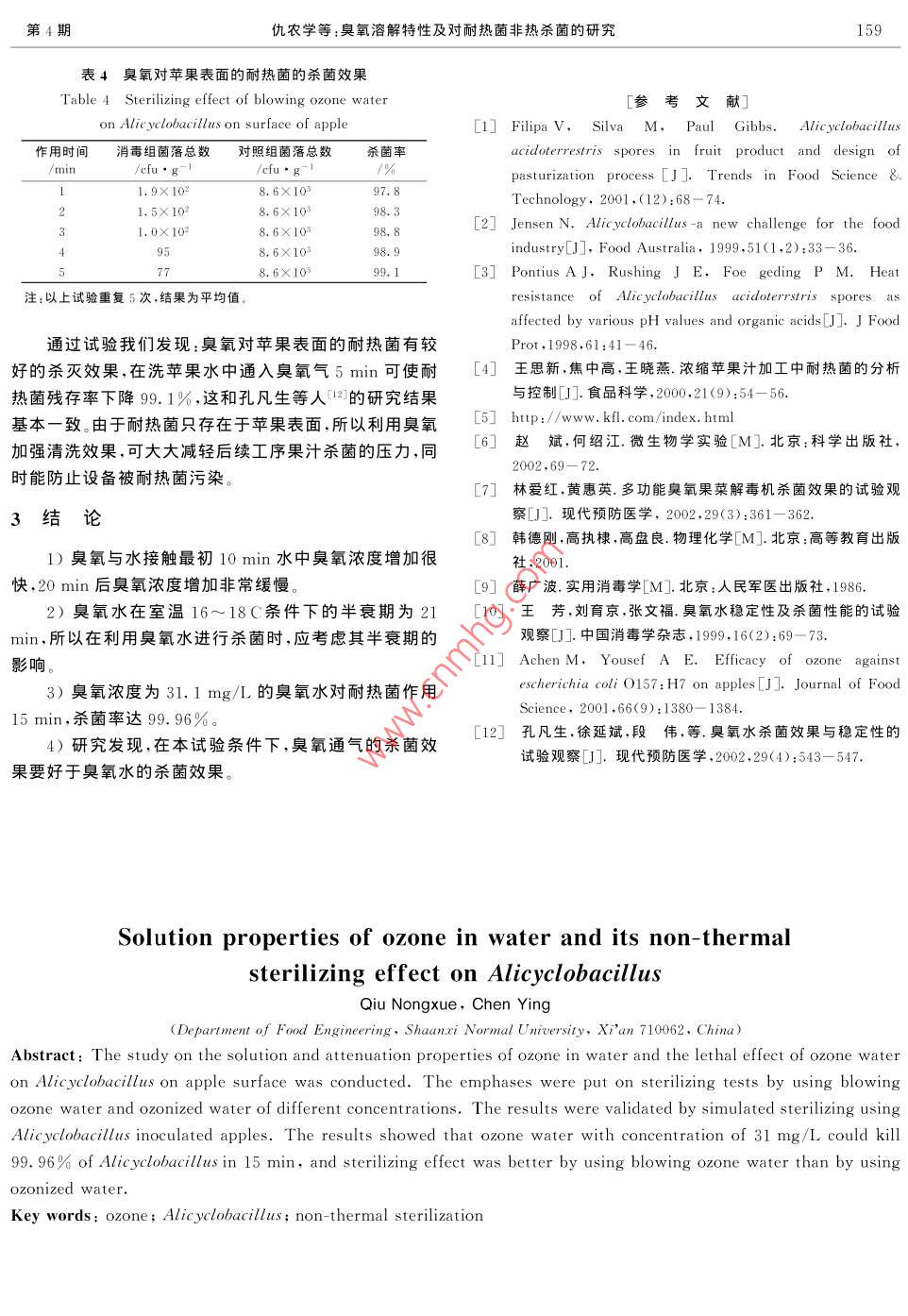 第20卷第4期農(nóng)業(yè)工程學(xué)報Vol.20 No.42004年7月Transactions of the CSAEJuly 2004157臭氧溶解特性及對耐熱菌非熱殺菌的研究仇農(nóng)學(xué),陳穎(陜西師范大學(xué)食品工程系,西安710062)摘要:該文研究了臭氧在水中的溶解衰減特性及對蘋果表面耐熱菌的殺菌效果;分別采用通氣懸液殺菌和不同濃度臭氧水懸液殺菌進行試驗,并用蘋果作為耐熱菌的載體進行了模擬驗證;研究結(jié)果表明:濃度為31.1mg/L的臭氧水對耐熱菌作用15 min,其殺菌率達99. 96% ,而且通氣殺菌效果好于臭氧水殺菌。關(guān)鍵詞:臭氧;耐熱菌;非熱殺菌中圖分類號: TS261.1+7文獻標(biāo)識碼: A文章編號:1002- 6819(2004)04-0157-031.2試驗方法)引言1.2.1臭氧水制備及濃度測定.耐熱菌,即酸土環(huán)脂芽孢桿菌(Alicyclobacillus臭氧水的制備采用向水中通入臭氧氣體的方法獲acidoterrestris), 是蘋果濃縮汁生產(chǎn)中最重要的目標(biāo)控得,通氣時臭氧氣體須經(jīng)過一個砂芯,以提高其溶解度。制微生物之一。其耐熱性很強,蘋果汁中的耐熱菌孢子在臭氧水濃度的測定方法執(zhí)行中華人民共和國城鎮(zhèn)建設(shè)行殺菌溫度為90C時其D值(十進制衰減時間,即在某-業(yè)標(biāo)準《臭氧發(fā)生器臭氧濃度、產(chǎn)量、電耗的測量》(CJ/特定的溫度下,殺死給定體系微生物總量的90%所需要.T3028.2- 94)。的時間)達23minll,能夠經(jīng)受果汁加工中巴氏殺菌過程.1.2.2懸液定量殺菌試驗而存活,因此,果汁中耐熱菌的殺菌技術(shù)對傳統(tǒng)的熱力殺1)試驗中菌的回收方法為,分別向裝有0.5 mL耐菌方法提出了挑戰(zhàn)。臭氧是一-種高效、廣譜的殺菌劑,它熱菌懸液(含菌量5義10*~5X 10* cfu/mL)的試管中加具有殺菌力強,作用時間短,無殘留等特點,已廣泛應(yīng)用入4.5mL濃度為31.1mg/L和3.11mg/L的臭氧水,于飲用水和醫(yī)院等的消毒程序,但在果汁加工中尚未得混勻,作用至預(yù)定時間,各取0.5 mL菌藥混合液,分別到應(yīng)用。加入盛有4.5mL中和劑(含0.5%NaS2O;的磷酸鹽緩耐熱菌最初是在熱的溫泉水中發(fā)現(xiàn)的,隨后該屬細沖液,pH7.2)的試管中,混勻作用10min后平板計數(shù)法菌陸續(xù)在果園土壤以及森林等非熱環(huán)境中發(fā)現(xiàn)(2.8。蘋果.進行活菌計數(shù)回,計算殺滅率。汁中耐熱菌的來源主要是由于蘋果在采收貯運過程中泥2)向懸菌液中直接通入臭氧氣,懸液體積為100土對其表面的污染”,只要在加工時采取有效的清洗技mL,臭氧通氣量5g/h,室溫18~20C。從臭氧接觸菌液術(shù),是可以從源頭上防止的。因此,根據(jù)臭氧的殺菌特點開始計時,分別作用1.2.3.4、5.6、7min后轉(zhuǎn)移懸菌液,和在水中的溶解特性,利用臭氧水加強對原料果的清洗,加入中和劑進行活菌計數(shù)。以不通氣的菌液為對照,殺菌殺滅果皮表面的耐熱菌杜絕果汁后續(xù)污染,是防止蘋果率的計算方法同1)。汁耐熱菌超標(biāo)的有效途徑。本文研究了臭氧在水中的溶3)計算殺菌率時的菌液濃度(efu/mL),采用稀釋解衰減特性及在常溫下對蘋果表面耐熱菌的殺菌效果,過程前的原始菌液濃度??蔀樘O果汁生產(chǎn)中應(yīng)用非熱殺菌技術(shù)提供依據(jù)。1.2.3模擬 試驗1 材料與方法以完整蘋果為原料.蘋果表皮被接種上耐熱菌后(接種量約9X 10* cefu/g,此處g為帶表皮蘋果的質(zhì)量),用通1.1主要材料與儀器有臭氧氣的水清洗蘋果。作用至預(yù)定時間,沿蘋果經(jīng)線縱臭氧發(fā)生器:由湖南遠超臭氧設(shè)備有限公司提供向呈桔瓣狀切取約5g帶表皮蘋果,用洗脫液洗脫,然后(YCYGC- 0005型,產(chǎn)臭氧量5 g/h)。對洗脫液進行活菌計數(shù)”],計算殺滅率。耐熱菌(Alicyclobacillus acidoterrestris): 從陜西恒興果汁飲料有限公司蘋果汁中分離培養(yǎng)。2結(jié)果與討論K氏培養(yǎng)基:按美國庫格實驗室(Krueger Food2.1臭氧在水中的溶解特性Laboratories INC)的標(biāo)準配制呵。開機5min后將臭氧氣通入一定體積的水中并開始計時,定時測定臭氧水的濃度,結(jié)果表明:臭氧濃度隨通收稿日期2003-11-27修訂日期:2004-06-18氣時間的延長而升高,通氣25min后臭氧水中臭氧濃度基金項目:國家“十五”重大專項“優(yōu)質(zhì)鮮榨蘋果汁和渾濁型蘋果汁加上升趨勢漸漸平緩。且隨著吸收液體積的增加,臭氧濃度158農(nóng)業(yè)工程學(xué)報.2004年Henry定律83]。臭氧溶解度隨其在溶液中平衡壓力的增大而增加,在試驗過程中,隨著通氣時間的延長,臭氧在.結(jié)果表明:高濃度的臭氧水殺滅耐熱菌的效率較強,水中的平衡壓力逐漸減小,溶解度也隨之減小,造成濃度濃度為31. 1 mg/L的臭氧水對耐熱菌懸液作用5 min增加的幅度越來越小。殺菌率可達到99. 14%;低濃度的臭氧水則需延長作用時間才能得到較為理想的殺菌效果。濃度為3. 11 mg/L .吸收液體積的臭氧水對耐熱菌懸液作用5min殺菌率僅為76.3%,作用15 min可達到99. 49%。王芳等人10]研究得出,濃一一300mL一一500 mL度為12.0mg/L的臭氧水對枯草桿菌黑色變種芽孢作用20 min,殺菌率為99. 91% ,本研究結(jié)果與王芳等人結(jié)30通氣時間/min論有差異,其原因可能是菌種不同、試驗條件不同所致。2.3.2 通氣懸液殺菌以上試驗重復(fù)3次.結(jié)果為平均值,室溫16~18C通氣懸液殺菌的試驗結(jié)果如表2所示。圖1臭氧濃度隨通 氣時間變化曲線Fig. 1 Relationship bet ween ozone concentration表2通氣殺菌試驗結(jié)果and blowing timeTable 2 Sterilizing effect of blowing