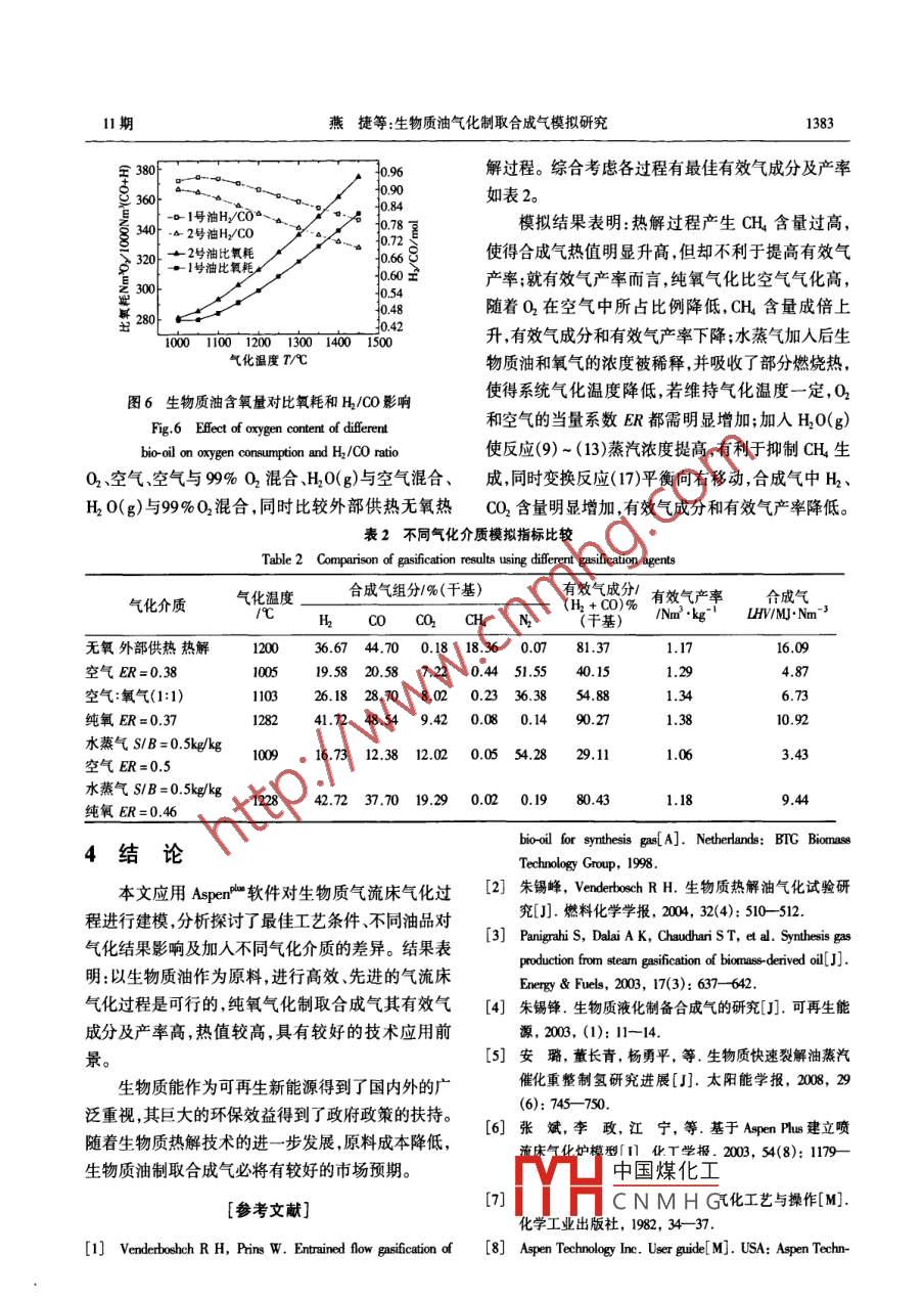第31卷第11期太陽能學報2010年11月ACTA ENERCIAE SOLARIS SINICA文章編號:025400962010)11-137906生物質油氣化制取合成氣模擬研究燕捷!,王亦飛,代正華,王小泉2,孫洋洲2(1.華東理工大學潔凈煤研究所,上海2007;2.中國海洋石油總公司,北京100010摘要:基于 Aspen建立生物質油純氧氣流床氣化工藝模型,通過靈敏度分析初步探討工藝條件、不同氧含量和生物質油等參數對氣化結果的影響,并對不同氣化介質的氣化結果進行比較。模擬研究表明:氧氣當量系數ER約為037,氣化溫度可達約1280℃,生物質油純氧氣化有效氣成分可達約90%。在無外部供氧條件下,合成氣的CH含量過高;隨O2在空氣中比例降低,CH含量成倍上升;水蒸氣的加入有利于抑制CH生成。關鍵詞:生物質油;氣流床氣化;模擬中圖分類號:TQs4;TK文獻標識碼:A0引言1生物質油氣化工藝分析生物質油是生物質快速熱解得到的液體產物高溫粗合成氣初步處理方案選擇技術成熟、操對于其應用與深度加工的研究得到了國內外學者的作性能高的激冷流程:將預熱至90℃的生物質油經泛重視。其中,尤為引起重視的是生物質油代替柱塞泵送入氣化爐頂部或側部的噴嘴內,與空分工傳統生物質原料制取合成氣。生物質油能量密度序來的氧氣在噴嘴出口混合霧化后,液滴微粒一般高,便于運輸貯藏,不同原料熱解油品易相互混合,小于0.1m。將混合氣通入1200℃以上的氣化爐可實現分散收集,集中氣化。解決了傳統生物質氣內,油中的C、H0等元素在高溫下迅速反應。產生化工藝由于生物質的富集地區(qū)十分有限而難以達成的高溫粗合成氣進入激冷室,與后續(xù)變換工序送來規(guī)模效益的難題。相對于體積龐大疏松的生物質,的約220℃的預熱化學軟水發(fā)生強烈的熱質傳遞,實生物質油易于實現連續(xù)進料和加壓操作,其所含灰現高溫粗合成氣的洗滌(除炭黑)、冷卻和增濕等過分少,制得氣體純凈。程。被水蒸氣飽和的合成氣和炭黑水混合物進入分國外學者對生物質油氣化過程已開展大量實驗離器,炭黑被分離約90%。合成氣再依次經文丘里研究,荷蘭BTG以空氣為氣化介質進行了生物質油除塵器和分離器,用預熱化學軟水洗滌炭黑然后進氣流床氣化及無外部供氧熱解實驗2; Panigrahi S人洗滌塔進一步除塵。最后得到的合成氣溫度為等利用管式固定床由生物質油制備合成氣及民用200~206,送至后序工段。燃氣。國內在生物質油氣化應用研究方面尚處于起氣流床氣化爐是該工藝設備核心,爐內從上到步階段4,一般釆用蒸汽催化重整制氫工藝,對生下主要分為氣化還原反應區(qū)、烴類裂解區(qū)、氧化燃燒物質油氣化制合成氣的研究較少。上述研究表明,區(qū)、排渣區(qū)等。生物質油霧化后與氧氣充分混合噴該技術路線在技術和經濟方面具有潛在優(yōu)勢。入爐內,接受輻射熱經歷霧滴升溫、蒸發(fā)成為油蒸本文在上述實驗研究基礎之上基于 Aspen軟氣,這是一個吸熱過程:件,借鑒技術條件成熟的煤6、渣油氣流床氣化工CH2O,(1)→CH2O,(g)藝,建立生物質油純氧氣流床氣化工藝模型。探討在氧化燃燒區(qū),油蒸汽遇氧發(fā)生完全氧化和部了最佳工藝條件,并對不同氣化介質的氣化結果進分氧成C0Cn.和水蒸氣放出大量熱量行了比較,為后續(xù)實驗提供了理論依據。中國煤化工H(2)CNMHG收稿日期:200217通訊作者:王亦飛(190-),女,教授、博土,主要從事煤氣化、多相流方面的研究。 wangyu@eu,dumn太陽能學報31卷CH1O,+O2→CO+H2O(3)H、O、N、S全部轉為氣相,C不完全轉化;③氣化劑與CH1O,+O2→CO+H(4)生物質油霧滴在爐內瞬間完全混合;④氣化爐內壓當混合不均勻或氧組分傳遞控制時,生物質油力相同,無壓力降;⑤過程不考慮焦油成分霧滴已處于高溫,在烴類裂解區(qū)進行高溫烴類裂解模擬流程中主要模塊依次包括:油裂解模塊Ry反應,這是一個吸熱過程。eld,根據元素分析,將生物質油分解為簡單元素組CH1O,→CH2O2(5)分及灰分,其裂解熱來自氣化模塊;渣生成模塊RsCH2O,→CH2-20,+H2(6)ti,計算系統碳與灰轉化成渣的反應Rgbs是基于CHO,→C+CH4(7)吉布斯自由能最小化原理的氣化模塊,針對生物質油氣化過程,考慮其中存在元素為C、H、O、N、S,包CH→C+H(8)含的組分有CO0、H2、CO2、CH4、H2O、N2、H2S、NH3部分高分子烴裂解為低分子烴直至CH、H2與COS、SO2、C(s)、S等,反應器內達到化學平衡時,體游離碳。烯烴還會通過聚合、環(huán)化、縮合反應生成系的吉布斯自由能達到極小值;閃蒸分離器Fash焦,導致氣化過程中存在炭黑。用于實現高溫粗合成氣的激冷;合成氣再依次經過在氣化還原反應區(qū)進行轉化反應,水蒸氣、C2分離器Sep2及文丘里洗滌器vcnb,將氣體中炭黑在高溫下與各種碳氫化合物及游離碳進行吸熱的轉分離約9%; RadFrac嚴格模型,用于模擬洗滌塔中化反應:多級氣-液逆流接觸,出塔合成氣幾乎不含炭黑;粗CH2O,+H2O·CO+H2合成氣經過一個換熱器 Heater換算成標準狀態(tài),進CH2O,+H2O→CO2+H(10)入完全燃燒反應器 Stoic計算熱值。Qost為系統CH,O,+CO2→CO+H2(1)熱損失取生物質油熱值的05%(按H計)。所CH4+H2O→CO+H2(12)建立的生物質油氣化工藝的流程圖如圖1所示。CH4+H2O→CO2+H2(13)裂解需熱廣熱損失CH4+CO2→CO+H2渣生成熱C+H2O·CO+H2(15)裂解渣牛成離器模塊混合器C+CO2→·CO(16)生物 YIELD RSTOIRGIBBS以上反應生成的混合氣體含有CO、H2、CO2和H2O四種組分,它們一起參與變換反應為器激冷室文丘甲洗滌FLASCO+H2O→CO2+H(17)FRAC完全燃