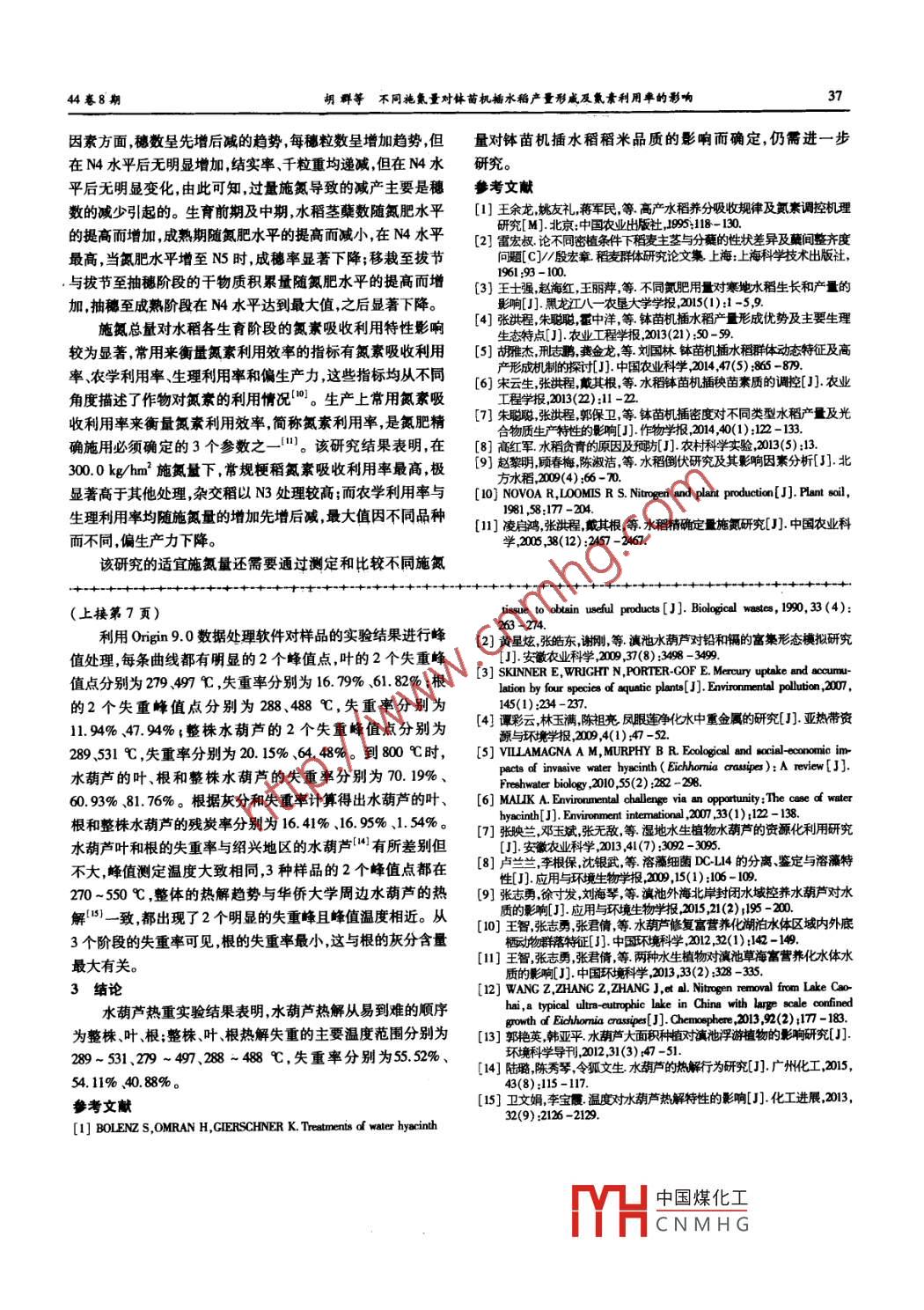 安徽農(nóng)業(yè)科學(xué), Joumal of Anhui Agri.Sei.2016,44(8):7,37貴任編輯喬利利責(zé)任校對況玲玲滇池水葫蘆的熱重分析蘇文靜”2,李世友12‘,王秋華12(1.西南林業(yè)大學(xué)土木工程學(xué)院,云南昆明650224;2云南省森林災(zāi)害預(yù)警與控制重點實驗室,云南昆明650224)擴(kuò)要[目的]明確水葫蘆的熱解特性。[方法]采用熱重分析方法對滇池中的水葫蘆進(jìn)行熱解試驗繪制水葫蘆葉、根、整株的熱重曲線。[結(jié)果]水葫蘆熱解從易到難的順序為整株、葉、根,整株水葫蘆在289~531℃的熱解失重率為5552%,葉在279~497℃的熱解失重率為54.1%,根在288-48℃的熱解失重率為40.88%。[結(jié)論]試驗結(jié)果為水葫蘆的燃料和發(fā)酵利用提供了參考。關(guān)鍵詞水葫蘆;灰分;熱解;熱重分析中圖分類號S963.213;TK6文獻(xiàn)標(biāo)識碼A文章編號0517-6611(2016)08-007-01Thermal Gravimetric Analysis of Eichharnia crassipes in Dianchi LakeSU Wen-jing, LI Shi-youa2‘,wANG(1. College of Civil ErSouthwest Forestry University, Kunming, Yuunnan650224; 2. Key Laboratory of Forest Disaster Warming and Control, Yunnan, Kunming 650224)Abstract [Objective] To study the pyrolysis characteristics of Eichharnia crassipes. Method The pyrolysis experiment of E. crassipes inDianchi Lake was carried out by using the method of thermal gravimetric analysis. The heat and weight curve of the leaf, root and whole plantwhole E. crassipes azon sipes pyrolysis from easy to difficult was in the order of whole plant, leaf and root; the weight loss rate of thewhole E. crassipes at 289-531C was 55.52%, the weight loss rate of the leaf at 279-497C was 54. 11%, the weight loss rate of the rootat 288-488C was 40. 88%.[ Conclusion] This research provides references for the burning and fermentation utilization of E. crassipesKey words Eichharnia crassipes; Ash content; Pyrolysis; Thermal gravimetric analysis水葫蘆( Eichhornia crassipes)學(xué)名鳳眼蓮,又名布袋蓮、備用。 TGA/SDTA51同步熱分析儀為梅特勒-托利多公水荷花屬雨久花科,是一種源自南美洲亞馬遜河流域的浮司產(chǎn)品。水植物。水葫蘆根系發(fā)達(dá)以高效的繁殖能力和良好的適12方法采用 TGASDTA851同步熱分析儀進(jìn)行熱重實應(yīng)性使其在南方地區(qū)的內(nèi)河流域廣泛分布,水葫蘆在20世驗。將樣品放入氧化鋁坩堝中,從25℃加熱到800℃,加熱紀(jì)30年代傳入我國,在飼料糧短缺時曾作為畜禽飼料而大速率為20℃/min,采用高純度的氮氣為載氣,流量為力推廣2。水葫蘆具有極強的氮、磷吸收能力以及重金屬富20mlL/min,分別對水葫蘆的根、葉和整株樣品進(jìn)行熱重實集能力被用于污染水體和富營養(yǎng)化湖泊的生態(tài)修復(fù)“。驗。由于水葫蘆莖的質(zhì)量占整株質(zhì)量比例較小故未對莖進(jìn)目前,水葫蘆在造紙、藥用、食品、編織品、吸附劑領(lǐng)域有所應(yīng)行熱重實驗。采用Oin9.0軟件進(jìn)行數(shù)據(jù)處理。用但應(yīng)用最廣泛的還是在處理富營養(yǎng)化水質(zhì)制備能源燃2結(jié)果與分析料、肥料和飼料方面。由圖1可知,從25℃升高到800℃,3條曲線都經(jīng)過了滇池是我國的第六大湖泊。自101年滇池藍(lán)藻首次大相同的3個階段,熱解的基本趨勢相同。從25℃開始到面積暴發(fā)以來滇池的藍(lán)藻有覆蓋面積增大持續(xù)時間增加100℃左右時,質(zhì)量損失量較小,僅表現(xiàn)為失水過程為失水的趨勢,整個湖泊的富營養(yǎng)化問題嚴(yán)重。200年昆明市啟階段。在隨后的100℃范圍內(nèi)質(zhì)量基本不發(fā)生變化。在動了“滇池水葫蘆富集氮磷及資源化利用研究與示范項目280-480℃范圍內(nèi)水葫蘆的質(zhì)量發(fā)生較大改變,是水葫蘆2011年基于水葫蘆在清除滇池內(nèi)源污染方面的巨大潛力,昆熱解的主要階段為熱分解階段。在500℃以后水葫蘆根明市將“控制性種養(yǎng)水葫蘆”列為治理污染的重要措施之和葉的質(zhì)量不再發(fā)生大的改變,曲線趨于平緩為炭化階段并啟動了“滇池水葫蘆治理污染試驗性工程”,取得了一系列與葉、根的熱解曲線相比整株水葫蘆的質(zhì)量在300℃以后實用性進(jìn)展-。筆者曾采用干灰分法測定了滇池水葫蘆下降迅速。的灰分含量,葉、根、整株的灰分含量分別為13.4%、22.12%、16.7%。隨著利用水葫蘆凈化滇池水技術(shù)的推廣越來越多的水葫蘆將被收集和利用。鑒于此,筆者采用熱重整株分析儀對水葫蘆進(jìn)行了熱重分析,以期為水葫蘆的燃燒、發(fā)酵利用等奠定基礎(chǔ)。1材料與方法1.1材料水葫蘆樣品采自滇池東北部的海東濕地。將取回的樣品清洗烘干、粉碎、過篩,自然狀態(tài)放置一段時間后灜度 Temperature℃基金項目國家自然科學(xué)基金地區(qū)項目(31260180)中國煤化工作者簡介蘇文靜(193-),女,山東威海人,碩士研究生,研究方向森林防火。*通訊作者,副教授,博士,從事森林防火研究。CN MH Crassipes收稿日期20160302(下轉(zhuǎn)第37頁)44卷8期胡群等不同施氯量對缽苗機插水稻產(chǎn)量形咸及氮素利用率的彩響因素方面穗數(shù)呈先增后減的趨勢每穗粒數(shù)呈增加趨勢,但量對缽苗機插水稻稻米品質(zhì)的影響而確定,仍需進(jìn)一步在N水平后無明顯增加結(jié)實率、千粒重均遞減但在N水研究。平后無明顯變化由此可知過量施氮導(dǎo)致的減產(chǎn)主要是穗?yún)⒖嘉墨I(xiàn)數(shù)的減少引起的。生育前期及中期,水稻莖蘗數(shù)隨氮肥水平[1]王余龍姚友禮蔣軍