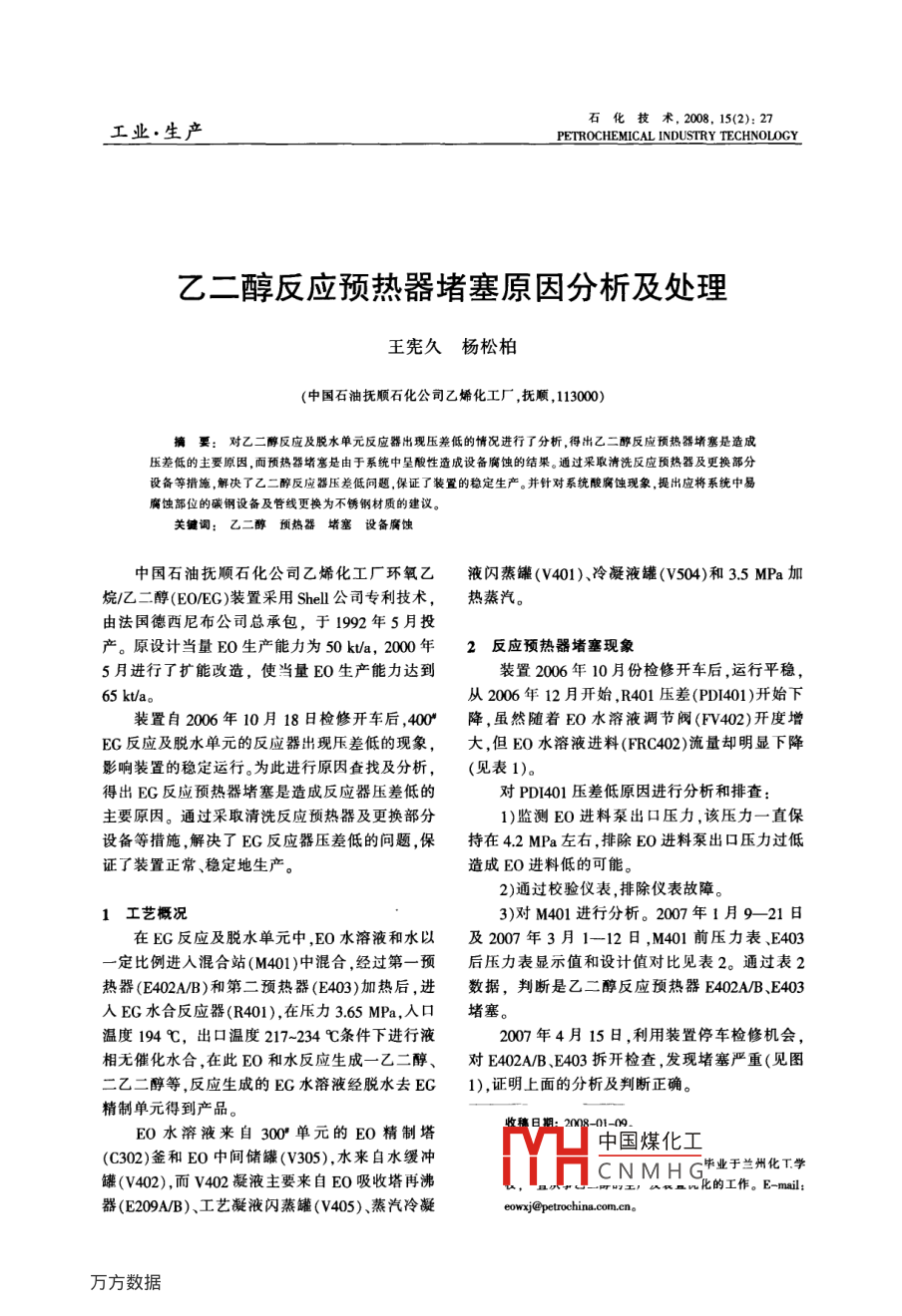 石化技術,2008,15(2):27業(yè)·生產(chǎn)PETROCHEMICAL INDUSTRY TECHNOLOGY乙二醇反應預熱器堵塞原因分析及處理王憲久楊松柏(中國石油撫順石化公司乙烯化工廠,撫順,11300摘要:對乙二醇反應及脫水單元反應器出現(xiàn)壓差低的情況進行了分析,得出乙二醇反應預熱器堵塞是造成壓差低的主要原因,而預熱器堵塞是由于系統(tǒng)中呈酸性造成設備腐蝕的結果。通過采取清洗反應預熱器及更換部分設備等措施,解決了乙二醇反應器壓差低問題,保證了裝置的穩(wěn)定生產(chǎn)。并針對系統(tǒng)酸腐蝕現(xiàn)象,提出應將系統(tǒng)中易腐蝕部位的碳鋼設備及管線更換為不銹鋼材質(zhì)的建議關鍵詞:乙二醇預熱器堵塞設備腐蝕中國石油撫順石化公司乙烯化工廠環(huán)氧乙液閃蒸罐(V401)、冷凝液罐(V504)和3.5MPa加烷/乙二醇(EOEG)裝置采用 Shell公司專利技術,熱蒸汽。由法國德西尼布公司總承包,于1992年5月投產(chǎn)。原設計當量EO生產(chǎn)能力為50kta,2000年2反應預熱器堵塞現(xiàn)象5月進行了擴能改造,使當量EO生產(chǎn)能力達到裝置2006年10月份檢修開車后,運行平穩(wěn)65kta。從2006年12月開始,R401壓差(PDl401)開始下裝置自2006年10月18日檢修開車后,400降,雖然隨著EO水溶液調(diào)節(jié)閥(FV402)開度增EG反應及脫水單元的反應器出現(xiàn)壓差低的現(xiàn)象,大,但EO水溶液進料(FRC402)流量卻明顯下降影響裝置的穩(wěn)定運行。為此進行原因查找及分析,(見表1)。得出EG反應預熱器堵塞是造成反應器壓差低的對PD401壓差低原因進行分析和排查主要原因。通過采取清洗反應預熱器及更換部分1)監(jiān)測EO進料泵出口壓力,該壓力一直保設備等措施解決了EG反應器壓差低的問題,保持在4,2MPa左右,排除EO進料泵出口壓力過低證了裝置正常、穩(wěn)定地生產(chǎn)。造成EO進料低的可能2)通過校驗儀表,排除儀表故障1工藝概況3)對M40進行分析。2007年1月9-21在EG反應及脫水單元中,EO水溶液和水以及2007年3月1-12日,M401前壓力表、F403定比例進入混合站(M401)中混合,經(jīng)過第一預后壓力表顯示值和設計值對比見表2。通過表2熱器(E402A/B)和第二預熱器(E403)加熱后,進數(shù)據(jù),判斷是乙二醇反應預熱器E402A/B、E403入EG水合反應器(R401),在壓力365MPa,人口堵塞。溫度194℃,出口溫度217~234℃條件下進行液2007年4月15日,利用裝置停車檢修機會相無催化水合,在此EO和水反應生成一乙二醇、對E402A/B、E403拆開檢查,發(fā)現(xiàn)堵塞嚴重(見圖二乙二醇等,反應生成的EG水溶液經(jīng)脫水去EG1),證明上面的分析及判斷正確。精制單元得到產(chǎn)品。38-01-09EO水溶液來自300"單元的EO精制塔中國煤化工(C302)釜和EO中間儲罐(V305),水來自水緩沖罐(V402),而V402凝液主要來自EO吸收塔再沸CNMH畢業(yè)于蘭州化T學,可以x,叢心化的工作。E-m器(E209AB)、工藝凝液閃蒸罐(V405)、蒸汽冷凝28石化技術2008年第15卷第2期表1裝置工藝參數(shù)運行平穩(wěn)及異常數(shù)據(jù)對比裝置異常2006年10月2006年12月2007年4月PDI401/kPa465-472開始下降FV402閥門開度,%49~52FRC402/(mh8.2-8.574-8.0表2壓力表顯示值和設計值對比MPa判斷E402AB、E403又發(fā)生堵塞?,F(xiàn)場表位置設計值3E402AB、E403堵塞原因分析月9-21日3月1-12日2007年4月15日,對E402AB、E403進行檢修。根據(jù)堵塞物顏色,判斷EO水合進料系統(tǒng)中含E403后(PG2)363.7有鐵銹。1)水進料系統(tǒng)對進V402及進ⅴ402罐3.5MPa蒸汽系統(tǒng)檢測,確定系統(tǒng)各工藝操作參數(shù)一直平穩(wěn),凝液中鐵含量小于0.2mg/L,排除上述系統(tǒng)鐵含量高。而對E209AB進V402凝液進行分析,鐵含量高達210mgL,并且200單元EO解吸塔(C204)操作參數(shù)變化較大,可以判斷出C204系統(tǒng)鐵含量高。a F402A2007年4月15日檢修期間對E209AB進行打壓試漏。E209A漏1根管束,E209B管板大面積泄漏,泄漏管達274根;2007年10月15日裝檢修發(fā)現(xiàn)E209A內(nèi)漏2根管束,E209B管板和管束泄漏700多根,并成蜂窩狀。這說明E209B和E209A系統(tǒng)由于呈酸性造成設備腐蝕嚴重,產(chǎn)生內(nèi)漏,而腐蝕下來的鐵銹堵塞了E402ABE403。b F402B2)EO進料系統(tǒng)2007年9月3日出現(xiàn)泵P401入口管線泄漏,對其管線進行檢測,發(fā)現(xiàn)人口直管線減薄;2007年10月10日泵P401出口三通泄漏,在此期間PDI401壓差由110kPa降至100kPa,說明EO進料系統(tǒng)含鐵銹是造成E402AB、E403堵塞的原因。4采取的措施圖1乙二醇反應預熱器堵塞情況利用2007年10月15日裝置檢修機會,對經(jīng)過對FA02A/B、E403進行清洗后開車,初E402AB、F403進行清洗,更換E209B,對E209A期裝置運行平穩(wěn),PD401為462kPa,FRC402為進行堵漏,更換泵P401入口管線及出口三通107m沿,FV402閥門開度45%。但是經(jīng)過20天2007運行后,又出現(xiàn)PD401壓差開始下降現(xiàn)象,2007產(chǎn)狀Y“中國煤化工m月F度及FRC402年7月3日降至110kPa。根據(jù)M401前壓力表顯參數(shù)CNMHG2AB、E4B3堵示(42MPa)、E403后壓力表顯示(36MPa)數(shù)據(jù),塞而造成工藝不穩(wěn)王憲久等,乙二醇反應預熱器堵塞原因分析及處理5建議系統(tǒng)易腐蝕部位的碳鋼設備及管線更換成不銹鋼在乙烯氧化生成EO反應過程中,同時伴隨材質(zhì),防止設備腐蝕,以保證裝置長周期安全穩(wěn)定著副產(chǎn)物甲醛和乙醛的生成,若脫醛系統(tǒng)脫除醛地運行。未徹底或系統(tǒng)醛含量過高,醛會與水生成酸,這樣對后續(xù)單元的設備和管線造成腐蝕。因此,建議將(端輯:谷彥麗)A