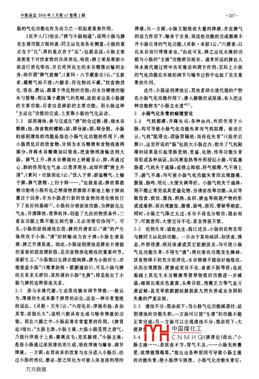 226·JTCM. Mar. 2006, Vol 47, No. 3試論小腸的氣化功能白宇寧1白兆芝2張潤順2寇永鋒主題詞小腸氣化氣完成脾的升清作用倘若沒有小腸的這種降中有升,則脾氣之升就體現(xiàn)不到胃、大小腸這些具體臟器上,也氣的新陳代謝運(yùn)動變化及其伴隨發(fā)生的物質(zhì)轉(zhuǎn)化就不能完成其升清作用可以說脾的“升”是從總體上和能量轉(zhuǎn)化的過程稱之為“氣化”人體的臟腑經(jīng)絡(luò)、周來統(tǒng)帥把握控制協(xié)調(diào)的而小腸的“升”是從本腑的身組織無不在不同的角度、范圍與深度上參與了這類角度來配合脾氣之升的。因此,小腸氣機(jī)雖然主降,氣化運(yùn)動,包括人體內(nèi)精微物質(zhì)的消化、吸收、轉(zhuǎn)輸敷但降中有升是其氣化運(yùn)動的基本規(guī)律布以及將其代謝產(chǎn)物排除體外的一系列代謝,故氣2小腸氣化的量要作用化為生生之本。小腸氣化在機(jī)體的生命活動中具有極小腸的氣化運(yùn)動存在于其主運(yùn)化、別清濁、主津其重要的地位,以往人們認(rèn)為脾胃為后天之本氣化之液、主通降等生理活動的全過程之中可以說機(jī)體的消根2,用脾胃的生理功能來概括小腸的生理功能,而忽化系統(tǒng)的所有生理功能的完成包括氣血津液等營養(yǎng)路了小腸的生理尤其是小腸的氣化功能從而導(dǎo)致了物質(zhì)的生成與轉(zhuǎn)化都離不開小腸的氣化功能對小腸的生理病理乃至疾病的認(rèn)識不夠深入。故深入2.1化物出焉,與脾同主運(yùn)化而各有側(cè)重:小腸是探討小腸的氣化功能,無論對研究臟象學(xué)說,還是指導(dǎo)個相當(dāng)長的管狀器官,靈樞·胃腸》已經(jīng)明確記載了臨床實踐,均有重要意義。其解剖位置與形態(tài)。關(guān)于小腸的生理功能,《素間·靈1小腸氣化的運(yùn)動形式蘭秘典論》指出:“小腸者,受盛之官,化物出焉?!笔苁?小腸作為六腑之一,其氣化運(yùn)動存在于生命過程即接受,以器盛物之意化物,即消化化生吸收之意的始終,其運(yùn)動形式主要表現(xiàn)為主降,而降中有升飲食物經(jīng)過胃的初步消化之后,即進(jìn)入小腸在小腸的1,1小腸主降,與脾胃同為機(jī)體升降的樞紐:人體的氣化功能的作用之下,經(jīng)過相當(dāng)時間的停留將之消化生命活動無一不是臟腑升降出入運(yùn)動的表現(xiàn)。在臟象為可被人體利用的精微物質(zhì)并加以吸收小腸的這種學(xué)說中常以脾升胃降來概括整個消化系統(tǒng)的生理功功能與脾主運(yùn)化的功能有著非常相似之處。《中醫(yī)基礎(chǔ)能,即所謂“脾宜升則健,胃宜降則和”(《臨證指南醫(yī)理論》(六版教材)解釋脾主運(yùn)化說:“運(yùn),即轉(zhuǎn)運(yùn)輸送;案》)。胃主通降是指飲食物通過胃的腐熟后下行至小化,即消化吸收。脾主運(yùn)化是指脾具有把水谷化為精腸通過小腸的進(jìn)一步消化吸收將食物殘渣下輸于大微,將精微物質(zhì)吸收轉(zhuǎn)輸至全身的生理功能可以腸,最后排出體外小腸作為六腑之一,傳化物而不藏,看出,小腸與脾共同參與了飲食物消化吸收的全過程。以通為用故小腸亦主降。若小腸不能通降,則胃氣不《素問·六節(jié)臟象論》云:“脾、胃、大腸、小腸……,倉熹降大腸不能傳導(dǎo),糟粕難出因此,小腸與脾胃互相配之本營之居也,名日器能化糟粕轉(zhuǎn)味而入出者也”合,升清降濁,共同完成一系列消化吸收傳輸功能,同這種“轉(zhuǎn)味而人出”的生理功能的完成,離不開各自的為機(jī)體升降之樞紐。氣化功能。在這個過程中小腸和脾起了什么作用,其各l2降中有升,小腸氣化運(yùn)動的基本規(guī)律:小腸主降,自功能的重點是什么,概括如下但降中有升。其原因一是飲食物在小腸的消化過程中中醫(yī)傳統(tǒng)上所說的“脾主運(yùn)化”功能實際是一個非有吸收水谷精微和津液的作用;二是小腸雖然主降,其常復(fù)雜的過程,它既要有一定的物質(zhì)基礎(chǔ)與動力也要氣不降為病而降之太過亦為病,其“升”是為了保證有具體的實施臟器。就臟器而言飲食物由胃進(jìn)入小“降”的功能正常發(fā)揮使之不致降之太過。小腸之氣通腸,通過進(jìn)一步消化,將剩余的糟粕傳于大腸而排出體降固不為病,若只降不升,胃所受納、小腸所受盛的食外??梢姍C(jī)體運(yùn)化過程中消化吸收的具體臟器及場所物須臾即下,則不能完成消化、磨運(yùn)、吸收等諸多生理主要在胃、小腸及大腸,小腸在其中起著更為重要的作功能;三是小腸的“升”的功能與胂氣密切相關(guān),輔佐脾用,中國煤化邛液等營養(yǎng)物質(zhì)既充養(yǎng)CNMHG、小腸所化生的水谷1中國中醫(yī)研究院廣安門醫(yī)院消化科,北京市宜武區(qū)北線閣精微轉(zhuǎn)化而成,這些物質(zhì)的生成代謝吸收、轉(zhuǎn)化亦無(100053)2山西中醫(yī)學(xué)院不與小腸的氣化功能密切相關(guān)就動力而言,除了脾氣收稿日期:2005-03-3在整個運(yùn)化過程中起著非常重要的動力作用之外,小中醫(yī)雜志2006年3月第47卷第3期腸的氣化功能也作為動力之一而起著重要作用津液;另一方面,小腸又能吸收大量的津液,并在脾氣《醫(yī)學(xué)入門》指出:“脾與小腸相通”,說明小腸與脾的動力作用下,輸布于全身,而這些功能的完成都離不在生理功能方面相通同主運(yùn)化而各有側(cè)重,小腸的重開小腸自身的氣化功能?!鹅`樞·本臟》云: