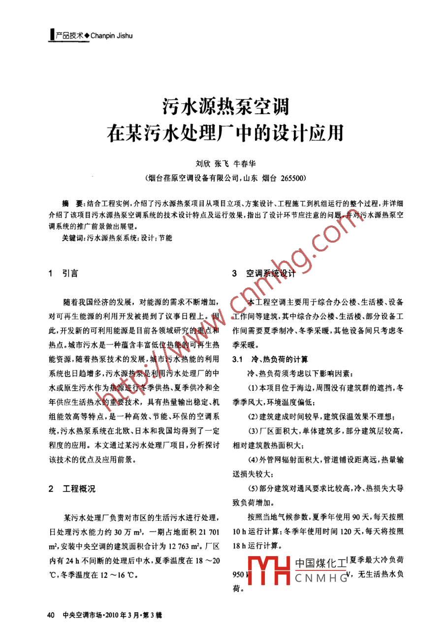 產(chǎn)品技術(shù)◆Chanpin Jishu污水源熱泵空調(diào)在某污水處理廠中的設(shè)計(jì)應(yīng)用劉欣張飛牛春華(煙臺(tái)荏原空調(diào)設(shè)備有限公司,山東煙臺(tái)265500)摘要:結(jié)合工程實(shí)例, 介紹了污水源熱泵項(xiàng)目從項(xiàng)目立項(xiàng)、方案設(shè)計(jì).工程施工到機(jī)組運(yùn)行的整個(gè)過程,并詳細(xì)介紹了該項(xiàng)目污水源熱泵空調(diào)系統(tǒng)的技術(shù)設(shè)計(jì)特點(diǎn)及運(yùn)行效果,指出了設(shè)計(jì)環(huán)節(jié)應(yīng)注意的問題,并對(duì)污水源熱泵空調(diào)系統(tǒng)的推廣前景做出展望。關(guān)鍵詞:污水源熱泵系統(tǒng):設(shè)計(jì):節(jié)能1引言3空調(diào)系統(tǒng)設(shè)計(jì)隨著我國(guó)經(jīng)濟(jì)的發(fā)展,對(duì)能源的需求不斷增加,本工程空調(diào)主要用于綜合辦公樓、生活樓、設(shè)備對(duì)可再生能源的利用開發(fā)被提到了議事日程上。因工作間等建筑, 其中綜合辦公樓、生活樓、部分設(shè)備工此,開發(fā)新的可利用能源是目前各領(lǐng)域研究的重點(diǎn)和作間需要夏季制冷、冬季采暖,其他設(shè)備間只考慮冬熱點(diǎn)。城市污水是- -種蘊(yùn)含豐富低位熱能的可再生熱季采暖。能資源,隨著熱泵技術(shù)的發(fā)展,城市污水熱能的利用3.1冷、熱負(fù)荷 的計(jì)算系統(tǒng)也日趨增多,污水源熱泵是利用污水處理廠的中冷、熱負(fù)荷須考慮以下影響因素:水或原生污水作為熱源進(jìn)行冬季供熱、夏季供冷和全(1)本項(xiàng)目位于海邊,周圍沒有建筑群的遮擋,冬年供應(yīng)生活熱水的重要技術(shù),具有熱量輸出穩(wěn)定、機(jī).季季風(fēng)大,環(huán)境溫度偏低;組能效高等特點(diǎn),是一種高效、節(jié)能、環(huán)保的空調(diào)系(2)建筑建成時(shí)間較早,建筑保溫效果不理想;統(tǒng),污水熱泵系統(tǒng)在北歐、日本和我國(guó)均得到了一定(3)廠區(qū)面積大,單體建筑多,部分建筑層較高,程度的應(yīng)用。本文通過某污水處理廠項(xiàng)目,分析探討相對(duì) 建筑散熱面積大;該技術(shù)的優(yōu)點(diǎn)及應(yīng)用前景。(4)外管網(wǎng)輻射面積大,管道鋪設(shè)距離遠(yuǎn),熱量輸送損失較大:2工程概況(5)部分建筑對(duì)通風(fēng)要求比較高,冷、熱損失大導(dǎo)致負(fù)荷增加。某污水處理廠負(fù)責(zé)對(duì)市區(qū)的生活污水進(jìn)行處理,按照當(dāng)?shù)貧夂騾?shù),夏季年使用90天,每天按照日處理污水能力約30萬m',- -期占地面積21 70110h運(yùn)行計(jì)算;冬季年使用時(shí)間120天,每天將按照m2,安裝中央空調(diào)的建筑面積合計(jì)為12 763 m'.廠區(qū)18h運(yùn)行計(jì)算。內(nèi)有24 h不間斷的處理后中水,夏季溫度在18 ~20中國(guó)煤化工夏季最大冷負(fù)荷C,冬季溫度在12~16 C.950 I.MYHCNMHG"無生活熱水負(fù)荷。40 中央空調(diào)市場(chǎng).2010年3月.第3輯Chanpin Jishu◆產(chǎn)品技術(shù)3.2 熱源水情況3.4空調(diào)水系統(tǒng)熱源水類型:城市污水(中水);本工程共2套水系統(tǒng):空調(diào)水循環(huán)系統(tǒng)、熱源水熱源水溫度:夏季溫度在18~20 C;循環(huán)系統(tǒng)。其中熱源水則是利用污水處理廠內(nèi)的中冬季下雪天現(xiàn)場(chǎng)測(cè)得污水在12~16C,基本判水,從中水干渠引一根管道到機(jī)房外沉淀池內(nèi),中水?dāng)酂嵩此衫?在沉淀池首先沉淀部分雜質(zhì),再由設(shè)置在沉淀池內(nèi)的熱源水質(zhì)分析:CI含量、全硬度值偏高,腐蝕性潛污泵加壓通過全自動(dòng)清污過濾器過濾掉剩余雜質(zhì)偏高,含少量絮狀雜質(zhì)(表I)。后,進(jìn)入主機(jī)蒸發(fā)器或冷凝器(通過冷、熱轉(zhuǎn)換閥切表1污水處理廠 中水檢驗(yàn)報(bào)告換),保證了熱泵機(jī)組運(yùn)行的穩(wěn)定性。檢驗(yàn)報(bào)告空調(diào)水循環(huán)系統(tǒng)管路在建筑物內(nèi)采品名:水樣用同程式設(shè)計(jì),外網(wǎng)管道采用帶護(hù)套的檢驗(yàn)項(xiàng)目溫度 PH電導(dǎo)率c全硬度鈣硬度 So? NH: Cu保溫管直埋方式,并在每個(gè)建筑物管道單位名稱us/cm %mg/lmg/1ppm ppm污水處理廠25 7.6 4040 0.095 6552<1 1入口處安裝平衡閥,有效的保證了水系結(jié)論Cr含量.全硬度值偏高,腐蝕性偏高,含少量絮狀雜質(zhì)統(tǒng)的平衡。備注為了滿足系統(tǒng)水壓恒定和補(bǔ)水需求,在機(jī)房?jī)?nèi)設(shè)置一套定壓補(bǔ)水系統(tǒng), 由定壓泵+定3.3 冷熱源設(shè)備選型及性能參數(shù)壓罐+軟化水箱+全自動(dòng)軟水器組成。圖1為機(jī)房考慮到本工程為市政投資的采暖系統(tǒng)改造重點(diǎn)系統(tǒng)流程圖。工程,其中重要污水處理設(shè)備有防凍要.求,為確保采暖系統(tǒng)穩(wěn)定可靠,在冬季采星兩0里所暖工況時(shí)至少要保證一臺(tái)機(jī)組能運(yùn)行,.里兩400o里師熱泵機(jī)組選用煙臺(tái)荏原生產(chǎn)的2臺(tái)螺桿rHS8W-1554U降膜式熱泵機(jī)組(型號(hào): RHSBW- 185HJ)時(shí)h滿負(fù)荷制冷量:688 kW/臺(tái)X2臺(tái)=1376 kW (中水溫 度20~27 C ,COP各腫水單建-H58有-185H為6.0)。滿負(fù)荷制熱量:729 kW/臺(tái)X2臺(tái)ege=1 458 kW (中水溫度12~6 C,COP為40立方上建雙定水道4.8)??梢钥吹较募局评鋾r(shí),利用中水作ID圖1 污水源熱泵空調(diào)機(jī)房系統(tǒng)流程圖為機(jī)組的冷卻水,COP值高于傳統(tǒng)的冷夏天閥門A開,閥門B關(guān);冬