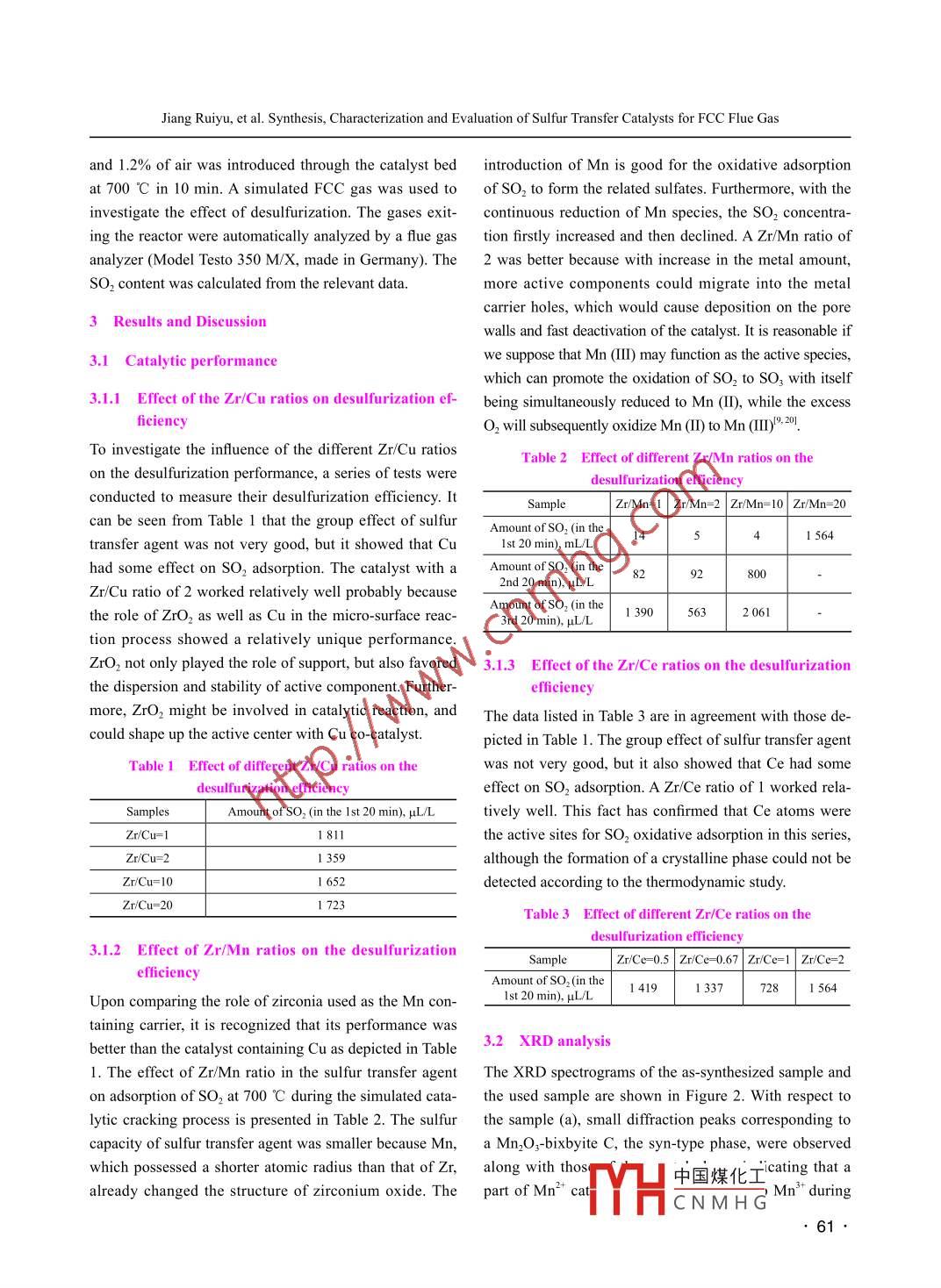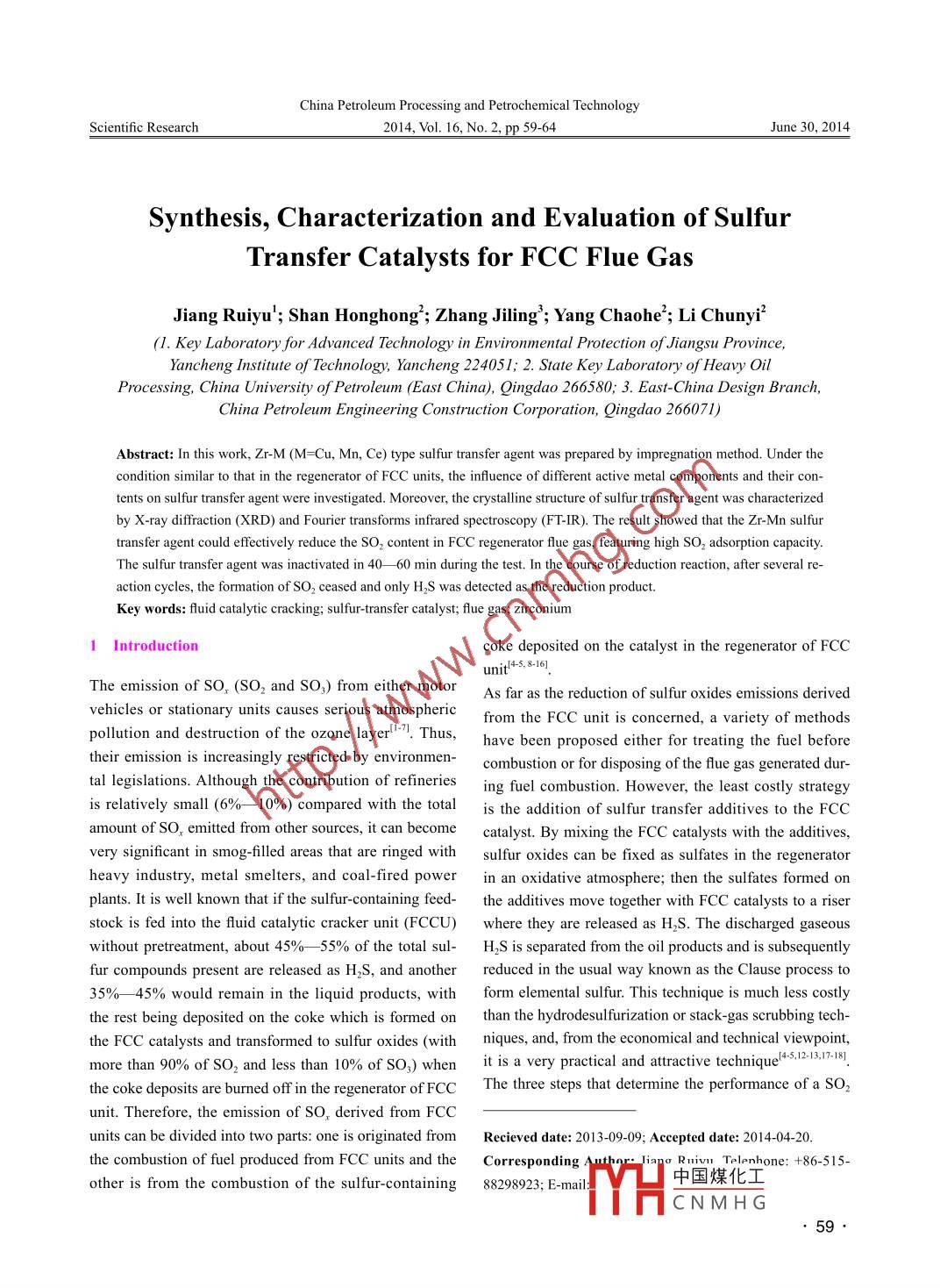 China Petroleum Processing and Petrochemical TechnologyScientific Research2014,Vol.16,No.2,p59-64June30.2014Synthesis, Characterization and Evaluation of SulfurTransfer Catalysts for FcC Flue GasJiang Ruiyu; Shan Honghong; Zhang Jiling; Yang Chaohe; Li Chunyi(1. Key Laboratory for Advanced Technology in Environmental Protection of Jiangsu Province,Proc ancheng Institute of Technology, Yancheng 224051; 2. State Key Laboratory of Heavy Oiling, China University of Petroleum (East China), Qingdao 266580 3 East-China Design branchChina Petroleum Engineering Construction Corporation, Qingdao 266071,Abstract: In this work, Zr-M(M=Cu, Mn, Ce)type sulfur transfer agent was prepared by impregnation method. Under thecondition similar to that in the regenerator of FCC units, the influence of different active metal components and their con-tents on sulfur transfer agent were investigated. Moreover, the crystalline structure of sulfur transfer agent was characterizedby X-ray diffraction(XRD)and Fourier transforms infrared spectroscopy (FT-IR). The result showed that the Zr-Mn sulfurtransfer agent could effectively reduce the SO2 content in FCC regenerator flue gas, featuring high SO2 adsorption capacityThe sulfur transfer agent was inactivated in 40-60 min during the test. In the course of reduction reaction, after several reaction cycles, the formation of SO, ceased and only h, s was detected as the reduction productKey words: fluid catalytic cracking; sulfur-transfer catalyst; flue gas; zirconium1 Introductioncoke deposited on the catalyst in the regenerator of FCCThe emission of So, (SO, and SO, )from either motor As far as the reduction of sulfur oxides emissions derivedvehicles or stationary units causes serious atmosphericfrom the fCC unit is concerned, a variety of methodspollution and destruction of the ozone layer-7.Thus, have been proposed either for treating the fuel beforetheir emission is increasingly restricted by environmen- combustion or for disposing of the flue gas generated durtal legislations. Although the contribution of refineries ing fuel combustion. However, the least costly strategyis relatively small (6%10%)compared with the total is the addition of sulfur transfer additives to the fccamount of SO, emitted from other sources, it can become catalyst. By mixing the FCC catalysts with the additives,very significant in smog-filled areas that are ringed with sulfur oxides can be fixed as sulfates in the regeneratorheavy industry, metal smelters, and coal-fired power in an oxidative atmosphere; then the sulfates formed onplants. It is well known that if the sulfur-containing feed- the additives move together with FCC catalysts to a riserstock is fed into the fluid catalytic cracker unit(FCCU) where they are released as H,S. The discharged gaseouswithout pretreatment, about 45%-55% of the total sul- H, S is sepm the ofur compounds present are released as H, S, and another reduced in the usual way known as the Clause process to35%45% would remain in the liquid products, with form elemental sulfur. This technique is much less costhe rest being deposited on the coke which is formed on than the hydrodesulfurization or stack-gas scrubbing techthe FCC catalysts and transformed to sulfur oxides(with niques, and, from the economical and technical viewpoint,more than 90% of So2 and less than 10%of So, )when it is a very practical and attractive technique 4-3, 12-13, 17-1I8Jthe coke deposits are burned off in the regenerator of FCc The three steps that determine the performance of a sozunit. Therefore, the emission of so. derived from Fccunits can be divided into two parts: one is originated from Recieved date: 2013-09-09; Accepted date: 2014-04-20the combustion of fuel produced from FCC units and the Correspondingano Ruivn Telenhone: +86-515other is from the combustion of the sulfur-containing 88298923 E-mail中國煤化工CNMHGChina Petroleum Processing and Petrochemical Technology2014,16(2):59-64transfer catalyst are shown below[ZrOCl2 8H2O] and ammonium hydroxide [Nd, H2O](1)Oxidation of SO 2 to SO3 in the FCC regenerator, typi- were used as starting materials to prepare catalysts. First-cally at a reaction temperature in the range of from 700C ly, two precursors were completely dissolved in distilledto730℃,SO2(g)+1/2O2(g)→SO(g)water at a ph value of between 9-10. The precipitate(2) Trapping of SO, on the catalyst to form sulfates, was formed and filtered, washed with distilled water, andMO(s)+SO(g)→MSO(s)soaked in ethanol for 36 h and then filtered. Then the fil-(3)Reduction of sulfates to release sulfur as H,s in Fcc ter cake was dried for 8 h to remove moisture at 120 Criser, typically at a reaction temperature in the range of 500C The dried solid was calcined in a muffle furnace for 2 h atto 530C, MSO4(S) +4H,(g)MO(s)+3H, O(g)+H,s(g)700C and then ground. The solid particles with a size ofMany efforts have been made to improve the activ- 80-120 mesh were collected through sievingity of SOx uptake catalysts. MgAlO-spinel or Mg/Al- 2.2 Preparation of ZrO, -M(M-Cu, Mn, Ce)HTLCs) have been attracting much attention because ZrO2-M catalysts were prepared by the impregnationthey offer a large capacity for adsorption of SO, Different method. Zirconia and metal nitrates were mixed in differmetallic oxides such as those of Ce, Cu. Co. V. Cr and Fe ent proportions. The solution was dried for 2 h to removeare incorporated into HTLCS either via impregnation or moisture from the solid material at 120 C. The dried catacoprecipitation, as the best way to prepare the solid solu- lyst was calcined in a muffle furnace for 2 h at 700Ctions of mixed oxides/spinels with both basic and redox 2.3 Characterization of samplesproperties required for good performance in the De-SOXprocess+-5, 10, 12-13,17, 19. Lately, Henriques/ 9, 6 and co-workAll samples were characterized by X-ray diffractioners demonstrated that Mg, Mn and Al-oxides with the(XRD)on a DANalytical X'Pert PROMPD spectrometricdiffractometer