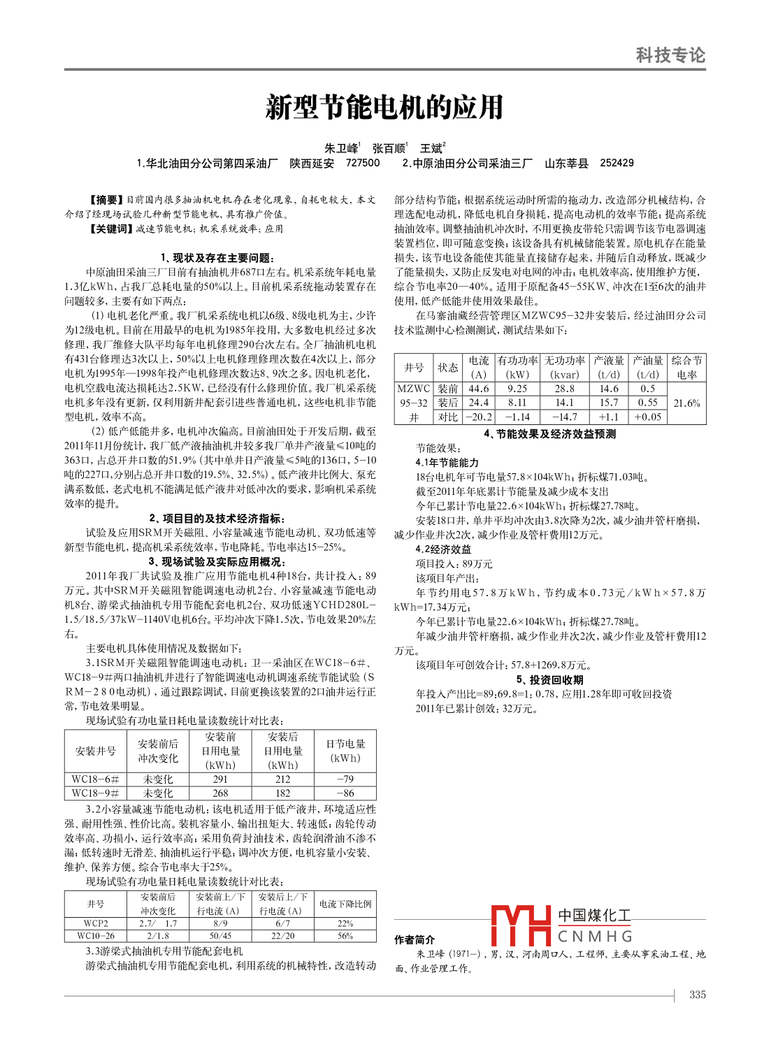 科技專論新型節(jié)能電機的應(yīng)用朱衛(wèi)峰張百順王斌1華北油田分公司第四采油廠陜西延安7275002中原油田分公司采油三廠山東莘縣252429【摘要】目前國內(nèi)很多抽油機電機存在老化現(xiàn)象,自耗電較大,本文部分結(jié)構(gòu)節(jié)能;根據(jù)系統(tǒng)運動時所需的拖動力,改造部分機械結(jié)構(gòu),合介紹了經(jīng)現(xiàn)場試驗幾種新型節(jié)能電機,具有推廣價值理選配電動機,降低電機自身損耗,提高電動機的效率節(jié)能;提高系統(tǒng)【關(guān)鍵詞】減速節(jié)能電機;機采系統(tǒng)效率;應(yīng)用抽油效率。調(diào)整抽油機沖次時,不用更換皮帶輪只需調(diào)節(jié)該節(jié)電器調(diào)速裝置檔位,即可隨意變換;該設(shè)備具有機椃儲能裝置。原電機存在能量1、現(xiàn)狀及存在主要問題:損失,該節(jié)電設(shè)備能使其能量直接儲存起來,并隨后自動釋放,既減少中原油田采油三廠目前有抽油機井687口左右。機采系統(tǒng)年耗電量了能量損失,又防止反發(fā)電對電網(wǎng)的沖擊;電機效率高,使用維護方便1.3億kWh,占我廠總耗電量的50%以上。目前機采系統(tǒng)拖動裝置存在綜合節(jié)電率20—40%。適用于原配備45-55KW、沖次在1至6次的油井問題較多,主要有如下兩點使用,低產(chǎn)低能井使用效果最佳(1)電機老化嚴重。我廠機采系統(tǒng)電機以6級、8級電機為主,少許在馬寨油藏經(jīng)營管理區(qū)MZWC95-32井安裝后,經(jīng)過油田分公為12級電機。目前在用最早的電機為1985年投用,大多數(shù)電機經(jīng)過多次技術(shù)監(jiān)測中心檢測測試,測試結(jié)果如下修理,我廠維修大隊平均每年電機修理290臺次左右。全廠抽油機電機有431臺修理達3次以上,50%以上電機修理修理次數(shù)在4次以上,部分電機為1995年—1998年投產(chǎn)電機修理次數(shù)達8、9次之多。因電機老化井號狀太電流有功功率無功功率產(chǎn)液量產(chǎn)油量綜合節(jié)(A)(kw)(kvar)(t/d)(td)電率電機空載電流達損耗達25KW,已經(jīng)沒有什么修理價值我廠機采系統(tǒng)MZWC裝前44.692528.814.60.5電機多年沒有更新,僅利用新井配套引進些普通電機,這些電機非節(jié)能95-32裝后244811415.70.55121.6%型電機,效率不高。井對比-20.2-114-14.7+1.1+0.0(2)低產(chǎn)低能井多,電機沖次偏高。目前油田處于開發(fā)后期,截至4、節(jié)能效果及經(jīng)濟效益預(yù)測2011年11月份統(tǒng)計,我廠低產(chǎn)液抽油機井較多我廠單井產(chǎn)液量≤10噸的節(jié)能效果63口,占總開井口數(shù)的51.9%(其中單井日產(chǎn)液量≤5噸的136口,5-104.1年節(jié)能能力噸的227口,分別占總開井口數(shù)的19.5%、32.5%)。低產(chǎn)液井比例大、泵充治電機年可節(jié)電量578×104kWh;折標煤71滿系數(shù)低,老式電機不能滿足低產(chǎn)液井對低沖次的要求,影響機采系統(tǒng)截至2011年年底累計節(jié)能量及減少成本支出效率的提升。年已累計節(jié)電量22,6×104kWh;折標煤27.78噸2、項目目的及技術(shù)經(jīng)濟指標安裝18口井,單井平均沖次由3.8次降為2次,減少油井管桿磨損,試驗及應(yīng)用SRM開關(guān)磁阻、小容量減速節(jié)能電動機、雙功低速等減少作業(yè)井次2次,減少作業(yè)及管桿費用1萬元新型節(jié)能電機,提高機采系統(tǒng)效率,節(jié)電降耗。節(jié)電率達15-25%4.2經(jīng)濟效益3、現(xiàn)場試驗及實際應(yīng)用概況項目投入:89萬元2011年我廠共試驗及推廣應(yīng)用節(jié)能電機4種18臺,共計投入:89該項目年產(chǎn)出萬元。其中SRM開關(guān)磁阻智能調(diào)速電動機2臺、小容量減速節(jié)能電動年節(jié)約用電57.8萬kWh,節(jié)約成本0.73元/kWh×57.8萬機8臺、游梁式抽油機專用節(jié)能配套電機2臺、雙功低速YCHD280L-kwh=17.34萬元1.5/18.5/37kW-1140V電機6臺。平均沖次下降1.5次,節(jié)電效果20%左今年已累計節(jié)電量22.6×104kWh;折標煤27.78噸年減少油井管桿磨損,減少作業(yè)井次2次,減少作業(yè)及管桿費用12主要電機具體使用情況及數(shù)據(jù)如下:萬3.1SRM開關(guān)磁阻智能調(diào)速電動機:衛(wèi)一采油區(qū)在WC18-6#該項目年可創(chuàng)效合計:57.8+1269.8萬元wC18-9#兩口抽油機井進行了智能調(diào)速電動機調(diào)速系統(tǒng)節(jié)能試驗(S5、投資回收期RM-280電動機),通過跟蹤調(diào)試,目前更換該裝置的2口油井運行正年投入產(chǎn)出比=89:69.8=1:0.78,應(yīng)用1.28年即可收回投資常,節(jié)電效果明顯2011年已累計創(chuàng)效:32萬元現(xiàn)場試驗有功電量日耗電量讀數(shù)統(tǒng)計對比表:安裝前裝后安裝井號安裝前后沖次變化日用電量日用電量節(jié)電量kWh)(kWh)(kWh)wC18-6#未變化291WC18-9#未變化863.2小容量減速節(jié)能電動機:該電機適用于低產(chǎn)液井,環(huán)境適應(yīng)性耐用性強、性價比高。裝機容量小、輸出扭矩大、轉(zhuǎn)速低;齒輪傳動效率高、功損小,運行效率高;采用負荷封油技術(shù),齒輪潤滑油不滲不漏;低轉(zhuǎn)速時無滑差、抽油機運行平穩(wěn);調(diào)沖次方便,電機容量小安裝、維護、保養(yǎng)方便。綜合節(jié)電率大于25%?,F(xiàn)場試驗有功電量日耗電量讀數(shù)統(tǒng)計對比表安裝前后裝前上/下安裝后上/下井號沖次變化行電流(A)行電流(8)/電流下降比例WCP2h中國煤化工wc10-26作者簡介CNMHG3.3游梁式抽油機專用節(jié)能配套電機朱衛(wèi)峰(1971-),男,漢,河南周