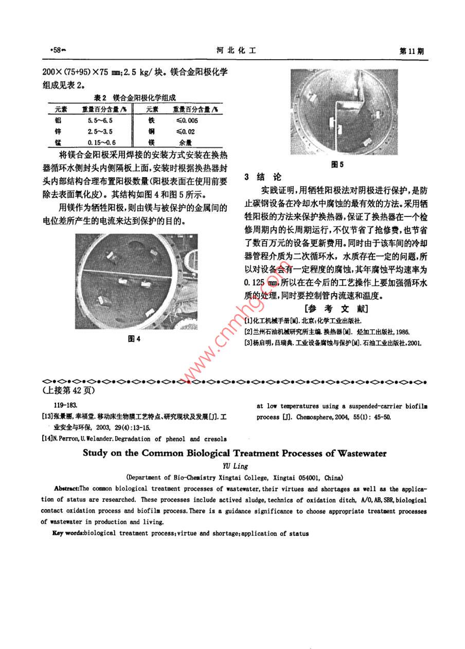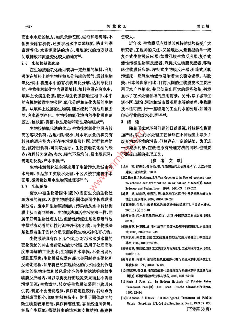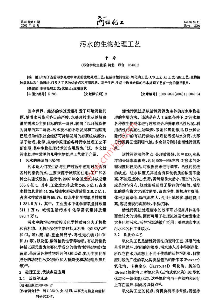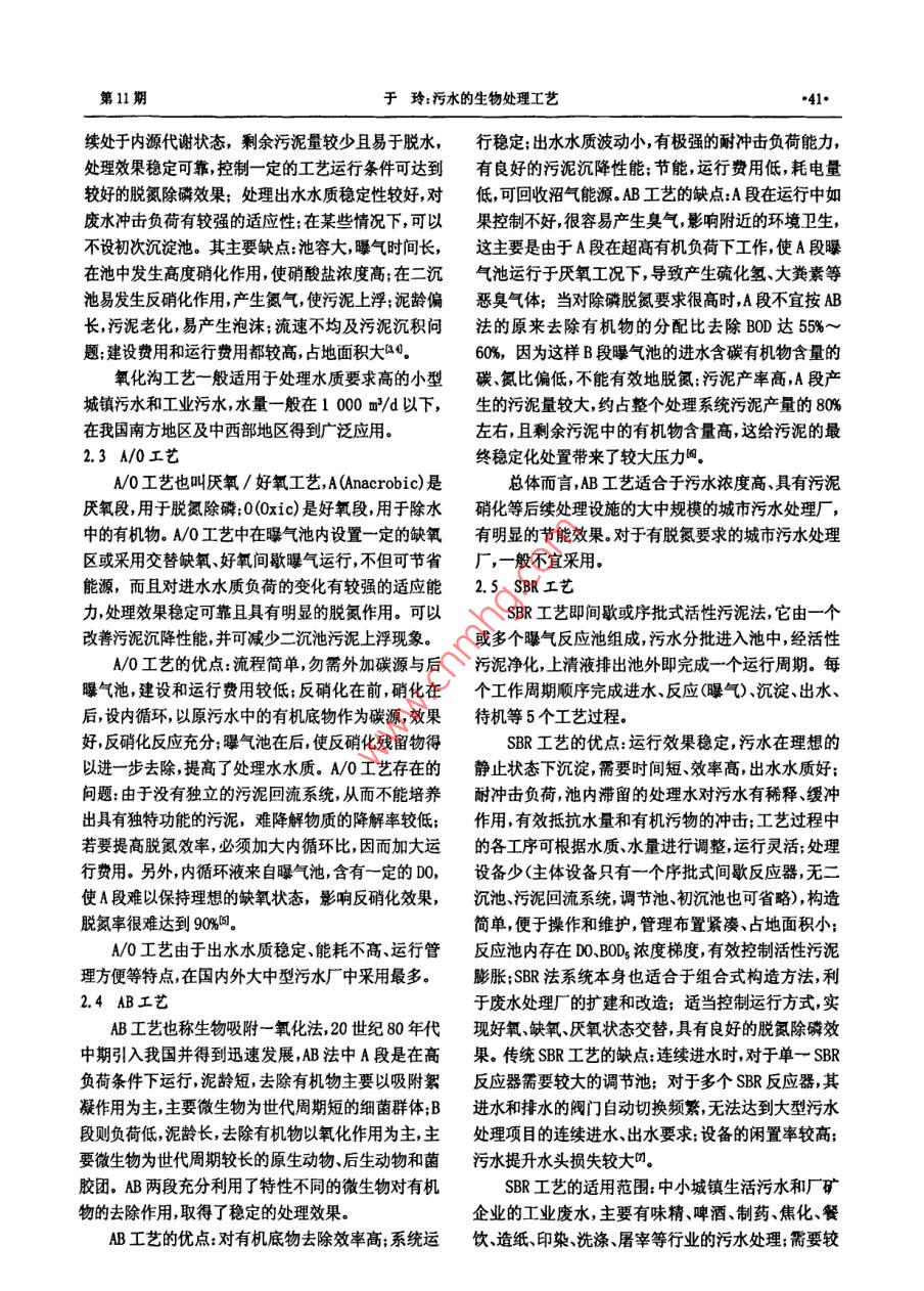 第32卷第11期2009年11月污水的生物處理工藝于玲(邢臺(tái)學(xué)院生化系河北邢臺(tái)054001)[摘要]介紹了當(dāng)前污水處理中常見(jiàn)的生物處理工藝包括活性污泥法氧化溝工藝、M0工藝AB工藝、SB工藝、生物接觸氧化法和生物膜法以及各工藝的優(yōu)缺點(diǎn)和應(yīng)用現(xiàn)狀對(duì)于生產(chǎn)生活中選擇合適的污水處理工藝有一定的指導(dǎo)意義[關(guān)鍵詞]生物處理工藝;優(yōu)缺點(diǎn);應(yīng)用現(xiàn)狀[中圖分類號(hào)]X703[文獻(xiàn)標(biāo)識(shí)碼]B[文章編號(hào)]1003-5095(2009)11-004004當(dāng)今世界,經(jīng)濟(jì)的快速發(fā)展引發(fā)了環(huán)境污染問(wèn)活性污泥法是以活性污泥為主體的廢水生物處題隨著水污染形勢(shì)日趨嚴(yán)峻,水處理技術(shù)從以解決理的主要方法。該法是在人工充氧條件下,對(duì)污水和量的需求為主要目標(biāo)的第一階段轉(zhuǎn)向了以環(huán)境保護(hù)各種微生物群體進(jìn)行連續(xù)混合培養(yǎng)形成活性污泥。利為背景的第二階段。污水技術(shù)的不斷發(fā)展和工程應(yīng)用用活性污泥的生物凝聚、吸附和氧化作用,以分解去已經(jīng)成為維系社會(huì)經(jīng)濟(jì)可持續(xù)發(fā)展的必要組成部分。除污水中的有機(jī)污染物然后使污泥與水分離大部基于物理、化學(xué)、生物學(xué)原理的各種污水處理工藝不分污泥再回流到曝氣池,多余部分則排出活性污泥系斷出現(xiàn),其中生物處理技術(shù)的應(yīng)用最為廣泛。本文就統(tǒng)污水處理中常見(jiàn)的幾種生物處理工藝做了介紹活性污泥法的優(yōu)點(diǎn):處理效果好,其中BOD5和懸1污水的來(lái)源與污染物浮物去除率都很高,達(dá)到90%~95%左右;對(duì)廢水的處污水是人們?cè)谏钆c生產(chǎn)過(guò)程中使用過(guò)的含有理程度比較靈活,可根據(jù)要求進(jìn)行調(diào)節(jié)?;钚晕勰喾ǜ鞣N污染物的水主要來(lái)源于城鎮(zhèn)的住宅工廠和各的缺點(diǎn):進(jìn)水濃度尤其是含有抑制物質(zhì)的濃度不能種公共建筑設(shè)施。據(jù)統(tǒng)計(jì),2007年全國(guó)廢水排放總量高,不能適應(yīng)沖擊負(fù)荷;需氧量前大后小,而空氣的供5568億t。其中工業(yè)廢水排放量2466億t,占廢應(yīng)是均勻分布,這就形成前段無(wú)足夠的溶解氧,后段水排放總量的44.3%;城鎮(zhèn)生活污水排放量310.2億t,氧的供應(yīng)將大大超過(guò)需要,造成浪費(fèi)、增加動(dòng)力費(fèi)用;占廢水排放總量的557%。廢水中化學(xué)需氧量排放量體積負(fù)荷率低、曝氣池龐大、占用土地較多基建費(fèi)用1381.8萬(wàn)t。其中,工業(yè)廢水中化學(xué)需氧量排放量高;容易出現(xiàn)污泥膨脹,不易沉降511.1萬(wàn)t,城鎮(zhèn)生活污水中化學(xué)需氧量排放量活性污泥法處理廢水的效率可以根據(jù)具體條件870.7萬(wàn)t而做較大的調(diào)整因而可用于處理流速及濃度發(fā)生較污水中的污染物質(zhì)按其化學(xué)性質(zhì)可分為無(wú)機(jī)物大變化的污水?;钚晕勰喾ū粡V泛用于處理城市生活和有機(jī)物。無(wú)機(jī)污染物主要包括無(wú)機(jī)鹽(如S02S污水和各種工業(yè)廢水。和Cl2等)酸、堿、重金屬離子、毒性無(wú)機(jī)物(如CN2.2氧化溝工藝和As等),以及氮、磷等植物性營(yíng)養(yǎng)物質(zhì)。有機(jī)污染物氧化溝工藝是活性污泥法的變種工藝其曝氣池包括以碳元素為主要化學(xué)成分的植物性污染物質(zhì)(如呈首尾循環(huán)、封閉的溝渠型,污水滲入其中得到凈化蔬菜、果皮及各種植物碎片等)和以碳氮為主要化學(xué)所以它在水力流態(tài)上不同于傳統(tǒng)的活性污泥法。目前成分的動(dòng)物性污染物質(zhì)如人畜糞便和動(dòng)物組織碎片應(yīng)用較為廣泛的氧化溝類型包括帕斯韋爾 (Pasveer)竺)氧化溝、卡魯塞爾( Carrousel)氧化溝、奧爾伯2處理工藝、優(yōu)缺點(diǎn)及應(yīng)用(rba)氧化溝T型氧化溝(三溝式氧化溝)、DE型氧2.1活性污泥法化溝和一體化氧化溝。這些氧化溝由于在結(jié)構(gòu)和運(yùn)行[收稿日期]200906-17上存在差異因此各具特點(diǎn)。[作者簡(jiǎn)介]于玲(1983-),女,講師從事光電信息功能材氧化溝工藝的優(yōu)點(diǎn):有機(jī)負(fù)荷率非常低,污泥持料研究工作。第11期于玲:污水的生物處理工藝41·續(xù)處于內(nèi)源代謝狀態(tài),剩余污泥量較少且易于脫水,行穩(wěn)定;出水水質(zhì)波動(dòng)小,有極強(qiáng)的耐沖擊負(fù)荷能力處理效果穩(wěn)定可靠控制一定的工藝運(yùn)行條件可達(dá)到有良好的污泥沉降性能;節(jié)能,運(yùn)行費(fèi)用低,耗電量較好的脫氮除磷效果;處理出水水質(zhì)穩(wěn)定性較好,對(duì)低,可回收沼氣能源。AB工藝的缺點(diǎn):A段在運(yùn)行中如廢水沖擊負(fù)荷有較強(qiáng)的適應(yīng)性;在某些情況下,可以果控制不好很容易產(chǎn)生臭氣影響附近的環(huán)境衛(wèi)生,不設(shè)初次沉淀池。其主要缺點(diǎn):池容大曝氣時(shí)間長(zhǎng),這主要是由于A段在超高有機(jī)負(fù)荷下工作,使A段曝在池中發(fā)生高度硝化作用,使硝酸鹽濃度高;在二沉氣池運(yùn)行于厭氧工況下,導(dǎo)致產(chǎn)生硫化氫、大糞素等池易發(fā)生反硝化作用,產(chǎn)生氮?dú)?使污泥上浮;泥齡偏惡臭氣體;當(dāng)對(duì)除磷脫氮要求很高時(shí),A段不宜按AB長(zhǎng),污泥老化,