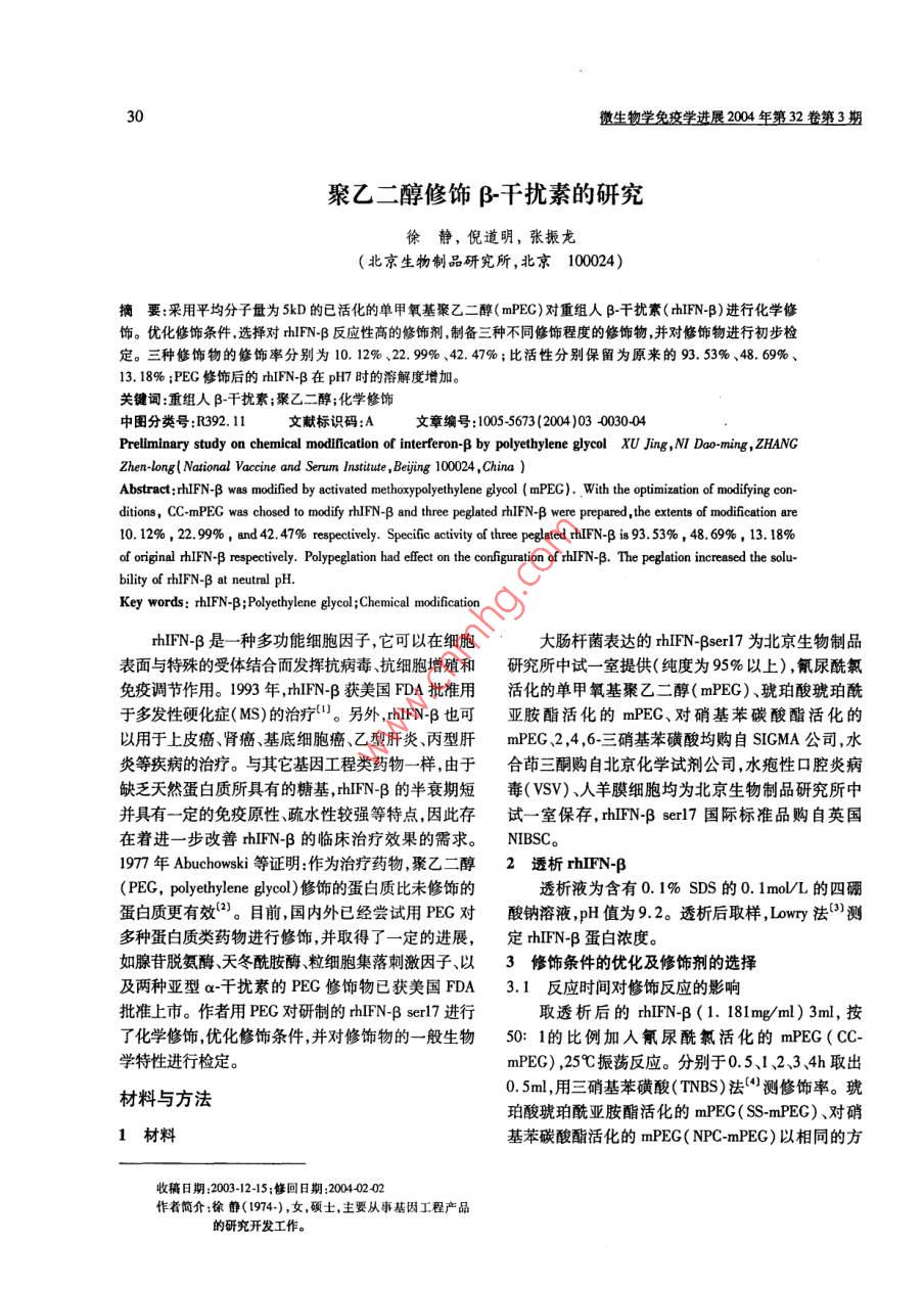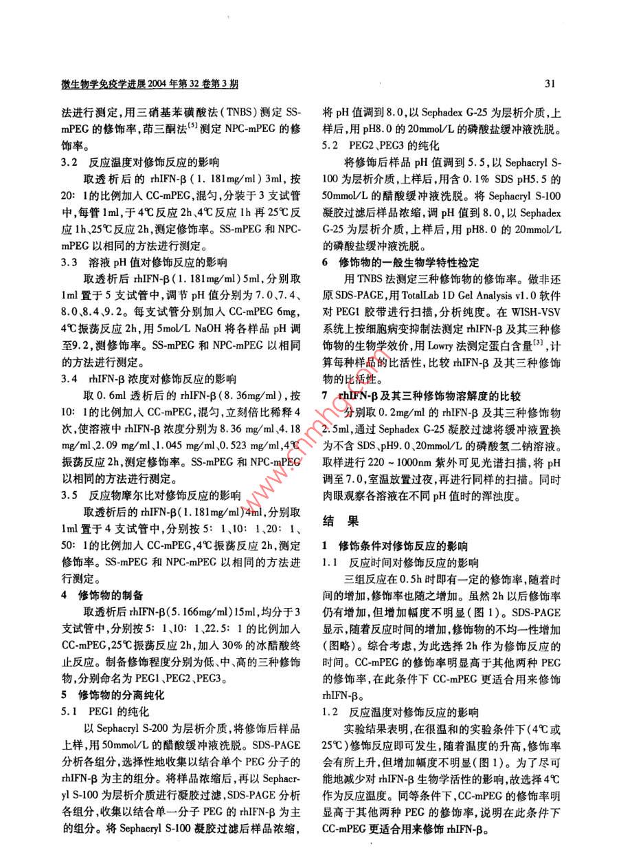 微生物學(xué)兔疫學(xué)進(jìn)展2004年第32卷第3期聚乙二醇修飾β千擾素的研究徐靜,倪道明,張振龍(北京生物制品研究所,北京100024)摘要:采用平均分子量為5kD的已活化的單甲氧基聚乙二醇(mPEC)對(duì)重組人β干擾素( rhIFN-B)進(jìn)行化學(xué)修飾。優(yōu)化修飾條件選擇對(duì)血hIFNβ反應(yīng)性高的修飾劑制備三種不同修飾程度的修飾物,并對(duì)修飾物進(jìn)行初步檢定。三種修飾物的修飾率分別為10.12%、22.99%、42.47%;比活性分別保留為原來(lái)的93.53%、48.69%、13.18%;PEG修飾后的 rhIFNβ在pH7時(shí)的溶解度增加關(guān)鍵詞:重組人β-干擾素;聚乙二醇;化學(xué)修飾中圖分類號(hào):R392.11文獻(xiàn)標(biāo)識(shí)碼:A文章編號(hào):10055673(2004)03000404Preliminary study on chemical modification of interferon-B by polyethylene glycol XU Jing, NI Dao-ming, ZHANGZhen-long( National Vaccine and Serum Institute, Beijing 100024, ChinaAbstract: rhIFN-B was modified by activated methoxypolyethylene glycol( mPEG). With the optimization of modifying con-ditions, CC-mPEG was chosed to modify rhIFN-B and three peglated rhlFN-B were prepared, the extents of modification are10. 12%,22.99%, and 42. 47% respectively. Specific activity of three peglated rhIFN-B is 93. 53%, 48. 69%, 13.18%of original hIFN-B respectively. Polypeglation had effect on the configuration of rhIFN-B. The peglation increased the solubility of rhIFN-B at neutral pH.Key words: rhIFN-B: Polyethylene glycol; Chemical modificationhFNβ是一種多功能細(xì)胞因子,它可以在細(xì)胞大腸桿菌表達(dá)的 rhIFN-Bserl7為北京生物制品表面與特殊的受體結(jié)合而發(fā)揮抗病毒、抗細(xì)胞增殖和研究所中試一室提供(純度為95%以上),氰尿酰氯免疫調(diào)節(jié)作用。1993年,hFN-B獲美國(guó)FDA批準(zhǔn)用活化的單甲氧基聚乙二醇(mPEC)、琥珀酸琥珀酰于多發(fā)性硬化癥(MS)的治療。另外hFNB也可亞胺酯活化的mPEG、對(duì)硝基苯碳酸酯活化的以用于上皮癌、腎癌、基底細(xì)胞癌、乙型肝炎、丙型肝mPEG2,4,6-三硝基苯磺酸均購(gòu)自SGMA公司,水炎等疾病的治療。與其它基因工程類藥物一樣,由于合茚三酮購(gòu)自北京化學(xué)試劑公司,水皰性口腔炎病缺乏天然蛋白質(zhì)所具有的糖基hFNB的半衰期短毒(ⅤsV)、人羊膜細(xì)胞均為北京生物制品研究所中并具有一定的免疫原性疏水性較強(qiáng)等特點(diǎn)因此存試一室保存, rhIFN-B ser17國(guó)際標(biāo)準(zhǔn)品購(gòu)自英國(guó)在著進(jìn)一步改善thNB的臨床治療效果的需求。NBSC1977年 Abuchowski等證明:作為治療藥物聚乙二醇2透析 rhIFN-B(PEG, polyethylene glycol)修飾的蛋白質(zhì)比未修飾的透析液為含有0.1%SDs的0.1mo/L的四硼蛋白質(zhì)更有效。目前國(guó)內(nèi)外已經(jīng)嘗試用PG對(duì)酸鈉溶液pH值為92。透析后取樣,Lowy法測(cè)多種蛋白質(zhì)類藥物進(jìn)行修飾,并取得了一定的進(jìn)展,定 rhIFN-B蛋白濃度如腺苷脫氨酶、天冬酰胺酶、粒細(xì)胞集落刺激因子、以3修飾條件的優(yōu)化及修飾劑的選擇及兩種亞型a-千擾素的PEG修飾物已獲美國(guó)FDA3.1反應(yīng)時(shí)間對(duì)修飾反應(yīng)的影響批準(zhǔn)上市。作者用PEG對(duì)研制的 rhIFN-B serl7進(jìn)行取透析后的 rhIFN-B(1.18lmg/ml)3ml,按了化學(xué)修飾優(yōu)化修飾條件,并對(duì)修飾物的一般生物50:1的比例加入氰尿酰氯活化的mPEG(CC學(xué)特性進(jìn)行檢定。mPEG),25℃振蕩反應(yīng)。分別于0.5、1234h取出材料與方法0.5ml,用三硝基苯磺酸(TNBS)法{測(cè)修飾率。琥珀酸琥珀酰亞胺酯活化的mPEC(Ss-mPEC)、對(duì)硝材料基苯碳酸酯活化的mPEG( NPC-mPEG)以相同的方收稿日期:2003-1215;修回日期:20040202作者簡(jiǎn)介:徐靜(1974),女,碩士,主要從事基因工程產(chǎn)品的研究開發(fā)工作。微生物學(xué)免疫學(xué)進(jìn)展2004年第32卷第3期法進(jìn)行測(cè)定,用三硝基苯磺酸法(TNBS)測(cè)定SS-將pH值調(diào)到8.0,以 Sephadex G25為層析介質(zhì),上mPEG的修飾率,茚三酮法(測(cè)定 NPC-mPEG的修樣后,用pH8.0的20mmo/L的磷酸鹽緩沖液洗飾率52PEG2、PEC3的純化3.2反應(yīng)溫度對(duì)修飾反應(yīng)的影響將修飾后樣品pH值調(diào)到5.5,以 Sephacryl S-取透析后的 rhIFN-B(1.18lmg/ml)3ml,按100為層析介質(zhì),上樣后,用含0.1% SDS pH5.5的20:1的比例加入 CC-mPEG,混勻,分裝于3支試管50mmo/L的醋酸緩沖液洗脫。將 Sephacryl S-00中,每管lml,于4℃反應(yīng)2h4℃反應(yīng)Ih再25℃反凝膠過(guò)濾后樣品濃縮,調(diào)pH值到8.0,以 Sephadex應(yīng)1h、25℃反應(yīng)2h,測(cè)定修飾率。 SS-mPEG和NPCG25為層析介質(zhì),上樣后,用pH8.0的20mmo/LmPEC以相同的方法進(jìn)行測(cè)定。的磷酸鹽緩沖液洗脫。33溶液pH值對(duì)修飾反應(yīng)的影響6修飾物的一般生物學(xué)特性檢定取透析后 rhIFN-P(1.18lmg/ml)5ml,分別取用TNBs法測(cè)定三種修飾物的修飾率。做非還lml置于5支試管中,調(diào)節(jié)pH值分別為7.074、原 SDS-PAGE,用 TotalLab1 D Gel analysis vI.0軟件8.084、9.2。每支試管分別加入 CC-mPEG6mg,對(duì)PEG1膠帶進(jìn)行掃描,分析純度。在 WISH-VSV4℃振蕩反應(yīng)2h,用5mo/ L NaOH將各樣品pH調(diào)系統(tǒng)上按細(xì)胞病變抑制法測(cè)定hFNB及其三種修至92,測(cè)修飾率。 SS-mPEG和 NPC-mPEG以相同飾物的生物學(xué)效價(jià)用Lowy法測(cè)定蛋白含量(3,計(jì)的方法進(jìn)行測(cè)定。算每種樣品的比活性,比較hFNB及其三種修飾34 rhIFN-B濃度對(duì)修飾反應(yīng)的影響物