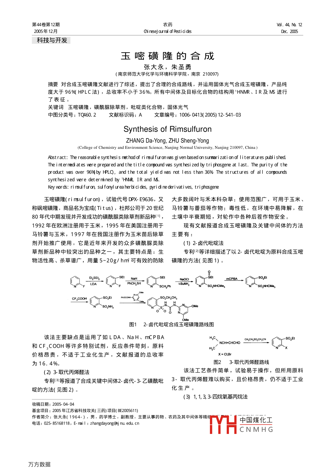 第44卷第12期農藥Vdl. 44, No 12_2005年12月Chi nese} aurnel of PEstici desDec. 2005科技與開發(fā)玉嘧磺隆的合成張大永,朱圣勇(南京師范大學化學與環(huán)境科學學院,南京210097)摘要對合成玉嘧磺隆文獻進行了綜述,提出了合理的合成路線,并運用固體光氣合成玉嘧磺隆,產品純度大于96%( HPLC法),總收率不小于36%。所有中間體及目標化合物的結構用1HNMR、IR及MS進行了表征。關鍵詞玉嘧磺隆,磺酰脲除草劑,吡啶類化合物,固體光氣中圖分類號: TQ460. 2文獻標識碼: A文章編號: 1006- 0413( 2005) 12- 541- 03Synthesis of RimsulfuronZHANG Da-Yong, ZHU Sheng-Yong(College of Chemistry and Environment Science, Nanjing Normal University, Nanjing 210097, China )Abst ract: The reasonabl e synt hesi s nethod of ri nsul furonvas gi ven based onsunmari zati onof literatures publ ished.The internedi ates vere prepared and the titI e conpound Vas synthesi zed by tri phosgene at |ast. The purityof the .product VaS over 96%by HPLQ, andthe total yieldves not less than 36% The structures of all conpoundssynthesi zed vwere deternined by 1HNR, IR and Ms.Key vor ds: ri rsul furon, sul fonyl urea herbi ci des, pyri di ne deri vatives, tri phosgene玉嘧磺隆( rinsul furon),試驗代號DPX- E9636,又大 多數闊葉與禾本科雜草;使用范圍廣,可用于玉米、稱砜嘧磺隆,商品名為寶成(Titus),杜邦公司于20世紀馬鈴薯 與番茄等作物;毒性低,在環(huán)境中易降解,在80年代中期發(fā)現(xiàn)并開發(fā)成功的磺酰脲類除草劑新品種1,土壤中半衰期短,對輪作中各種后茬作物安全。1992年在歐洲注冊用于玉米,1995年在美國注冊用于現(xiàn)有文獻報道合成玉嘧磺隆及關鍵中間體的方法馬鈴薯與玉米,1997 年在我國注冊作為玉米苗后除草主要有 :劑開始推廣使用。它是近年來開發(fā)的眾多磺酰脲類除(1) 2-鹵代吡啶法草劑新品種中較突出的品種之一,其主要特點是:生專利21等詳細描述了以2-鹵代吡啶為原料合成玉嘧物活性高、殺草譜廣,用量5~20g/ hmf可有效的防除磺隆的方法( 見圖1)。ELSELS,-SEI_ NaHr -SESEtmCPBA.個r SO.EtPhCH,SHLDSCH所SO.NHCMe,> SO,NtCMe,CF,COOH-SO,Et.so,CH.CH,-OMe圖1 2- 鹵代吡啶合成玉嘧磺隆路線圖該法主要缺點是運用了如LDA、NaH、mCP BACH,CH.SO.CH.CNSO2Et, NCH=CHCHO和CF COOH等許多特別試劑,反應條件苛刻,原料價格昂貴,不適于工業(yè)化生產,文獻報道的總收率X=CLB為16. 4%。圖2 3- 取代丙烯醛路線(2) 3- 取代丙烯醛法該法工藝條件簡單,試驗易于操作,但所用原料專利3等報道了合成關鍵中間體2-鹵代-3-乙磺酰吡3- 取代丙烯醛難以購買,且價格昂貴,仍不適于工業(yè)啶的方法(見圖2)。化生產。(3) 1, 1, 3, 3-四烷氧基丙烷法收稿日期: 2005- 04- 04基金項目: 205年江蘇省科技攻關(三藥)項目( BE2005611)作者簡介:張大永( 1964-),男,藥學博士,副教授,主要從事藥物、農藥及其中間體等精中國煤化工電話: 025- 85168118, E- nail : zhangdayong@j nu. edu. cnTYHCNMH G.542農藥hinseJarnel df Pestidids第44卷此法事實上是方法2的改進,運用1, 1,3,3-四烷氧之間。 但所用原料易得,價格合理,且工藝條件簡基丙烷在酸性條件下脫去1個烷氧基得到3-烷氧基取代單, 適宜于工業(yè)化生產。丙烯醛的縮醛,再與乙磺酰乙腈進行閉環(huán)反應得到中文獻報道[4由3-乙磺酰- 2-吡啶磺酰胺合成玉嘧磺隆間體(見圖3)。的方法大多數采用氣體光氣進行,此法有環(huán)境污染HO、,OCHs (CH.CO)0SO,Et大、氣體光氣不易計量等多種缺點。固體光氣正逐漸CHCHC0CHs EtSO,CH2CNcH,oCNHAC/HXCH20'代替?zhèn)鹘y(tǒng)的氣體光氣法合成磺酰脲類除草劑[5],本文給出了詳細合成方法。圖3 1, 1, 3, 3-四烷氧基丙烷路線根據文獻調研和實際試驗驗證,我們提出合成玉文獻[4 6]報道的這一步收率高低不等, 在39%~89%嘧磺隆的合理合成途徑(見圖4)。CHO、,0CHs._ CH.CH.SO.CHCNcH,o)CH ICH.co)o CH o- ”-OM圖4玉嘧磺隆的合理 合成路線此法不需使用如LDA、NaH、mCPBA和CF COOH 202 ([M4H*, base peak)。等許多特別試劑,反應溫度0°C~140°C,不需要高壓,1.2.2 2- 氯3-乙磺酰吡啶的合成所用原料全部國產化,反應總收率不小于36 %。在冰水浴中,向燒瓶中加入200ml 95%乙醇, 開1試驗部分動攪拌,通入氯化氫氣體至飽和。保持小于15 °C,滴入上一步棕紅色粘稠液體,放置室溫繼續(xù)攪拌4h,得1.1儀器與試劑'HMR用Br icker Am 500型核磁共振儀測定( TMS到深棕紅色溶液。改成蒸餾裝置,水泵減壓抽干氯化為內標) ; IR用Br icker IF- 48型和島津- 440型傅里葉氫氣體后,再減壓蒸除乙醇和低沸點液體。趁熱加入.變換紅外光譜儀測定; M6采用Nicolet 2000 型傅里乙酸乙酯提取,飽和碳酸氫鈉洗滌至堿性,干燥,減葉變換質譜儀,ESI分析方法;熔點采用TX- 6型雙壓蒸干溶劑,得到淺棕紅色粘稠液體129g,純度97%,目鏡顯微熔點儀測定,北京泰克儀器有限公司生收率82% 1HMRK( D acetone, pprn, : 1.26~ 1. 28(t, 3H-產,溫度計未校準。1, 1, 3, 3-四甲氧基丙烷(四甲)、aHqy), 3.55-3. 60(q 2H-CH), 7. 73-8.73(m3H pyridine) ;IR乙磺酰乙腈(砜氰)、2-氨基-4,6-二甲氧基嘧啶和固體(KBr, cm) : 3106, 3089( C=G H, 2990, 2853( CH, 1589, 1482,光氣均由實驗室自制或合作單位提供,其它試劑均1440( pyri di ne), 133,3 1321, 1134( sQ), 1009, 832, 635 N&( ESI(+), 70V, mz) : 207([MH;, base peak)。為國產分析純或化學純。1.2.3 2- 巰基3-乙磺酰吡啶[4的合成1.2中間體及目標化合物的合成將25. 4g( 0.46nol )硫化鈉4. 25g( 0. 13nol )升華硫和500h1.2. 12- 乙磺酰- 5-甲氧基-2, 4戊二烯腈'"的合成水加入到盛有2-氯- 3-乙磺酰吡啶[422g( 0.11nol )的燒瓶中,向反應器中加入1, 1,3, 3-