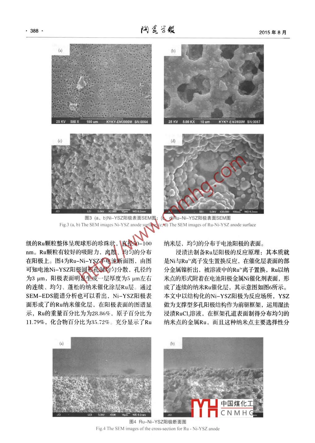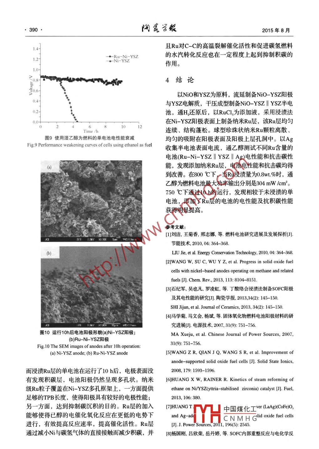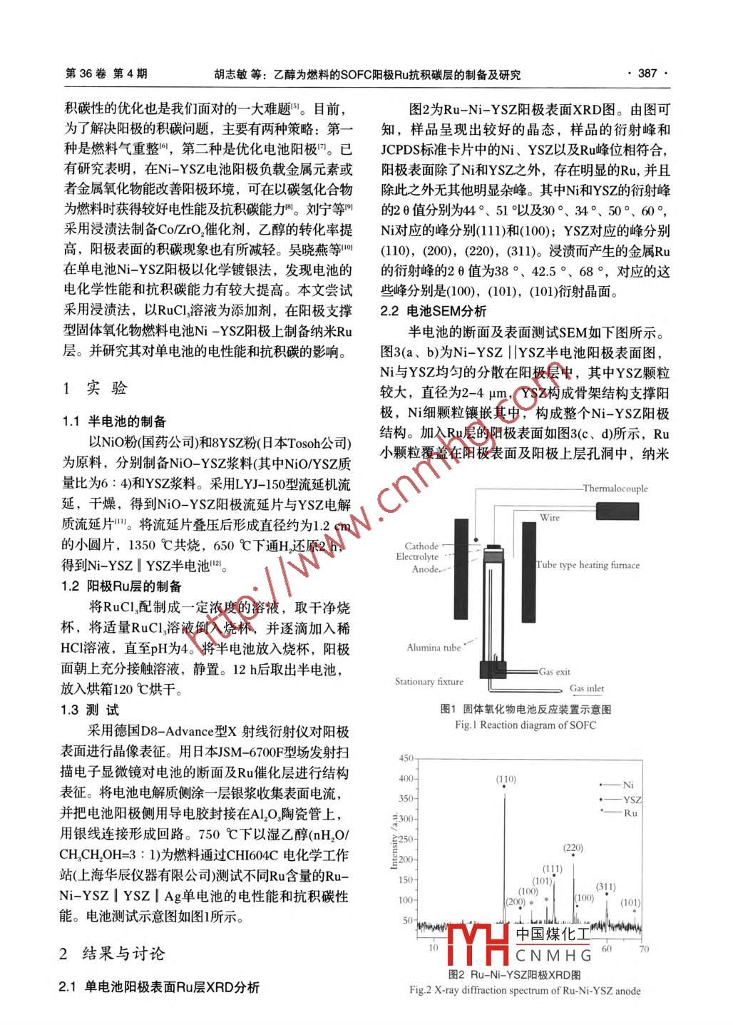 第36卷第4期2015年8月Journal of ceramicsAug.2015DOI:10.13957 cnki, tcxo2015.04.01l乙醇為燃料的SOFC陽(yáng)極Ru抗積碳層的制備及研究胡志敏,羅凌虹,孫良良,吳也凡,石繼軍,程亮,余輝(景德鎮(zhèn)陶瓷學(xué)院,江西景德鎮(zhèn)333001擴(kuò)要:采用浸漬法,在陽(yáng)極支撐型固體氧化物燃料電池N/YSZ陽(yáng)極上制備納米R(shí)u層。并研究不同Ru浸漬量對(duì)單電池的電性能的影響。實(shí)驗(yàn)結(jié)果表明:采用化學(xué)浸漬法能成功制備顯微結(jié)構(gòu)良好的Ru催化層,納米級(jí)珍珠狀的Ru顆粒均勻的分散于N-YSz陽(yáng)極材料表面。以乙醇蒸汽( nHO/CH CH OH=3:1)為燃料,800℃的測(cè)試溫度下,浸漬了08wt%Ru的Ru-N-YSZYZAg單電池獲得最大功率密度可達(dá)304mWem,即Ru層的添加可以提高單電池的電性能。通過(guò)10h的運(yùn)行,顯示添加了Ru層的電池的電性能及抗積碳性能獲得明顯提高。關(guān)鍵詞:固體氧化物燃料電池;NO-YSZ;陽(yáng)極;Ru中圖分類號(hào):TQ174.75文獻(xiàn)標(biāo)志碼:A文章編號(hào):10002278(2015)04-0386-06Preparation and Research on Anode of Anti-Carbon Deposition for SOFCUsing ethanol as fuelHU Zhimin, LUO Linghong, SUN Liangliang, WU Yefan, SHI Jijun, CHEN Liang, YU Hui(Jingdezhen Ceramic Institute, Jingdezhen 333001, Jiangxi, China)Abstract: A nano Ru catalytic layer on the Ni-YSZ anode-supported solid oxide fuel cell was obtained by impregnation method. Theinfluences of different Ru content on the electrical properties of a single cell were studied by SEM, EDS and the electrochemical workstation.The research result revealed that a functional nano Ru catalytic layer was gotten on Ni-YSZ anode by impregnation method. The pear-likenano Ru particles were uniformly dispersed on the surface of Ni-YSZ anode materials. With 0.8 wt. Ru impregnated in ethanol(nH,O/CH, CH,OH-3: 1)fuel at 800C, the electrical performance of Ru-Ni-YSZ YSZ Ag single cell was 304mW /cm. The 10 hours'running testshowed the electro catalytic activity and anti-carbon deposition of the cell obviously improvedKey words: SOFC; NiO-YSZ; Anode; Ru0引言的增高而呈線性遞增。如果將電導(dǎo)率和熱膨脹性綜合考慮,40-60%的N,既可保持陽(yáng)極的電子電固體氧化物燃料電池(SOFC)是新發(fā)展起來(lái)的導(dǎo)率,又可降低與其它組元件熱膨脹系數(shù)的失配類燃料電池,它除了具備傳統(tǒng)燃料電池的高效率叩。在N-YSz陽(yáng)極結(jié)構(gòu)中,YSZ起骨架的作用,率、低污染等優(yōu)點(diǎn)之外,還具有其本身獨(dú)有的特N顆粒均勻地分布于YSZ構(gòu)建的網(wǎng)絡(luò)結(jié)構(gòu)中,這種點(diǎn),比如燃料適應(yīng)性廣、能量轉(zhuǎn)化率高等"。在結(jié)構(gòu)大大增加了三相界面區(qū)域,從而提高了電池的能源問(wèn)題日趨緊張的今天,SOFC的研究受到世界性能"。然而鎳基陽(yáng)極有一個(gè)致命的缺點(diǎn),即表面各國(guó)的高度重視。陽(yáng)極是SOFC的核心材料之容易發(fā)生積碳現(xiàn)象,以乙醇、CH等其他碳?xì)浠详?yáng)極材料的優(yōu)劣性會(huì)直接影響到SOFC的整體性物為燃料氣時(shí),在高溫下Ni會(huì)催化斷裂燃料氣中碳能2。氫化合物的C-H鍵,使電池陽(yáng)極產(chǎn)生積碳,這將使目前,在SOFC中應(yīng)用最為廣泛的是Ni-YSZ得電池在運(yùn)行過(guò)程中催化活性大大降低甚至停止運(yùn)陽(yáng)極。研究表明,Ni-YSZ的熱膨脹系數(shù)隨N含量行。因此,在研究提高陽(yáng)極催化活性的同時(shí),其抗收稿日期:2015-03-25。修訂日期:201504-29。Received date中國(guó)煤化工e:053基金項(xiàng)日:國(guó)家自然科學(xué)基金資助(項(xiàng)目號(hào)51302119,51262010,Correspondent546201);江西省主要學(xué)科學(xué)術(shù)和技術(shù)帶頭人培養(yǎng)計(jì)劃E-mail: 70518HCNMHG項(xiàng)目(2O13BCB2》0;江西省高等學(xué)??萍悸涞赜?jì)劃巧目(KIDl3072)通信聯(lián)系人:羅凌虹(1966-),女,博士,教授第36卷第4期胡志敏等:乙醇為燃料的SOFC陽(yáng)極Ru抗積碳層的制備及研究387積碳性的優(yōu)化也是我們面對(duì)的一大難題。目前,圖2為Ru-N-YSZ陽(yáng)極表面XRD圖。由圖可為了解決陽(yáng)極的積碳問(wèn)題,主要有兩種策略:第一知,樣品呈現(xiàn)出較好的晶態(tài),樣品的衍射峰和種是燃料氣重整,第二種是優(yōu)化電池陽(yáng)極。已 JCPDS標(biāo)準(zhǔn)卡片中的N、YSZ以及Ru峰位相符合,有研究表明,在N-YSZ電池陽(yáng)極負(fù)載金屬元素或陽(yáng)極表面除了N和YSZ之外,存在明顯的Ru,并且者金屬氧化物能改善陽(yáng)極環(huán)境,可在以碳?xì)浠衔锍酥鉄o(wú)其他明顯雜峰。其中Ni和YSZ的衍射峰為燃料時(shí)獲得較好電性能及抗積碳能力。劉寧等的2θ值分別為4°、51以及30°、34°、50°、60°,采用浸漬法制備Co/ZrO2催化劑,乙醇的轉(zhuǎn)化率提N對(duì)應(yīng)的峰分別(1)和(100);YSZ對(duì)應(yīng)的峰分別高,陽(yáng)極表面的積碳現(xiàn)象也有所減輕。吳曉燕等(10),(200),(220),(31)浸漬而產(chǎn)生的金屬Ru在單電池N-YSZ陽(yáng)極以化學(xué)鍍銀法,發(fā)現(xiàn)電池的的衍射峰的26值為38°、42.5°、68°,對(duì)應(yīng)的這電化學(xué)性能和抗積碳能力有較大提高。本文嘗試些峰分別是(100),(10),(101)衍射晶面。采用浸漬法,以RuCl溶液為添加劑,在陽(yáng)極支撐22電池SEM分析型固體氧化物燃料電池Ni-YSZ陽(yáng)極上制備納米R(shí)u半電池的斷面及表面測(cè)試SEM如下圖所示。層。并研究其對(duì)單電池的電性能和抗積碳的影響。圖3(a、b)為N-YSZ‖YSZ半電池陽(yáng)極