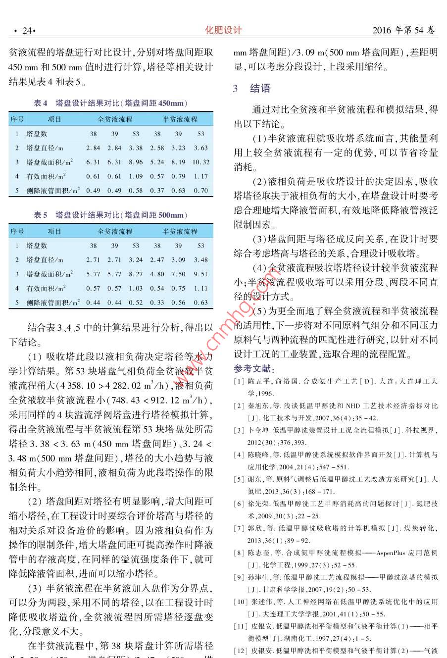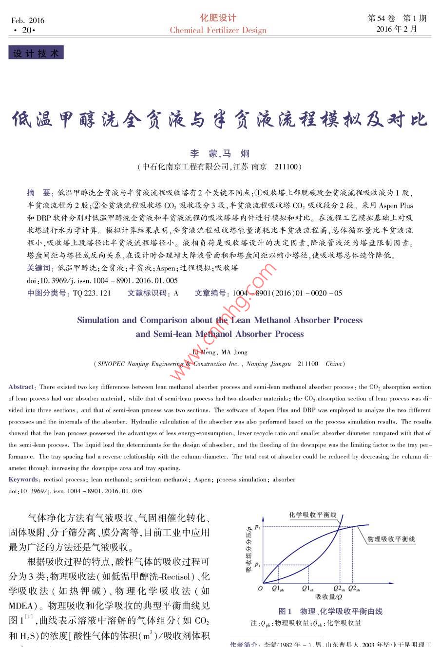 Feb.2016化肥設(shè)計(jì)第54卷第1期Chemical fertilizer design2016年2月低溫甲醇洗全貧液與睿貧液流程模擬及對(duì)比李蒙,馬炯(中石化南京工程有限公司,江蘇南京211100摘要:低溫甲醇洗全貧液與半貧液流程吸收塔冇Σ個(gè)關(guān)鍵不冋點(diǎn):①吸收塔上部脫碳段全貧液流程吸收液為Ⅰ股,半貧液流程為2股;②全貧液流程吸收塔Cλ吸收段分3段,半貧液流程吸收塔C吸收段分2段。采用 Aspen Plus和DRP軟件分別對(duì)低溫甲醇洗全貧液和半貧液流程的吸收塔塔內(nèi)件進(jìn)行模擬和對(duì)比。在流程工藝模擬基礎(chǔ)上對(duì)吸收塔進(jìn)行水力學(xué)計(jì)算。模擬計(jì)算結(jié)果表明,全貧液流程吸收塔能量消耗比半貧液流程髙,總體循環(huán)量比半貧液流程小,吸收塔上段塔徑比豐貧液流程塔徑小。液相負(fù)荷是吸收塔設(shè)計(jì)的決定因素,降液管液泛為塔盤(pán)限制因素。塔盤(pán)間距與塔徑成反向關(guān)系,在設(shè)計(jì)時(shí)合理増大降液管面積和塔盤(pán)間距以縮小塔徑,使吸收塔總體造價(jià)降低。關(guān)鍵詞:低溫甲醇洗;全貧液;半貧液; Aspen;過(guò)程模擬;吸收塔doi:10.3969/jisn.1004-8901.2016.01.005中圖分類號(hào):TQ223.121文獻(xiàn)標(biāo)識(shí)碼:A文章編號(hào):1004-8901(2016)01-0020-05Simulation and Comparison about the Lean Methanol Absorber Processand semi-ean methanol absorber processLI Meng, MA JiongSINOPEC Nanjing Engineering Construction Inc., Nanjing Jiangsu 211100 China)Abstract: There existed two key differences between lean methanol absorber process and semi -Hean methanol absorber process the CO, absorption sectionof lean process had one absorber material, while that of semi ean process had two absorber materials the CO, absorption section of lean process was divided into three sections, and that of semi -ean process was two sections. The software of Aspen Plus and DRP was employed to analyze the two differentprocesses and the intemals of the absorber. Hydraulic calculation of the absorber was also performed based on the process simulation results. The resultsshowed that the lean process possessed the advantages of less energy-consumption, lower recycle ratio and smaller absorber diameter compared with that ofthe semi -ean process. The liquid load the determinants for the design of absorber, and the flooding of the downpipe was the limiting factor to the tray performance. The tray spacing had a reverse relationship with the column diameter. The total cost of absorber could be reduced by decreasing the column diameter through increasing the downpipe area and tray spacing.Keywords: rectisol process; lean methanol; semi-Hean methanol; Aspen; process simulation; absorberdoi:10.3969/j.issn.1004-8901.2016.01.005氣體凈化方法有氣液吸收、氣固相催化轉(zhuǎn)化、化學(xué)吸收平衡線固體吸附、分子篩分離、膜分離等,目前工業(yè)中應(yīng)用物理吸收平衡線最為廣泛的方法還是氣液吸收。根據(jù)吸收過(guò)程的特點(diǎn),酸性氣體的吸收過(guò)程可分為3類:物理吸收法(如低溫甲醇洗 Rectisol)、化學(xué)吸收法(如熱鉀堿)、物理化學(xué)吸收法(如o Q1,22 22吸收量/QMDEA)。物理吸收和化學(xué)吸收的典型平衡曲線見(jiàn)圖1物理、化學(xué)吸收平衡曲線圖1,曲線表示溶液中溶解的氣體組分(如CO2注:Q噸:物理吸收量;Q:化學(xué)吸收量和H2S)的濃度[酸性氣體的體積(m3)/吸收劑體積第1期李蒙等低溫甲醇洗全貧液與半貧液流程模擬及對(duì)比溶劑循環(huán)量受原料氣量和操作條件影響較大,吸收段分3段,半貧液流程吸收塔CO厶吸收段分2操作壓力提高、溫度降低,溶劑循環(huán)量減少。段。具體描述如下。低溫甲醇洗( Rectisol)能夠有效脫除原料氣的(1)全貧液流程是指甲醇溶劑全部采用熱再生HS、CO3和COS等組分,凈化氣中總的硫含量可脫塔中段貧甲醇,且只有這1股外供吸收甲醇來(lái)源至0.1mg/m3以下,CO2可脫至10mg/m3以下,與(見(jiàn)圖3中注1)的流程。半貧液流程是指甲醇溶劑其他吸收技術(shù)比較有一定的優(yōu)越性2,特別是在高除頂部一股來(lái)自熱再生塔中段貧甲醇外,還引1股壓、大規(guī)模的工業(yè)化裝置中,技術(shù)優(yōu)勢(shì)更為明顯經(jīng)中壓閃蒸及H2S濃縮塔頂兩級(jí)閃蒸、解析部分目前對(duì)低溫甲醇洗技術(shù)的研究廣泛開(kāi)展,其方CO2后的含CO2但不飽和的半貧甲醇(見(jiàn)圖2注1向主要是針對(duì)流程模擬34、原料氣適應(yīng)性和操和注3)的流程。半貧液流程在H2S濃縮塔有部分作過(guò)程中遇到具體問(wèn)題的整改措施等方面。本半貧甲醇回吸收塔,進(jìn)熱再生塔甲醇量相應(yīng)減少,文是通過(guò)流程對(duì)比,分析貧液和半貧液流程的優(yōu)缺熱再生塔設(shè)計(jì)負(fù)荷會(huì)減小,蒸汽消耗降低。點(diǎn),研究?jī)煞N流程中吸收塔的設(shè)計(jì)差異性,對(duì)工程(2)吸收塔從塔底到塔頂分為預(yù)洗段、H2S吸項(xiàng)目的流程配置及后續(xù)設(shè)計(jì)有指導(dǎo)意義收段、CO2吸收段。甲醇吸收CO2會(huì)釋放溶解熱為保持熱量平衡和吸收效果,需對(duì)甲醇溶液進(jìn)行外1流程對(duì)比循環(huán)冷卻。半貧液流程中的半貧液是含有部分CO2在吸收塔中,低溫甲醇洗工藝以物理吸收方法的低溫甲醇溶液,故可以吸收的CO2量少,同時(shí)釋將合成氣中高濃度酸性氣體除去,得到合格氣體。放的吸收熱量絕對(duì)值也會(huì)小些,全貧液流程在CO2富含CO2、H2S的甲醇經(jīng)過(guò)中壓閃蒸、解析、氣提、熱吸收段需分為3段,而半