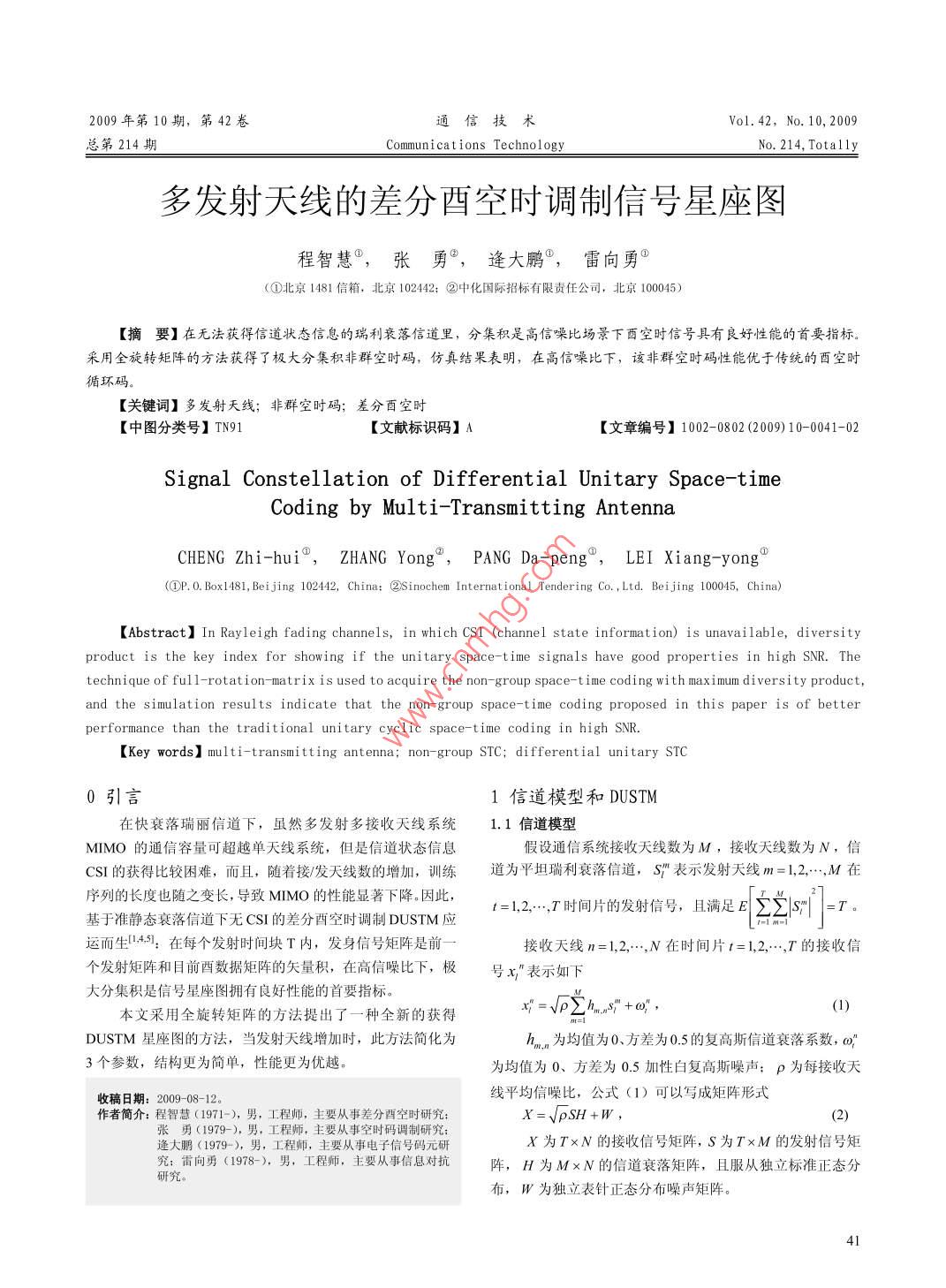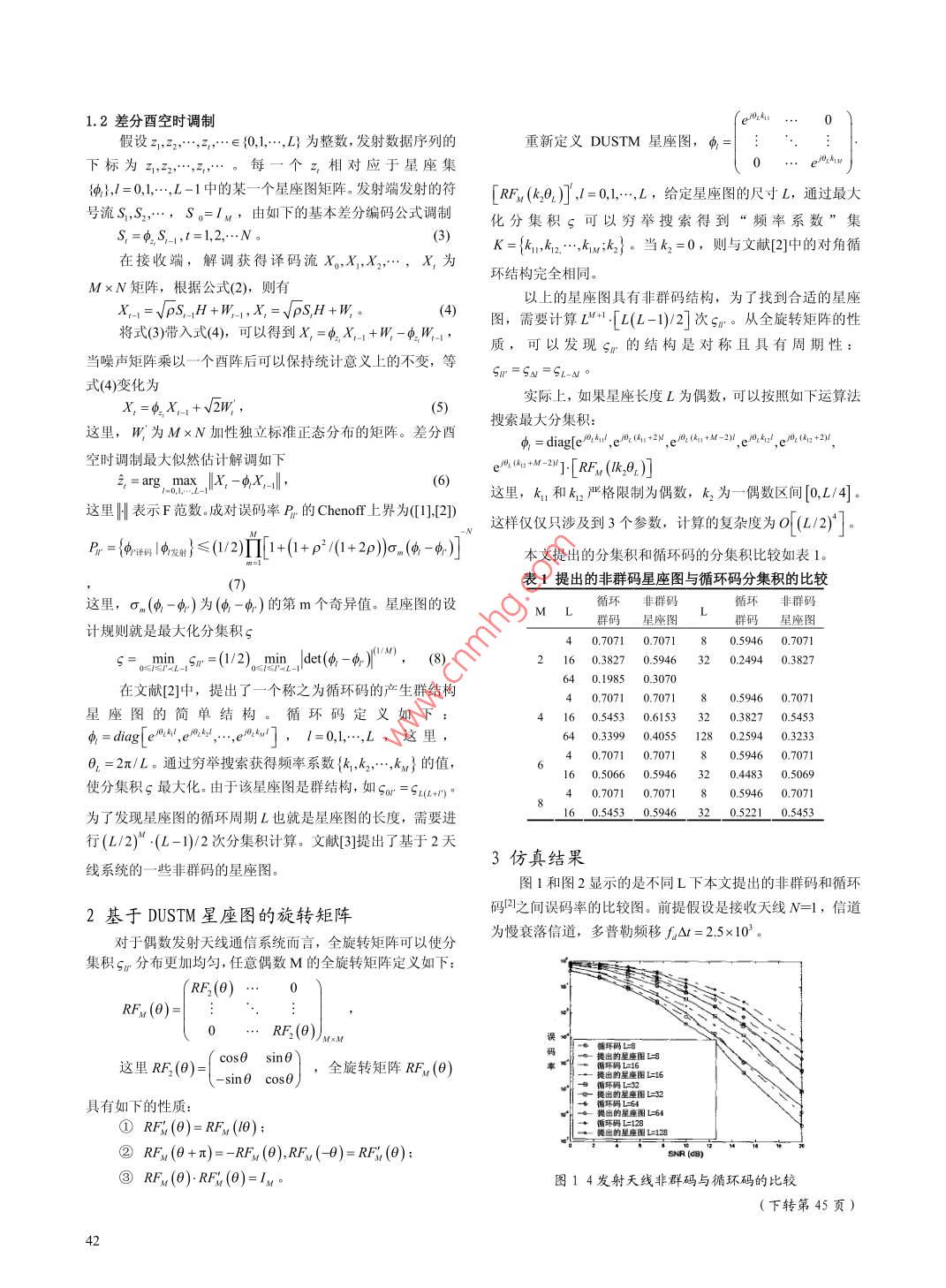 209年第10期,第42卷通信技術(shù)Vo1.42,No.10,2009第214期Communications TechnologyNo 214, Totally多發(fā)射天線的差分酉空時(shí)調(diào)制信號(hào)星座圖程智慧,張勇°,逄大鵬°,雷向勇°(①北京1481信箱,北京102442;②中化國(guó)際招標(biāo)有限責(zé)任公司,北京100045)【摘要】在無(wú)法獲得信道狀態(tài)信息的瑞利衰落信道里,分集積是高信噪比場(chǎng)景下酉空時(shí)信號(hào)具有良妤性能的首要指標(biāo)采用全旋轉(zhuǎn)矩陣的方法獲得了極大分集積非群空時(shí)碼,仿真結(jié)果表明,在髙信噪比下,該非群空時(shí)碼性能優(yōu)于傳統(tǒng)的酉空時(shí)循環(huán)碼【關(guān)鍵詞】多發(fā)射天線;非群空時(shí)碼;差分酉空時(shí)【中圖分類號(hào)】TN91【文獻(xiàn)標(biāo)識(shí)碼】A【文章編號(hào)】1002-0802(209)10-0041-02Signal Constellation of Differential Unitary Space-timeCoding by Multi-Transmitting AntennaCHENG Zhi-hui, ZHANG Yong, PANG Da-peng, LEI Xiang-yong(OP. 0. Box1481, Beijing 102442, China: (sInochem International Tendering Co., Ltd. Beijing 100045, China)(Abstract] In Rayleigh fading channels, in which CSI (channel state information)is unavailable, diversityproduct is the key index for showing if the unitary space-time signals have good properties in high SNr. Theechnique of full -rotation-matrix is used to acquire the non-group space-time coding with maximum diversity product,and the simulation results indicate that the non-group space-time coding proposed in this paper is of betterperformance than the traditional unitary cyclic space-time coding in high SNR.(Key words] multi-transmitting antenna; non-group STC differential unitary STC引言1信道模型和 DUSTM在快衰落瑞麗信道下,雖然多發(fā)射多接收天線系統(tǒng)1.1信道模型MIMO的通信容量可超越單天線系統(tǒng),但是信道狀態(tài)信息假設(shè)通信系統(tǒng)接收天線數(shù)為M,接收天線數(shù)為N,信CSI的獲得比較困難,而且,隨著接發(fā)天線數(shù)的增加,訓(xùn)練道為平坦瑞利衰落信道,Sm表示發(fā)射天線m=1,2,…,M在序列的長(zhǎng)度也隨之變長(zhǎng),導(dǎo)致MIMO的性能顯著下降。因此,基于準(zhǔn)靜態(tài)衰落信道下無(wú)CSI的差分酉空時(shí)調(diào)制 DUSTM應(yīng)1=12…T時(shí)間片的發(fā)射信號(hào),且滿足E∑∑1=7運(yùn)而生4:在每個(gè)發(fā)射時(shí)間塊T內(nèi),發(fā)身信號(hào)矩陣是前接收天線n=1,2,…,N在時(shí)間片t=1,2,…,T的接收信個(gè)發(fā)射矩陣和目前酉數(shù)據(jù)矩陣的矢量積,在高信噪比下,極號(hào)x”表示如下大分集積是信號(hào)星座圖擁有良好性能的首要指標(biāo)本文采用全旋轉(zhuǎn)矩陣的方法提出了一種全新的獲得x=√∑hnDUSTM星座圖的方法,當(dāng)發(fā)射天線增加時(shí),此方法簡(jiǎn)化為n,為均值為0、方差為0:的復(fù)高斯信道衰落系數(shù),o3個(gè)參數(shù),結(jié)構(gòu)更為簡(jiǎn)單,性能更為優(yōu)越值為0、方差為0.5加性白復(fù)高斯噪聲;p為每接收天收稿日期:209-08-12。線平均信噪比,公式(1)可以寫成矩陣形式作者簡(jiǎn)介:程智慧(1971-),男,工程師,主要從事差分酉空時(shí)研究張勇(1979-),男,工程師,主要從事空時(shí)碼調(diào)制研究;逄大鵬(1979-),男,工程師,主要從事電子信號(hào)碼元研X為T×N的接收信號(hào)矩陣,S為T×M的發(fā)射信號(hào)矩究;雷向勇(1978-),男,工程師,主要從事信息對(duì)抗陣,H為MxN的信道衰落矩陣,且服從獨(dú)立標(biāo)準(zhǔn)正態(tài)分布,W為獨(dú)立表針正態(tài)分布噪聲矩陣。1.2差分酉空時(shí)調(diào)制假設(shè)z,z2…,,…∈{0,1…,L}為整數(shù),發(fā)射數(shù)據(jù)序列的重新定義 DUSTM星座圖,下標(biāo)為x1,z2…,…。每一個(gè)z,相對(duì)應(yīng)于星座集91=01…,乙-1中的某一個(gè)星座圖矩陣。發(fā)射端發(fā)射的符[RF,(k月,=01-…,L,給定星座圖的尺寸L,通過(guò)最大號(hào)流S1,S2…,S。=lM,由如下的基本差分編碼公式調(diào)制化分集積s可以窮舉搜索得到“頻率系數(shù)”集S=S-1,t=1,2,…N。K={k,k2…kw;k}。當(dāng)k2=0,則與文獻(xiàn)2中的對(duì)角循在接收端,解調(diào)獲得譯碼流x,X,X2,…,X,為環(huán)結(jié)構(gòu)完全相同M×N矩陣,根據(jù)公式(2),則有以上的星座圖具有非群碼結(jié)構(gòu),為了找到合適的星座x1=√pSH+W1,X,=√pSH+W將式(3帶入式(4),可以得到X=中x1+H一中W圖,需要計(jì)算L[L(L-1)/2]次sm。從全旋轉(zhuǎn)矩陣的性質(zhì),可以發(fā)現(xiàn)sn的結(jié)構(gòu)是對(duì)稱且具有周期性當(dāng)噪聲矩陣乘以一個(gè)酉陣后可以保持統(tǒng)計(jì)意義上的不變,等式(4)變化為'-5N-5L-A o實(shí)際上,如果星座長(zhǎng)度L為偶數(shù),可以按照如下運(yùn)算法X=中X搜索最大分集積:這里,W為MxN加性獨(dú)立標(biāo)準(zhǔn)正態(tài)分布的矩陣。差分酉空時(shí)調(diào)制最大似然估計(jì)解調(diào)如下e。嗎= dingle/And,en+y:,+M23e3,4k12+M-22, -arg, mRF(1k,0)1這里,k1和k12嚴(yán)格限制為偶數(shù),k2為一偶數(shù)區(qū)間[0,L/4]這里川表示F范數(shù)成對(duì)誤碼率P的 Chenot上界為12)這樣僅僅只涉及到3個(gè)參數(shù),計(jì)算的復(fù)雜度為O[(L2P=1≤(/2)∏1+(1+p31(1+2)(的一本文提出的分集積和循環(huán)碼的分集積比較如表1表1提出的非群碼星座圖與循環(huán)碼分集積的比較這里,σn(中-9)為(中-中)的第m個(gè)奇異值。星座圖的設(shè)循環(huán)非群碼循環(huán)非群碼計(jì)規(guī)則就是最大化分集積s群碼星座圖群碼星座圖40.