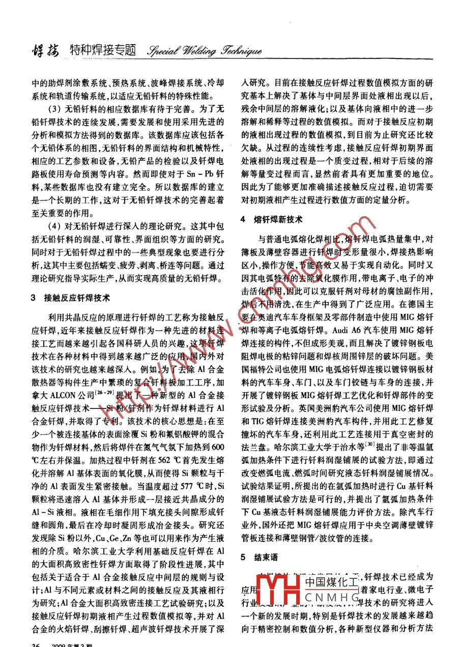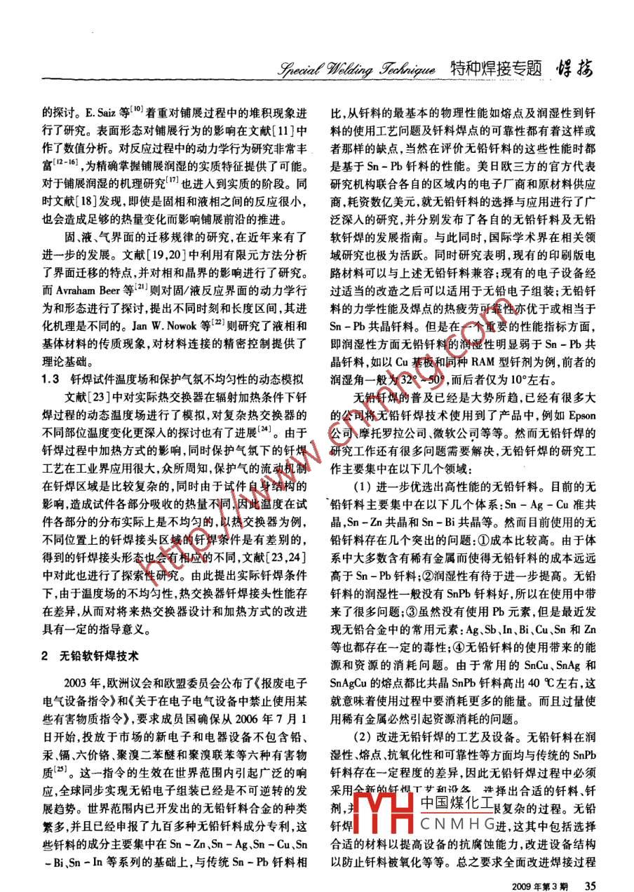 悍梅特種焊接專題SPpeiat "Wilding Fochnigue釬焊新技術進展哈爾濱工業(yè)大學現(xiàn)代焊接技術國家重點實驗室(150001)何鵬錢乙余摘要在焊接技術迅速 發(fā)展的今天,釬焊技術已成為應用最廣泛的連接技術之一一。文中綜述了國內(nèi)外釬焊新技術的發(fā)展現(xiàn)狀,系統(tǒng)介紹了釬焊基礎理論發(fā)展、無鉛軟釬焊技術、接觸反應釬焊技術及熔釬焊新技術,指出釬焊技術的研究已經(jīng)過渡到數(shù)字化模擬化的階段,精密控制和釬燁機理的研究越來越成為關注的焦點。關鍵詞:釬焊無鉛接觸反應熔釬焊中圈分類號: TG425張力和重力作用下,對自由表面或有接頭形成條件下1釬焊新技術理論的發(fā)展的釬料形態(tài)進行了研究,例如在兩個豎直板之間的熔釬焊方法對基體材料不會造成熔焊帶來的損傷,融釬料的流動行為等,對不同釬焊接頭形態(tài)而引起的在新材料和非金屬材料連接發(fā)揮著非常重要的作用。傳熱效率問題也進行了分析(2] ,結果顯示,流人釬焊接因此在焊接技術迅速發(fā)展的今天,釬焊技術已成為應頭的熔融釬料的理論值和實際值有-定的差距)]。為用最廣泛的連接技術之一。目前,釬焊技術的研究已了對釬焊接頭的形態(tài)進行準確的預測,并對熱交換器經(jīng)過渡到數(shù)字化、模擬化的階段,精密控制和釬焊機理等設計改進提供技術支持,需要對此實際值進行精確的研究越來越成為關注的焦點。目前,釬焊機理方面的建模預測。釬焊接頭的形態(tài)預測結果表明[4),形成的進展主要集中在以下幾個方面。釬焊接頭的釬料的質(zhì)量和釬焊參數(shù)、材料成分和性能1.1 釬料流動填縫行為研究有直接的關系。對于材料粘度、結構的影響正在深人釬焊技術中,關于工藝和冶金方面的研究由來已的研究中。久,而且已經(jīng)達到了很高的水平。由于對釬焊質(zhì)量控1.2釬焊過 程的動力學研究制、優(yōu)化設計和壽命可靠性等問題的要求日益嚴格,與研究釬焊過程的動力學行為是探索釬焊機理的重此相關的釬焊過程熔融釬料動態(tài)流動的模擬便成為關要手段,美國Los Alamos National Laboratories 國家實驗注的焦點。近年來,溫度場、流場,尤其是包含傳質(zhì)方室{5]對復雜的多層材料釬焊過程的實時動力學研究獲程在內(nèi)的潤濕鋪展的數(shù)值模擬,已經(jīng)使人們對此有了得了理想的結果。采用蒙乃爾高強度鎳銅合金,以更進-一步的認識。但是由于控制方程的復雜性,進行TH2為助潤濕劑,Ag - 28% Cu作為釬料。測試儀器顯數(shù)值求解也是非常困難的?,F(xiàn)在的研究方向和深度也示出幾個截然不同的階段,包括諸如:化合物的分解、僅限于一些建立在簡化條件下的分析。長期以來,人熔化和幾個相應的明顯“S"形的反應曲線。其中特別們無法通過實驗室設備來對釬料的流動行為進行實時值得注意的是,Be-Cu的8相金屬間化合物形成的動觀察和分析。Sandia美國國家實驗室"對釬料填縫過力學行為。它是與釬焊條件以及在Be界面上TiH2含.程進行圖像實時監(jiān)控,研究了釬料的潤濕和鋪展情況,量相關的方程表達式。此研究方法的優(yōu)點是在測量的揭示了釬焊接頭的形式和材料性質(zhì)所表現(xiàn)出來的不同同時便能夠得到相應的動力學行為,因此可用于多種的潤濕和填充性能。這個監(jiān)控系統(tǒng)包含了全數(shù)字式、釬焊過程的研究中,如:陶瓷與金屬的釬焊;金屬化過封閉式的控溫裝置。試件可以事先設定溫度、加熱或程中的潤濕和反應;以及復雜的非等溫熱過程中的釬冷卻時間。釬料在間隙內(nèi)的流動行為可以通過-一個高料與基體相互作用等。實際上,有關潤濕與鋪展的理速有放大裝置的攝影機來獲得相應的圖像,并提供了論研究問題也已經(jīng)引起了各方關注。A. Meier 等一種有效的方法來獲得動態(tài)的釬料潤濕和流動的相關中國煤化工半徑的變化,對反應數(shù)據(jù)。對于熔融釬料的動態(tài)流動行為建模,在美國肯人塔基大學的釬焊實驗室已經(jīng)有了一定的發(fā)展。在表面潤濕;YHCNMHG的形態(tài)進行了預測,.還對潤濕鋪展過程中的流場進行模擬。鋪展過程中的收稿日期: 2008 -09-11吸附、堆積和化合物形成現(xiàn)象,在文獻[9]中進行了系統(tǒng)342009 年第3期Speial 9Welding Fedhnigue 特種焊接專題悍指的探討。E. Saiz等[10]著重對鋪展過程中的堆積現(xiàn)象進比,從釬料的最基本的物理性能如熔點及潤濕性到釬行了研究。表面形態(tài)對鋪展行為的影響在文獻[ 11]中料的使用工藝問題及釬料焊點的可靠性都有著這樣或作了數(shù)值分析。對反應過程中的動力學行為研究非常豐者那樣的缺點,當然在評價無鉛釬料的這些性能時都富[12-161 ,為精確掌握鋪展?jié)櫇竦膶嵸|(zhì)特征提供了可能。是基于Sn- Pb釬料的性能。美日歐三方的官方代表對于鋪展?jié)櫇竦臋C理研究["7]也進人到實質(zhì)的階段。同研究機構聯(lián)合各自的區(qū)域內(nèi)的電子廠商和原材料供應時文獻[ 18]發(fā)現(xiàn),即使是固相和液相之間的反應很小,商,耗資數(shù)億美元,就無鉛釬料的選擇與應用進行了廣也會造成足夠的熱量變化而影響鋪展前沿的推進。泛深入的研究,并分別發(fā)布了各自的無鉛釬料及無鉛固液、氣界面的遷移規(guī)律的研究,在近年來有了軟釬焊的發(fā)展指南。與此同時,國際學術界在相關領進一步的發(fā