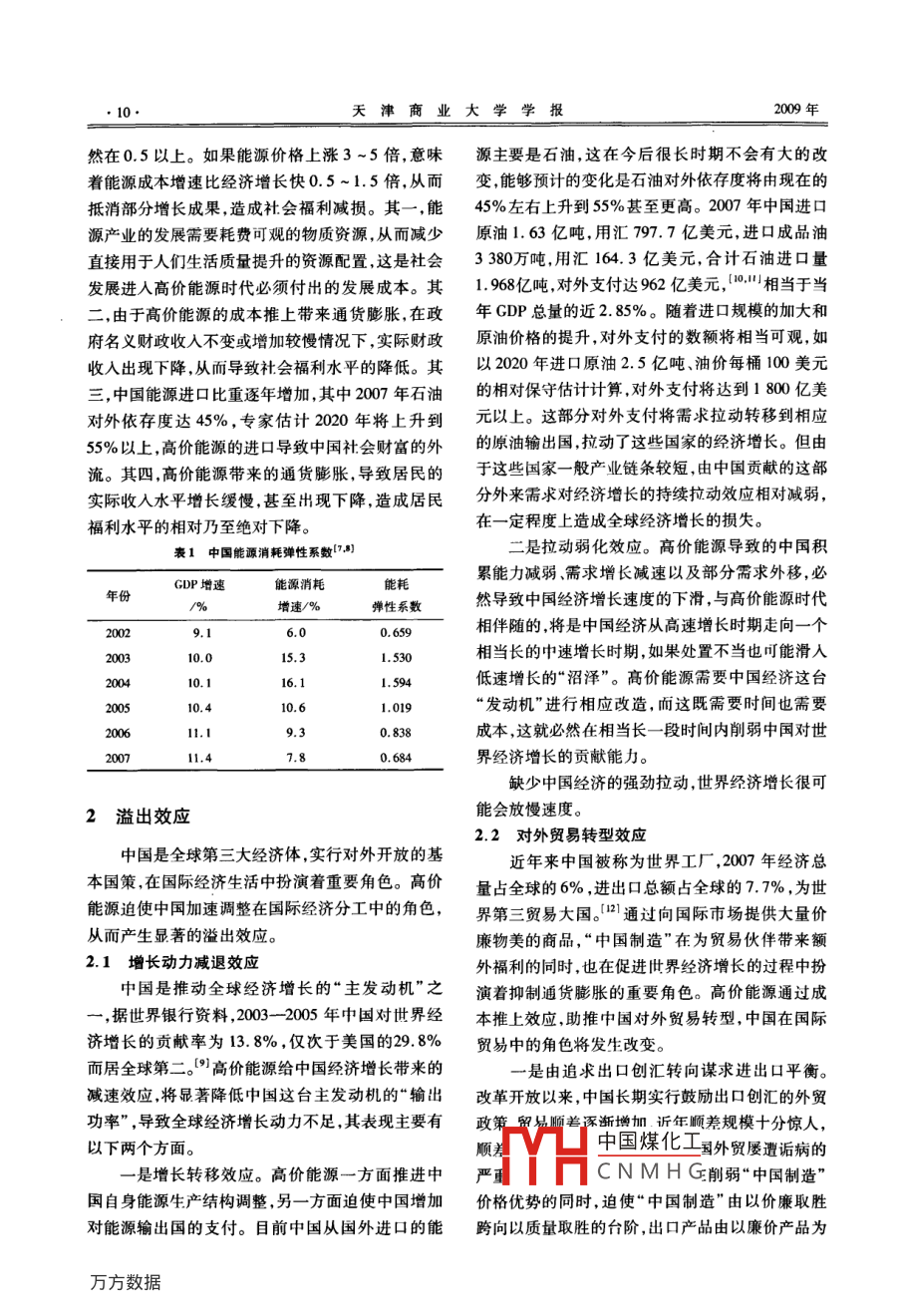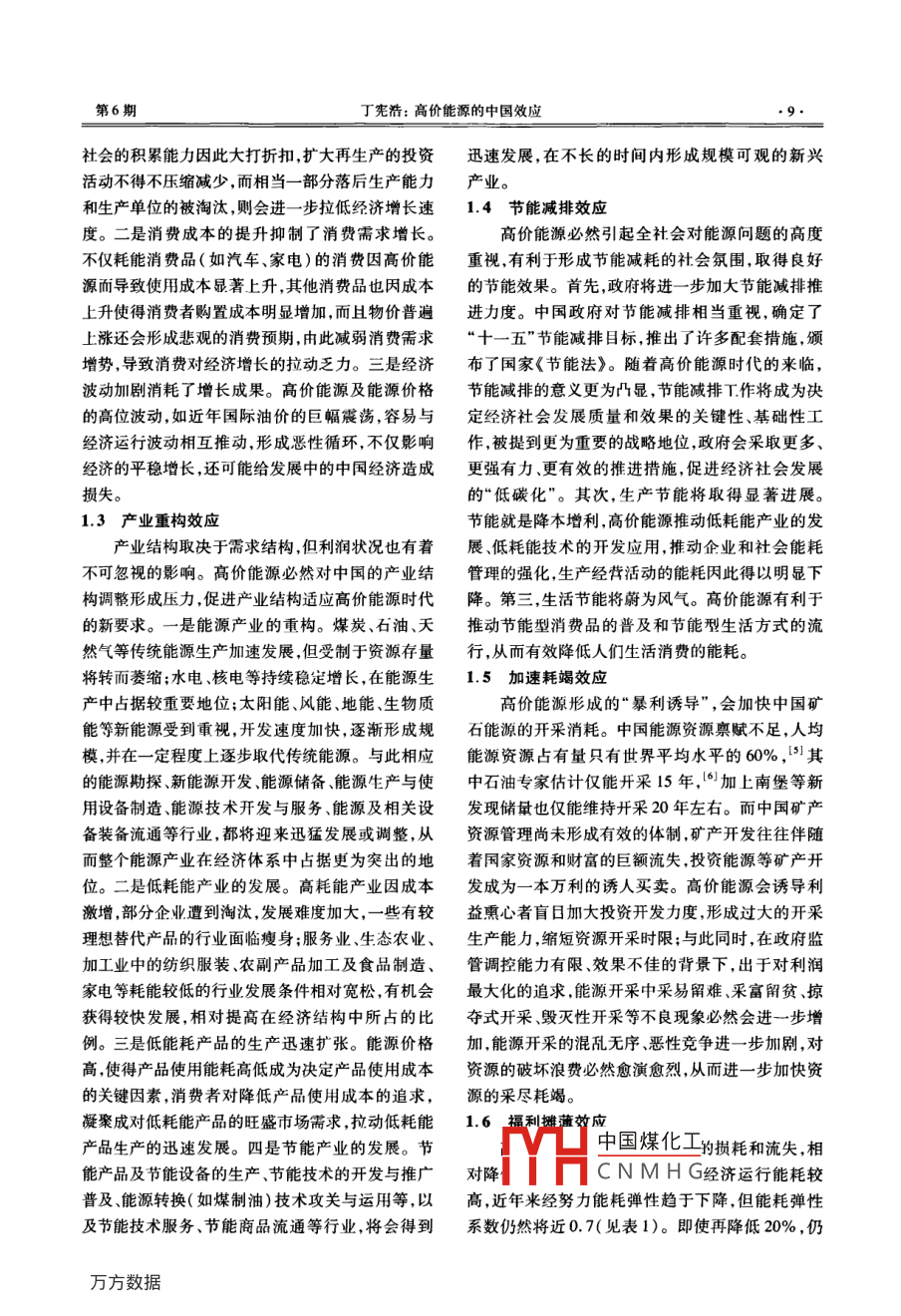 第29卷第6期天津商業(yè)大學(xué)學(xué)報Vol 29 No 62009年11月Journal of Tianjin University of CommerceNov.2009高價能源的中國效應(yīng)丁憲浩(蘇州科技學(xué)院公共管理學(xué)院,蘇州215009)【摘要】人類即將進入高價能源時代。高價能源對中國經(jīng)濟社會運行發(fā)展的影響,至少表現(xiàn)為成本推上、增長減速、產(chǎn)業(yè)重構(gòu)、節(jié)能減排、加速耗竭、福利攤薄等六大效應(yīng),對中國經(jīng)濟影響的溢出效應(yīng)主要有增長動力減退效應(yīng)、對外貿(mào)易轉(zhuǎn)型效應(yīng)、境外投資調(diào)整效應(yīng)。為放大積極效應(yīng),抑制消極效應(yīng),迎接高價能源時代的挑戰(zhàn),除了中國加大改革調(diào)整力度以外,國際社會還應(yīng)積極開展能源合作,大力開發(fā)新能源,努力推進全球性節(jié)能減排。【關(guān)鍵詞】高價能源;中國效應(yīng);內(nèi)部效應(yīng);溢出效應(yīng);國際合作【中圖分類號】F148文獻標(biāo)識碼】A【文章編號】1674-2362(2009)06-0008-06隨著全球金融危機的發(fā)展,國際油價漸漸收斂幾方面效應(yīng)。起咆哮多時的猙獰面孔。然而2008年油價的過山1.1成本推上效應(yīng)車行情,已明白無誤地警示人們廉價能源時代的行高價能源會明顯地全面推高中國生產(chǎn)經(jīng)營活將終結(jié)、高價能源時代的日益逼近。動成本。按國家統(tǒng)計局、國家發(fā)展和改革委員會作為國際能源價格標(biāo)桿的國際原油價格1970國家能源局公布的全國單位GDP能耗指標(biāo)公報數(shù)年僅為每桶18美元,在幾次石油危機沖擊下油價據(jù),2008年中國每萬元GDP的綜合能耗為1.16噸巨幅震蕩、不斷攀升。從2002年開始由每桶25美標(biāo)準(zhǔn)煤,4能耗成本大致相當(dāng)于CDP的13%以元起,以毎年差不多10美元的漲幅逐年遞增,2008能源價格上漲3~5倍估算,如果能耗不能顯著降年7月11日創(chuàng)出每桶147.27美元的歷史高價攀低,能源消費結(jié)構(gòu)基本不變,能耗成本也就會相應(yīng)上全年平均每桶100美元的高位,1-36年中上漲增加為相當(dāng)于GDP的40%~65%。即使單位能耗了3倍。雖因經(jīng)濟危機、炒作泡沫減退等影響,油有所下降(下降難度相當(dāng)大),能源消費結(jié)構(gòu)有所價回落到每桶40美元左右,但由于化石能源日近調(diào)整,新能源的使用有所增加,能耗成本的降低也枯竭新能源開發(fā)步履蹣跚,油價重拾強勁升勢應(yīng)相當(dāng)有限。能源漲價對物價上漲具有很強的放大在意料之中??梢灶A(yù)期,在今后5~10年中,能源效應(yīng),動力、運輸冶煉等上游行業(yè)或環(huán)節(jié)的成本上價格上漲3~5倍并不困難,出現(xiàn)更大幅度的上漲升,會在向下游行業(yè)和生產(chǎn)環(huán)節(jié)傳遞過程中節(jié)節(jié)放也是極有可能的。大,導(dǎo)致全社會的通貨膨脹,中國將告別廉價商品高價能源不僅將對中國產(chǎn)生全面深刻而劇烈時代。的影響,還會有力助推中國在國際經(jīng)濟活動中的角1.2增長減速效應(yīng)色轉(zhuǎn)換,從而對國際經(jīng)濟運行產(chǎn)生深刻影響中國經(jīng)濟高速增長的奇跡是建立在低成本勞1內(nèi)部效應(yīng)動力、廉價能源供給等基礎(chǔ)之上的,高價能源必然會阻滯中國經(jīng)濟的發(fā)展。一是積累能力的減弱導(dǎo)作為全球第二大能源消費國,高價能源首先會致生中國煤化工的生產(chǎn)成本的顯對中國經(jīng)濟社會發(fā)展產(chǎn)生全方位影響至少有以下著上應(yīng)下降,企業(yè)和CNMHG收稿日期:200-06-18作者簡介;丁憲浩(1955一),男,江蘇海門人,教授,主要從事生態(tài)經(jīng)濟與生態(tài)文明、勞動經(jīng)濟與倫理、區(qū)域經(jīng)濟研究第6期丁憲浩:高價能源的中國效應(yīng)社會的積累能力因此大打折扣,擴大再生產(chǎn)的投資迅速發(fā)展,在不長的時間內(nèi)形成規(guī)??捎^的新興活動不得不壓縮減少,而相當(dāng)一部分落后生產(chǎn)能力產(chǎn)業(yè)。和生產(chǎn)單位的被淘汰,則會進一步拉低經(jīng)濟增長速1.4節(jié)能減排效應(yīng)度。二是消費成本的提升抑制了消費需求增長。高價能源必然引起全社會對能源問題的高度不僅耗能消費品(如汽車、家電)的消費因高價能重視,有利于形成節(jié)能減耗的社會氛圍,取得良好源而導(dǎo)致使用成本顯著上升,其他消費品也因成本的節(jié)能效果。首先,政府將進一步加大節(jié)能減排推上升使得消費者購置成本明顯增加,而且物價普遍進力度。中國政府對節(jié)能減排相當(dāng)重視,確定了上漲還會形成悲觀的消費預(yù)期,由此減弱消費需求“十一五”節(jié)能減排目標(biāo),推出了許多配套措施,頒增勢,導(dǎo)致消費對經(jīng)濟增長的拉動乏力。三是經(jīng)濟布了國家《節(jié)能法》。隨著高價能源時代的來臨,波動加劇消耗了增長成果。高價能源及能源價格節(jié)能減排的意義更為凸顯,節(jié)能減排T作將成為決的高位波動,如近年國際油價的巨幅震蕩,容易與定經(jīng)濟社會發(fā)展質(zhì)量和效果的關(guān)鍵性、基礎(chǔ)性工經(jīng)濟運行波動相互推動,形成惡性循環(huán),不僅影響作,被提到更為重要的戰(zhàn)略地位,政府會采取更多、經(jīng)濟的平穩(wěn)增長,還可能給發(fā)展中的中國經(jīng)濟造成更強有力更有效的推進措施,促進經(jīng)濟社會發(fā)展損失。的“低碳化”。其次,生