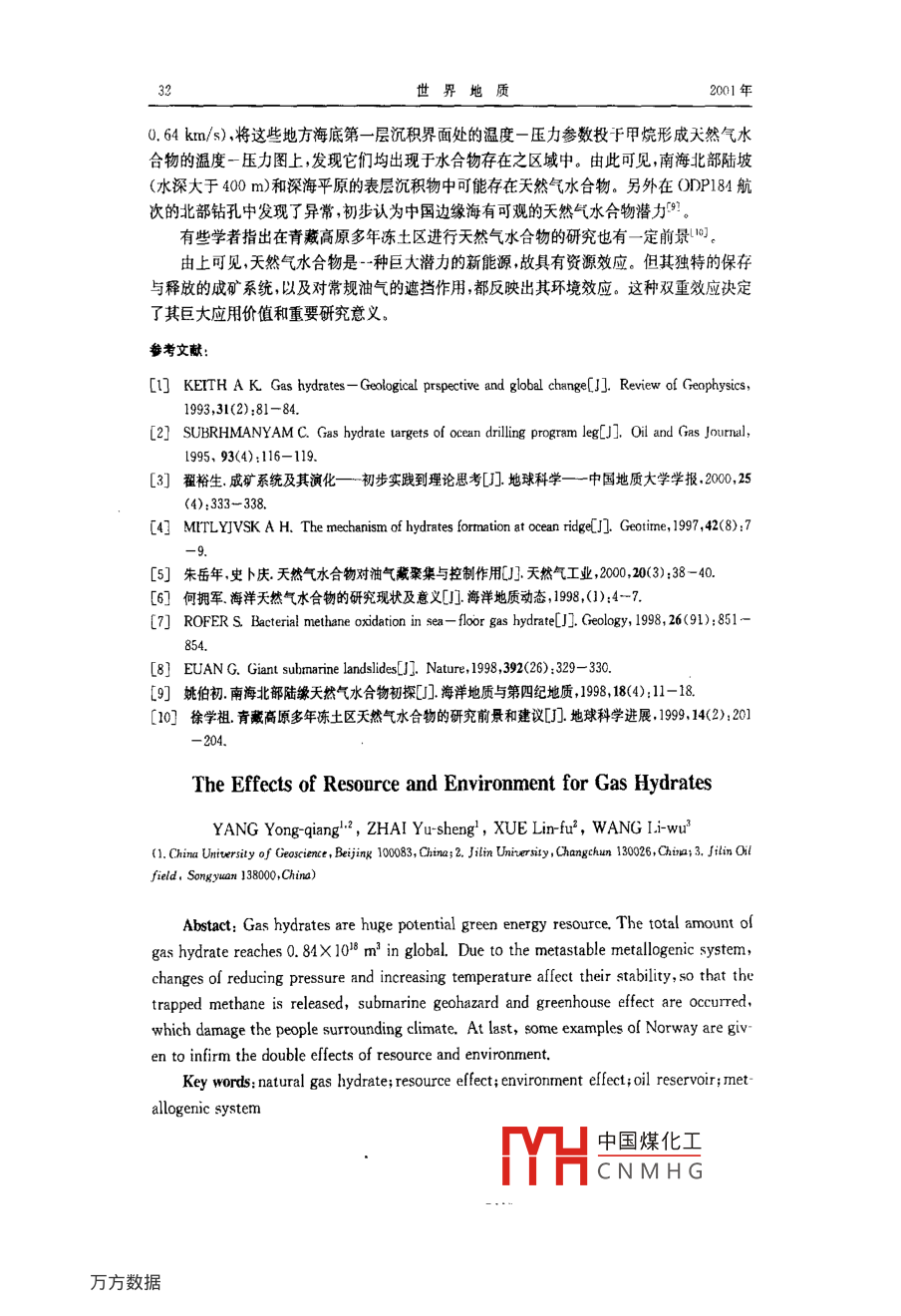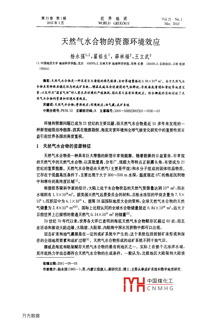 第21卷第1期Vol 21 No. 12002年3月WORLD GEOLOGYAar,2002天然氣水合物的資源環(huán)境效應(yīng)楊永強(qiáng)1:2,翟裕生',薛林福2,王立武3(1.中國地質(zhì)大學(xué)地球科學(xué)學(xué)院北京10003;:2吉林大學(xué)地球科學(xué)學(xué)院吉林長春130026:3.吉林油田,占林松原138000)擴(kuò)要:天然氣水合物是一種具有巨大潛能的綠色能源,全世界儲量接近0.84×101m3。由于天然氣水合物吳有特珠亞穗定狀態(tài)的成礦系統(tǒng),增溫戌減壓會使捕獲的氣體釋放,導(dǎo)致海底滑塌和滑坡等地質(zhì)災(zāi)害,以及作為“溫宣氣體”對人類生存環(huán)境的嚴(yán)峻挑戰(zhàn)因而其又具有環(huán)境效應(yīng)。結(jié)合揶威的實(shí)例論述了天然氣水合物的資源和環(huán)境雙重效應(yīng)。關(guān)鍵詞:天然氣水合物;貢源效應(yīng);環(huán)境效應(yīng);油氣藏;成礦系統(tǒng)中圖分類號:P61813文獻(xiàn)標(biāo)識碼:A文章編號:104-5589(20201-0030-03環(huán)境和資源問題已成為21世紀(jì)的主要議題,而天然氣水合物是近10多年來發(fā)現(xiàn)的一種新型超級潔凈能源,因其在能源勘探、海底災(zāi)害環(huán)境和全球氣候變化研究中的重要性而日益引起世界各國的高度重視。天然氣水合物的資源特征天然氣水合物是一種具有巨大潛能的新型非常規(guī)能源。隨著能源的日益緊張,非常規(guī)的天然氣中的天然氣水合物以其能量高、分布廣、規(guī)模大等特點(diǎn)正嶄露頭角,有望成為2世紀(jì)的重要能源。天然氣水合物是由天然氣(主要是甲烷)和水分子組成的固體結(jié)晶物質(zhì)它存在于低溫高壓條件下,主要出現(xiàn)于大于300~500m水深,溫度接近0℃的海底沉積物中和寒冷的高緯度區(qū)域。根據(jù)前蘇聯(lián)科學(xué)家的估計,大陸上處于水合物狀態(tài)的天然氣資源量達(dá)到104m2,而在水域則有1.5×1016m3。據(jù)美國天然氣遠(yuǎn)景委員會的材料,北極永凍層的甲烷含量為750°t,沉積層中為4.1×105t。據(jù)第28屆國際地質(zhì)大會的資料,全球天然氣水合物的天然氣儲量為28×104m32。國際上比較認(rèn)同的全球水合物儲量接近084×108m3,遠(yuǎn)大于目前世界上已探明的普通天然氣0.14×1015m3的儲量2。20世紀(jì)70年代以來,世界各大洋已查明的海底天然氣水合物賦存區(qū)超過60處,而且在活動和被動大陸邊緣、大陸坡、大陸架、內(nèi)陸海中深水沉積物中都可以出現(xiàn)。固態(tài)礦床和油氣藏都是在一定的成礦系統(tǒng)中產(chǎn)生的,這個系統(tǒng)包括控制礦床形成和保存的全部地質(zhì)要素和成礦過程。天然氣水合物形成的成礦系統(tǒng)不同于油氣田。挪威是海底和陸架賦存天然氣水合物的最有利地區(qū)之一。實(shí)際上在整個北冰洋水域其洋底熱力學(xué)動態(tài)都符合天然氣水合物的生成條件。一般認(rèn)為,北極地區(qū)大陸架和大陸坡收稿日期:2001-09-03作者簡介楊永強(qiáng)(1965-),男內(nèi)蒙古前旗人,副研究員博士,主要從事成礦系統(tǒng)和數(shù)學(xué)地質(zhì)研究中國煤化工CNMHG第1期楊水強(qiáng)等:天然氣水合物的資源環(huán)境效應(yīng)的接合地段在這…方面最有遠(yuǎn)景。據(jù)挪威特羅姆瑟大學(xué)天然氣水合物研究組的觀點(diǎn)除了天然氣水合物的一般形成機(jī)制外,在北冰洋洋底可能還有一種機(jī)制在起作用。該機(jī)制是由擴(kuò)張帶洋殼裂隙一孔隙層中水的熱對流造成的。熱對流是在強(qiáng)烈加熱條件下發(fā)生的,其溫度明顯高于穩(wěn)態(tài)天然氣水合物的溫度。為了實(shí)現(xiàn)對流,不僅需要高溫,還要有高的溫度梯度。在對流區(qū)上部,其溫度接近于洋底溫度,即相當(dāng)于天然氣水合物形成帶內(nèi)的溫度。這種機(jī)制原則上即可在大洋中脊斜坡上形成天然氣水合物聚集。淡化冷水的存在可促進(jìn)這-形成過程。1956年以來挪威政府批準(zhǔn)在挪威海槽以北大陸斜坡上的7個深水區(qū)進(jìn)行碳氡化合物勘查。這一研究課題在天然氣水合物、斜坡穩(wěn)定性和地質(zhì)災(zāi)害研究中都有重要意義天然氣水合物不僅是一種能源,而且也是一種油氣遮擋構(gòu)造。具有垂向遮擋和側(cè)向遮擋、披覆遮擋和接觸遮擋以及同生遮擋和后生遮擋等功能。尤其是古天然氣水合物一旦存在就勢必對油氣產(chǎn)生封蓋作用有利于現(xiàn)存油氣資源的保存?zhèn)?。天然氣水合物的存在可估計熱歷史及現(xiàn)今熱流,為常規(guī)油氣藏的勘探提供有用信息2天然氣水合物的環(huán)境效應(yīng)天然氣水合物是亞穩(wěn)定的增溫或減壓會使結(jié)構(gòu)不穩(wěn)定導(dǎo)致捕獲來的氣體釋放。現(xiàn)在大氣甲烷的主要天然來源是濕地環(huán)境中的細(xì)菌分解而甲烷水合物是次要來源。但是在新生代(大約65Ma)氣候急劇變化期間成為比較重要的來源。甲烷和氣候變化的對比曲線更能證明與過去氣候變化有聯(lián)系的甲烷釋放的證據(jù)。從地史上看,全球氣候變化與天然氣水合物釋放甲烷的有關(guān)證據(jù)還有海平面的變化?。在冰期,由于海水靜壓力減小,引起外大陸邊緣沉積物中天然氣水合物釋放出甲烷,并逐漸引發(fā)冰川消退作用。隨著氣溫上升,全球轉(zhuǎn)暖冰川和兩極冰蓋融化,大洋也受熱膨脹,這些綜合因素導(dǎo)致海平面上升。由于消融的冰蓋壓力降低和溫度的增高,引起永凍帶的天然氣水