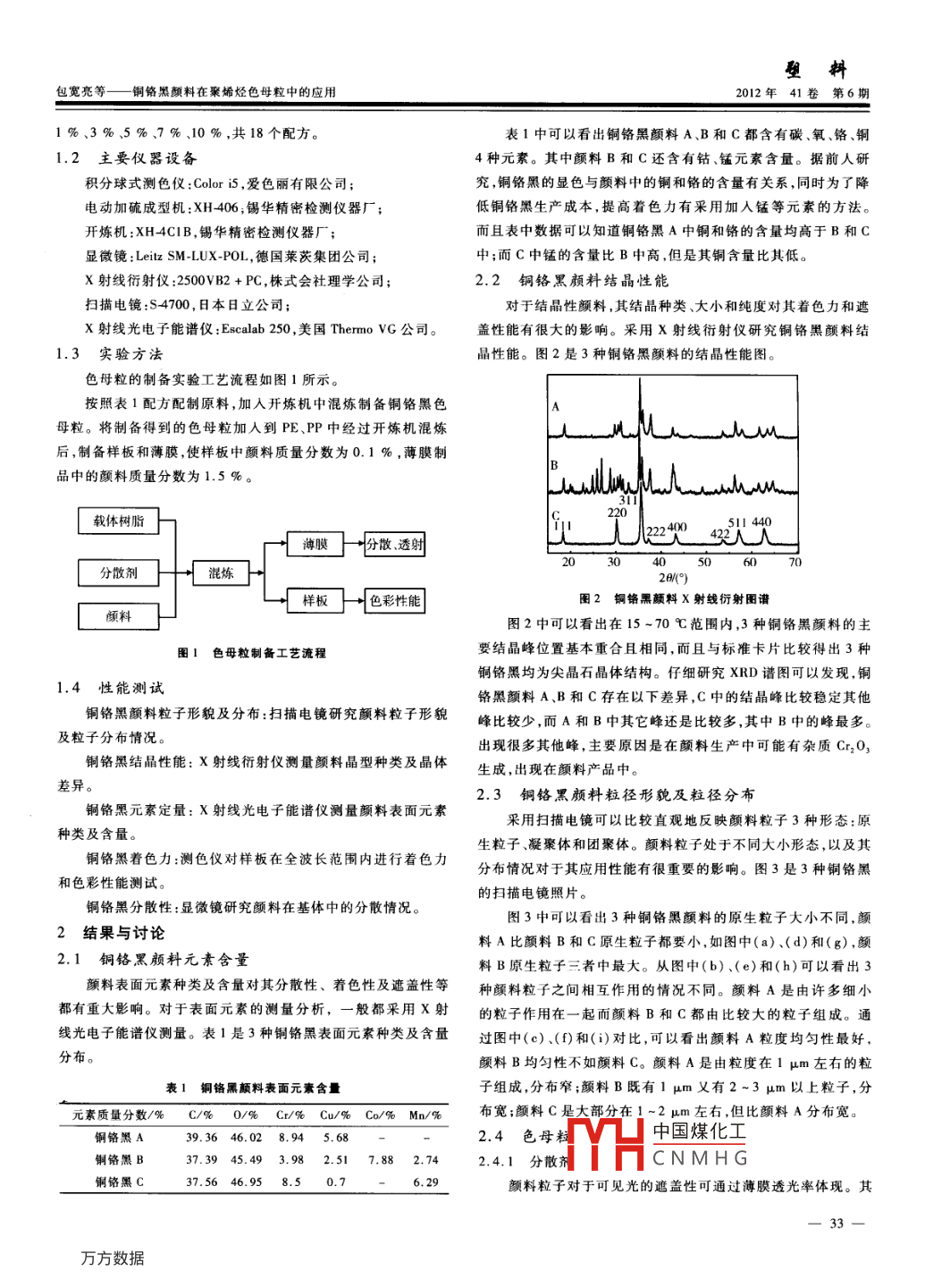 塑粒2012年41卷第6期包寬亮等一-銅鉻黑顏料在聚烯烴色母粒中的應(yīng)用銅鉻黑顏料在聚烯烴色母粒中的應(yīng)用包寬亮,林光強(qiáng),丁筠,魏慶邦,喬 輝,吳立峰(北京化工大學(xué)材料科學(xué)與工程學(xué)院,北京100029 )摘要:通過X射線光電子能譜儀、X射線衍射儀及掃描電鏡對(duì)鋼鉻黑顏料元素種類及含量、結(jié)晶性能、顏料粒子形貌及分布進(jìn)行研究,了解3種銅鉻黑顏料的微觀差異;并將3種顏料應(yīng)用于色母粒,采用了積分球式測色儀、顯微鏡,分析了色母粒及其著色制品的著色力、分散性能和遮蓋性能差異。結(jié)果表明:恰當(dāng)?shù)你~鉻含量、粒度合適且均勻、結(jié)晶性能好可以使銅鉻黑顏料在制品中呈現(xiàn)良好的著色性能、分散性能。當(dāng)制備40 %色母粒時(shí),3種銅鉻黑顏料若要達(dá)到最佳分散性能,其分散劑需要不同質(zhì)量分?jǐn)?shù),顏料A需要7%、顏料B需要3%、顏料C需要1 %。3種顏料均處于最佳分散性能時(shí),銅鉻黑A著色薄膜黑度值最大,樣板明度值最小,表明顏料A著色性能最好。關(guān)鍵詞:鋼鉻黑顏料;聚烯烴色母粒;黑度;分散性能;遮蓋性能;明度中圖分類號(hào):TQ325.1;P618.3文獻(xiàn)標(biāo)志碼:A 文章編 號(hào):1001 - 9456(2012)06 -0032 -05Copper Chromite Black for the Application of Polyolefin MasterbatchBAO Kuan-liang, LIN Cuang-qiang, DING Yun, WEI Qing-bang,QIAO Hui, WU Li-feng(College of Material Science and Engineering , Beiing University of Chemical Technology , Beijing 100029 , China)Abstract: The types of elements , erysallinity ,particle morphology and distribution of copper chromite black pigment wereinvestigated through X-ray photoelectron spectroscopy ( XPS) ,X-ray diffraction ( XRD) and scanning electron microscopy(SEM) ,the imicroscopic diferences of the tbree copper chromite black pigments were discovered. The three types of copperchromite black were prepared for color masterbatch. The tinting strength, dispersion and covering propeties of themasterbatches and their products were studied by color measurement instrument and microscope. The results showed that theappropriate content of copper and chromite , particle size uniformity and crystal properties gave a good color performance to theproducts. As for the 40 % color masterbatch,the three copper chromium black pigments needed different content to achieve thebest dispersion properties , such as pigment A needed 7 % , pigment B needed 3 % , pigment C needed 1 %. When threepigments were well dispersed , copper chromium black A had a higher blackness and lower brightness , which showed the tintingstrength of copper chromium black A was the best.Key words:copper chromium pigment ; polyolefin masterbatch ; blackness ; dispersion ;covering properties ; brightness銅鉻黑顏料(顏料索引分類號(hào)顏料黑28)是一種尖晶石結(jié)1實(shí)驗(yàn)部分構(gòu)的無機(jī)顏料,其主要化學(xué)成分是亞鉻酸銅,顏色呈深黑1.1 原料及配方色[1-4)。目前對(duì)于銅鉻黑顏料的研究報(bào)道比較少。但是銅鉻黑銅鉻黑顏料(編號(hào)A):顏料黑28,市售;顏料作為一種重要的無機(jī)環(huán)保顏料,與其他常見黑色顏料如碳銅鉻黑顏料(編號(hào)B):顏料黑28,市售;黑(槽法碳黑爐法碳黑、燈黑等)、錳鐵黑、氧化鐵黑、黑色素等銅鉻黑顏料(編號(hào)C):顏料黑28,市售;相比,其各項(xiàng)牢度性能最優(yōu)異,同時(shí)具有環(huán)保無毒、耐高溫、耐聚乙烯蠟:LPE4[F],高要市華聯(lián)塑料樹脂廠;曬、耐候、耐酸堿、耐溶劑、不遷移、易分散等性能[5-10)。低密度聚乙烯(LDPE): LD608, 北京燕化石油化工有限實(shí)驗(yàn)采用了3種市售的銅鉻黑顏料,研究了顏料性能本身公司之間的差異,以及其制備色母粒和在塑料應(yīng)用中的差異"-1”。聚丙烯(PP) :4220 ,北京燕化石油化工有限公司。對(duì)銅鉻黑顏料在塑料和色母粒中的應(yīng)用提供了--些理論依據(jù),實(shí)驗(yàn)配方:以LDPE作為載體樹脂,銅鉻黑顏料質(zhì)量分?jǐn)?shù)均同時(shí)對(duì)于色母粒及塑料著色用顏料開發(fā)具有重要意義[4-15]。為40 % ,每一種銅鉻黑中聚乙烯蠟的質(zhì)量分?jǐn)?shù)分別為0 %、中國煤化工=收稿日期:2012-08 -29MYHCNMHG作者簡介:包寬亮(1989-),男,在讀碩士研究生。通信聯(lián)系人:喬輝(1957 -),女,副教授,研究方向?yàn)榫酆衔锔男?色母粒與功能母粒。E-mil:qahh@ 263 com。- 32-塑料包寬亮等一銅鉻黑顏料在聚烯烴色母粒中的應(yīng)用2012年41卷第6期1 %.3%、5%.7% 10%,共18個(gè)配方。表1中可以看出銅鉻黑顏料A、B和C都含有碳、氧、鉻、銅1.2 主要儀器設(shè)備4種元素。其中顏料B和C還含有鈷、錳元素含量。據(jù)前人研積分球式測色儀:Color i5 ,愛色麗有限公司;究,銅鉻黑的顯色與顏料中的銅和鉻的含量有關(guān)系,同時(shí)為了降電動(dòng)加硫成型機(jī):XH406;錫華精密檢測儀器廠;低銅鉻黑生產(chǎn)成本,提高著色力有采用加入錳等元素的方法。開煉機(jī):XH4CIB,錫華精密檢測儀器廠;而且表中數(shù)據(jù)可以知道銅鉻黑A中銅和鉻的含量均高于B和C顯微鏡:Leitz SM-LUX. POL,德國菜茨集團(tuán)公司;中;而C中錳的含量比B中高,但是其銅含量比其低。X射線衍射儀:2500VB2 + PC,株式會(huì)社理學(xué)公司;2.2銅鉻 黑顏料結(jié)晶性能掃描電鏡:S4700,日本日立公司;對(duì)于結(jié)晶性顏料,其結(jié)晶種類、大小和純度對(duì)其著色力和遮X射線光電子能譜儀:Escalab250,美國ThermovG公司。蓋性能有很大的影響。采用x射線衍射儀研究銅鉻黑顏料結(jié)1.3