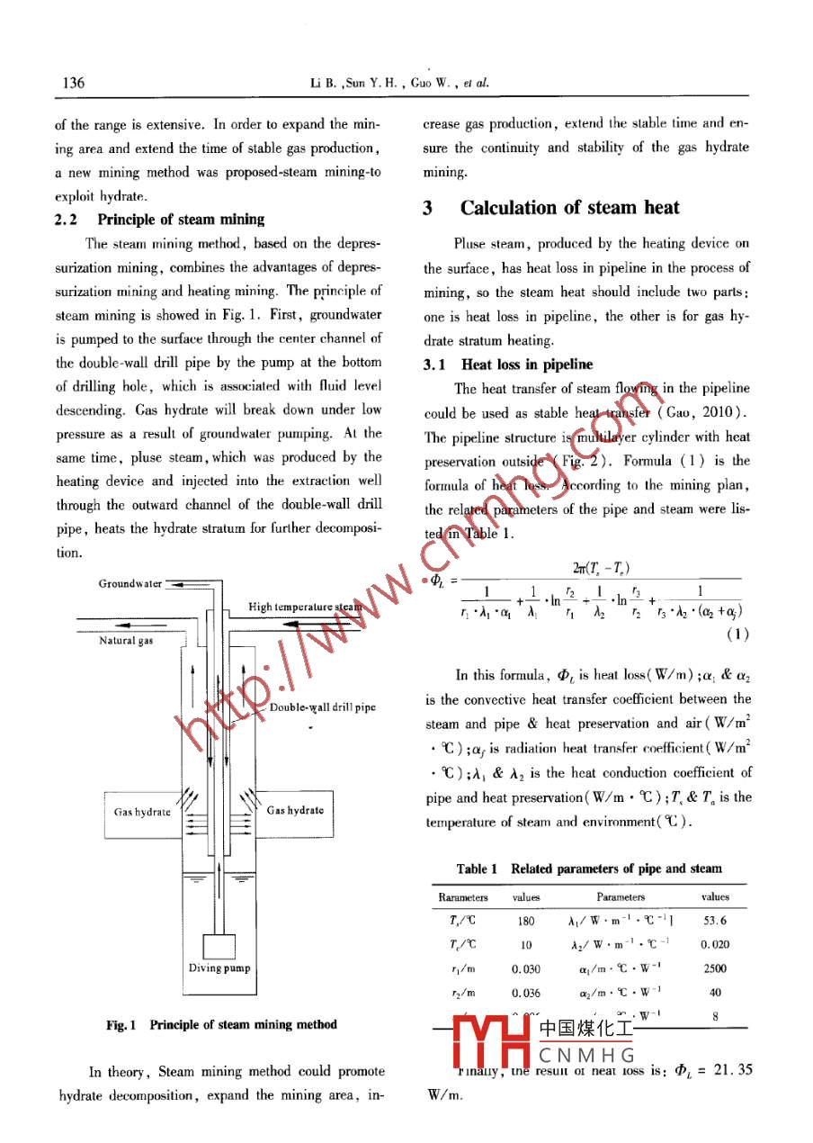 Global Geology,15(2):135-139(2012)doi:10.3969/isn.1673-9736.201202.08Article D:673-9736(2012)020135-05Heat calculation and numerical simulation in steam miningof permafrost gas hydrateLI Bing, SUN Youhong, GUO Wei and LI Kuan"21. College of Construction Engineering, Jilin University, Changchun 130026, China;2. Institude of Exploration Techniques, CAGS, Langfang 065000, Hebei, ChinaAbstract: Steam mining method was injecting hot steam into the borehole to heat the hydrate strata at the sametime of depressurization mining, which could promote further decomposition and expand mining areas of gas hy-drate. Steam heat calculation would provide the basis for the design of heating device and the choice of the fieldtest parameters. There were piping heat loss in the process of mining. The heat transfer of steam flowing in thepipe was steady, so the heat loss could be obtained easily by formula calculation. The power of stratum heatingshouid be determined by numerical simulation for the process of heating was dynamic and the equations were u-sually nonlinear. The selected mining conditions were 500-millimeter mining radius, 10 centigrade mining tem-perature and 180 centigrade steam temperature. Ileat loss and best heating power, obtained by formula calcula-tion and numerical simulation were 21. 35 W/m and 20 klKey words: gas hydrates; steam mining; heat loss; numerical simulation; best powerIntroductionmining plan, which has the independent propertyrights in China and is devoted to theGas hydrate is a new substitute for energy with hydrate mining, for the hydrate test mining project ingreat potential, green, large reserves, widely distribu- Qilian permafrost of China Geological Survey.ted,shallow burial and large energy density, which2 Steam mining methodplays an important role in alleviating the energy crisisfacing humanity( Liu, 2002). The only way, must be 2.1 Research status of mining methodspassed from endless r d projects to commercial exThe mining methods of gas hydrate include heaploitation of gas hydrate, is pre-production research ing mining, depressurization mining, chemical reaDallimore et al., 2005). Gas hydrate forms in lowgents mining, CO2 replacement method and so on(Wutemperature and high pressure environment Li et et al., 2008 ). Each mining method has its own supeal., 2011). The general idea of gas hydrate mining is riority and limitations. The depressurization mining isfirst breaking down the temperature and pressure equi-the most economical method, but always appears icclibrium conditions to promote hydrate decompositionms, Decause of the heat absorption in the decompoand then pumping the natural gas to the surface sition process of gas hydrate, which would obstruct the(Zhu,2006)further decomposition of the gas hydrate. The energyThe purpose of this paper is developing a set ofTH中國(guó)煤化工 ow in the thoughCNMHGReceived 5 Novemher 2011, aecepted 2 December 2011Supported by project of China Geological Surrey( No. GZHL201 10326)136Li B., Sun Y. H., Guo W., et al.of the range is extensive. In order to expand the mincrease gas production, extend the stable time and en-ing area and extend the time of stable gas productionsure the continuity and stability of the gas hydratea new mining method was proposed-steam mining-toexploit hydrate3 Calculation of steam heat2. 2 Principle of steam miningsteamining method, based on the depres-Pluse steam, produced by the heating device orsurization mining, combines the advantages of depresthe surface, has heat loss in pipeline in the process ofsurization mining and heaating miningmining, so the steam heat should include two partssteamis showed in Fig. 1. First, groundwater one is heat loss in pipeline, the other is for gas hyis pumped to the surface through the center channel of drate stratum hethe double-wall drill pipe by the pump at the bottom 3. 1 Heat loss in pipelineof drilling hole, which is associated with fluid levelThe heat transfer of steam flowing in the pipelinedescending. Gas hydrate will break down under low could be used as stable heat transfer(Gao, 2010)pressure as a result of groundwater pumping. At the The pipeline structure is multilayer cylinder with heatsame time, pluse steam, which was produced by the preservation outside( Fig. 2). Formula(1)is theheating device and injected into the extraction well formula of heat loss. According to the mining planthrough the outward channel of the double-wall drillthe related parameters of the pipe and steam were lis-pipe, heats the hydrate stratum for further decomposi- ted in Table 12m(T,-T)High temperature steam+-·ln-+·ln-+A·1A“n1A2“27起(a+aNatural gasIn this formula, is heat loss (W/m)ia &ais the convective heat transfer coefficient between theDouble-wall drill pipesteam and pipe heat preservation and air(W/mC); a, is radiation heat transfer coefficient (W/mC:A,& A, is the heat conduction coefficient ofpipe and heat preservation(W/m.C); T.& T is theGas hydrateGas hydratetemperature of steam and environment(tTable 1 Related parameters of pipe and steamParameters valuesParamelersvaluesTA℃53.6T℃A2/W·m1·℃-1Diving pumpr1/m0.0300.036Fig 1 Principle of steam mining method中國(guó)煤化工CNMHGIn theory, Steam mining method could promTHsresult or neat loss is: 21. 35hydrate decomposition, expand the mining area, in-W/mHeat calculation and numerical simulation in steam mining of permafrost gas hydrate137fine the temperature and pressure at the entrance is453 K and 1. 0 MPa, and the temperature of stratum273The power of steam is variable in numerical simulation. Four sets of simulation have been carriedfor 45 hours without stopping in this paper.Theing power is 5 kW, 10 kW, 20 kw and 50 kw.Thefollowing is the result of the four sets of numerical3.3.3BesTo be mined radius and temperature were set atFig 2 Pipeline structure0. 5 m and 10C. The results of the four sets of simulation show in Table 23.1 Numerical simulation of stratum heatingThe process of steam heating