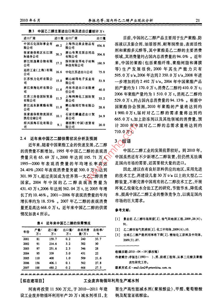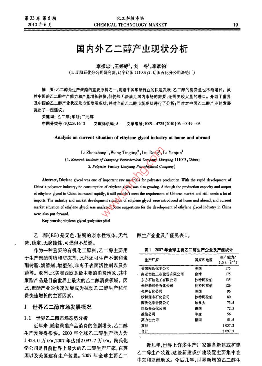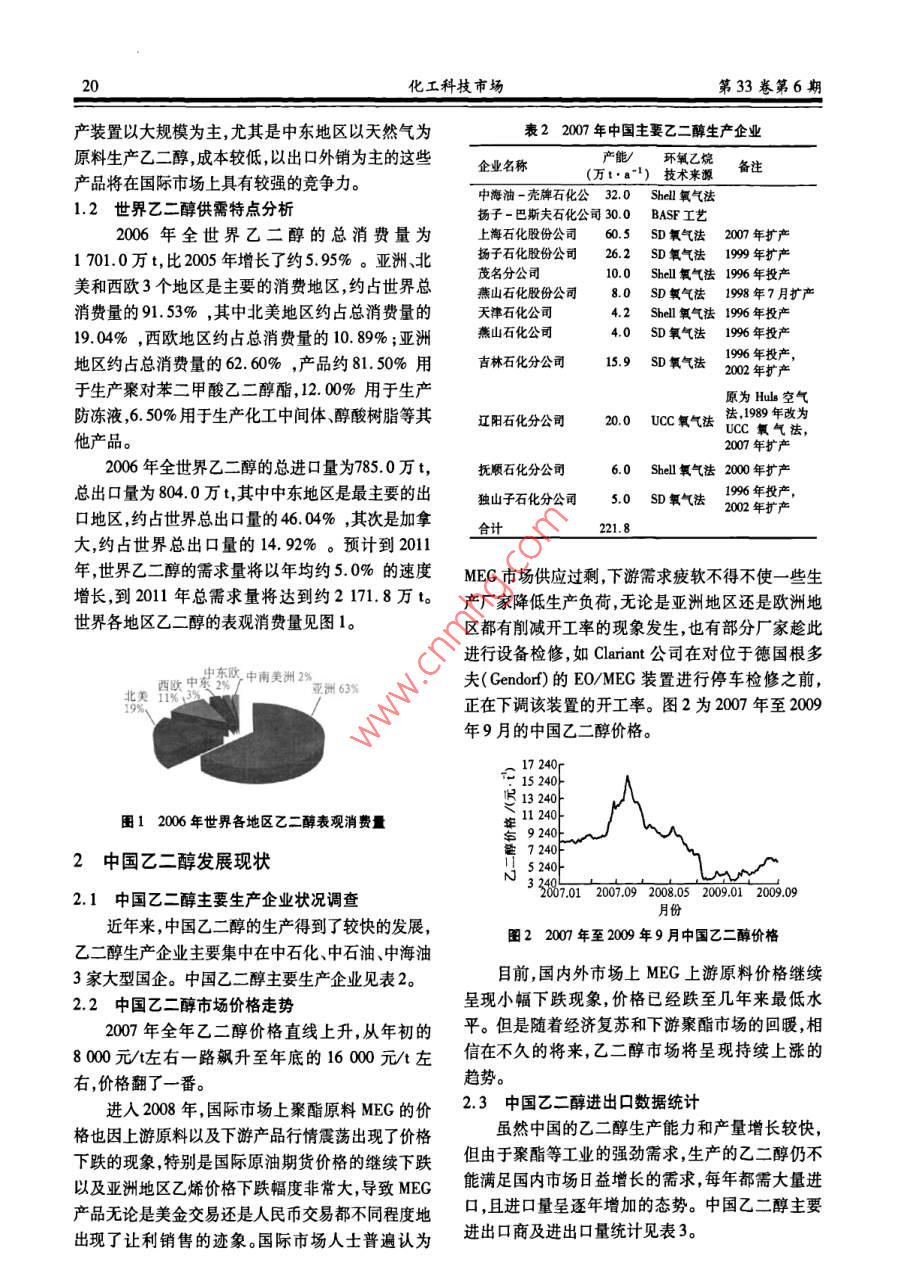 第33卷第6期化工科技市場2010年6月CHEMICAL TECHNOLOGY MARKET國內(nèi)外乙二醇產(chǎn)業(yè)現(xiàn)狀分析李振忠,王婷婷,劉冬1,李彥釣(1.遼陽石化分公司研究院,遼寧遼陽1110032.遼陽石化分公司滌綸廠)摘要:乙二醇是生產(chǎn)聚酯的重要原料之一,隨著中國聚酯行業(yè)的快速發(fā)展,乙二醇的消費量也不斷增長。雖然中國的乙二醇生產(chǎn)能力和產(chǎn)量增長較快但仍然無法滿足國內(nèi)市場的需要,還需要較大量的進(jìn)口。介紹了世界及中國的乙二醇產(chǎn)業(yè)狀況及市場發(fā)展現(xiàn)狀并對當(dāng)前乙二醇市場現(xiàn)狀進(jìn)行了分析;同時對中國乙二醇產(chǎn)業(yè)的發(fā)展提出了一些建議。關(guān)鍵詞:乙二醇;聚酯;二元醇中圖分類號:TQ223.162文獻(xiàn)標(biāo)識碼:A文章編號:1009-4725(2010)06-0019-03Analysis on current situation of ethylene glycol industry at home and abroadLi Zhenzhong, Wang Tingting,, Liu Dong, Li Yanjun(1. Research Institute of Liaoyang Petrochemical Company, Liaoyang 111003, China;2. Polyester Factory Liaoyang Petrochemical Company)Abstract: Ethylene glycol was one of important raw materials for polyester production. With the rapid development ofChina s polyester industry, the consumption of ethylene glycol was also growing. Although the production capacity and outputof ethylene glycol in China increased rapidly, it still couldn t meet the requirement of Chinese market and still needs a lot ofimports. The industry and market development situation of ethylene glycol were introduced at home and abroad, and currentmarket situation of ethylene glycol was analyzed. Some suggestions for the development of ethylene glycol industry in Chinawere alsoKey words: ethylene glycol; polyester; diol乙二醇(EG)是無色、黏稠的親水性液體,無氣醇生產(chǎn)企業(yè)及產(chǎn)能見表1。味,穩(wěn)定,無腐蝕性,可燃但不易燃。作為一種重要的有機化工原料,乙二醇主要用表12007年全球主要乙二醇生產(chǎn)企業(yè)及產(chǎn)能統(tǒng)計于生產(chǎn)聚酯樹脂和防凍劑,此外還可生產(chǎn)不飽和聚生產(chǎn)廠家國家和地區(qū)生產(chǎn)能力酯樹脂、潤滑劑、增塑劑、非離子表面活性劑以及炸(萬tb1)藥等。亞洲、北美和西歐是最主要的消費地區(qū),其中南亞塑膠工業(yè)股份有限公司臺灣聚酯產(chǎn)品是目前世界上最大的乙二醇消費領(lǐng)域。因東方石油化工有限公司沙特阿拉伯此,聚酯產(chǎn)業(yè)的快速發(fā)展成為拉動乙二醇生產(chǎn)和消朱拜勒聯(lián)合石化公司沙特阿拉伯美國費快速增長的主要因素。沙特延布石化公司沙特阿拉伯80陶氏化學(xué)合資公司加拿大1世界乙二醇市場發(fā)展概況巴斯夫石化公司德國準(zhǔn)信公司印度1.1世界乙二醇市場態(tài)勢分析英力士公司近年來,隨著聚酯產(chǎn)品消費的急劇增長,乙二醇其他0572生產(chǎn)發(fā)展得很快。2000年全球乙二醇生產(chǎn)能力為2097.71423.0萬va,2007年達(dá)到20977萬va。陶氏化學(xué)公司是目前世界上最大的乙二醇生產(chǎn)廠家,在英近幾年,世界上許多生產(chǎn)廠家準(zhǔn)備新建或擴建國以及美國建有生產(chǎn)裝置。200年全球主要乙二乙二醇生產(chǎn)裝置這些新建或擴建裝置主要集中在中東和亞洲地區(qū)。今后幾年,世界新增的乙二醇生化工科技市場第33卷第6期產(chǎn)裝置以大規(guī)模為主,尤其是中東地區(qū)以天然氣為表22007年中國主要乙二醇生產(chǎn)企業(yè)原料生產(chǎn)乙二醇成本較低,以出口外銷為主的這些企業(yè)名稱產(chǎn)品將在國際市場上具有較強的競爭力。(萬t·a1)技術(shù)來源備注中海油-殼牌石化公32.0Shel氧氣法1.2世界乙二醇供需特點分析揚子-巴斯夫石化公司30.0BASF工藝2006年全世界乙二醇的總消費量為上海石化股份公司60.5SD氧氣法200年擴產(chǎn)17010萬t,比2005年增長了約595%。亞洲、北揚子石化股份公司262D氧氣法199年擴產(chǎn)美和西歐3個地區(qū)是主要的消費地區(qū),約占世界總燕山石化股份公司80SD氧氣法1998年7月擴產(chǎn)消費量的91.53%,其中北美地區(qū)約占總消費量的天津石化公司42Shel氧氣法1996年投產(chǎn)19.04%,西歐地區(qū)約占總消費量的10.89%;亞洲燕山石化公司4.0SD氧氣法年投產(chǎn)地區(qū)約占總消費量的62.60%,產(chǎn)品約81.50%用吉林石化分公司159SD氧氣法于生產(chǎn)聚對苯二甲酸乙二醇酯,12.00%用于生產(chǎn)防凍液,6.50%用于生產(chǎn)化工中間體、醇酸樹脂等其遼陽石化分公司20.0Ucc氧氣法氣法他產(chǎn)品。007年擴產(chǎn)2006年全世界乙二醇的總進(jìn)口量為785.0萬t,撫順石化分公司6.0h氧氣法200年擴產(chǎn)總出口量為804.0萬t,其中中東地區(qū)是最主要的出獨山子石化分公司50SD氧氣法口地區(qū),約占世界總出口量的4604%,其次是加拿年擴產(chǎn)合計大,約占世界總出口量的14.92%。預(yù)計到2011年世界乙二醇的需求量將以年均約50%的速度MEG市場供應(yīng)過剩,下游需求疲軟不得不使一些生增長到2011年總需求量將達(dá)到約2171.8萬t。產(chǎn)廠家降低生產(chǎn)負(fù)荷無論是亞洲地區(qū)還是歐洲地世界各地區(qū)乙二醇的表觀消費量見圖1。區(qū)都有削減開工率的現(xiàn)象發(fā)生,也有部分廠家趁此進(jìn)行設(shè)備檢修,如 Clariant公司在對位于德國根多中南美洲2%亞洲63%夫( Gendorf)的EO/MEG裝置進(jìn)行停車檢修之前,正在下調(diào)該裝置的開工率。圖2為2007年至2009年9月的中國乙二醇價格。1724152401324圖12006年世界