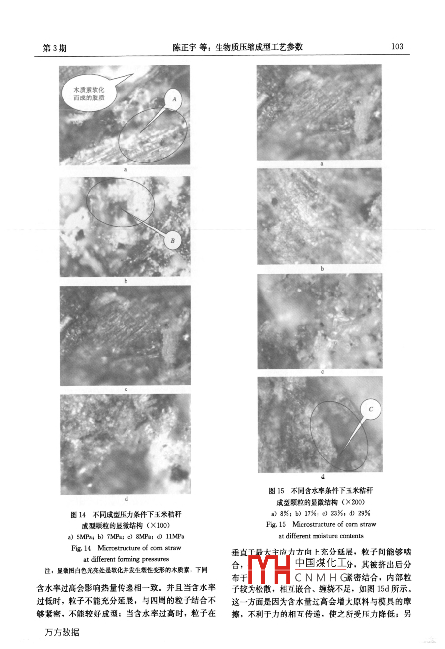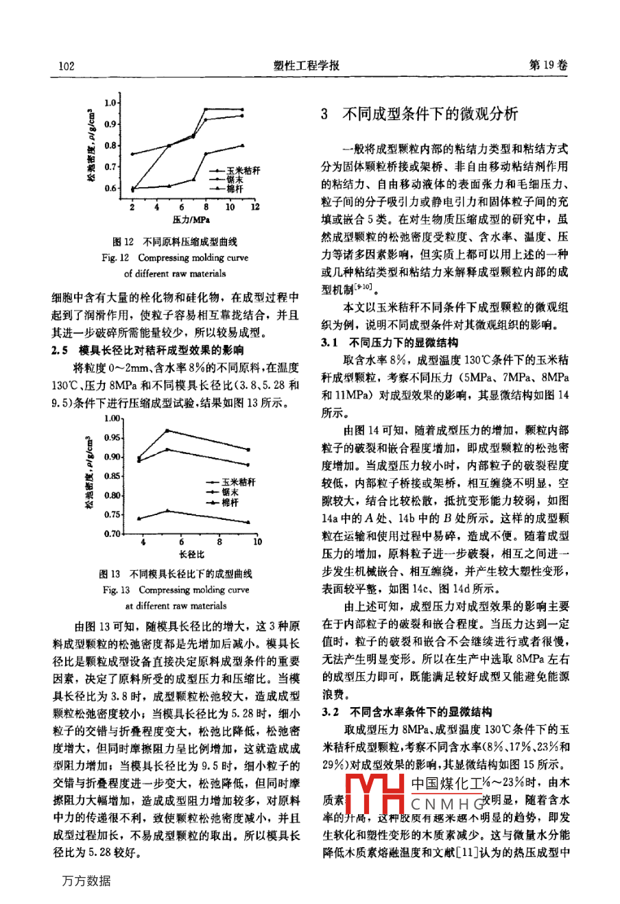 第19卷第3期塑性工程學報Vol 19 No. 32012F6H JOURNAL OF PLASTICITY ENGINEERING Jun. 2012doi:10.3969/.isn.1007-2012.2012.03.020生物質壓縮成型工藝參數(shù)機械科學研究總院先進制造被術研究中心,北京10063)陳正宇陸辛北京菲美得機械有限公司,北京1008)徐德民摘要:以玉米秸稈、鋸末、棉桿為原料,進行改進后熱壓縮成型工藝試驗,通過松弛密度這一指標得到最佳工藝數(shù)范圍;并利用 OLYMPUS BX51金相顯微鏡觀察玉米秸稈成型后顆粒的微觀形貌,從微觀角度研究成型工藝參數(shù)與成型塊微觀結構之間的關系。試驗結果表明,最佳參數(shù)范圍是,粒度0~2mm、含水率15%~23%、溫度130℃~150℃、長徑比5.28;以玉米秸稈為例,微觀形貌分析得出的最佳工藝參數(shù)范圍與試驗得出的基本一致。關鍵詞:生物質;熱壓成型;微觀形貌;松弛密度中圖分類號;TG385文獻標識碼:A文章編號:1007-2012(2012)03009807Technology parameters study of biomass compression moldingChEn Zheng-yu LUⅹin(Advanced Manufacture Technology Center China Academy of Machinery Science Technology, Beijing 100083 China)XU De-minBeijing Famed Mechinary Co., Ltd, Beijing 100068 ChinAhstract: Com straw, powder sawdust and cotton straw were referred as feedstock The improved heat forming experimentalstudy on the pelleting technology of the biomass materials was carried out and the best molding processing parameters scope wasgot by measuring relaxed density. The microcosmic structure of com straw pellet was ohserved through OLYMPUS BX51-metalographic microscope and the relationship between molding process parameters and forming microcosmic structure of corn strawpellet was studied from the microscopic view, The results show that the best molding processing parameters scope is as followsparticle size 0--2mm: moisture content 15%-23% temperature 130C-150C and aspect ratio 5. 28, which is basically incordance with microcosmic structure analysis.Key words: biomass; hot-forming: microcosmic structure; relaxed density但由于散碎的生物質原料不易收藏、運輸、儲存和引言使用,必須經(jīng)過一定的加工。壓縮成型技術是使生物質成型的重要技術,并可作為其他應用的預處理。近年,石油、煤炭價格大幅上漲,能源短缺十國內外學者做了大量的冷、熱態(tài)壓縮成型的試驗,分嚴重;同時,化石能源的大量使用引起了日益嚴以期找到最佳的成型條件。但無論是熱壓成型還是重的環(huán)境問題,開發(fā)適用的可再生能源產(chǎn)品已成為冷壓成型,都需要一定的溫度。冷壓成型時原料和當務之急。生物質能源是可以儲存、運輸?shù)目稍偕鷻C器部件之間的摩擦作用能使原料加熱到100℃左能源,是替代石化燃料的首選。生物質具有清潔、右,熱壓成型的加熱溫度一般在150℃~300℃之可再生、含S很低、CO2零排放、分布廣的特點。間。但冷壓成型所需壓力偏高,達幾十個兆帕;熱壓成型只有加熱到220℃~260℃范圍才能較快成國家自然科學基金資助項目(50875105)型陳正宇Emil:chencheng01@126.com中國煤化工備損壞嚴重,需要作者簡介:陳正宇,1986年生,男,河南濮陽人,機械CNMHG科學研究總院先進制造技術研究中心,碩土研究生,研究示、壓增雙坐⊥藝的特點,一定程方向為生物質固化成型工藝度上降低熱壓溫度、提高壓力。通過改進的熱壓成收稿日期:20120326;修訂日期:20120417型試驗,考察各項影響因素,找出最佳成型范圍第3期陳正宇等:生物質壓縮成型工藝參數(shù)并通過微觀角度探討不同成型條件下顆粒的微觀形13試驗過程貌,且與試驗結果做比較。通過改進熱壓成型工藝,1)分別選取自然干燥狀態(tài)下粒度為0~2mm、達到節(jié)能降耗、延長設備使用壽命的目的,從而增2mm~4mm的玉米秸稈,粉狀的鋸末和0~2mm的強生物質顆粒燃料的市場競爭力。棉桿備用;2)將自然干燥的原料放入干燥箱內,在120℃1生物質壓縮成型試驗士5℃下烘干2h后備用;3)取若干份干燥后原料,分別配水至含水率1.1試驗條件%、17%23%和29%并用黑色塑料袋封裝備用以前一年收獲的玉米秸稈、棉桿和木材加工殘4)通過電阻絲對模具進行加熱,達到設定溫度余鋸末為原料,并把自然干燥后的玉米秸稈和棉桿后,將配水后原料盡量多的放入模具中并搗實,加粉碎,使其粒度達到0~4mm。主要設備包括粉碎壓至設定壓力;保壓約1min,退模后即可得到成型機、TG328A分析天平、自制壓縮模具(見圖1)、顆粒,自然風干一段時間后(>2h),測量并計算OLYMPUS BX51-金相顯微鏡、熱電偶、游標卡尺、成型顆粒的松弛密度。10C2型電熱鼓風干燥箱等。14試驗的測定將模具內的成型顆粒退模,自然風干一段時間后,利用托盤天平和游標卡尺分別測量成型顆粒的質量和長度,計算成型顆粒的松弛密度:成型塊m成型顆粒的松弛密度/g/cm3m——成型顆粒的質量V—成型顆粒的體積/cm3圖1生物質成型模具d-成型顆粒的直徑/cmFig 1 Biomass forming moldl—成型顆粒的長度/cm1.2試驗方法針對影響生物質成型的主要因索,選擇玉米秸2試驗結果及分析稈、鋸末和棉桿進行成型試驗,研究粒度、成型壓力、含水率、溫度、原料和模具長徑比對生物質壓2.1原料粒度及成型壓力對秸稈成型效果的影響縮成型效果的影響,確定最佳壓縮成型工藝參數(shù)。將粒徑0~2mm和2mm~4m的玉米秸稈,試驗完成后,以玉米秸稈為例,選取不同成型條件0~2mm的棉桿、粉狀的鋸末,在溫度130℃、含水下的成型顆粒進行微觀分析。率8%、長徑比5.28條件下,分別處于2MPa取一定量原料,在達到設定溫度時,把自然干sMPa、MPa、8MPa和1lMP壓力下進行成型試燥