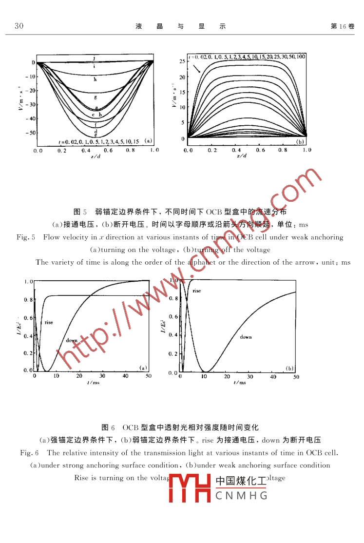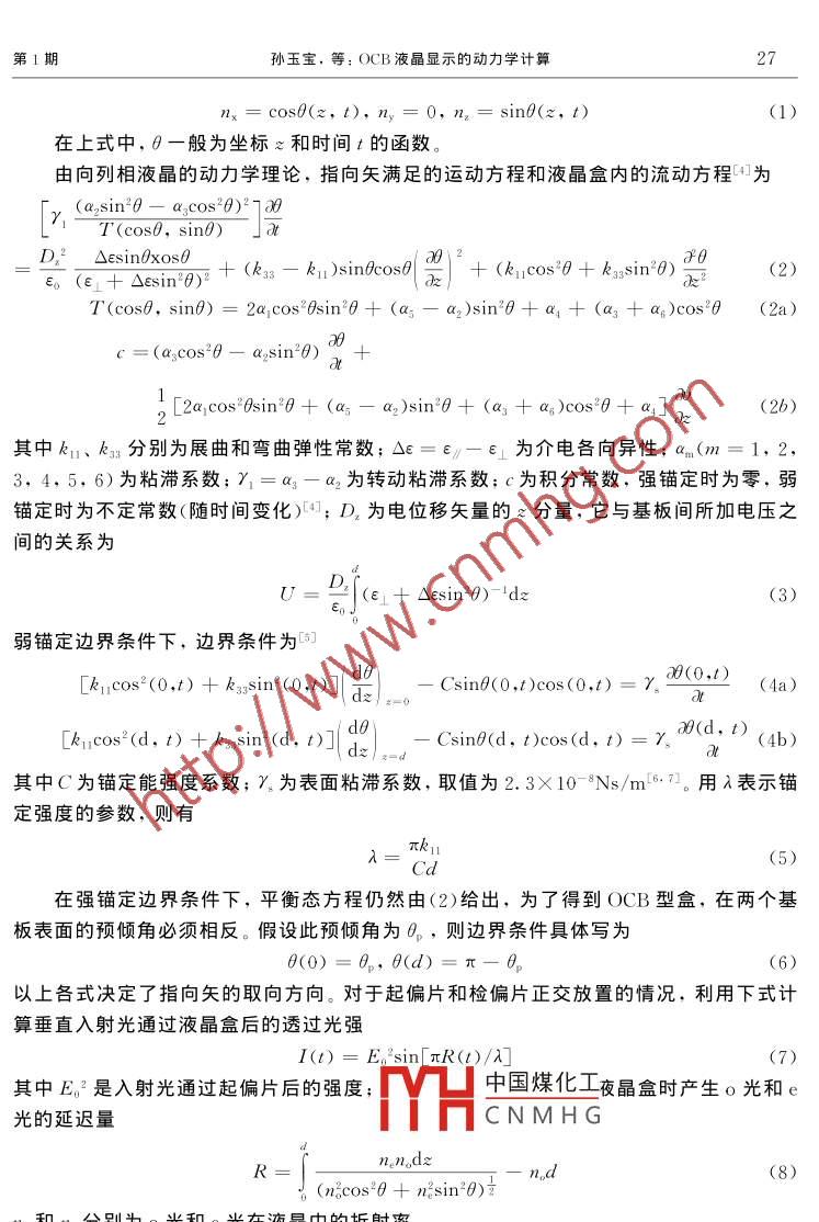 第16卷第1期液晶與顯示2001年3月Chinese Journal of Liquid Crystals and DisplMar,2001文章編號:1007-2780(2001)01-OCB液晶顯示的動力學計算孫玉寶,范志新,張志東(河北工業(yè)大學物理系,天津300130)晶動力學理論為基礎,考慮引流效應后,計算在強錨定和弱錨定邊界條件下的OCB型盒中的指向矢分布和流動速度分布,給岀透射光相對強度隨時間變化有預傾角情況下的透射光相對強度。計算結果表明,OCB盒較平行排列盒和HAN盒具有更快的響應速度關鍵詞:OCB盒;響應速度;透過率中圖分類號:O753.2文獻標識碼:A引言如何提高液晶顯示的響應速度,一直是LCD技術的重要課題。在提高LCD響應速度的研究中,鐵電液晶顯示、反鐵電液晶顯示和混合排列向列相液晶顯示(HANLCD),已得到人們的充分認識。最近日本東北大學內田教授提出了 opticallycompensated bend(OCB)顯示模式,它擁有很快的響應速度23。OCB是一種新穎的顯示方式,在它的兩個基板處,液晶分子排列方向相反,并且有定的預傾角,而在中間層,液晶分子呈垂直狀態(tài),且在兩極板間分子排列連續(xù)變化(見圖1)。本文考慮了引流效應,研究OCB-LCD的指向矢分布和流速分布,并給出了此種液晶盒的光透過率隨時間的變化曲線,從數(shù)值計算上給出OCB盒具有高速響應的證明2指向矢的運動方程和光透過率方程OCB液晶盒的示意圖如圖1所示,作為比較,圖中同時給出平行排列盒的結構。液晶盒厚為d,用角度θ描寫指向矢的方向流動方向中國煤化工圖1電控雙折射盒示意圖和指CNMH平行型盒ig. 1 Schematic diagram of ECB cell and the director coordinate system.(a)oCB cell;(b)Homogeneous cell收稿日;修訂日期:2000-10-29基金項目士基金資助項目第1期孫玉寶,等:OCB液晶顯示的動力學計算s6(z, t),n,=0, n,= sinb(e, t)(1)在上式中,θ一般為坐標z和時間t的函數(shù)由向列相液晶的動力學理論,指向矢滿足的運動方程和液晶盒內的流動方程φ為(a,sin26-a3cos0)2780D,2△ esinexos0so(e1+△esin2)+(k33-kusinecose次)+(k1C0+k1sim0)可T(cose, sing)=2a,cos2Asin20+(a-a,)sin 0+a,+(as+as)cos 0 (2a)c=(ascos 0-a,sin20)n.+2[2a, cos Osin 0+(as-a2 )sin'0+(a3 +a, )cos 0+a,(2b)其中k1、k3分別為展曲和彎曲彈性常數(shù);△e=-E為介電各向異性;an(m=1,23,4,5,6)為粘滯系數(shù);%1=α3-α2為轉動粘滯系數(shù);c為積分常數(shù),強錨定時為零,弱錨定時為不定常數(shù)(隨時間變化);D,為電位移矢量的z分量,它與基板間所加電壓之間的關系為DU=J(c1+△sin)d弱錨定邊界條件下,邊界條件為[ucos(0, t)+k3 sin(0, )7/doSine(o, t)cos(0,t)=ya(0,1)(4a)Lkucos'(d, t)+k33sin (d, t)]- Sine(d. t)cos(d. t)=yao(d, t)a(4b)其中C為錨定能強度系數(shù);γ為表面粘滯系數(shù),取值為2.3×10-8Ns/m16·7。用λ表示錨定強度的參數(shù),則有(5)在強錨定邊界條件下,平衡態(tài)方程仍然由(2)給出,為了得到OCB型盒,在兩個基板表面的預傾角必須相反。假設此預傾角為。則邊界條件具體寫為0()=0,6(d)以上各式?jīng)Q定了指向矢的取向方向。對于起偏片和檢偏片正交放置的情況,利用下式計算垂直入射光通過液晶盒后的透過光強1(t)= En sin[πR()/其中E2是入射光通過起偏片后的強度;中國煤化工夜晶盒時產(chǎn)生o光和e光的延遲量CNMHGnn,d2R(8)(n2cos20+ nesin20n和n分落和e光在液品中的折射率。液晶與顯示3數(shù)值結果實驗上對液晶盒基板反平行摩擦實現(xiàn)OCB顯示,數(shù)值計算中反映為盒中央(ε=d/2)處傾角為π/2,并可用邊界條件0(0)=0,0(d)=π來實現(xiàn),因此取。=0計算并不是一般性。在計算中,我們以平行盒的閾值電壓U=π(k1/E0△e)≈0.87作為標度,并取電壓為U′U=6.0。取盒厚為10μm,其它參數(shù)如表1所列,分別得到強錨定和弱錨定邊界條件下(錨定強度參數(shù)λ=0.1)的指向矢分布、流速分布和相應的光透過率。圖2、圖3分別為強錨定和弱錨定邊界條件下的盒內液晶指向矢分布。圖4、圖5為加電壓2.5:=00,0.5,2,5,10,20.,30,50,100r=0.0,0.5、L2,3,4,5,10圖2強錨定邊界條件下,不同時間下OCB型盒中的指向矢分布(a)接通電壓,(b)斷開電壓。時間沿箭頭方向順延,單位:msig 2 Director orientation at varif time in ocb cell under stanchoringsurface condition (a)turning on the voltage,(b )turning off the voltageThe variety of time is along the direction of the arrow, unit: ms表1計算中用到的液晶材料參數(shù)Table 1 Material parameter of the liquid-crystal in the computation [4參數(shù)參數(shù)1.2×10-3N·m·s中國煤化工·m·sCNMHG和斷開電壓時,液晶盒內的液晶流速分布。由圖可見:OCB盒上下基板處的液晶流動的方向與盒內部的流動方向是相同的。OCB盒中的這種液晶流動特性會加速盒內液晶分子的排列穩(wěn)定,于是呈現(xiàn)快速響應的特性,并且強錨定條件下的響應速度要好于弱錨定(見光透過暫變化圖6)。在圖7中,我們利用文獻[2]中的數(shù)據(jù),令U=6.0V,盒第1期孫玉寶,等:OCB液晶顯示的動力學計算厚為6μm,其它數(shù)據(jù)與前面相同,計算了強錨定邊界條件下,不同預傾角的光透過率隨時間的變化,可以看到:在預傾角增大時,上升響應時間減小,最大透過率增大;下降響應時間變化不大,光透過率下降后反彈減小。從響應時間上與文獻[2]中所描述的響應速度完全相符(b)t=0.0,0.5,2,5,10,20.30,500圖3弱錨定邊界條件下,不同時間下OCB型盒中的指向矢分布(a)接通電壓,(b)斷開電壓。時間沿箭頭方向順延,單位:msFig 3 Director orientation at various instants of time in OCB cell under weak anchoring surfacedition(a) turning on the voltage, (b)turning off the voltageThe variety of time 