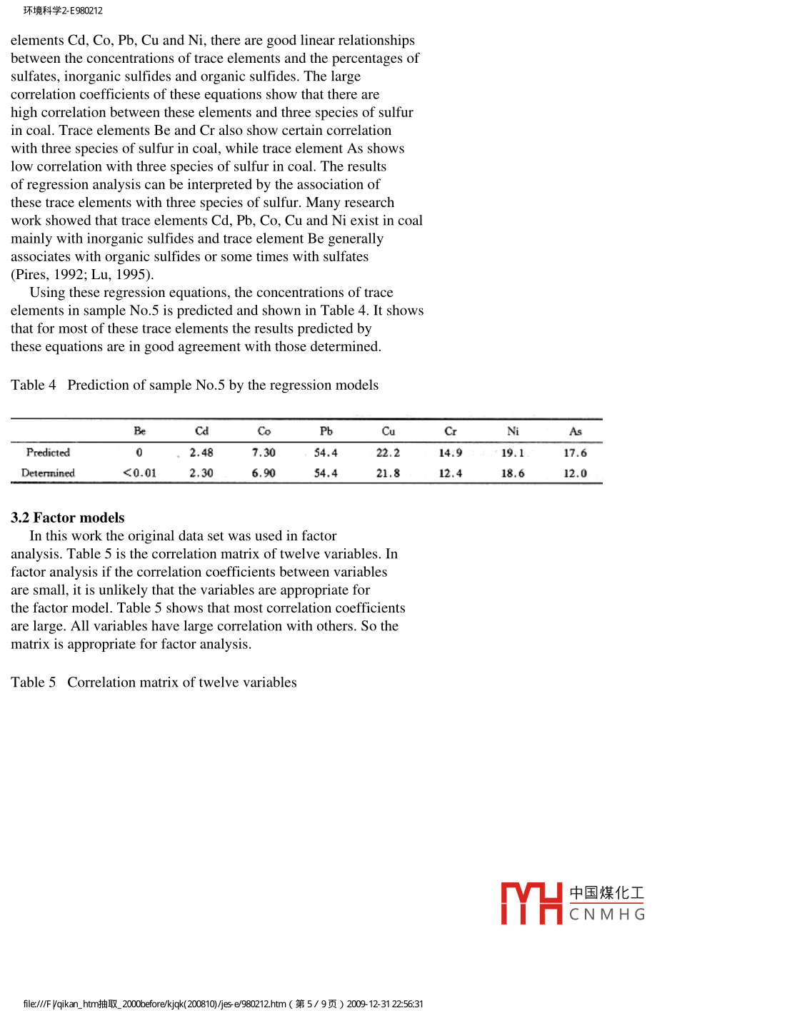 環(huán)境科學(xué)2E980212ENVIRONMENTAL SCIENCES科技期刊環(huán)境科學(xué)1998年6月第10卷第2期Modelling of the relationship between trace elementsand three species of sulfur in coal"eLu Xiaohua. Zeng hancaiNational Key Laboratory of Coal Combustion, Huazhong Universityof Science and Technology, Wuhan 430074, ChinaWei Lu-xianCenter of microanalysis wulan University of automobile Industry Euhan, chinaAbstract--Based on the determination of several trace elements incoal particulate of different specific gravity, three-variablesregression equations relate the contents of trace elements Be, CdCo, Pb, Cu, Ni, As and three species of sulfur in coal were wellestablished. For elements Cd. Co Pb Cu and ni. the regressioequations were successfully used for prediction of these traceelements in individual part of coal with different specificgravity. Factor analysis was also used to analyze the data setsThe results showed that a three factor model can interpret the datasets reasonably. Trace elements Cd, Co, Pb, Cu, Ni, inorganicsulfide and total sulfur in coal are high correlated with the firstfactor. Trace elements Be, sulfate and organic sulfide are highcorrelated with the second factor and trace elements cr and as arehigh correlated with the third factor The factors can beinterpreted by the chemical properties of these elementsKeywords: trace elements; coal; regression analysis; factor analysis1 IntroductionCoal combustion produces not only large amount of gaseouspollutants but also large quantity of particulate matter. Theparticulate matter emitted through the stack is the most importantsource of trace heavy metals in atmosphere because of theenvironmental impact of heavy metals, there is a growing interestin the study of trace elements in coal(Solari, 1989; Evans, 1990;Skeen, 1990). From mine to combustion, various trace elements incoal are released into environment and most of them are potentiallytoxic to plants and animals under certain conditions andconcentrationsThe concentration and distribution of trace elements in coalare important for prediction of their behavior on release intoatmosphere when coal is burnt. Different trace elements behavedifferently in coal combustion. Generally trace elements associated中國煤化工with the organic matter and inorganic sulfides volatilize morereadily in coal combustion and are enriched in the submicrometerCNMHGfly ash by volatilization and condensation mechanisms (Linak, 1986Flagan. 198fle∥/ F yqikan_ htm抽取200 before/kjgk(2010)/jee/980212htm(第1/9頁)200912-312256:31環(huán)境科學(xué)2E980212Depending on their chemical properties and the physicochemicalprocesses which occur during the coal formation, trace elements canexist in the mineral matter, in the organic matter or in both(Nichols, 1968; Raask, 1985). There have been several studies onthe concentration and distribution of trace elements in coalGluskoter et al.(Gluskoter, 1974) proposed an empirical method todetermine the affinity of trace elements with the organic coalmatter. Regression analysis and factor analysis are multivariablestatistical methods commonly used in studying the correlationrelationship between variables. Solari et al. (Solari, 1989)developed a multivariable regression model for the partialconcentration of trace elements in the organic and inorganicmatter Using Solaris model, Pires and Teixeira(Pires, 1992)studied the concentration and association of these elements in theorganic, sulfide and non sulfide fractions of Leao coal Factoranalysis was used to study the distribution of trace elements inseven Chinese coals and the mathematical interpretation was provedby the experimental results (lu, 1995). The results of thesestatistical method showed the relationship between trace elementsand the organic and inorganic substances in coal. Up to now,noresearch work on the relationship between the contents of traceelements and three species of sulfur in coal was reported. In orderto study the relationship between trace elements and differentspecies of sulfur and to assess the environmental effects of traceelements produced from coal combustion, in this work, based on thedetermination of some trace elements in particulate of coal withdifferent specific gravity, regression analysis and factor analysisare used for modelling the relationship between the contents oftrace elements and three species of sulfur in coal particular ofdifferent specific gravity in this paper. The results of this paperare of significance for the investigation of decreasing theheavymetal pollution of atmosphere caused by coal combustion2 Experimental2.1 Classification of coal into different specific gravityA coal sample of Qingshan bituminous was crushed to an averageparticle size of 50-60 F m. Six solvents of different specificgravity(Table 1)were used for sequential classification of coaland seven samples of different specific gravity were obtained. Ineach step, the coal powder on the upper part of the solvent wascollected and the bottom part was used in the next stepTable 1 Preparation of solutions with different specific gravity6CompositionCohsOHHoOCH,CI,CCICCl4+Ch3IChaIc gravity071001.30160中國煤化工CNMHG2.2 Determination of trace elements and three species of sulfur inThe seven samples of different specific gravity were digestedfle∥/ F yqikan_ htm抽取2000 efore/kjgk(2010)/jee/980212htm(第2/9頁)200912-312256:31環(huán)境科學(xué)2E980212and then the trace elements be. cd co pb. cu ni cr and as weredetermined by ICP-aeS and gFAAs. The sulfate(sOn) and total sulfur(TS)were determined by BasOa gravimetry and inorganic sulfur (Is)was determined by k2 Cr2O7 oxidation-reduction titration(Bai1990)The organic sulfide(os) was calculated by subtraction2.3 ComputationThe computer programs of regression analysis and factoranalysis in the advanced statistical package SPSS/PC+(Norusis,1986)were used to analyze the data sets3 Results and discussionsThe concentrations of tr