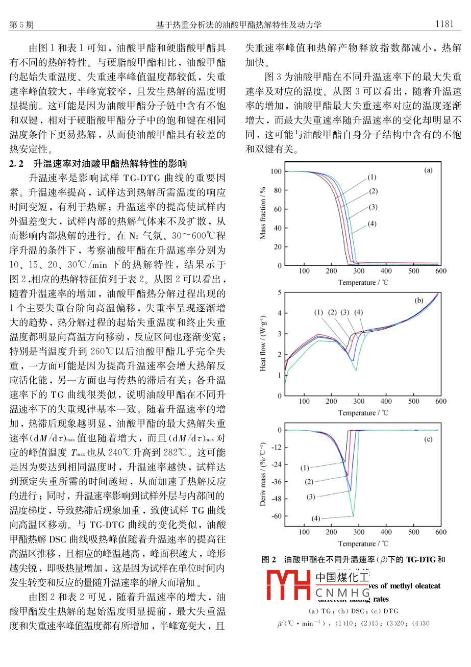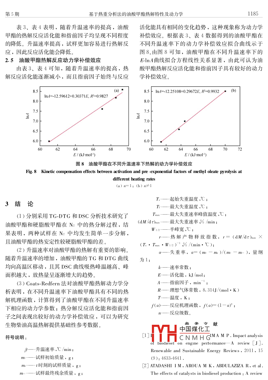 石油學報(石油加工2015年10月ACTA PETROLEI SINICA (PETROLEUM PROCESSING SECTION第31卷第5期文章編號:1001-8719(2015)5-1179-0基于熱重分析法的油酸甲酯熱解特性及動力學王學春2,方建華,陳波水,王九,吳江(1.后勤工程學院軍事油料應用與管理工程系,重慶401311;2.武警杭州士官學校車輛維修系,浙江杭州310007)摘要:釆用熱重分析儀硏究了油酸甲酯和硬脂酸甲酯的熱解特性,獲得了油酸甲酯在不同升溫速率(10、15、2030℃/min-)下的 TG-DTG、DsC曲線,并通過熱分析數(shù)學方法獲得熱解動力學擬合參數(shù)。結果表明,油酸甲酯的熱解過程為簡單的一步分解,相比硬脂酸甲酯具有較差的熱安定性;提高升溫速率,熱解區(qū)間往高溫區(qū)移動,熱解活化能和指前因子具有較好的補償效應;油酸甲酯在不同升溫速率下具有不同的熱解反應機理函數(shù)關鍵詞:油酸甲酯;熱重分析;熱解;動力學中圖分類號:TQ050.4文獻標識碼:Adoi:10.3969小isn.1001-8719.2015.05.022Pyrolysis Characteristics and Kinetics of Methyl Oleate Based on Thermo-Gravimetric AnalysisWANG Xuechun", FANG Jianhua, ChEN BoShui, WANG Jiu, wU Jiang(1. Department of Military Oil Appla diaversagoing 401311, China2.Hu NCO Academy of CA PF. Hangzhou 310007, ChiAbstract: Pyrolysis characteristics of methyl oleate and methyl stearate were conducted in thermgravimetric analyzer to obtain their TG-DTG and DSC curves at different hating rates (10, 15, 2030C/min). Pyrolysis kinetic fittirmethodology. The results showed that py rolysis of methyl oleate was a simple one-stepdecomposition, w hich had a relatively worse stability of pyrolysis, compared with methyl stearateThe main pyrolysis region of methyl oleate shifted to the higher temperature,w hen hating rate wasraised. Moreover, the pyrolysis activation energy and pre-ex ponential factor presented a goodcompensation effect, which also indicated that the py roly sis reaction mechanism function wasdifferent at different heating ratesKey words: methyl oleate; thermo-gravimetric analy sis pyrolysis; kinetics能源消耗量日益増加以及礦物燃料的日趨枯竭,飽和脂肪酸甲酯組成,是多種脂肪酸甲酯的混合物,迫切要求快速發(fā)展新型石油替代能源。生物柴油作其脂肪酸碳鏈通常含有14-18個碳原子;從分子結為一種新型能源,具有清潔、儲量大、可再生和環(huán)構看,生物柴油一般為直鏈分子,除少量飽和脂肪境友好的特點,且具有與石化柴油相近的燃料特性,酸甲酯之外,一般含有1個以上的雙鍵。生物柴油已受到世界各國的普遍關注。從化學組成看,生分子中含有大量的不飽和脂鏈,在高溫下很容易發(fā)物柴油一般由油酸甲酯、亞油酸甲酯、亞麻酸甲酯生熱裂解反應,其裂解小分子產物可誘導發(fā)動機油等不飽和脂肪酸甲酯和軟脂酸甲酯、硬脂酸甲酯等變質中國煤化工、腐蝕性增大、清凈CNMHG收稿日期:2014-05-26基金項目:國家自然科學基金項目(51375491)、重慶市自然科學基金(CSTC,2014 JCYJAA50021)和院創(chuàng)新基金資助項目(YZ13-43703)資助第一作者:王學春,男,碩士硏究生,從事環(huán)境友好潤滑劑及添加劑的硏究通訊聯(lián)系人:方建華,男,教授,博士,主要從事環(huán)境友好潤滑劑及添加劑的研究;F-mal:fangjianhua7123asina.com石油學報(石油加工)第31卷分散性變差,甚至引起燃料系統(tǒng)結膠、過濾器和噴產SDTρ60綜合熱重分析儀對油酸甲酯和硬脂酸油嘴堵塞等問題,因此,研究不飽和脂肪酸甲酯的甲酯進行熱重分析(TG-DSC)。在50mL/min的高熱解特性,對生物柴油的應用具有重要的指導意義。純N2保護下,從室溫以不同速率升溫至600℃,樣目前,已有關于柴油發(fā)動機燃用生物柴油導致品質量5~7mg的發(fā)動機潤滑油性能衰變問題的研究3,但大多局限于從宏觀上描述生物柴油引起的發(fā)動機油常規(guī)理2結果與討論化指標和性能變化,缺乏從單脂肪酸甲酯結構方面2.1油酸甲酯和硬脂酸甲酯熱解特性深入研究其熱解衰變的化學本質。因此,研究生物圖1為硬脂酸甲酯和油酸甲酯在升溫速率(β)柴油中主要不飽和組分的熱解動力學,可以為整個10°℃/min、50mL/minN2氣氛下熱解的TG-DTG、生物柴油的動力學研究提供基于單脂肪酸甲酯熱解DSC曲線,它們的熱重特性參數(shù)列于表1的特性參數(shù),以建立動力學模型或判據(jù)。在本研究由圖1可見,硬脂酸甲酯DTG曲線上的1個峰中,利用熱重分析儀分析油酸甲酯和硬脂酸甲酯的(起始溫度218.88℃,峰值溫度261.12℃)與TG曲熱降解特性,并進行比較,同時在不同升溫速率下線上的1個失重臺階相對應,同時也和DSC曲線上考察油酸甲酯的熱降解特征值;通過 Coats- Redfern的第2個吸熱峰(起始溫度203.65℃,峰值溫度積分法分析油酸甲酯熱解動力學,確定了反映266.53℃)相對應。至于DSC曲線上的第1個吸熱峰其熱解歷程的反應動力學參數(shù)(起始溫度31.91℃,峰值溫度37.99℃)由硬脂酸甲1實驗部分酯的熔融引起,因為硬脂酸甲酯在38℃左右發(fā)生了相變(硬脂酸甲酯的熔點為38℃)。由此可知,在1.1油樣600℃以下硬脂酸甲酯僅發(fā)生簡單的一步熱分解過程油酸甲酯、硬脂酸甲酯均為分析純試劑。同硬脂酸甲酯相似,油酸甲酯的DTG曲線上只有1.2實驗方法1個相當大的失重峰(起始溫度210.58℃,峰值溫度采用美國范德比爾特公司和日本東京旭日公司248.95℃),與TG曲線上只有1個失重臺階相對應。(a)0DTG&80F DTGDSCDSO266.53℃10三工2-1.526l.12℃249.63℃254.36℃100200300400500600-1.510020030040000600圖1硬脂酸甲酯和油酸甲酯在N2氣氛下的 TG-DTG和DSC曲線Fig 1 TG-DTG and dsc curve