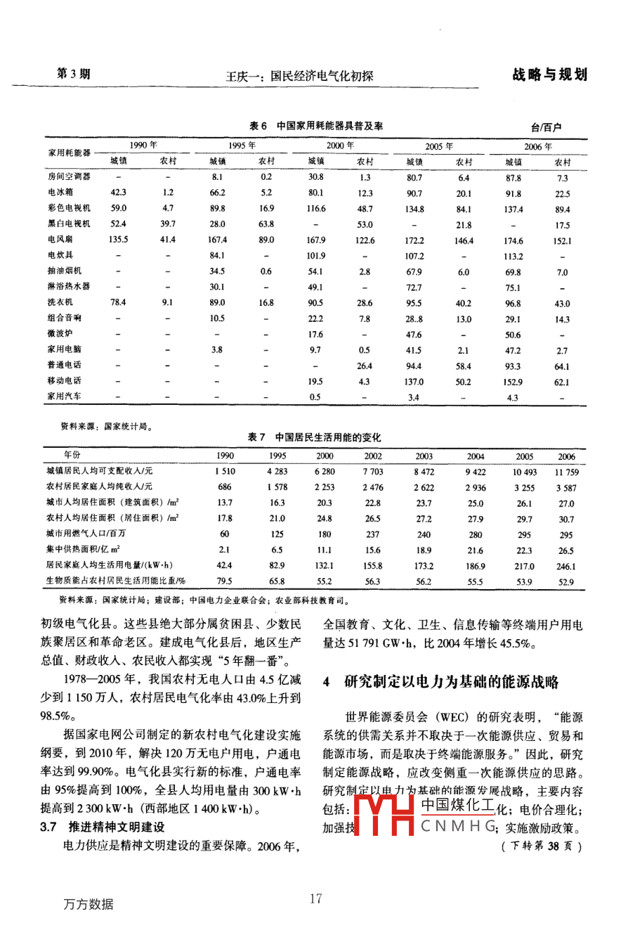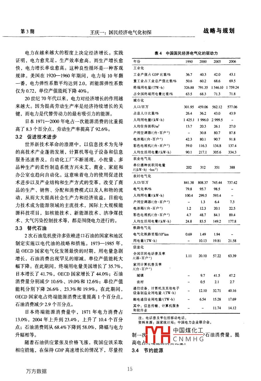 戰(zhàn)略與規(guī)劃第20卷第3期電力技術(shù)經(jīng)濟(jì)Vol 20 No. 32008年6月Electric Power Technologic EconomicsJun.2008文章編號(hào):1008-1682(200803001206國(guó)民經(jīng)濟(jì)電氣化初探王慶一煤炭信息研究院,北京100029)摘要:綜述了電氣化對(duì)促進(jìn)經(jīng)濟(jì)增長(zhǎng)、改善生活質(zhì)量、節(jié)能、代油等重要意義,論述了工業(yè)化、城市化、信息化和新技術(shù)是推動(dòng)電氣化迅速發(fā)展的動(dòng)力。我國(guó)應(yīng)該研究制定以電力為基礎(chǔ)的能源發(fā)展戰(zhàn)略和電氣化計(jì)劃。關(guān)鍵詞:電氣化;節(jié)能;石油替代;能源戰(zhàn)略中圖分類號(hào):TK018文獻(xiàn)標(biāo)識(shí)碼:Banalysis of Electrification on National economyWANG Qing(Coal Information Institute, Beijing 100029, China)Abstract: This paper summarizes significant benefits of electrification in advancing economical growth, improvingliving quality, energy conservation and substitution of petroleum, and concludes that industrialization, urbanizationinformation revolution and new technology are among the major driving force of electrification. It proposes that a newenergy strategy based on electricity be sophisticatedly studied and drawn upKey words: electrification; energy conservation; substitution of petroleum; energy strategy1國(guó)民經(jīng)濟(jì)電氣化的概念及度量能源署(IEA)的統(tǒng)計(jì)方法,包括煤炭、石油、天然氣、核能、水能和其他可再生能源,折算成油當(dāng)量電氣化可定義為能源需求向電力轉(zhuǎn)化的過程,(或標(biāo)準(zhǔn)煤,即煤當(dāng)量)相加,即發(fā)電消耗的能源也就是用電力替代其他形式能源并帶動(dòng)電力需求不量。發(fā)電能源和一次能源消費(fèi)量中核電和水電的當(dāng)斷增長(zhǎng)的過程。電氣化程度,即社會(huì)經(jīng)濟(jì)發(fā)展對(duì)電量換算系數(shù)為10893kaWh)和3595kJ/kWh。力的依賴程度,通常用2個(gè)指標(biāo)來衡量:一是發(fā)電電力為終端用電量,等于發(fā)電量減去廠用電和能源占一次能源總消費(fèi)量的百分比,它反映電力在線路損失量,按電熱當(dāng)量折算成標(biāo)準(zhǔn)煤。終端能源能源系統(tǒng)中的地位;二是電力占終端能源總消費(fèi)量消費(fèi)量應(yīng)按國(guó)際通行的能源平衡定義和計(jì)算方法計(jì)的百分比,用來度量各類用戶的電力消費(fèi)水平,說算:一次能源消費(fèi)量扣除加工、轉(zhuǎn)換、貯運(yùn)損失和明電力對(duì)社會(huì)經(jīng)濟(jì)發(fā)展的作用。此外,居民電氣化能源工業(yè)消耗的能源,電力按電熱當(dāng)量折算成標(biāo)準(zhǔn)率、人均用電量、人均生活用電量等,也是衡量電煤。中國(guó)綜合能源平衡表按發(fā)電煤耗法和電熱當(dāng)量氣化程度的重要指標(biāo)。法列出2組數(shù)據(jù);發(fā)電煤耗法未扣除火力發(fā)電能源發(fā)電能源占一次能源總消費(fèi)量比例,按照國(guó)際損收稿日期:2008-02-20作者簡(jiǎn)介:王慶-(1935-),男,江蘇張家港人,研究員,長(zhǎng)期從事能源政策研TYH中花熱當(dāng)量法扣除了發(fā)CNMHGE-mail:wangqingyi2008@sina.com第3期王慶一:國(guó)民經(jīng)濟(jì)電氣化初探戰(zhàn)略與規(guī)劃電損失,但未扣除能源工業(yè)消耗的能源,扣除這部出2005年全國(guó)終端能源消費(fèi)量為13069Mce,終分能源,即為符合國(guó)際準(zhǔn)則的終端消費(fèi)量。計(jì)算得端用電量為2667Mtce,占終端能源消費(fèi)量的204%(未扣除輸配損失),2004年為185%,與日本能源表1部分國(guó)家和地區(qū)電力占終端能源消費(fèi)比重經(jīng)濟(jì)研究所計(jì)算得出的數(shù)據(jù)相同(詳見表1)。部分年份19901995200020012002200320042005中國(guó)86112163172184182185192家和地區(qū)國(guó)民經(jīng)濟(jì)電氣化主要指標(biāo)如表2所示。中國(guó)臺(tái)灣省20823427.325525225.725.826.9特別行政區(qū)28259262中國(guó)香港28.529.529.7282電氣化的驅(qū)動(dòng)力美國(guó)17318819219219619520.022.1226023.722823.123.724.1電力可以實(shí)現(xiàn)各種形式能源的相互轉(zhuǎn)換,所有德圍15816117417617:81591511一次能源都能轉(zhuǎn)換成電力。實(shí)際上,電力是可以大荑國(guó)162167176177181180179183規(guī)模利用低質(zhì)煤、核能和水能生產(chǎn),并且是替代石法國(guó)17617819719520204208206油、天然氣等優(yōu)質(zhì)能源的唯一的二次能源形式。電意大利15716617918218014175力可大規(guī)模生產(chǎn),遠(yuǎn)距離輸送,在分配系統(tǒng)中可無(wú)加拿大22321.821.722.121.821521.8限劃分。電力使用十分方便,可精密控制。電力的澳大利亞19.119421323022623.123.2俄羅斯12613.013.013.1134這些特性使它在各國(guó)經(jīng)濟(jì)社會(huì)發(fā)展中獲得廣泛應(yīng)用墨西哥97410.715115.114313.814電氣化的驅(qū)動(dòng)力主要是工業(yè)化、城市化、信息韓國(guó)127133159166187193200210化、農(nóng)業(yè)和農(nóng)村電氣化以及新技術(shù)的應(yīng)用。度15318118319318919719820621工業(yè)化印尼65859.510210010510911.020世紀(jì)90年代初,我國(guó)開始新一輪重化工業(yè)0E①國(guó)家1751419219519519719620化,重工業(yè)產(chǎn)值占工業(yè)總產(chǎn)值的比重由190的世界平均1531641718181183185185188506%提高到200年的695%。工業(yè)用電量急劇增資料來源:日本能源經(jīng)濟(jì)研究所,日本能源與經(jīng)濟(jì)統(tǒng)計(jì)手冊(cè)200長(zhǎng),從1990年的32688Wh增至2006年的175924TWh,增長(zhǎng)了44倍;工業