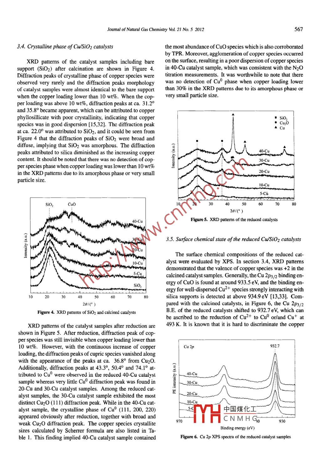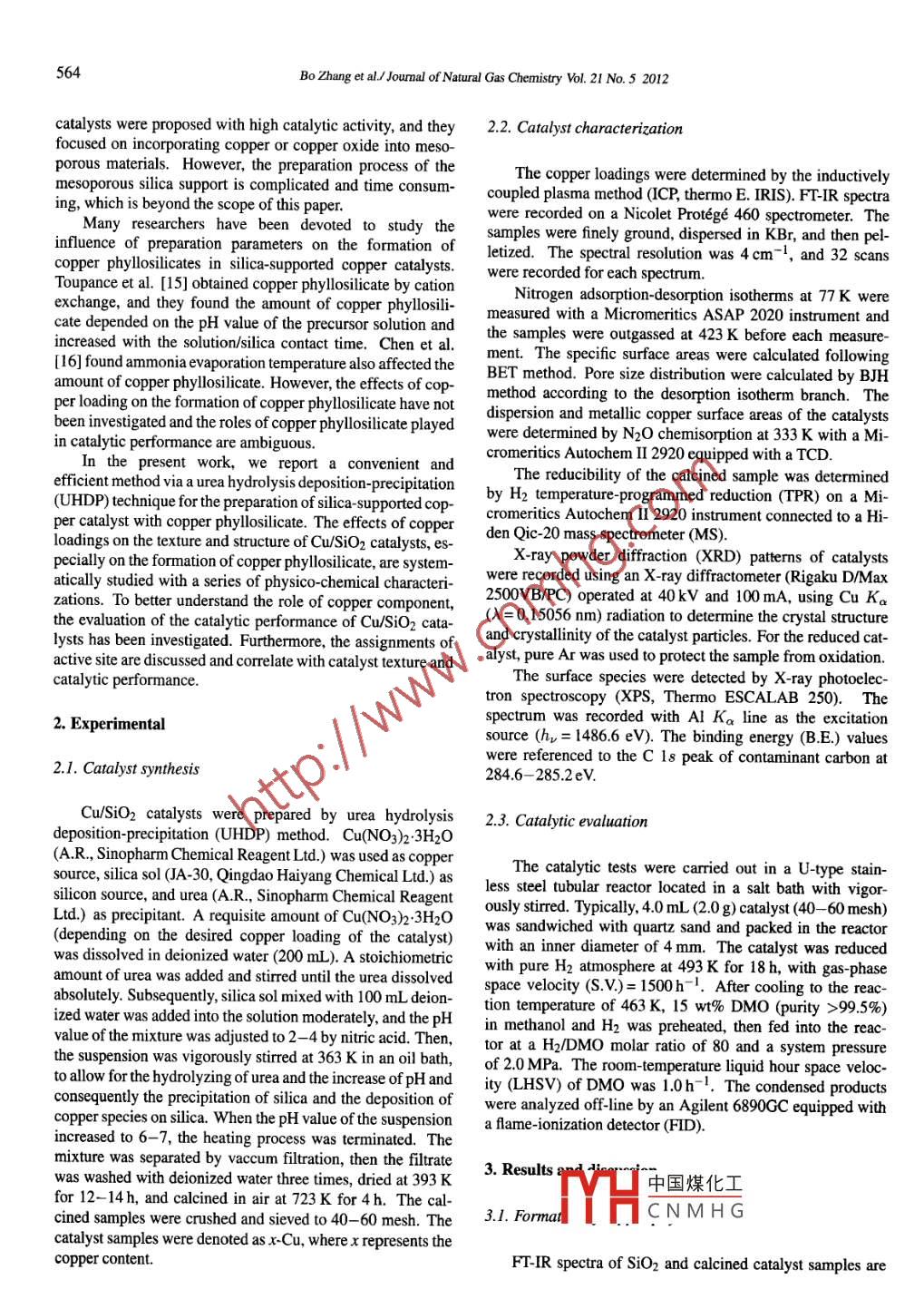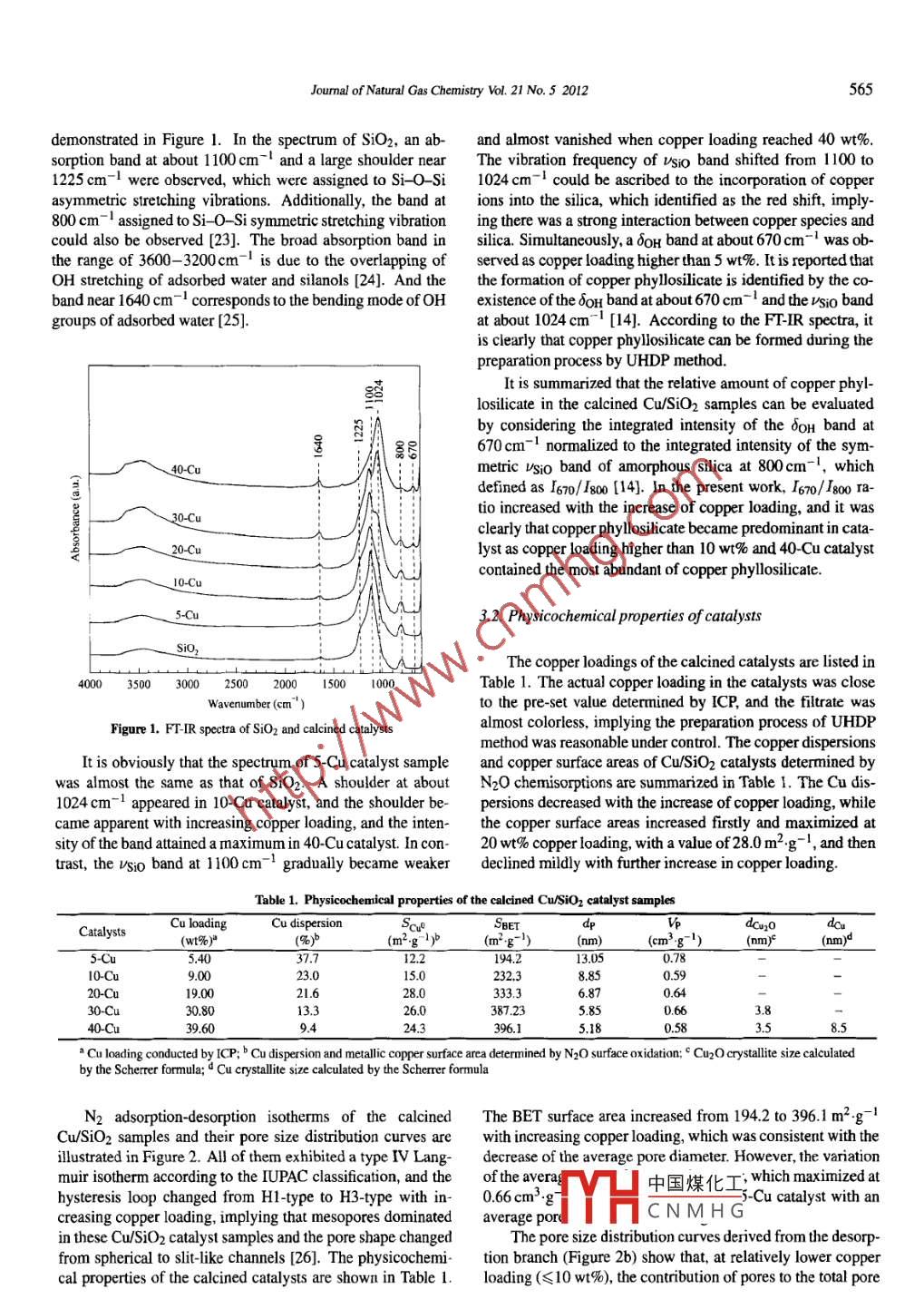 Available online at www.sciencedirect.comJOURNALOFScienceDirectNATURAL GASCHEMISTRYELSEVIERJoumal of Natural Gas Chemistry 21(2012)563 -570www.elsevier. com/locatejingcEffect of copper loading on texture, structure and catalyticperformance of Cu/SiO2 catalyst for hydrogenationof dimethyl oxalate to ethylene glycolBo Zhang',Shengguo Huil,Suhua Zhang',Yang Ji2,Wei Lil,Dingye Fangl*1. State Key Laboratory of Chemical Engineering, East China University of Science and Technology, Shanghai 200237, China;2. Pujing Chemical Industry (Sha) Limited, Shanghai 200231, China[ Manuscript received November 28. 2011; revised Deccember 21.2011 ]AbstractCu/SiO2 catalysts prepared by a convenient and eficient method using the urea hydrolysis deposition precipitation (UHDP) technique havebeen proposed focusing on the effect of copper loading. The texture, structure and composition are sytematically characterized by ICP, FT-IR, N2-physisorption, N2O chemisorption, TPR, XRD and XPS. The formation of copper pllosiliace is observed in Cu/SiO2 catalyst byadopting UHDP method, and the amount of copper pylosilicate is related to copper loading. It is found the structure properties and catalyticperformance is profoundly affected by the amount of copper plosilicate The excellent catalytic activity is atributed to the synergetic effetbetween Cu' and Cu*. DM0 conversion and EG sectivity are deternined by the amount of Cu0 and Cu+, respetively. The proper copperloading (30 wt%) provides with the highest ratio of Cu+ /Cu0. giving rise to the highest EG yield of 95% under the reaction conditions ofp= 2.0 MPa, T = 473 K, H2/DMO = 80 and LHSV= 1.0h-1.Key wordsCu/SiO2; copper loading; dimethyl oxalate; ethylene glycol; copper phyllosilicate1. IntroductionSilica-supported copper catalysts were then found widespreadapplication in this area, which exhibited excellent activity inoxalates hydrogenation [5-7].In recent years, synthesis of ethylene glycol (EG) fromGenerally, silica support is considered as inert, for in-coal-derived syngas has attracted significant attention becausestance, as a mere dispersant of the active phase. How-it provided an alternative route to gain EG. EG is widely usedever, researchers revealed that silica may react with theas anti-freezer, polyester fibers, alkyd resin in polyester manu-metal precursors and form silicates during catalyst prepara-facture and solvents [1,2]. At present, direct hydration for thetion. Silica-supported phyllosilicates are known to be formedsynthesis of EG from ethylene oxide (EO) is widely adoptedduring the preparations of Ni/SiO2 [8- 10], Co/SiO2 [11,12],in large-scale production plant.and Cu/SiO2 [13- 16] by cation exchange and/or deposition-It is well-known that catalytic hydrogenation of dimethylprecipitation. The advantages of high dispersion, poor crys-oxalate (DMO) to EG is one of the most important parts intllinity, and high thermal stability of the supported metalthe coal-based EG synthesis process [3]. Catalysts for hydro-phyloilicate, even at elevated metal loadings, make themgenation have drawn an increasing research interest since it ispromising materials for catalysts.one of the key technologies during the coal-to- EG commer-Recently, Cu/SiO2 catalysts with different copper load-cialization process. Copper-based catalysts were employedings synthesized by urea hydrolysis method have been inves-for hydrogenation of DMO to EG in heterogeneous phase. Attigated, but the effects of copper loading have not been dis-the very beginning, copper-chromium catalyst has been usedcussed [17]. Lin et al. [18] prepared an array of CwSiO2in hydrogenation process for its relatively high catalytic sta-catalysts by sol-gel method, but the actual copper loadingsbility and long lifespan [4]. Nevertheless, the toxic chromiumwere inadequate to control, yet trace of copper phyllosilicatecontained in copper-chromium catalyst constrains its practi-was observedIrpddition r rie if haxagonal mesoporouscal applications due to the increasing environmental pressures.silica (HMS中國(guó)煤化工21 sppoted copper* Coresponding author. Tel: +86-21-64251002; Fax: +86-21-64251002; E-mail: dyfang@ecuYHCNM HGCopyrightO2012, Dalian Institute of Chemical Physics, Chinese Academy of Sciences. All rights reserved.doi:10. 1/100309911)60405-2564Bo Zhang et al/ Jounal of Naural Gas Chemistry Vol. 21 No.5 2012catalysts were proposedwith high catalytic activity, and they2.2. Catalyst characterizationfocused on incorporating copper or copper oxide into meso-porous materials. However, the preparation process of theThe copper loadings were determined by the inductively: support is complicated and time consum-coupled plasma method (ICP, thermo E. IRIS). FT-IR spectraing, which is beyond the scope of this paper.were recorded on a Nicolet Protege 460 spectrometer. TheMany researchers have been devoted to study thesamples were finely ground, dispersed in KBr, and then pel-influence of preparation parameters on the formation 0letized. The spectral resolution was 4cm ', and 32 scanscopper plylosiliates in silica supported copper catalysts.were recorded for each spectrum.Toupance et al. [15] obtained copper phylosilicate by cationNtrogen adsorption-desorption isotherms at 77K wereexchange, and they found the amount of copper phylosilimeasured with a Micromeritics ASAP 2020 instrument andcate depended on the pH value of the precursor solution andthe samples were outgassed at 423 K before each measure-increased with the solution/silica contact time. Chen et al.ment. The specific surface areas were calculated following[16] found ammonia evaporation termperature also affectedtheBET method. Pore size distribution were calculated by BJHamount of copper phylloilicate. However, the efets of cop-method according to the desorption isotherm branch. Theper loading on the formation of copper phyllosilicate have notdispersion and metllic copper surface areas of thecatalystsbeen investigated and the roles of copper phyllosilicate