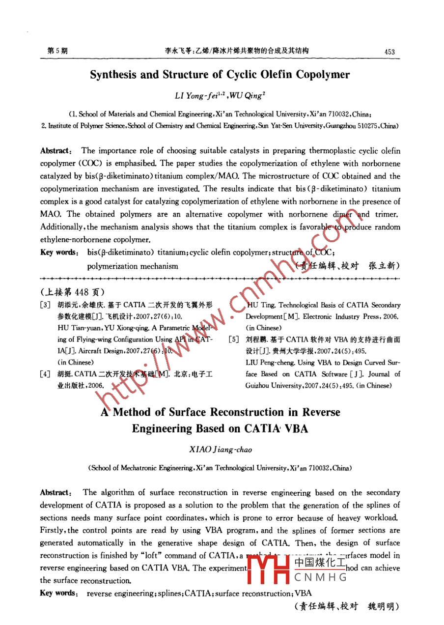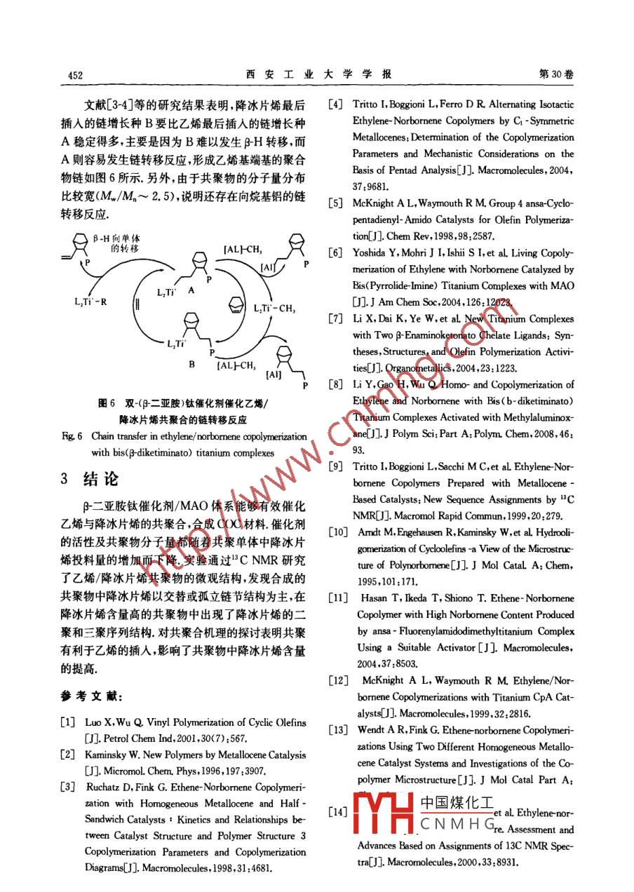 第30卷第5期西安工業(yè)大學學報Vol. 30 No, 52010年10月Journal of Xi' an Technological UniversityOct. 2010文章編號: 1673-9965(2010)05-449-05乙烯/降冰片烯共聚物的合成及其結(jié)構(gòu)“李永飛,伍青2(1.西安工業(yè)大學材料與化工學院.西安710032;2. 中山大學化學與化學工程學院,廣州510275)摘要:針對環(huán)烯烴與c烯烴 共聚合而成的熱塑性工程塑料催化劑的選擇,文采用β二亞胺鈦催化劑合成了乙烯與降冰片烯的共聚物,進行了其微觀結(jié)構(gòu)和催化機理研究.研究結(jié)果表明,β二亞胺鈦催化劑能夠很好地催化乙烯與降冰片烯的共聚合.通過對合成的共聚物的徹觀結(jié)構(gòu)的分析發(fā)現(xiàn),鈦催化劑合成的乙烯/降冰片烯共聚物以無規(guī)結(jié)構(gòu)為主,共聚物中出現(xiàn)了降冰片烯的二聚和三聚序列結(jié)構(gòu).共聚合機理的研究也表明該催化劑有利于合成乙烯與降冰片烯的無規(guī)共聚物.關(guān)鍵詞: β二亞胺 鈦;環(huán)烯烴共聚物;共聚物結(jié)構(gòu);聚合機理中圖號: TH145. 4.文獻標志碼: A .環(huán)烯烴共聚物(COC)是一類非常 重要的熱塑的研究上做了大量的工作.對共聚物微觀結(jié)構(gòu)的分性工程塑料材料,具有很好的透明度、優(yōu)良的熱穩(wěn)析表明,茂金屬催化體系通常得到的乙烯/降冰片定性和耐化學侵蝕性,可用于制造各種光學鏡頭以烯 共聚物中降冰片烯的含量小于50%,共聚物中及取代聚碳酸酯(PC)生產(chǎn)高密度DVD等的材料.降冰片烯單元以孤立的或交替的形式存在[35].另外,COC材料還有非常低的介電常數(shù)及很好的文獻[6-7]報道了吡咯亞胺鈦及β-酮胺鈦催化隔潮性能,可用于制造一些電子及電器部件.劑催化乙烯/降冰片烯共聚合.這種[N,N]配位的COC是由環(huán)戊烯、降冰片烯等環(huán)烯烴與乙烯、簡單配體合成相對簡單,配體的電子及位阻結(jié)構(gòu)容丙稀或其他-烯烴共聚得到的共聚物.從環(huán)烯烴單易調(diào)節(jié),便于研究配體結(jié)構(gòu)對催化劑活性的影響.體的反應機理上,COC的制備方法主要有兩種:開我們前期合成了β二亞胺鈦催化劑,并研究了其催環(huán)易位聚合以及乙烯基加成聚合開環(huán)易位聚合得化乙烯與降冰片烯的共聚合8.文中研究了鈦催化到的大分子鏈中含有雙鍵,材料的介電常數(shù)較高,劑催化合成的乙烯/降冰片烯共聚物的結(jié)構(gòu),并對抗氧化性及耐化學腐蝕性較差,限制了材料的用其催化機理進行了討論,結(jié)果表明這種催化劑得到途".乙烯基加成聚合得到的COC材料中不含雙乙烯與降冰片烯的交替共聚物.鍵,而且保持著環(huán)烯烴的環(huán)狀結(jié)構(gòu),材料的力學性能很好,是目前在實驗室中合成CoC材料的主要1實驗方法.在COC的合成中,催化劑的選擇直接決定著1.1原料及試劑合成的COC結(jié)構(gòu).合成COC常用的催化劑有茂金屬催化劑以及鈦、鋯等金屬為主的過渡金屬催化甲苯:分析純,廣州化學試劑廠.用前在高純氮劑.環(huán)烯烴單體通常選用價格相對低的降冰片烯.氣保護下與金屬鈉-起回流6 h以上,蒸餾出使用.Kaminsky等最先報道了茂金屬催化乙烯與降冰片烯(NBE)純度為99% , Aldrich公司生降冰片烯共聚合[2).此后,Fink以及Titto等研究產(chǎn).使用前用金屬鉀在60 C攪拌過夜,蒸餾出后配小組也在茂金屬催化劑催化乙烯/降冰片烯共聚合成甲中國煤化工YHCNMHG收稿日期:20-04-15資助基金:陜西省教育廳科研專項(07JK273);陜西省自然科學基金(2007B20);2010年陜西省教育廳科研計劃項目作者簡介:李永飛(1974-),男,西安工業(yè)大學副教授,主要研究方向為高分子材料的合成及應用. E-mail:cep03lyf@126. com.450西安工業(yè)大學學報第30卷β二亞胺配體及其鈦的配合物的合成,以及助及表征前期已經(jīng)報道過[8].研究選用降冰片烯單體催化劑甲基鋁氧烷(MAO)的合成見文獻[8].的加入量分別為4 g和10 g,乙烯常壓在40 C聚1.2儀器及測試方法合,得到的乙烯/降冰片烯共聚物中降冰片烯含量18CNMR用UnityINOVA500型核磁共振Xx=0. 25和XN=0.48進行聚合物的結(jié)構(gòu)研究.儀測定.聚合物用氘代1,2-二氯苯溶解,以四甲基2.2共聚物的微觀結(jié)構(gòu)分析硅烷(TMS)作內(nèi)標.采用二亞胺鈦/MAO催化體系催化乙烯/COC共聚物的分子量及分布是在Varian降冰片烯共聚合,其共聚物的微觀結(jié)構(gòu)可以通過INOVA 500-MHz凝膠色譜儀測定.以二氯苯為溶18C NMR譜圖進行研究.降冰片烯含量XN=0.25劑,110 C柱溫.分子量以聚苯乙烯為標準處理.的乙烯/降冰片烯共聚物的C NMR譜圖如圖21.3乙烯與降冰片烯 共聚合所示.主要的吸收峰為降冰片烯交替結(jié)構(gòu)(ENEN)在帶有電磁攪拌的50 mL的玻璃聚合反應瓶以及孤立的降冰片烯(ENEE)序列(如圖3所示).中,加入232 mg固體MAO,用注射器加入10 mL譜圖上29. 9 ppm以下以及35~41 ppm范圍內(nèi)沒降冰片烯的甲苯溶液及19 mL甲苯,通人乙烯氣有吸收峰,表明共聚物中沒有降冰片烯的嵌段結(jié)構(gòu)至常壓.反應體系在聚合溫度充分攪拌均勻后繼續(xù)出現(xiàn).因為在這些區(qū)域應該是降冰片烯二聚或三聚攪拌10 min,加入催化劑的甲苯溶液1 mL,調(diào)節(jié)乙序列的吸收峰出現(xiàn)的區(qū)域10].圖2上出現(xiàn)的吸收烯的壓力為常壓,聚合反應開始.在聚合過程中保峰的歸屬見表1.持乙烯的壓力為常壓不變.聚合反應0.5 h后停止乙烯的通人.向反應器加入鹽酸/乙醇終止反應.將得到產(chǎn)物經(jīng)乙醇浸泡,過