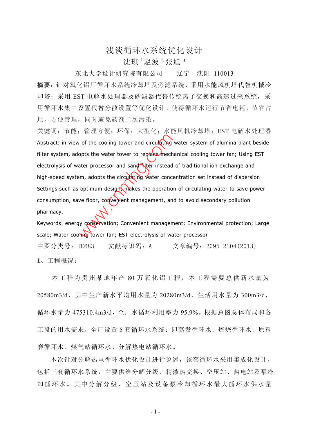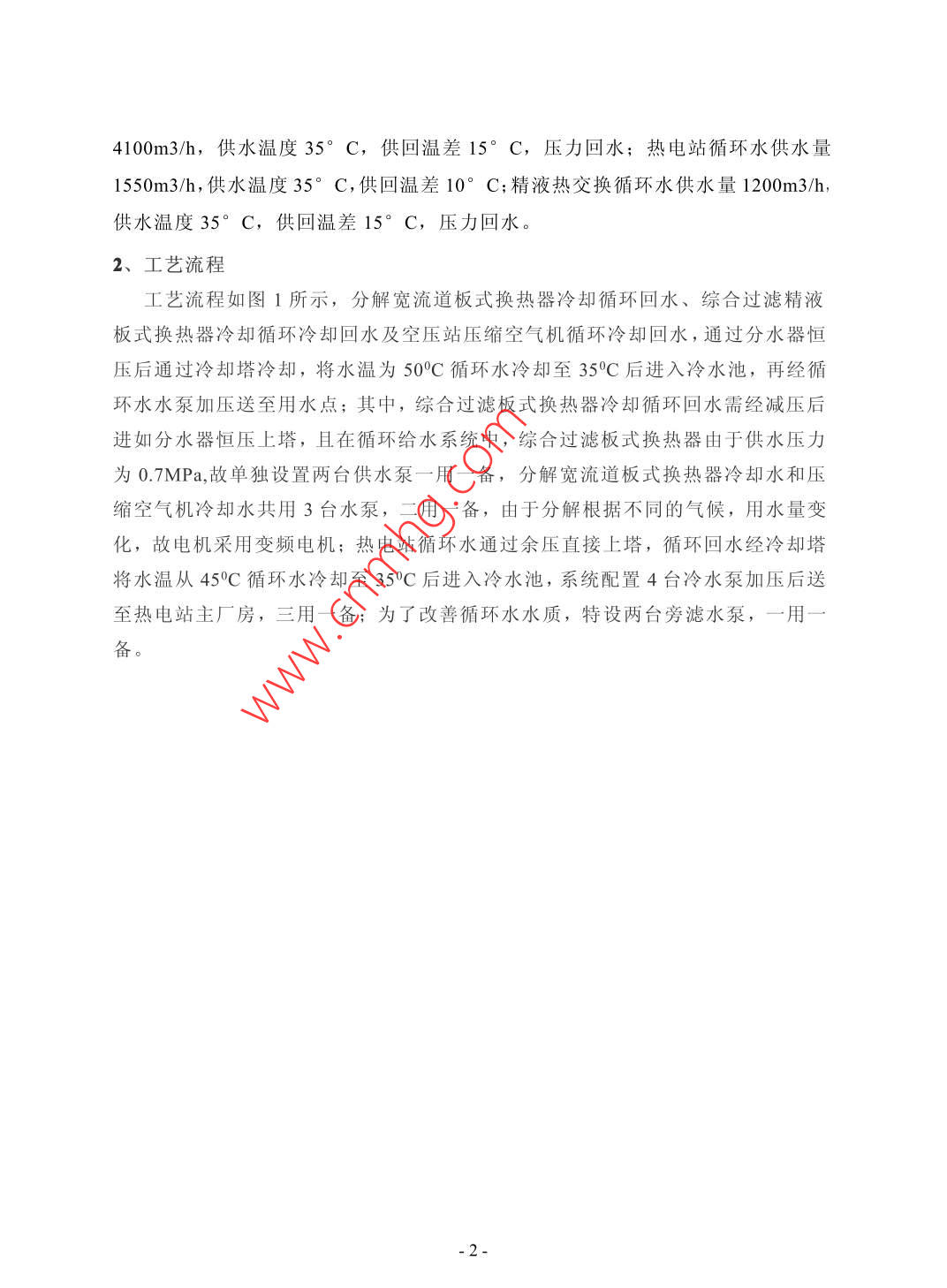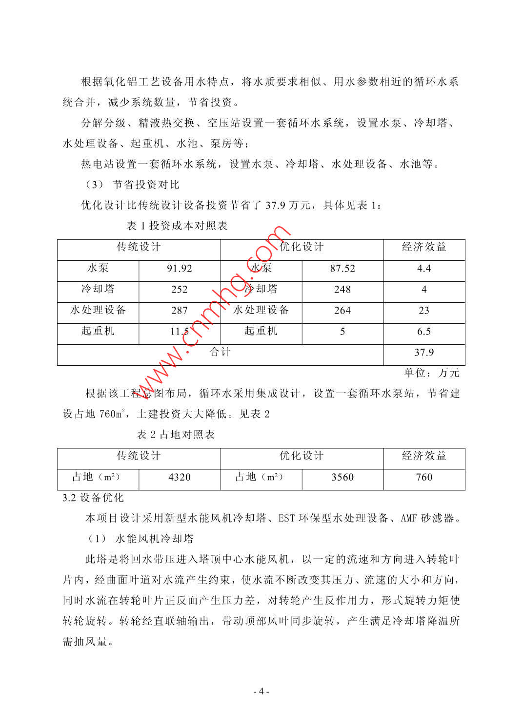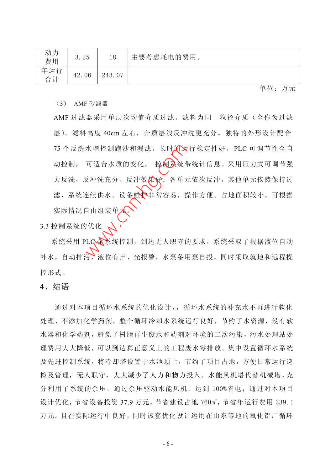 淺談循環(huán)水系統(tǒng)優(yōu)化設(shè)計沈琪趙波2張旭3東北大學設(shè)計研究院有限公司遼寧沈陽110013摘要:針對氧化鋁廠循環(huán)水系統(tǒng)冷卻塔及旁濾系統(tǒng),采用水能風杋塔代替機械冷卻塔;采用EST電解水處理器及砂濾器代替?zhèn)鹘y(tǒng)離子交換和高速過來系統(tǒng),采用循環(huán)水集中設(shè)置代替分散設(shè)置等優(yōu)化設(shè)計,使得循環(huán)水運行節(jié)省電耗,節(jié)省占地,方便管理,同時避免藥劑二次污染關(guān)鍵詞:節(jié)能;管理方便;環(huán)保;大型化;水能風機冷卻塔;EST電解水處理器Abstract: in view of the cooling tower and circulating water system of alumina plant besidefilter system adopts the water tower to replace mechanical cooling tower fan; Using ESTelectrolysis of water processor and sand filter instead of traditional ion exchange andhigh-speed system adopts the circulating water concentration set instead of dispersionSettings such as optimum design makes the operation of circulating water to save powerconsumption, save floor, convenient management and to avoid secondary pollutionpharmacyKeywords: energy conservation; Convenient management; Environmental protection; Largescale; Water cooling tower fan; Est electrolysis of water processor中圖分類號:TE683文獻標識碼:A文章編號:2095-2104(2013)1、工程概況:本工程為貴州某地年產(chǎn)80萬氧化鋁工程,本工程需要總供新水量為20580m3/d,其中生產(chǎn)新水平均用水量為20280m3/d,生活用水量為300m3/d,循環(huán)水量為475310.4m3/d,全廠水循環(huán)利用率為95.9%。根據(jù)總圖總體布局和各工段的用水需求,全廠設(shè)置5套循環(huán)水系統(tǒng):即蒸發(fā)循環(huán)水、焙燒循環(huán)水、原料磨循環(huán)水、煤氣站循環(huán)水、分解熱電站循環(huán)水。本次針對分解熱電循環(huán)水優(yōu)化設(shè)計進行論述,該套循環(huán)水采用集成化設(shè)計,包括三套循環(huán)水系統(tǒng),主要供給分解分級、精液熱交換、空壓站、熱電站及泵冷卻循環(huán)水。其中分解分級、空壓站及設(shè)備泵冷卻循環(huán)水最大循環(huán)水供水量4100m3/h,供水溫度35°C,供回溫差15°C,壓力回水;熱電站循環(huán)水供水量1550m3/h,供水溫度35°C,供回溫差10°C;精液熱交換循環(huán)水供水量1200m3/h,供水溫度35°C,供回溫差15°C,壓力回水。2、工藝流程工藝流程如圖1所示,分解寬流道板式換熱器冷卻循環(huán)回水、綜合過濾精液板式換熱器冷卻循環(huán)冷卻回水及空壓站壓縮空氣機循環(huán)冷卻回水,通過分水器恒壓后通過冷卻塔冷卻,將水溫為50C循環(huán)水冷卻至35℃C后進入冷水池,再經(jīng)循環(huán)水水泵加壓送至用水點;其中,綜合過濾板式換熱器冷卻循環(huán)回水需經(jīng)減壓后進如分水器恒壓上塔,且在循環(huán)給水系統(tǒng)中,綜合過濾板式換熱器由于供水壓力為0.MPa,故單獨設(shè)置兩臺供水泵一用一備,分解寬流道板式換熱器冷卻水和壓縮空氣機冷卻水共用3臺水泵,二用一備,由于分解根據(jù)不同的氣候,用水量變化,故電機采用變頻電機;熱電站循環(huán)水通過余壓直接上塔,循環(huán)回水經(jīng)冷卻塔將水溫從45循環(huán)水冷卻至35C后進入冷水池,系統(tǒng)配置4臺冷水泵加壓后送至熱電站主廠房,三用一備;為了改善循環(huán)水水質(zhì),特設(shè)兩臺旁濾水泵,一用備王王:.觀50圖3、布置方式、設(shè)備選型及控制系統(tǒng)的優(yōu)化3.1布置方式優(yōu)化(1)傳統(tǒng)設(shè)計分解分級、精液熱交換設(shè)置一套循環(huán)水系統(tǒng),設(shè)置水泵、冷卻塔、水處理設(shè)備、起重機、水池、泵房等;空壓站設(shè)置一套循環(huán)水系統(tǒng),設(shè)置水泵、冷卻塔、水處理設(shè)備、起重機、水池、泵房等;熱電站設(shè)置一套循環(huán)水系統(tǒng),設(shè)置水泵、冷卻塔、水處理設(shè)備、起重機、水池、泵房等。(2)優(yōu)化設(shè)計根據(jù)氧化鋁工藝設(shè)備用水特點,將水質(zhì)要求相似、用水參數(shù)相近的循環(huán)水系統(tǒng)合并,減少系統(tǒng)數(shù)量,節(jié)省投資。分解分級、精液熱交換、空壓站設(shè)置一套循環(huán)水系統(tǒng),設(shè)置水泵、冷卻塔水處理設(shè)備、起重機、水池、泵房等;熱電站設(shè)置一套循環(huán)水系統(tǒng),設(shè)置水泵、冷卻塔、水處理設(shè)備、水池等(3)節(jié)省投資對比優(yōu)化設(shè)計比傳統(tǒng)設(shè)計設(shè)備投資節(jié)省了37.9萬元,具體見表1表1投資成本對照表傳統(tǒng)設(shè)計優(yōu)化設(shè)計經(jīng)濟效益水泵91.92水泵87.524.4冷卻塔252冷卻塔248水處理設(shè)備287水處理設(shè)備26423起重機11.5起重機6.5合計37.9單位:萬元根據(jù)該工程總圖布局,循環(huán)水采用集成設(shè)計,設(shè)置一套循環(huán)水泵站,節(jié)省建設(shè)占地760m2,土建投資大大降低。見表2表2占地對照表傳統(tǒng)設(shè)計優(yōu)化設(shè)計經(jīng)濟效益地4320占地(m2)35607603.2設(shè)備優(yōu)化本項目設(shè)計采用新型水能風機冷卻塔、EST環(huán)保型水處理設(shè)備、AMF砂濾器。(1)水能風機冷卻塔此塔是將回水帶壓進入塔頂中心水能風機,以一定的流速和方向進入轉(zhuǎn)輪葉片內(nèi),經(jīng)曲面葉道對水流產(chǎn)生約束,使水流不斷改變其壓力、流速的大小和方向,同時水流在轉(zhuǎn)輪葉片正反面產(chǎn)生壓力差,對轉(zhuǎn)輪產(chǎn)生反作用力,形式旋
