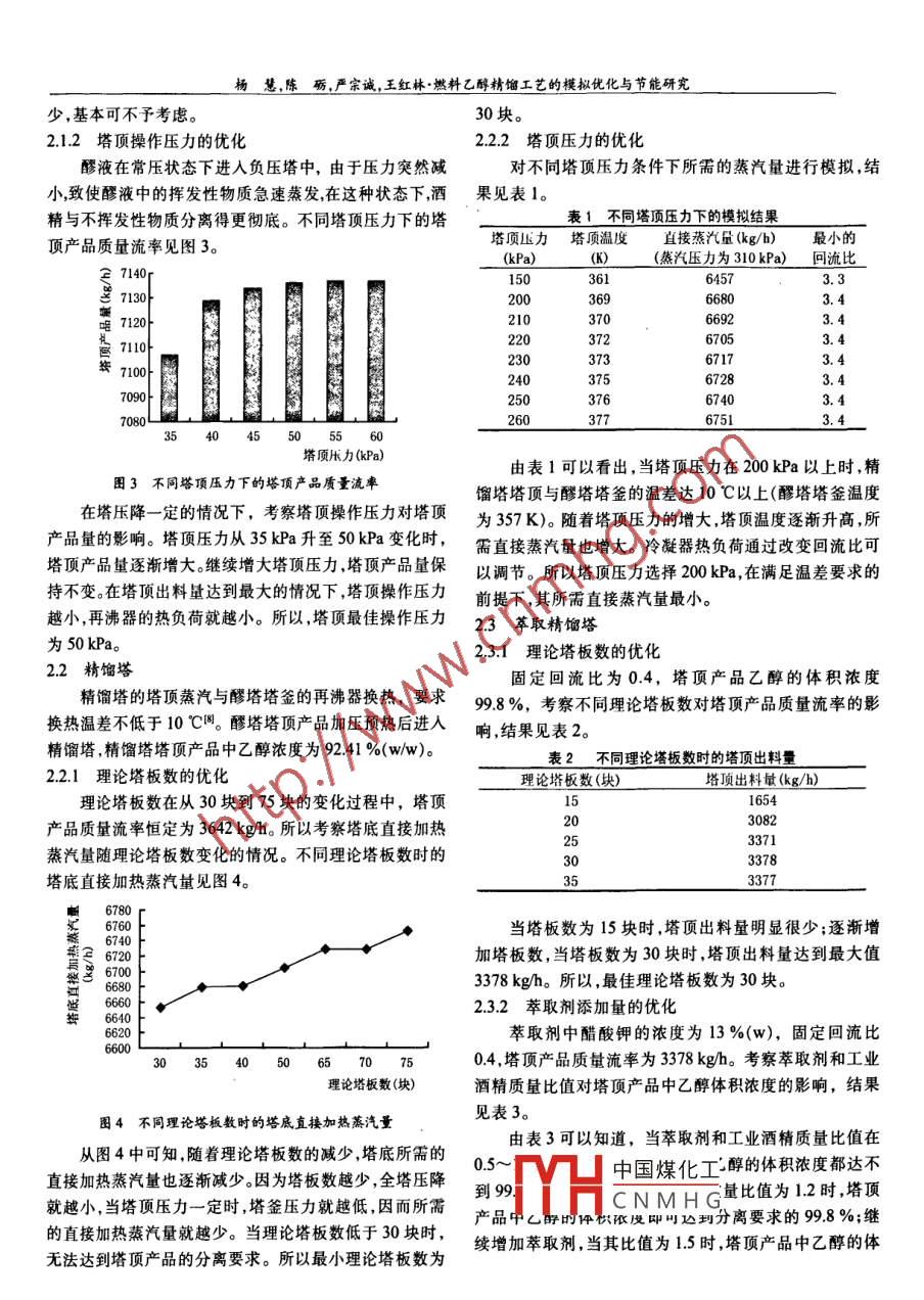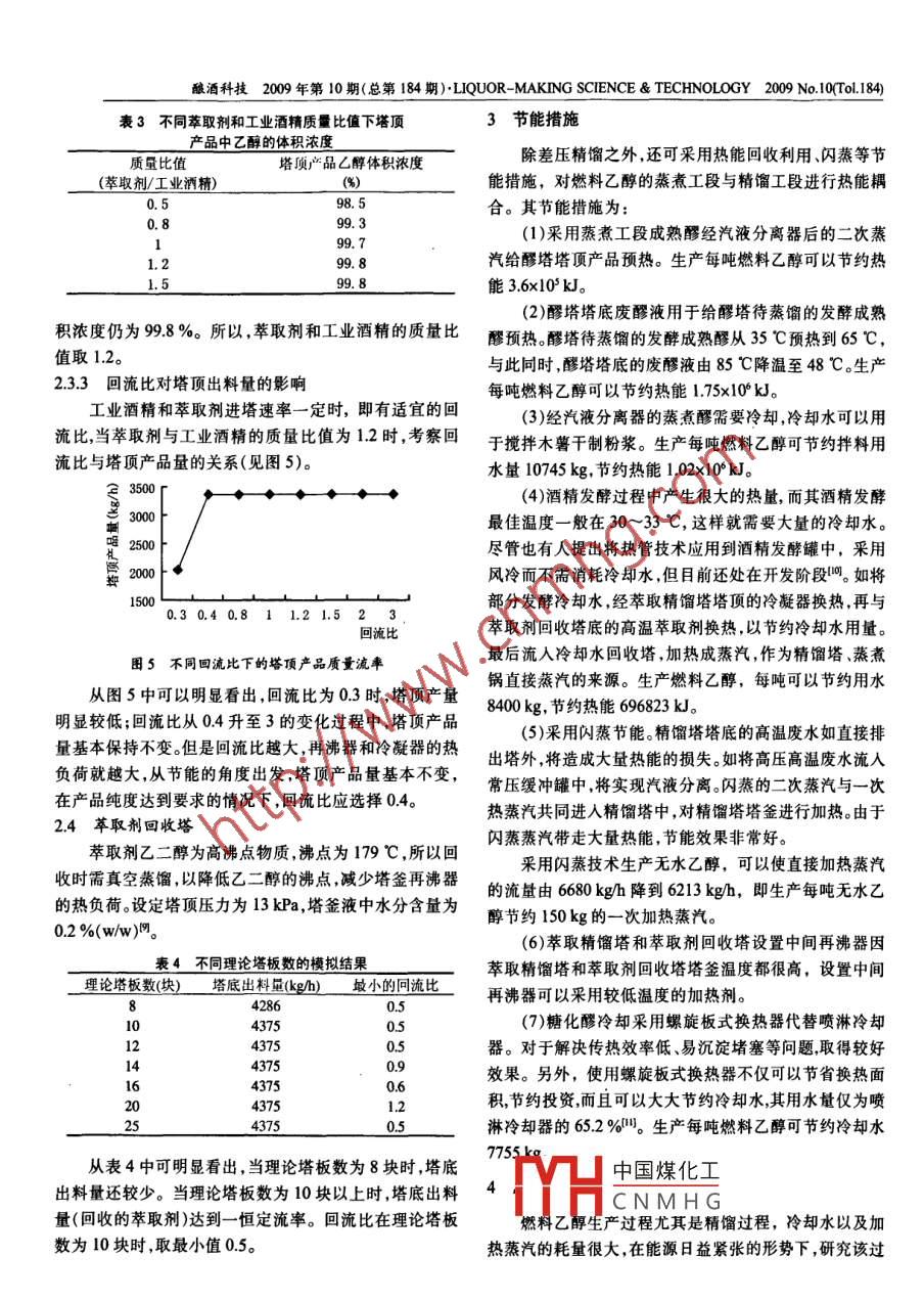 釀酒科技2009年第10期(總第184期)· LIQUOR- MAKING SCIENCE& TECHNOLOGY2009No,10To.184)燃料乙醇精餾工藝的模擬優(yōu)化與節(jié)能研究楊慧,陳礪,嚴(yán)宗誠,王紅林(華南理工大學(xué)化學(xué)與化工學(xué)院,廣東省綠色化學(xué)產(chǎn)品技術(shù)重點(diǎn)實(shí)驗室,廣東廣州510640)摘要:將工業(yè)乙醇生產(chǎn)的一級精餾系統(tǒng)和燃料乙醇生產(chǎn)的加鹽萃取精餾系統(tǒng)合并,在差壓精餾節(jié)能技術(shù)的基礎(chǔ)上,利用過程系統(tǒng)模擬軟件ProⅡ?qū)φ麴s工藝進(jìn)行模擬優(yōu)化。醪塔:最佳理論塔板教為15塊,塔頂壓力為50κPa;精餾塔:最佳理論塔板教為30塊,塔頂壓力為200kPa,回流比為3.4;萃取精餾塔:塔頂產(chǎn)品乙醇體積濃度為998%(優(yōu)級純)時,所需最佳理論塔板數(shù)為30塊,回流比為04,萃取劑和酒精質(zhì)量比為1.2:1;萃取劑回收塔:在塔釜液含水量為02%ww)的前提下,最佳理論塔板數(shù)為10塊,回流比為0.5。另外,采用熱能耦合、閃蒸技術(shù)、設(shè)置中間再沸器等一系列節(jié)能措施,結(jié)合然料乙醇生產(chǎn)的蒸煮工段,對熱量進(jìn)行充分利用,使冷卻水以及加熱蒸汽的用量大大減少。關(guān)鍵詞:燃料乙醇;萃取精餾;模擬優(yōu)化;節(jié)能中圖分類號:TS2622;TS2614;TP27文獻(xiàn)標(biāo)識碼:A文章編號:1001-9286(2009)10-0043-0Research on the Simulation Optimization and Energy Saving ofExtractive Distillation in Fuel Ethanol ProductionYANG Hui, CHEN Li, YAN Zong-cheng and WANG Hong-lin(School of Chemistry and Chemical Engineering, South China University of Technology, Guangzhou, Guangdong 510640, ChinaAbstract: The first-grade distillation system in industrial ethanol production and the salt-added extractive distillation system in fuel ethanol pro-duction were combined together and the distillation process was simulated and optimized by simulation software Proll on the basis of the ener-gy-saving technique of differential pressure distillation. The optimized technical parameters were summed up as follows: prefractionator: the besttheoretical number of trays was 15, and the top pressure was 50 kPa; distillation column: the best theoretical number of trays was 30, the top pres-sure was 200 kPa, and the reflux ratio was 3. 4; extractive distillation column: when the ethanol volume concentration of the top product got 99.8%(superior grade pure), the best theoretical number of trays was 30, and the reflux ratio was 0. 4, the mass ratio of extractant and alcohol was 1.2: 1extractant recovery tower: when water content in the bottom product was 0.2 %(w/w). the best theoretical number of trays was 10, and the refluxratio was 0.5. Besides, a series of energy-saving measures were also adopted such as thermal energy coupling, flash steaming technique, and theinstallment of middle reboiler In combination with the cooking procedures in fuel ethanol production, the heating energy was fully utilized so thatthe consumption of cooling water and heating steam were greatly reducedKey words: fuel ethanol; extractive distillation; simulation and optimization; energy saving隨著經(jīng)濟(jì)的快速發(fā)展,類對能源的需求不斷增大。冷卻水量占總能耗的60%~70%,其中大量的能量被在化石能源日漸匱乏的情況下,發(fā)展可再生能源顯得尤冷卻水、廢液等帶走造成損失。因此,在酒精生產(chǎn)中合理為重要。乙醇是一種可再生能源,可經(jīng)玉米、甘蔗、木薯等使用能源,搞好酒精蒸餾工段的余熱回收,重復(fù)利用余農(nóng)作物發(fā)酵、蒸餾制得。除大量應(yīng)用于制酒業(yè)、化工、醫(yī)療熱,既可節(jié)約能源,又可降低成本,提高企業(yè)經(jīng)濟(jì)效益。外,還可以作為汽車燃料使用燃料乙醇可以有效節(jié)約汽隨著燃料乙醇計劃的實(shí)施,如何高效節(jié)能地制備燃油,降低汽車尾氣污染物排放推廣應(yīng)用車用乙醇汽油已料乙醇成為一個迫切需要解決的問題。本文將工業(yè)乙醇成為我國的一項戰(zhàn)略舉措,它對有效解決陳化糧轉(zhuǎn)化問生產(chǎn)的一級精餾系統(tǒng)和燃料乙醇生產(chǎn)的加鹽萃取精餾系題,穩(wěn)定農(nóng)民收入,減少環(huán)境污染,緩解石油資源緊張的統(tǒng)合并,結(jié)合ProI系統(tǒng)模擬軟件進(jìn)行優(yōu)化,以確定最佳矛盾,都有十分重要的意義。工藝操作參數(shù)和換熱方案。燃料乙醇有以下幾種生產(chǎn)方法:氧化鈣脫水法共沸1精精餾、吸附精餾、滲透汽化、吸附法、萃取精餾法和真空脫水法等。在傳統(tǒng)酒精生產(chǎn)中精餾過程所消耗的蒸汽及HH中國煤化工CNMHG年代在我國用于工業(yè)收稿日期:2009-07-16釀酒科技200年第10期(總第184期) LIQUOR-MAKING SCIENCE& TECHNOLOGY2000ro14萃取劑成熟發(fā)酵醒c叫燃料乙醇廢水萃取精餾塔工業(yè)乙醇≌直接蒸汽回罐圖1燃料乙醇精餾工藝流程圖生產(chǎn)以來,經(jīng)過30多年的積累和完善,已經(jīng)成為我國生操作參數(shù)進(jìn)行優(yōu)化。影響能量損耗的因素很多,包括塔板產(chǎn)燃料乙醇的主要方法。對乙醇-水物系加入鹽類(Ca-數(shù)、塔壓、進(jìn)料位置、回流比等等。采用ProI系統(tǒng)模擬軟Cl,, KAc等)會使乙醇對水的相對揮發(fā)度大大提高體系件可以方便、快捷、較準(zhǔn)確地實(shí)現(xiàn)工藝條件的優(yōu)化。乙醇的恒沸點(diǎn)消失。采用乙二醇作萃取劑,同時在萃取劑中和水均為極性物質(zhì),采用NRTL熱力學(xué)方法模擬。加入醋酸鉀鹽,一方面利用溶鹽提高欲分離組分之間相2.1醪塔對揮發(fā)度的突出性能,克服純?nèi)軇┬懿?