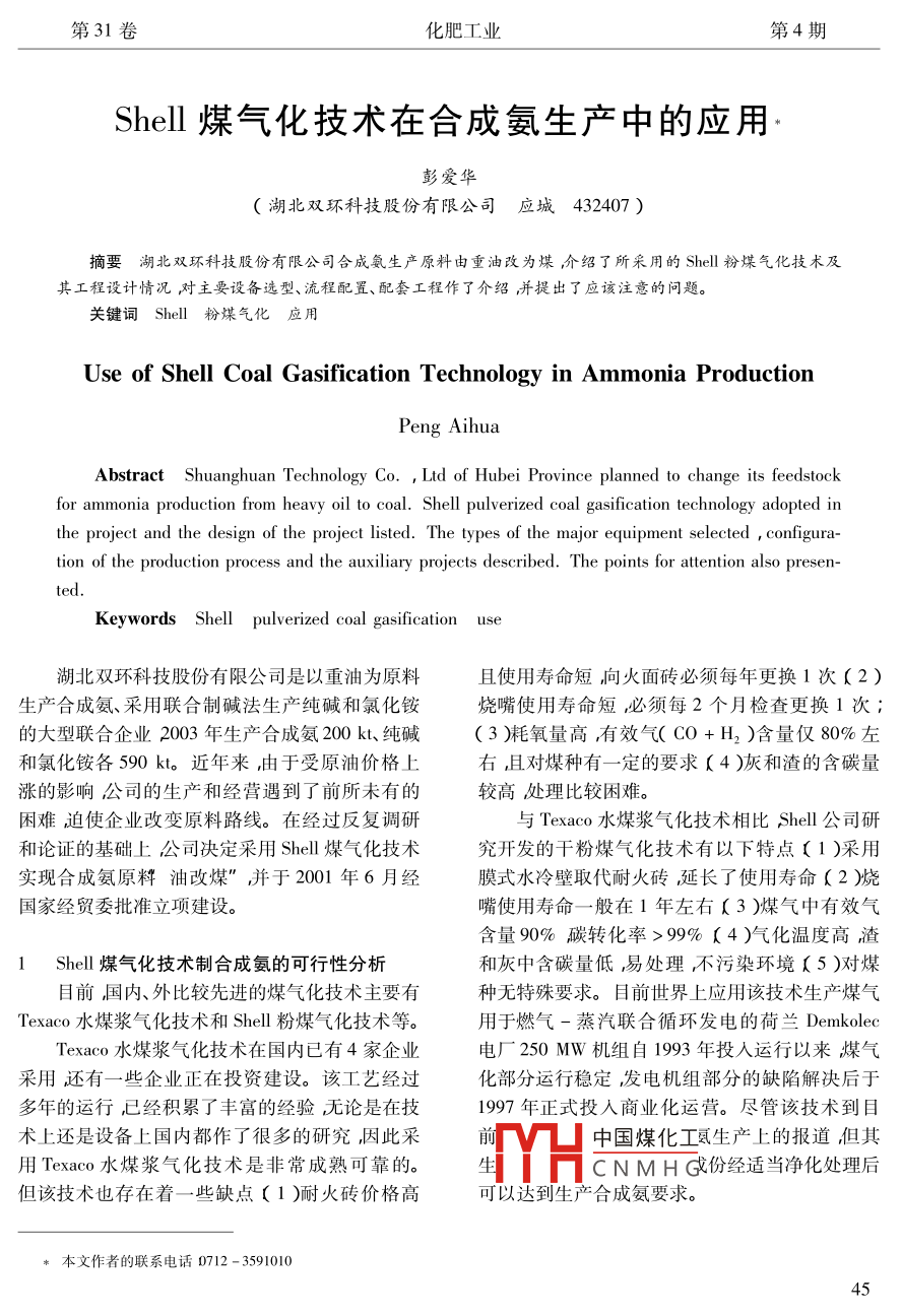 第31卷化肥工業(yè)第4期Shell煤氣化技術在合成氨生產中的應用.彭愛華(湖北雙環(huán)科技股份有限公司 應城432407 )摘要湖北雙環(huán)科技股份 有限公司合成氨生產原料由重油改為煤介紹了所采用的Shell粉煤氣化技術及其工程設計情況對主要設備選型、流程配置、配套工程作了介紹并提出了應該注意的問題。關鍵詞Shell 粉煤氣化應用Use of Shell Coal Gasification Technology in Ammonia ProductionPeng AihuaAbstract Shuanghuan Technology Co. , Ltd of Hubei Province planned to change its feedstockfor ammonia production from heavy oil to coal. Shell pulverized coal gasification technology adopted inthe project and the design of the project listed. The types of the major equipment selected , configura-tion of the production process and the auxiliary projects described. The points for attention also presen-ted.Keywords Shell pulverized coal gasification use湖北雙環(huán)科技股份有限公司是以重油為原料且使用壽命短向火面磚必須每年更換1次(2 )生產合成氨、采用聯(lián)合制堿法生產純堿和氯化銨燒嘴使用壽命短,必須每2個月檢查更換1次;的大型聯(lián)合企業(yè)2003年生產合成氨200kt、純堿(3 )耗氧量高,有效氣( CO + H2 )含量僅80%左和氯化銨各590 kt。近年來,由于受原油價格上右,且對煤種有一定的要求[4)灰和渣的含碳量漲的影響公司的生產和經營遇到了前所未有的較高處理比較困難。困難迫使企業(yè)改變原料路線。在經過反復調研與Texaco水煤漿氣化技術相比,Shell 公司研和論證的基礎.上公司決定采用Shell煤氣化技術究開發(fā)的干粉煤氣化技術有以下特點( 1 )采用實現(xiàn)合成氨原料油改煤”并于2001年6月經膜式水冷壁取代耐火磚延長了使用壽命(2 )燒國家經貿委批準立項建設。嘴使用壽命一-般在1年左右( 3 )煤氣中有效氣含量90%碳轉化率>99% ( 4 )氣化溫度高渣1 Shell 煤氣化技術制合成氨的可行性分析和灰中含碳量低易處理不污染環(huán)境[ 5 )對煤目前國內、外比較先進的煤氣化技術主要有種無特殊要求。目前世界上應用該技術生產煤氣Texaco水煤漿氣化技術和Shell粉煤氣化技術等。用于燃氣-蒸汽聯(lián)合循環(huán)發(fā)電的荷蘭DemkoleTexaco水煤漿氣化技術在國內已有4家企業(yè)電廠250 MW機組自1993年投入運行以來煤氣采用還有一些企業(yè)正在投資建設。該工藝經過化部分運行穩(wěn)定發(fā)電機組部分的缺陷解決后于多年的運行,已經積累了豐富的經驗無論是在技1997年正式投人商業(yè)化運營。盡管該技術到目術上還是設備上國內都作了很多的研究,因此采:中國煤化工貳生產上的報道但其用Texaco水煤漿氣化技術是非常成熟可靠的。.生YHCNMH成份經適當凈化處理后但該技術也存在著一些缺點( 1 )耐火磚價格高可以達到生產合成氨要求。*本文作者的聯(lián)系電話0712 - 359101045第31卷化肥工業(yè)第4期2 Shell 煤氣化工藝及特點簡介Shell煤氣化工藝流程見圖1。2.1 Shell煤氣化工藝流程激冷氣激冷氣壓縮機0-煤、助熔劑中壓蒸汽[磨煤及干燥] N合成氣冷卻器返回氣| 返回氣330C160C中一壓氣化爐勢一[除干固體一口濕洗].去變換_氣、蒸內千灰外運爐渣或去磨煤圖1 Shell 煤氣化工藝流程簡圖.來自煤場的煤和石灰石通過稱重給料機按一(1)煤種適應性廣對煤的活性無特殊要求。定比例混和后進人磨煤機混磨并由熱風作為動在Demkolee電廠已經氣化過10多種煤均能正力帶走煤中的水份再經過袋式過濾器過濾干燥常生產但從經濟運行角度考慮(助熔劑的加人的煤粉進人煤粉倉中貯存。出煤粉倉的煤粉通過量和耗氧量及保護水冷璧等因素)煤種應有適鎖斗裝置由氮氣加壓至4.2 MPa并以氮氣作為當?shù)倪x擇。動力送至燒嘴與蒸汽、氧氣一起進人氣化爐內燃(2)由于采用膜式水冷壁結構水冷壁內壁燒反應溫度約為1500~1700C,壓力3.5涂1層耐火材料依靠熔渣來保護水冷壁使用壽MPa。出氣化爐的氣體先在氣化爐頂部被激冷壓命長維護量少??s機送來的冷煤氣激冷至900 C然后經輸氣管(3)由于氣化溫度高碳轉化率高灰和渣中換熱器、合成氣冷卻器回收熱量后溫度降至350含碳量低不污染環(huán)境。C再進人高溫高壓陶瓷過濾器除去合成氣中(4 )裝置自動化程度高,有DCS. ESD(緊急99%的飛灰。出高溫高壓過濾器的氣體分為2停車系統(tǒng))系統(tǒng)組成為保護設備和操作人員安股,一股進入激冷氣壓縮機壓縮后作為激冷氣另全設有很多聯(lián)鎖保護系統(tǒng)。-股進人文丘里洗滌器和洗滌塔經高壓工藝水除其中剩余的灰并將溫度降至150 C后去氣體3主要設計技術 參數(shù)凈化裝置的變換工序。3.1煤種 的選擇在氣化爐內產生的熔渣沿氣化爐壁流入氣化我公司設計選用河南新密煤其化學組成爐底部的渣池遇水固化成玻璃狀爐渣然后通過(干燥、無灰基組成)為C 88. 86%、H3.95%、0收集器、渣鎖斗定時排放至渣脫水槽再通過撈4. 80%、N 1.83%、S0.55%、C10.01% , 應用基渣機撈出送至渣場作為商品出售。組成為固定碳40. 03%、揮發(fā)份34. 1%、水份在高溫高壓過濾器中收集的飛灰經飛灰氣提8.53%、灰份25.87%、低位熱值24. 98 MIJ/kg、 灰.塔氣提并冷卻至100 C后進入飛灰貯罐, -部分熔點14109飛灰返回至磨煤機另- .部分作為商品出售。中國煤化工特性.氣化爐膜式壁內和各換熱器由泵進行強制水MYHCNMHG有效氣產量55000m2循環(huán)產生的5.4 MPa飽和蒸汽進人汽包經汽水/h標態(tài))設計消耗指標為煤39.8 V/h、石灰石分離后進人蒸