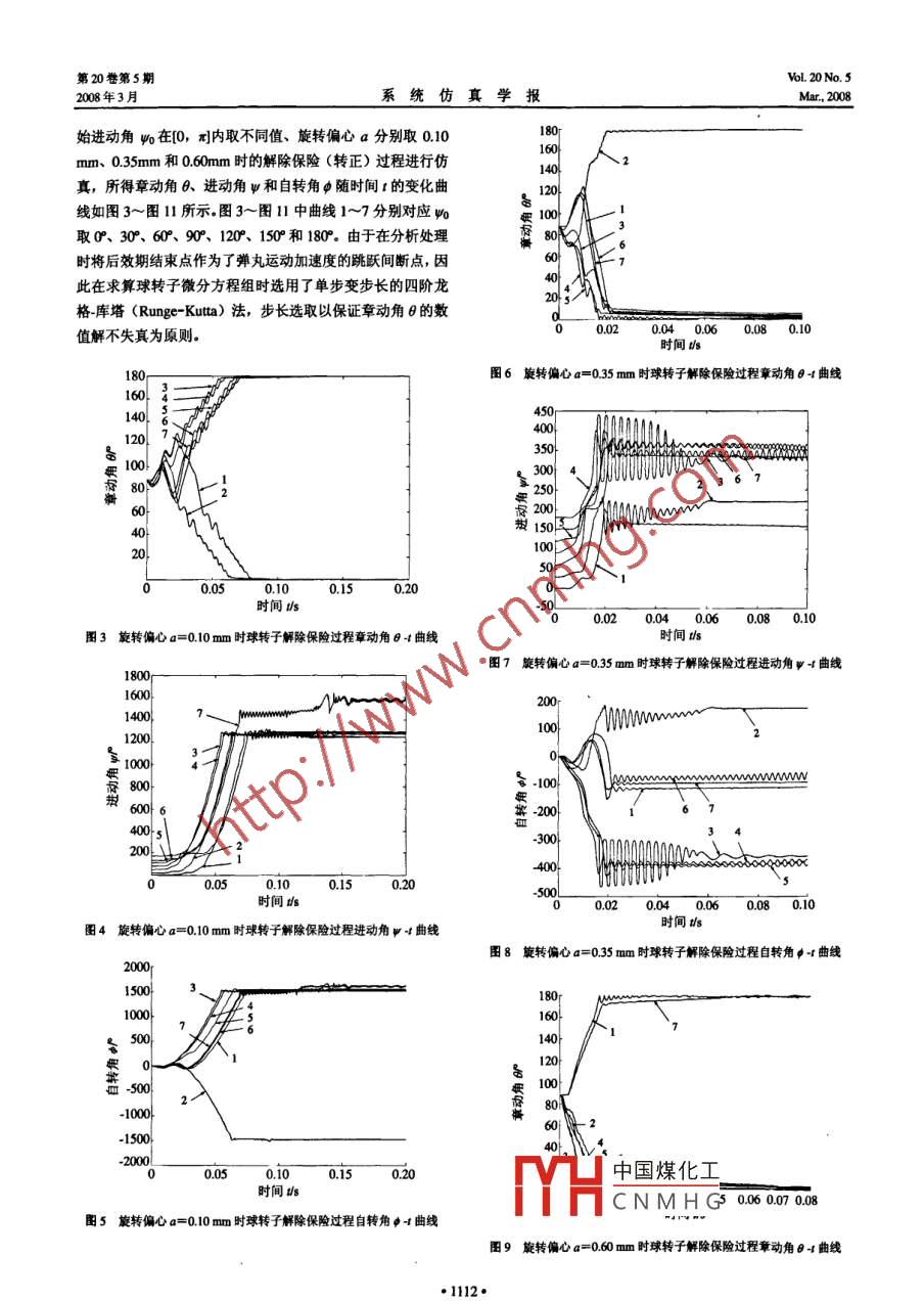 第20卷第5期系統(tǒng)仿真學(xué)報Vol. 20 No 52008年3月Journal of System SimulationMar.2008引信球轉(zhuǎn)子機(jī)構(gòu)動力學(xué)仿真聞泉,王雨時南京理工大學(xué)機(jī)械工程學(xué)院,江蘇南京210094)婜:引信球轉(zhuǎn)子?xùn)i構(gòu)是旋轉(zhuǎn)彈藥引信的典型機(jī)構(gòu)之一除用于隔爆之外,還可實現(xiàn)延期解除保險.應(yīng)用歐拉剛體動力學(xué)理論,建立了球心質(zhì)心及彈丸旋輪均不重合時球轉(zhuǎn)子解除保險適動過的微分方程紅,在給出了求解放方程血始條件的基油上對某引信球嶺于機(jī)構(gòu)解除保險過程遞行了仿真。所得仿真結(jié)果與工程實踐的結(jié)果是一致的關(guān)幞詞:引信;球轉(zhuǎn)子;保險與解除保險裝置;延期解除保險;動力學(xué)仿真中圖分類號:T4303文獻(xiàn)標(biāo)識碼:A文章編號:1004731X(2008)05-104Dynamics Simulation for Fuze Rotor DeviceWEN Quan, WANG Yu-shiSchool of Mechanical Engineering, Nanjing University of Science& Technology Nanjing 210094, China)Abstract: The fuze ball rotor is one of typical devices in the fuze for rotating projectile. Fuze ball rotor device not only canensure detonator safety, but also is one of delay arming devices, The Euler dynamics theory was applied to establishcoupled differential equations of the motion of ball rotor whose mass center did not coincide with its geometric center andhad an ofset from spin axis of the projectile. On the basis of initial condition to solve the ball rotor movement differentialequation, the arming process of one type of fuze ball rotor device was simulated. The result suggests that it is coincident withKey words: fuze; ball rotor; safety and arming device; arming delay: dynamics simulation引言理階段,裝有雷管的球轉(zhuǎn)子的極慣性軸線與引信軸線錯開個角度,以防止雷管意外發(fā)火引爆其后直列的傳爆管部件球轉(zhuǎn)子機(jī)構(gòu)發(fā)明于十九世紀(jì)末期,作為一種典型的引信進(jìn)而引爆彈丸主裝藥。彈丸由身管發(fā)射時,形成引信的后坐機(jī)構(gòu),已在各類旋轉(zhuǎn)彈藥中得到了應(yīng)用,其中尤以西方各國和旋轉(zhuǎn)環(huán)境。后坐環(huán)境使引信的后坐保險在最大膛壓點之前的小口徑炮彈引信最為忤遍。近年來隨著引信球轉(zhuǎn)子理論的解除保險,而旋轉(zhuǎn)環(huán)境則使引信的離心保險在膛口附近解除發(fā)展,其應(yīng)用已不僅僅限于滿足隔爆安全性的要求,而將其保險。但由于后坐力約束反力產(chǎn)生摩擦力,故球轉(zhuǎn)子在膛內(nèi)功能拓展到了延期解除保險領(lǐng)域。關(guān)于球轉(zhuǎn)子的動力學(xué)仿幾乎無動作。彈丸飛出膛口后,后坐力逐漸消失。在接近后真,雖然文獻(xiàn)14有所涉及,但由于所用數(shù)學(xué)模型存在諸多效期末,球轉(zhuǎn)子在自身慣性離心力矩的作用下克服摩擦力矩缺陷,故結(jié)果與工程實踐差異很大。文獻(xiàn)[5]雖也披露了一部逐漸轉(zhuǎn)正(球轉(zhuǎn)子極慣性軸線與引信軸線即彈丸旋轉(zhuǎn)軸線接分仿真結(jié)果,但其數(shù)學(xué)模型及其結(jié)果仍很粗糙,很多重要影近重合)。當(dāng)球轉(zhuǎn)子的極慣性軸線與引信體(彈丸)軸線接響因素均未涉及。筆者在文獻(xiàn)6中建立了形心、質(zhì)心與彈丸近轉(zhuǎn)正時,引信解除保險,處于待發(fā)狀態(tài)旋轉(zhuǎn)軸三者均不重合這種最普遍情況下的引信球轉(zhuǎn)子動力學(xué)模型在文獻(xiàn)門中討論了求解球轉(zhuǎn)子運(yùn)動微分方程組的初始條件,本文的工作是對這種最普遍情形的引信球轉(zhuǎn)子解除保險運(yùn)動進(jìn)行計算機(jī)動力學(xué)仿真,并在此基礎(chǔ)上進(jìn)一步討論了引信球轉(zhuǎn)子機(jī)構(gòu)的設(shè)計問題1引信球轉(zhuǎn)子動力學(xué)模型美國M505A3引信球轉(zhuǎn)子結(jié)構(gòu)示意圖如圖1所示。其中5為球轉(zhuǎn)子,主要由隔離球和其中的爆炸元件組成。勤務(wù)處中國煤化工慣性軸線:4球座管;8—引信體收稿日期:20061207修回日期:2007-0228CNMHG意圖作者筒介:陽泉(1979),男,河南南陽人,博士生,研究方向為機(jī)電系統(tǒng)靈巧化與智能化;王聊時(1962),男,遼寧本溪人,教授研究方向11運(yùn)動參考系選取為引信機(jī)構(gòu)動力學(xué)、引信系統(tǒng)分析與設(shè)計、彈藥安全系統(tǒng)與爆炸序列設(shè)球轉(zhuǎn)子在其腔室內(nèi)的解除保險運(yùn)動為繞形心(球心)的·1110·第20卷第5期2008年3月聞泉,等:引信球轉(zhuǎn)子機(jī)構(gòu)動力學(xué)仿真定點轉(zhuǎn)動。如圖2所示,可建立動參考系o水和定參考系ME=M+M +Mu+MMc+Maxz。其中。點為球轉(zhuǎn)子的球心,動參考系固連于球轉(zhuǎn)子Mn=M兩+M+Mn+MMn+Msn記為(o,e1,e2,e3),o軸取為雷管軸線,球轉(zhuǎn)子上過oM;=+MotM軸的對稱面取為om,oc軸和Om軸的方向與彈丸飛行方向其中M、M兩和Mx為后坐力或爬行力主矩在動參考系夾角均為銳角或Om軸方向與彈丸飛行方向相同,o軸的方0575中的投影,M、M和Mx為離心慣性力主矩在動向則由軸和m軸按右手法則確定。定參考系oxz固連參考系o5中的投影,Mt、M和M4為哥氏慣性力主于彈丸(引信),記為(o,i,b),az軸與彈丸旋轉(zhuǎn)軸矩在動參考系o5中的投影,Mm、MM和Ma為球軸線方向平行且指向相同,彈丸旋轉(zhuǎn)軸軸線方向記為oz,轉(zhuǎn)子與其腔室下接觸點M處摩擦力矩在動參考系o5m中在不考慮彈丸章動的情況下其指向為彈丸的飛行速度方向,的投影,Mm2、Mmn和Ms;為球轉(zhuǎn)子與其腔室側(cè)面接