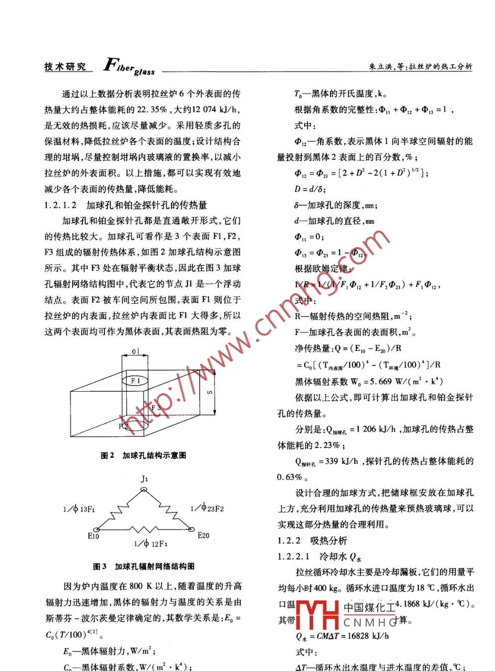技術(shù)研究oga朱立洪,等:拉絲爐的熱工分析中圖分類號:TQ171.77·6文獻標識碼:A拉絲爐的熱工分析朱立洪,李睿,王旗彬洛陽洛玻玻璃纖維有限公司,洛陽471009)摘要:分析了拉絲爐體各部位的傳熱數(shù)據(jù),介紹了各部位的傳熱情況和熱量計算方法。建議選擇合適的爐體結(jié)構(gòu)和保溫材料,以降低其表面溫度和拉絲爐外表面積來減少拉絲爐的熱損耗;拉絲爐加球孔的傳熱和冷卻水帶走的熱量也可以采用合理的技術(shù)方案實現(xiàn)有效利用。關(guān)鍵詞:拉絲爐;熱效率;傳熱Thermal Analysis for Fiber Drawing CrucibleZHU Lihong, LI Rui, WANG QibinLuoyang Luobo Glass Fiber Co, Ltd, Luoyang 471009)Abstract: The heat transfer behaviour at various parts of a fiber drawing crucible and the heat calculation method are describedpaper. It is suggested that suitable crucible structure and proper heat insulation should be selected so as to reduce the extermalarea and surface temperature of the crucible to lower the heat loss in the crucible. The heat carried away by the heat transfer at the marble reading hole and by the cooling water can be utilized effectively by some rational techniques as wellKey words: fiber drawing crucible; heat efficiency; heat transfer0前言確定的約束性目標?!笆濉币?guī)劃《綱要》初步計近幾年來,全國固定資產(chǎn)投資增長迅速,尤其是劃將“十二五”期間單位GDP能耗指標和單位GDP大能耗產(chǎn)業(yè)增長過快?!笆晃濉币?guī)劃提出,到2010二氧化碳排放指標的5年累計下降幅度都定在年全國單位GDP能耗比2005年降低20%左右,主16%,分解到201l年目標任務(wù)是下降3.5%。因此要污染物排放總量減少10%左右?!笆晃濉睍r期科學(xué)合理地利用有限資源,提高能源用率依然是節(jié)能作為調(diào)整經(jīng)濟結(jié)構(gòu)、轉(zhuǎn)變發(fā)展方式的突破口,被項長期的工作。連續(xù)玻璃纖維拉絲生產(chǎn)工藝流程是放在更加突出的位置,并取得了顯著成效,全國單位一個傳質(zhì)、傳熱和張力變化的復(fù)雜過程。在采用GDP能耗降低19.1%,完成了“十一五”規(guī)劃《綱要》代鉑生產(chǎn)建先的企業(yè),對拉絲生產(chǎn)過程中象地稱拉絲爐為“電CNMHG收稿日期:2011-07-14老虎。要分捉苘俸鸑雙,很好地實現(xiàn)節(jié)能降修回日期:2011-12作者簡介:朱立洪,男,192年生,洛陽洛玻玻璃纖維有限公司技耗,必須認真分析拉絲爐各個部分的傳熱情況,了解術(shù)品質(zhì)部部長,工程師。真實的數(shù)據(jù),才能采取有效的措施。玻璃纖)2012年第1期22朱立洪,等:拉絲爐的熱工分析技術(shù)研究拉絲爐是一個小型的單元窯系統(tǒng),該系統(tǒng)的傳各個表面的傳熱量可以根據(jù)下面公式計算(2。熱現(xiàn)象可分成兩類,一類是用于加熱和熔化玻璃球石棉板保溫磚爐體磚的有益?zhèn)鳠?第二類是造成熱損失的無益?zhèn)鳠?。該系統(tǒng)傳熱是一個動態(tài)的平衡過程,包含熱傳導(dǎo)、對流和輻射3種傳熱方式。本文以34tex為例分析各部分的傳熱情況1拉絲爐的熱工分析實例1.1拉絲爐的輸入總熱量Q輪入圖1爐壁結(jié)構(gòu)示意圖拉絲爐的熱量供給主要采用兩種途徑,一種途徑是通過電極把電引人到玻璃液,利用玻璃液在高式中溫狀態(tài)下離子導(dǎo)電,把電能轉(zhuǎn)換成熱能,實現(xiàn)內(nèi)部供q一傳熱量,W/m2。熱;另一種途徑是鉑金漏板通電后電阻發(fā)熱,來加熱a=A(t表-l)4+4.54[(T表面/100)玻璃液。以上兩種途徑的供熱量可以通過功率表(T環(huán)境100)/(表面一環(huán))來測試出輸人功率。目前我們公司34tex拉絲爐和式中漏板總功率約為15kW。α—爐壁與空氣之間的對流輻射傳熱系總熱量數(shù),W/(m2.℃)Q人=P×860×4.187=54010kJ/h表面、!R一分別為爐體表面溫度和爐體附近環(huán)式中:境溫度,℃(環(huán)境溫度為40℃);Q軸入一總熱量,kJh分別為爐體表面開氏溫度和爐體附P一電熔和漏板的輸入功率,kW。近環(huán)境開氏溫度,K;1.2拉絲爐的輸出熱量分析A-決定于傳熱面位置的系數(shù)。1.2.1各部位傳熱情況Q表面=q×0.86×4.187×F1.2.1.1爐體表面?zhèn)鳠崃渴街袪t體磚保溫層和石棉板組成一個無內(nèi)熱源的F一爐體各表面的表面積,m2。穩(wěn)定傳熱多層平壁,如圖1爐壁結(jié)構(gòu)示意圖所示,它表2爐體各表面的測定溫度的傳熱包括3個過程:(1)高溫玻璃液與白泡石內(nèi)表表面溫度頂蓋堵頭105面之間的對流傳熱和輻射傳熱。(2)白泡石與保溫層等內(nèi)部的傳熱。(3)石棉板外表面與低溫空氣之通過測量爐體各個表面的溫度(如表2),運用間的對流和輻射傳熱。假設(shè)層與層之間接觸很完以上即可計算出爐體各表面的傳熱量。分別是善,沒有接觸熱阻,因此在接觸分界面上并不引起溫Qm=2040kJ/h,頂蓋的傳熱占整體能耗度降低,在穩(wěn)定狀態(tài)下,各層的熱流均為定值q。單的3.78%;元窯爐體的上下、左右(堵頭)前后(側(cè)壁)6個表面Q底板=6165kJ/h,底板的傳熱占整體能耗的因熱流方向不同,其決定于傳熱面位置的系數(shù)A也11.41%;不同,Av的經(jīng)驗值如表1A系數(shù)值2中國煤化工QCNMHG占整體能耗表1Aw系數(shù)值傳熱面位置問上的平壁向下的平壁垂直的平壁(頂蓋)底板(側(cè)面)Q側(cè)=1631kJ/h,側(cè)壁的傳熱占整體能耗玻璃纖維》2012年第1期技術(shù)研究cgg朱立洪,等:拉絲爐的熱工分析通過以上數(shù)據(jù)分析表明拉絲爐6個外表面的傳T一黑體的開氏溫度,k。熱量大約占整體能耗的22.35%,大約12074kJh,根據(jù)角系數(shù)